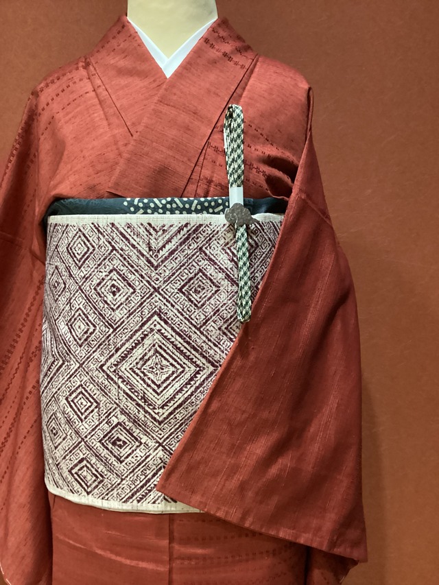 丁子色地市松によろけ縞文×鱗文両面半巾帯 260205-2