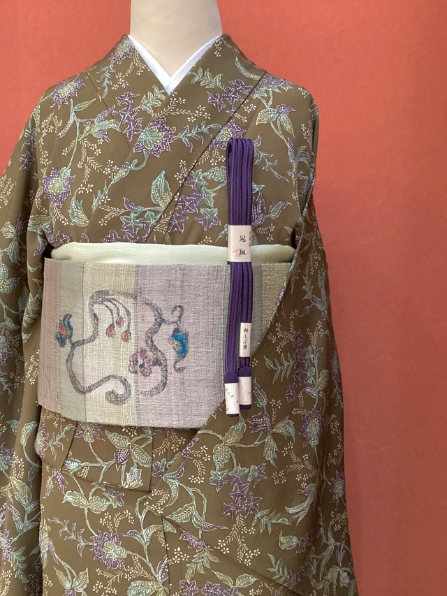 素色地切嵌め更紗型染文紬なごや帯 260217-1