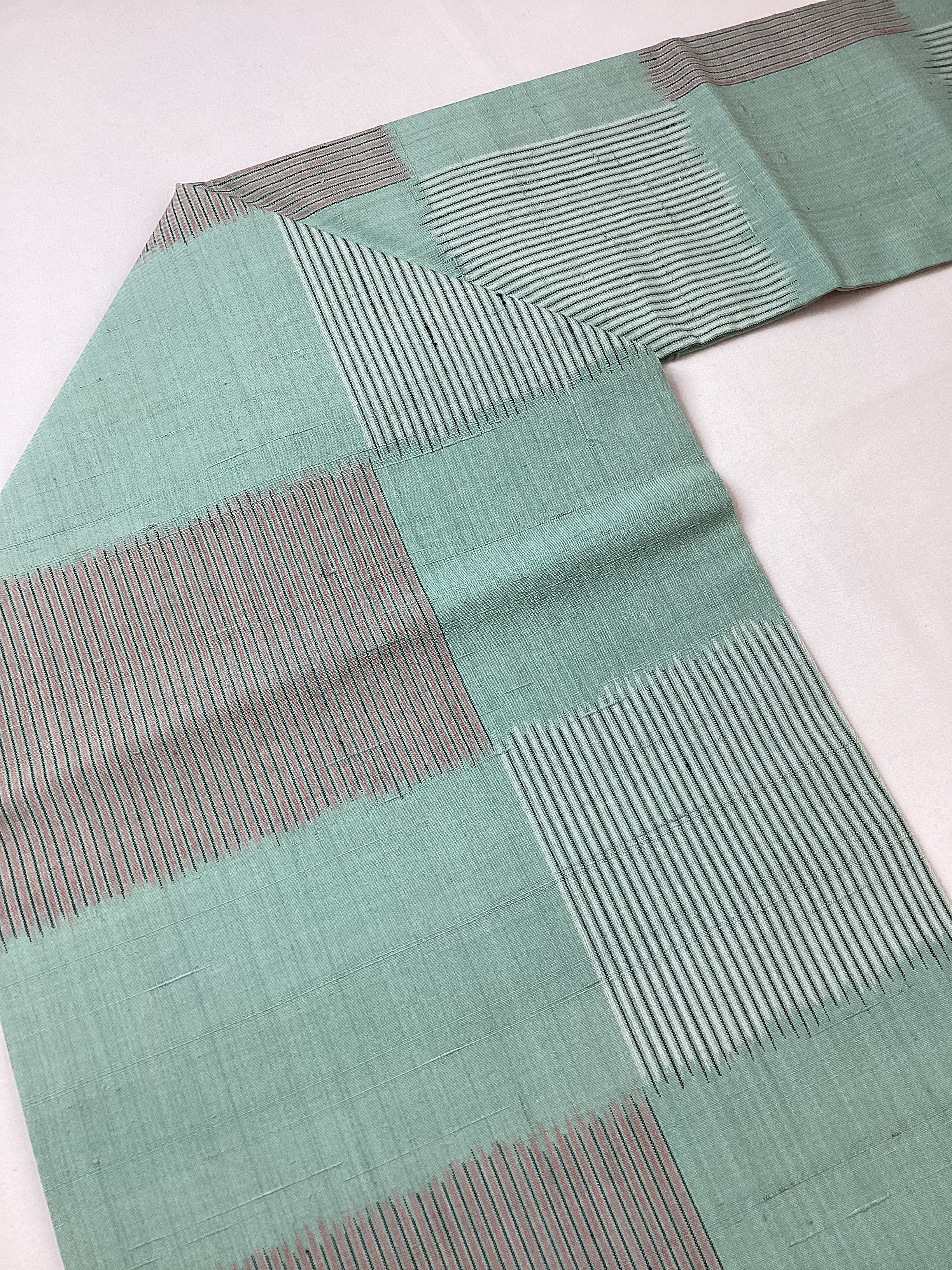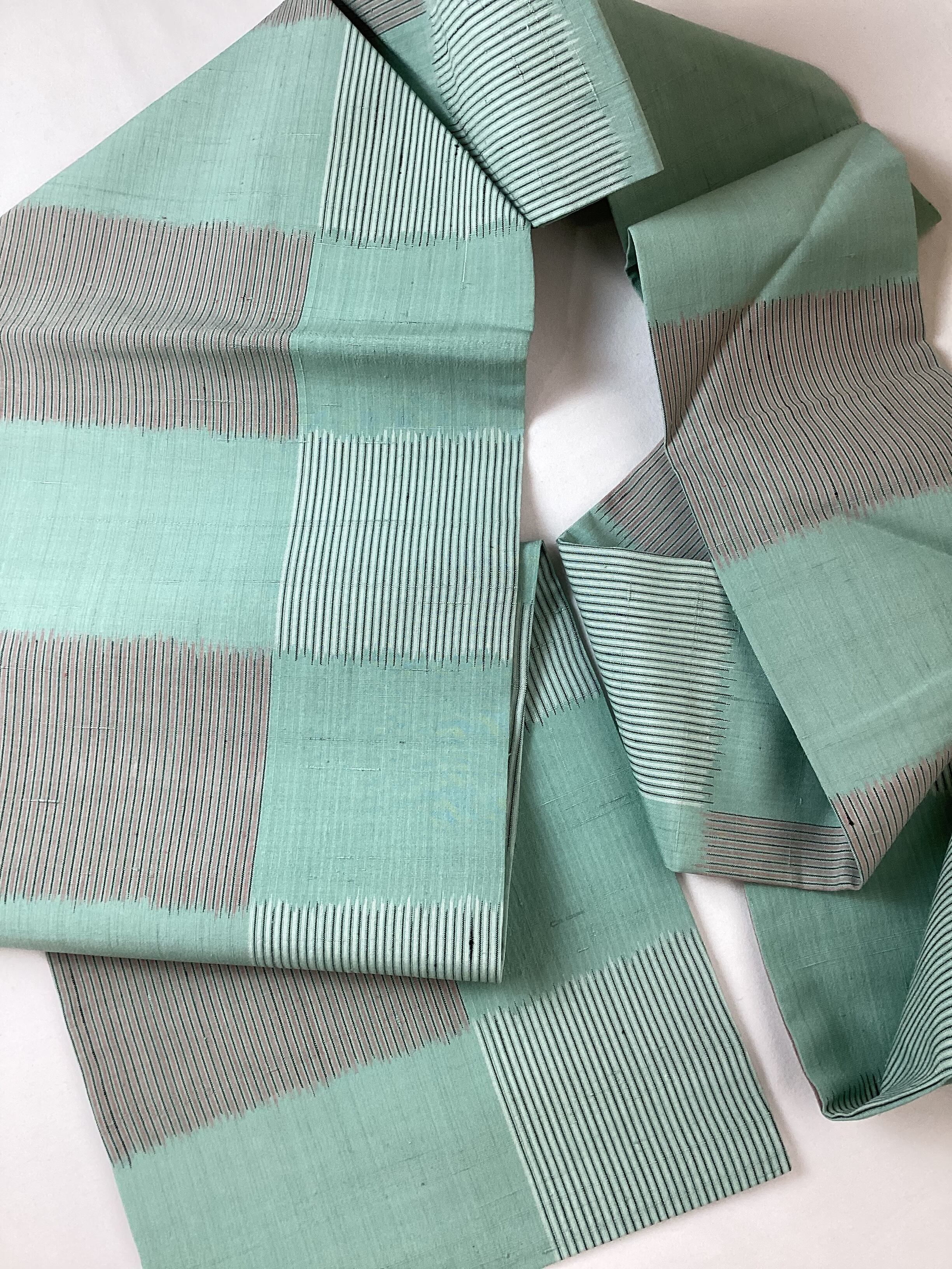 錆青磁色の紬地に細い縞文様で市松文様を織り出した九寸なごや帯です。スッキリとシンプルでコーディネートしやすく、また、くすんだミントカラーがアクセントになるカジュアルななごや帯です。長めの帯をお探しの方はいかがでしょうか。