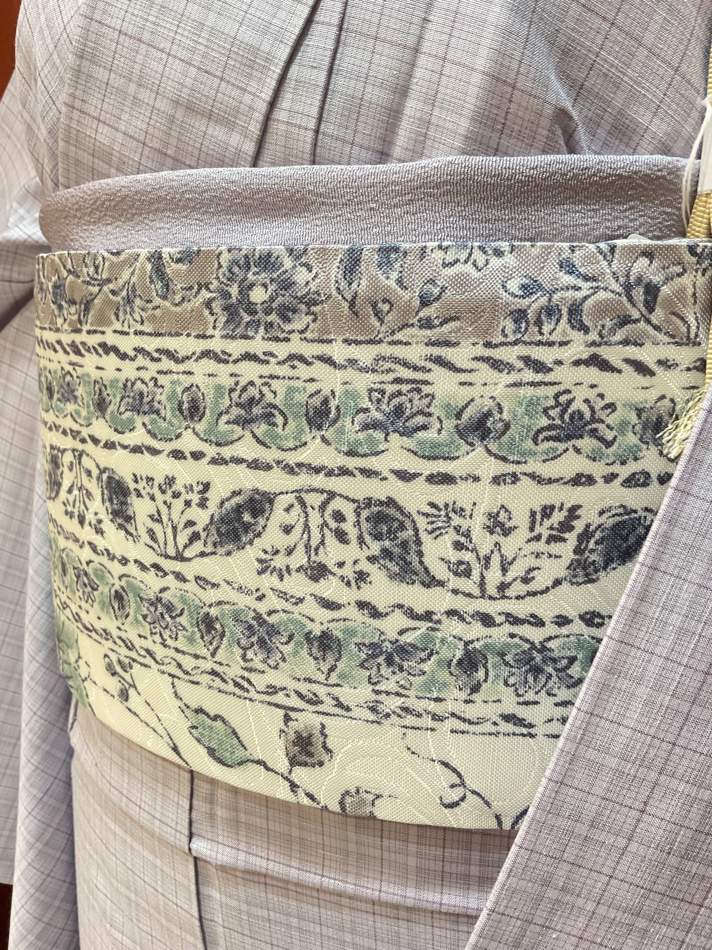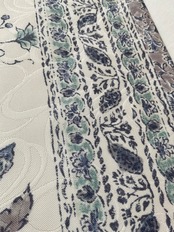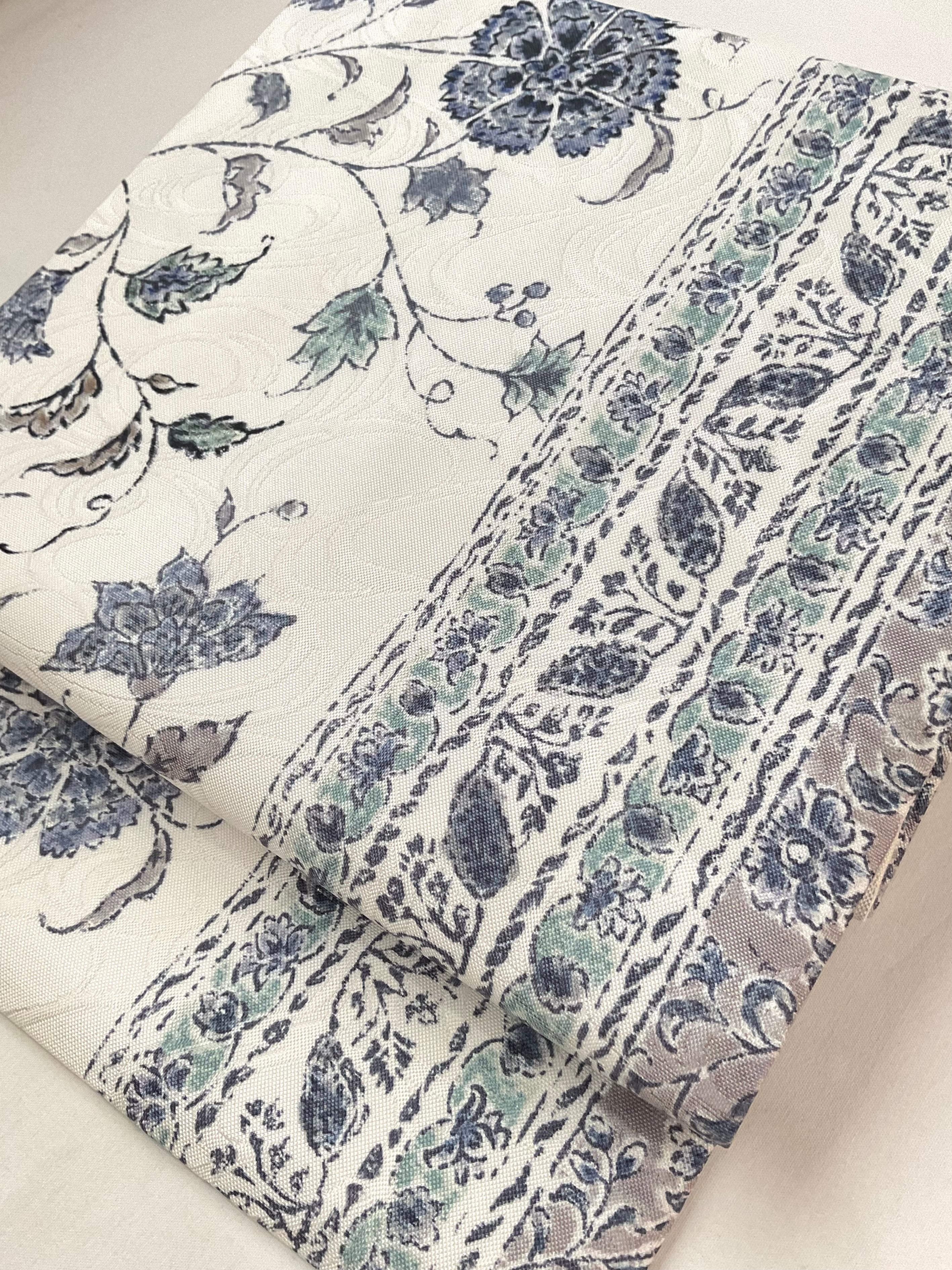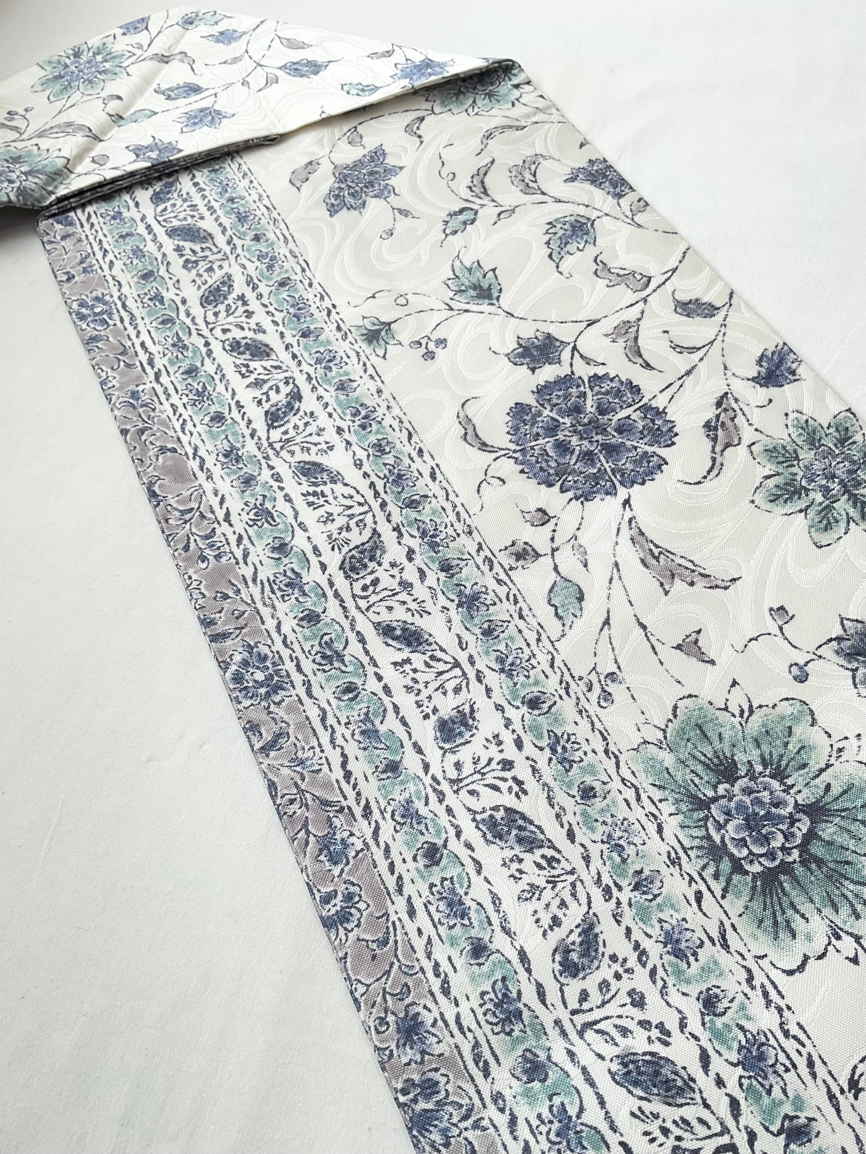 オフホワイトの波模様のような地紋のある柔らかな織地に欧風の花文様が染められた九寸なごや帯です。ヨーロッパのファブリックを思わせる洒落た雰囲気で、前柄は巻き方を変えて2パターンが出せます。お洋服感覚で軽やかなコーディネートをお楽しみください。