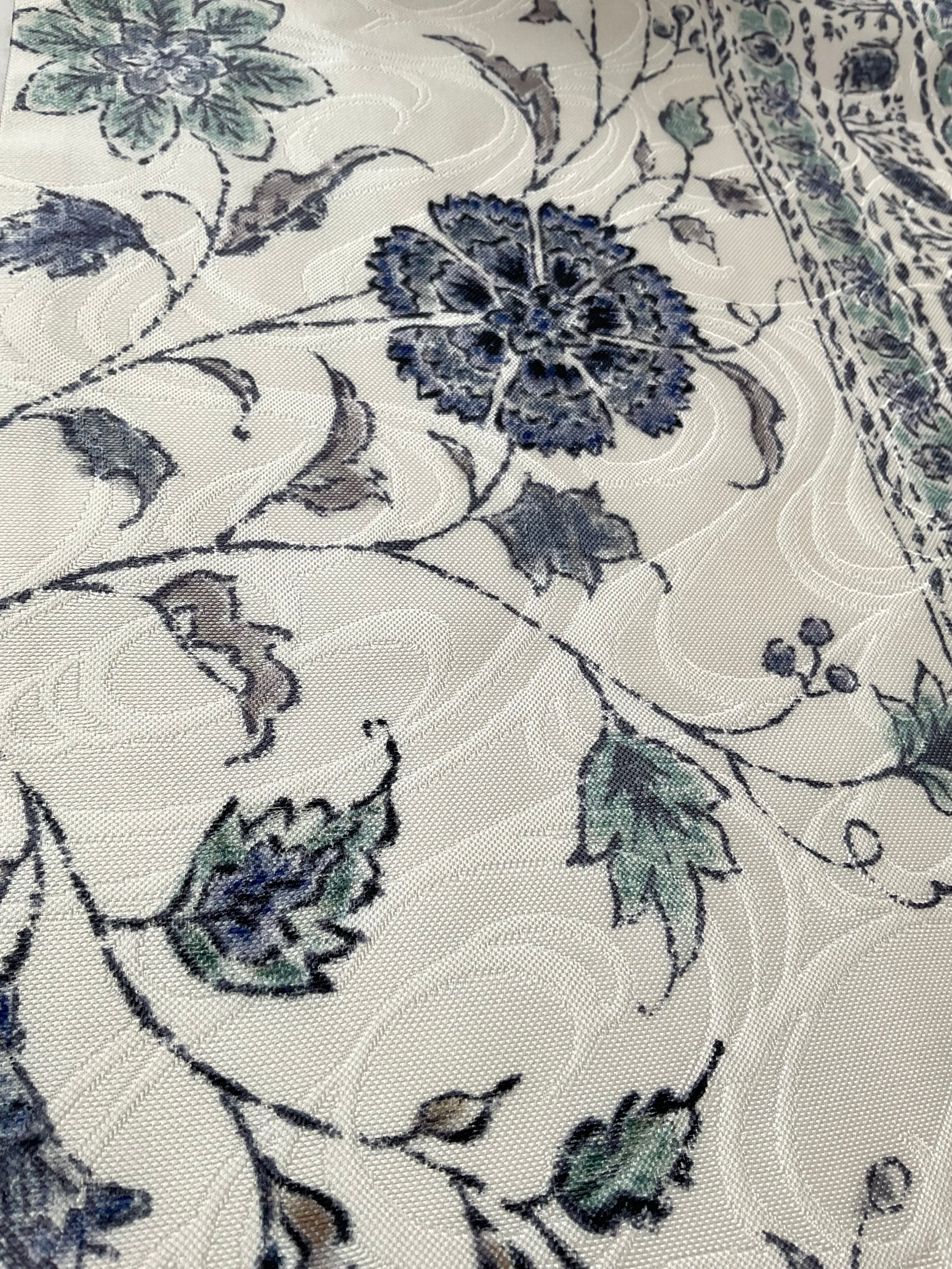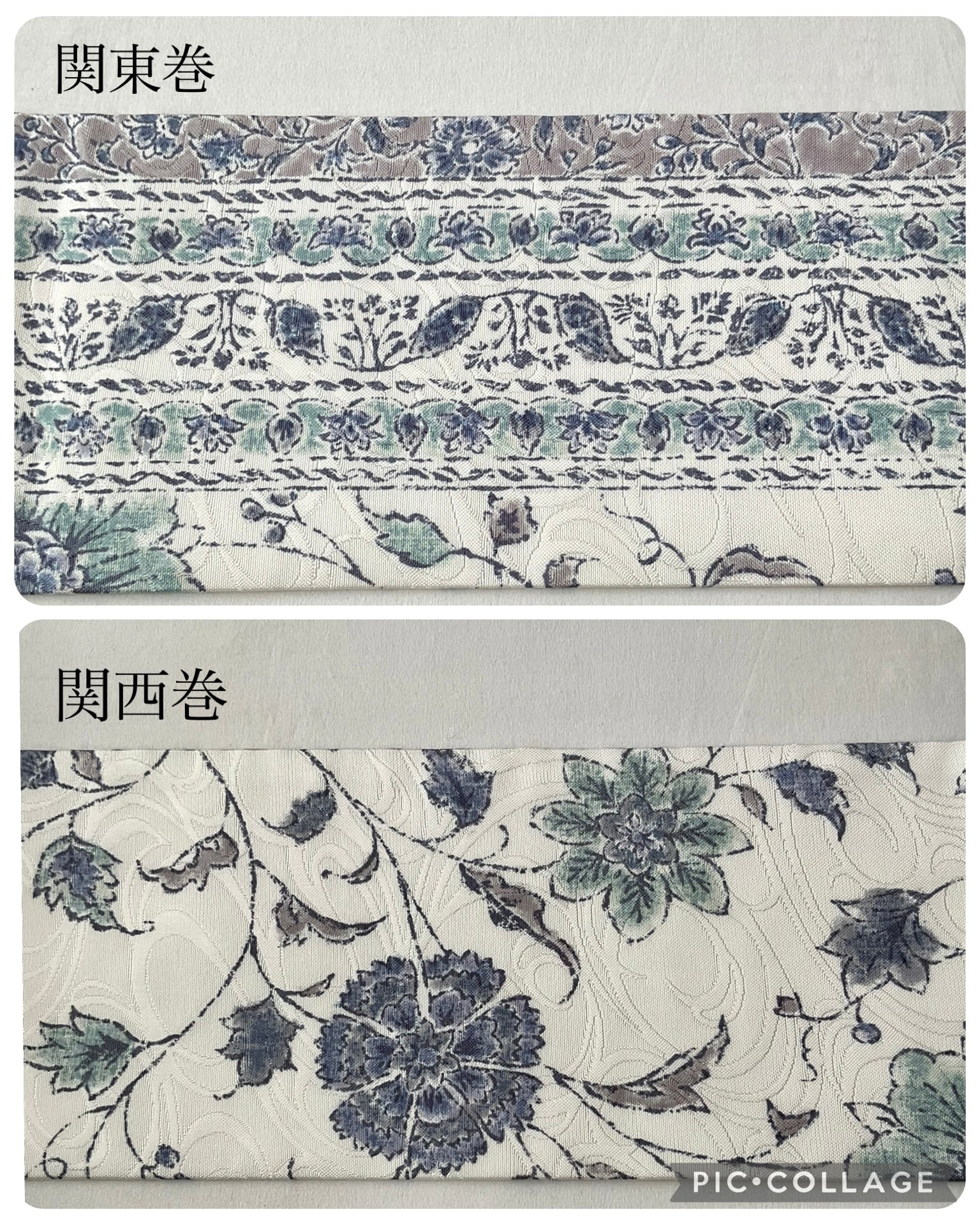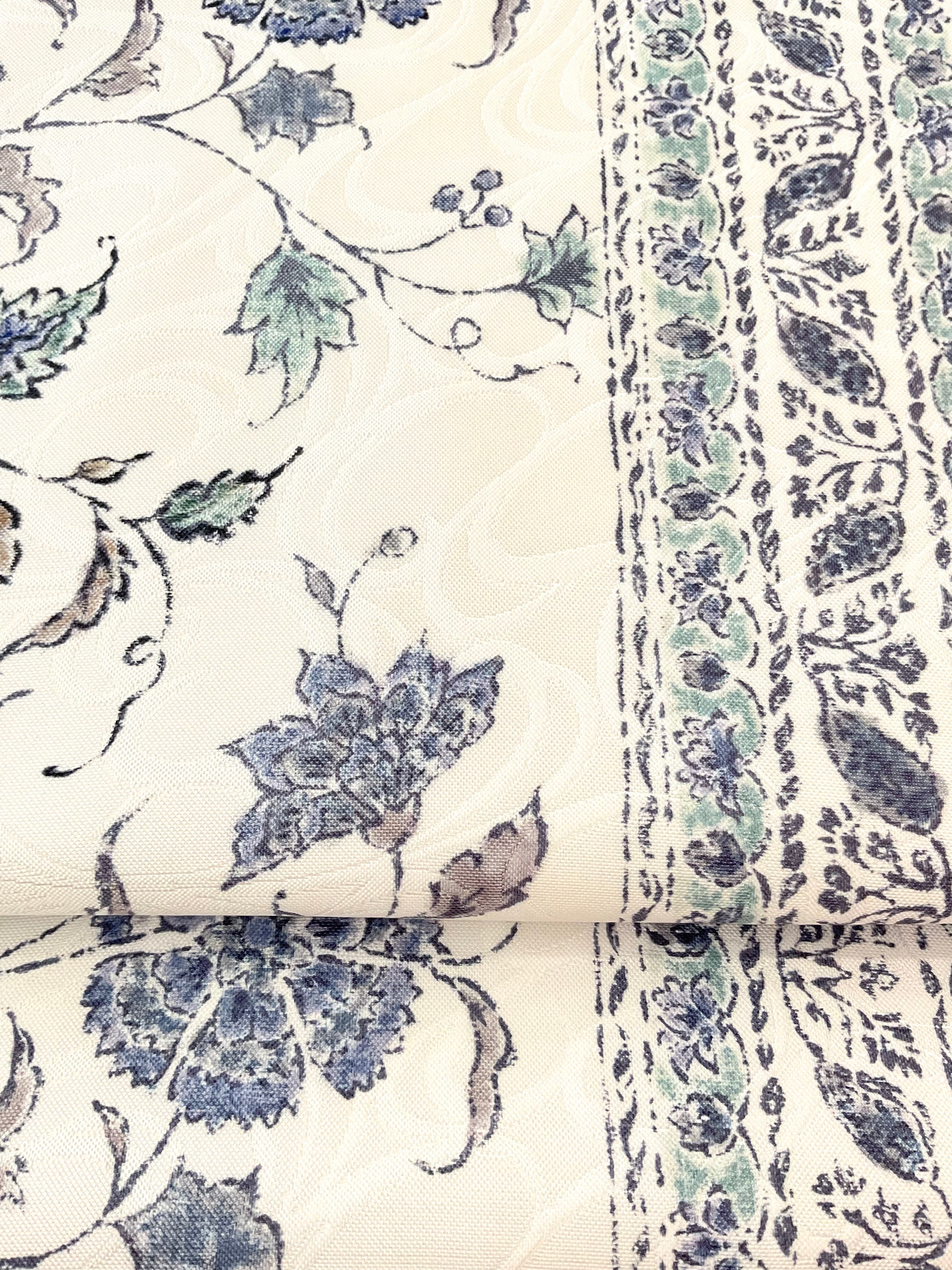 オフホワイトの波模様のような地紋のある柔らかな織地に欧風の花文様が染められた九寸なごや帯です。ヨーロッパのファブリックを思わせる洒落た雰囲気で、前柄は巻き方を変えて2パターンが出せます。お洋服感覚で軽やかなコーディネートをお楽しみください。