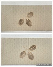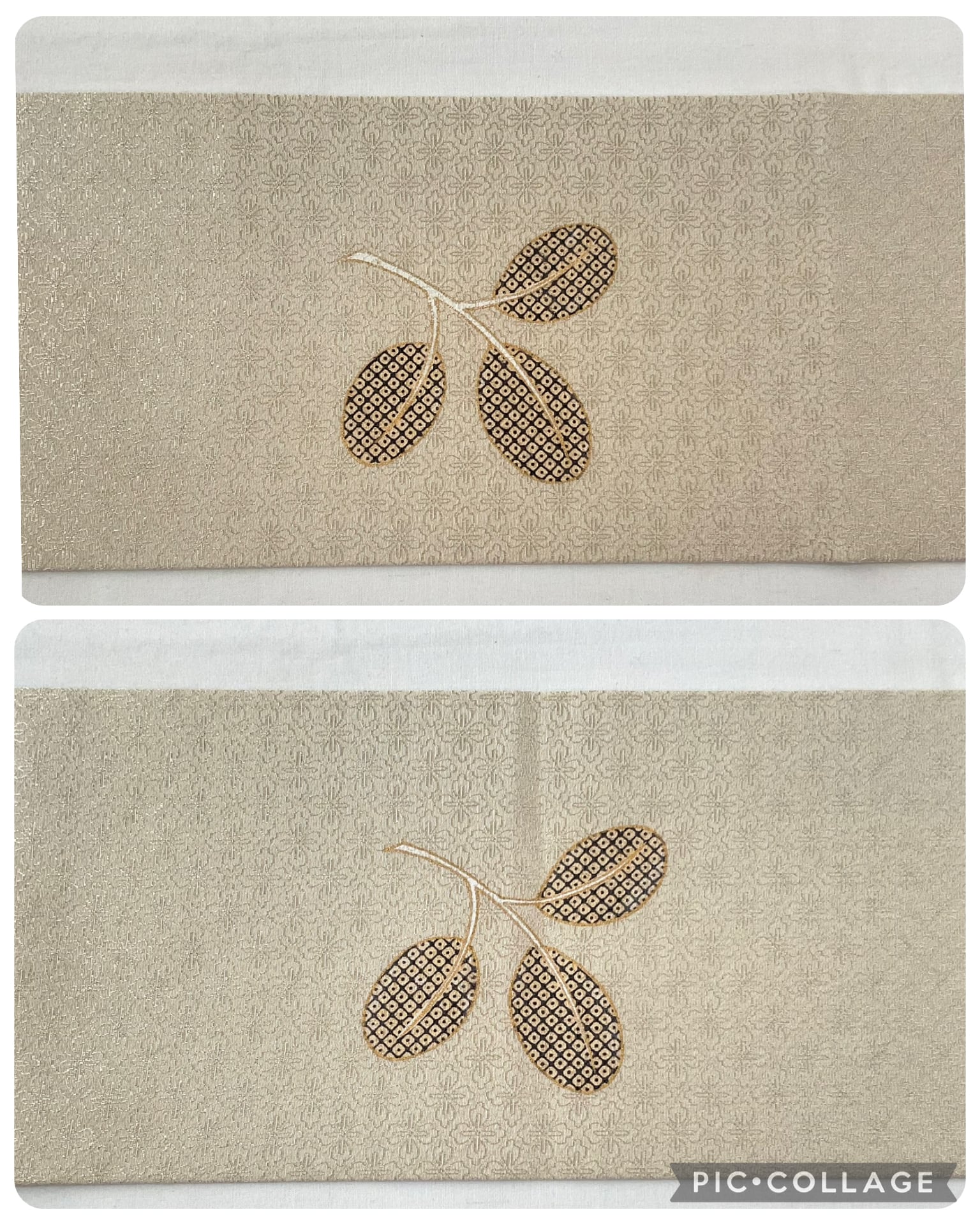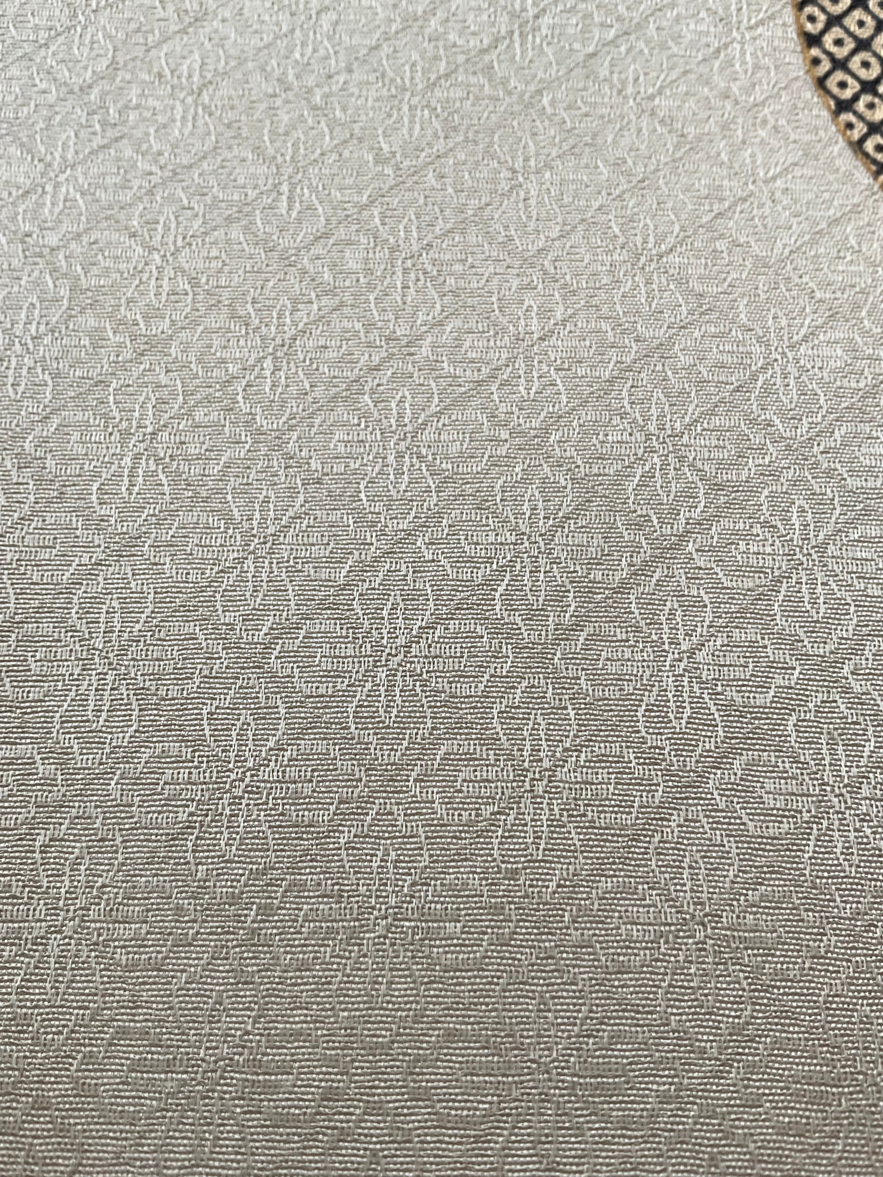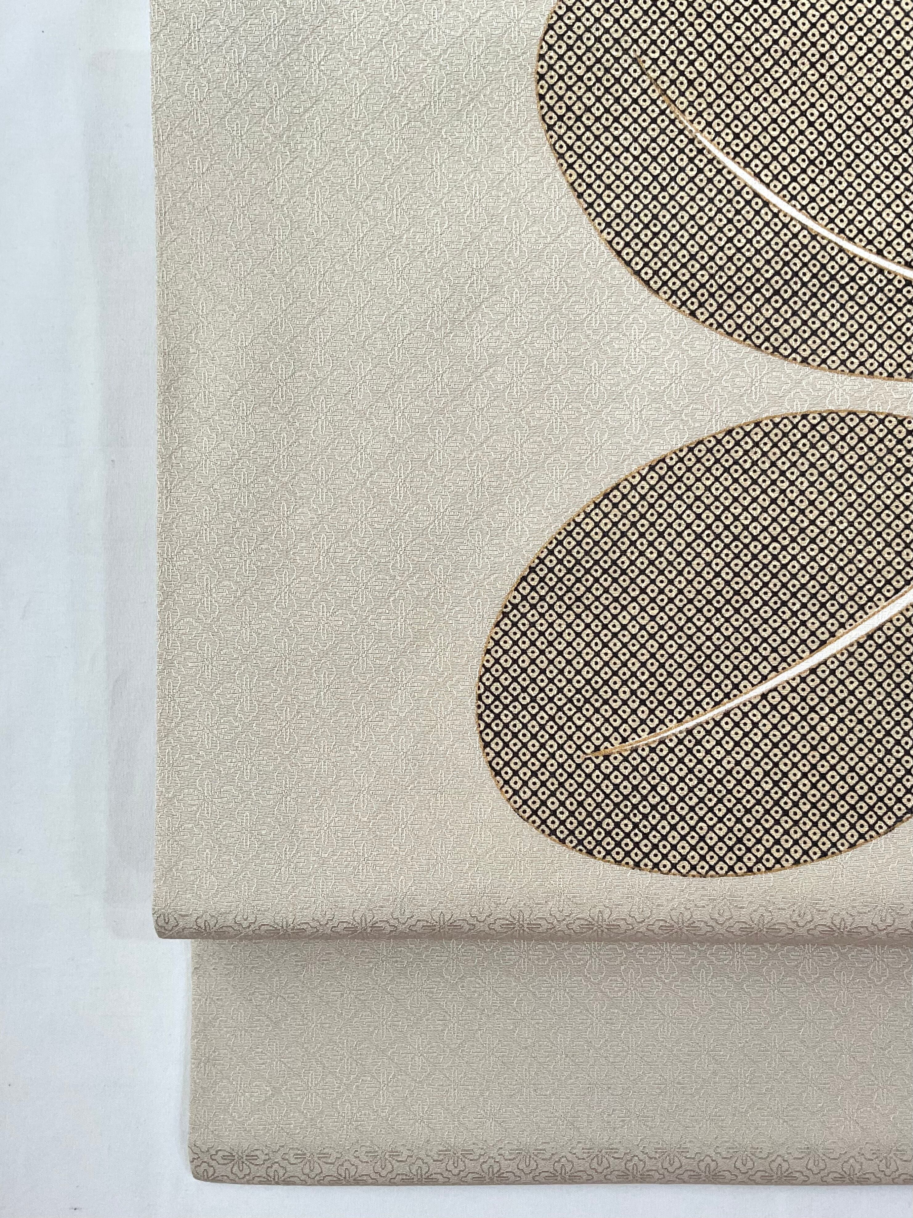 花菱の地紋の入った艶やかで上質な絹地に萩の葉が染められた九寸なごや帯です。オタイコには大きく葉をクローズアップしたような大胆な構図で