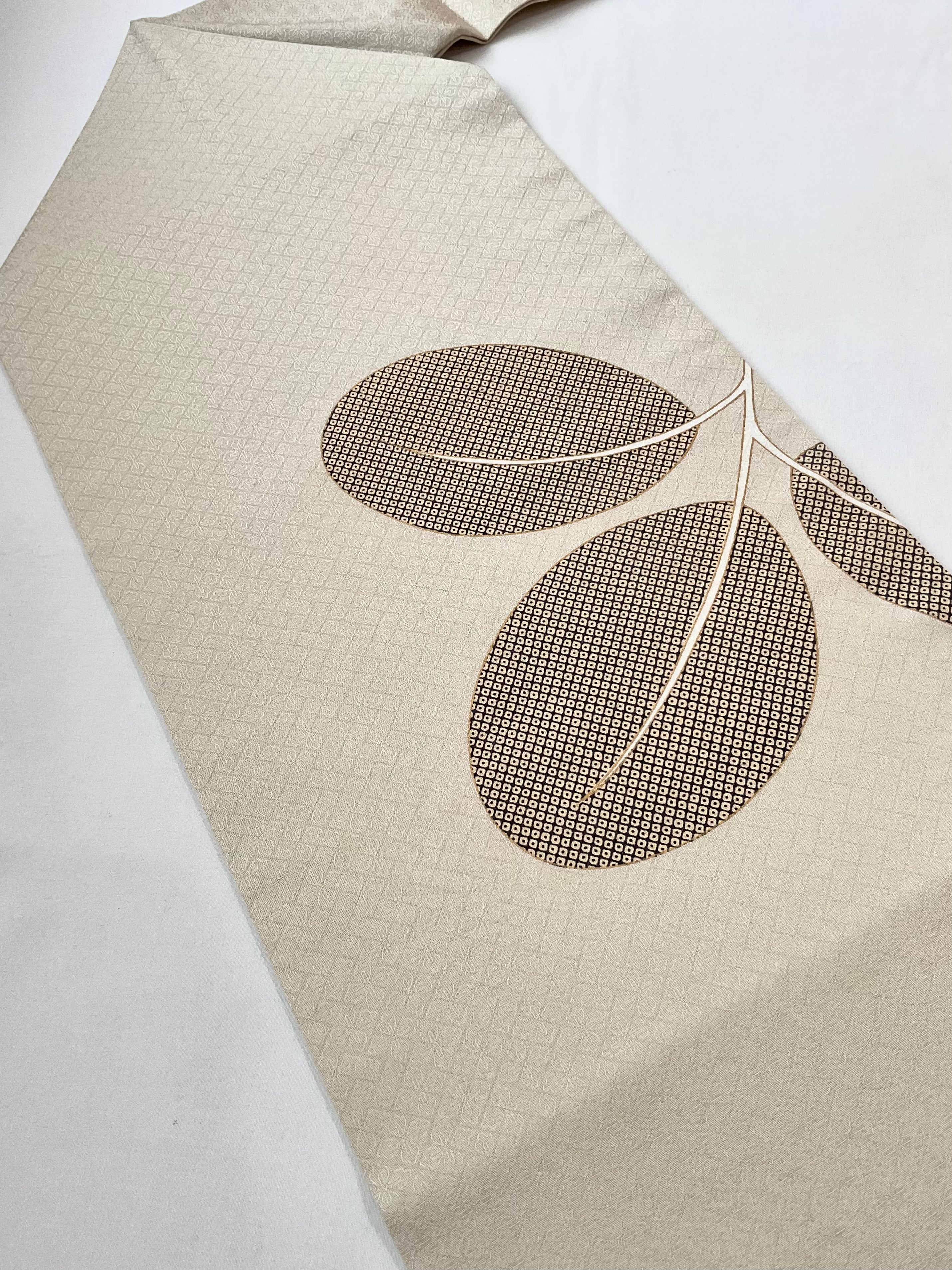 染め匹田でモダンに表現され、前柄の小さな枝葉とは対をなす楽しい意匠です。