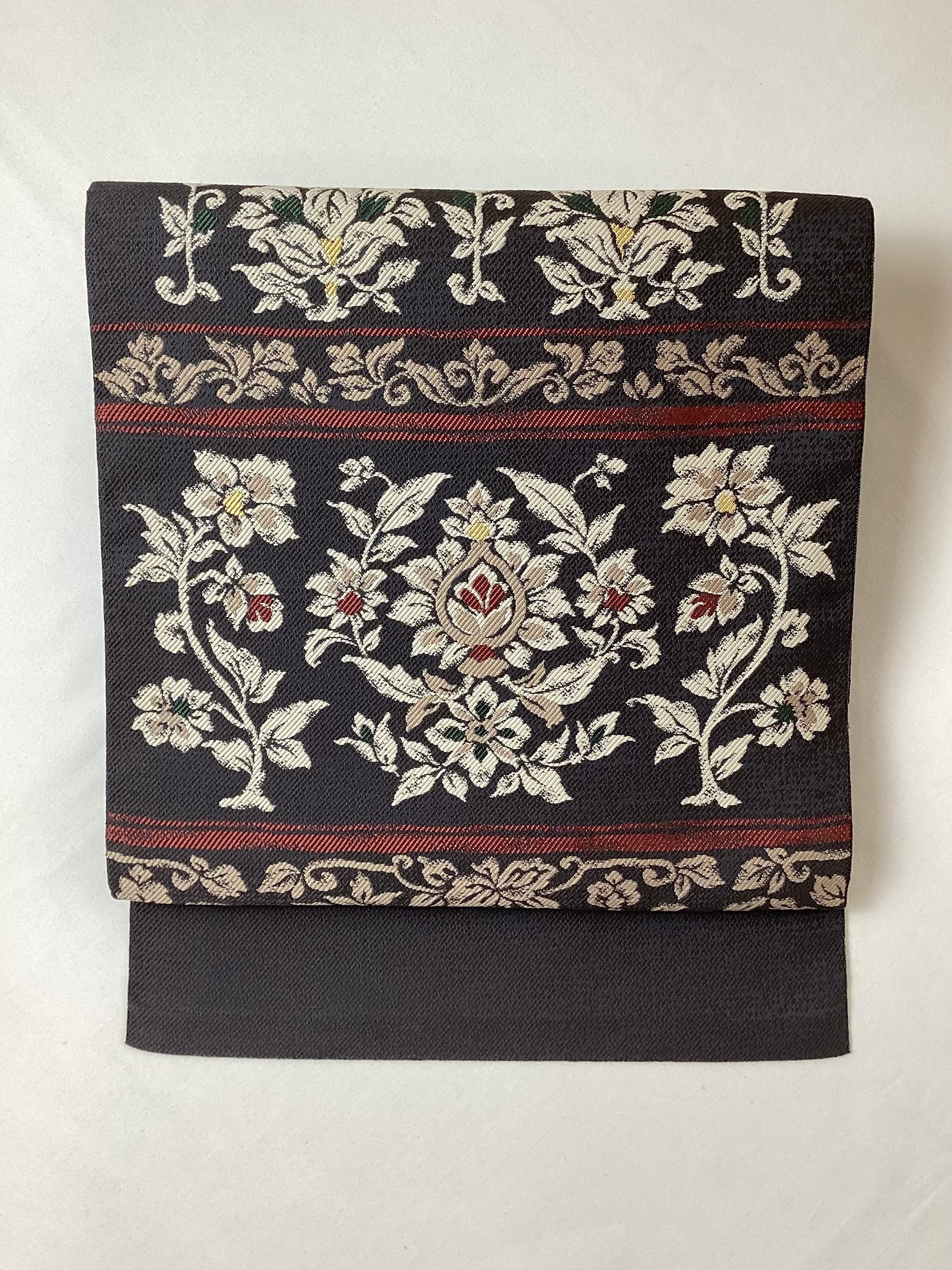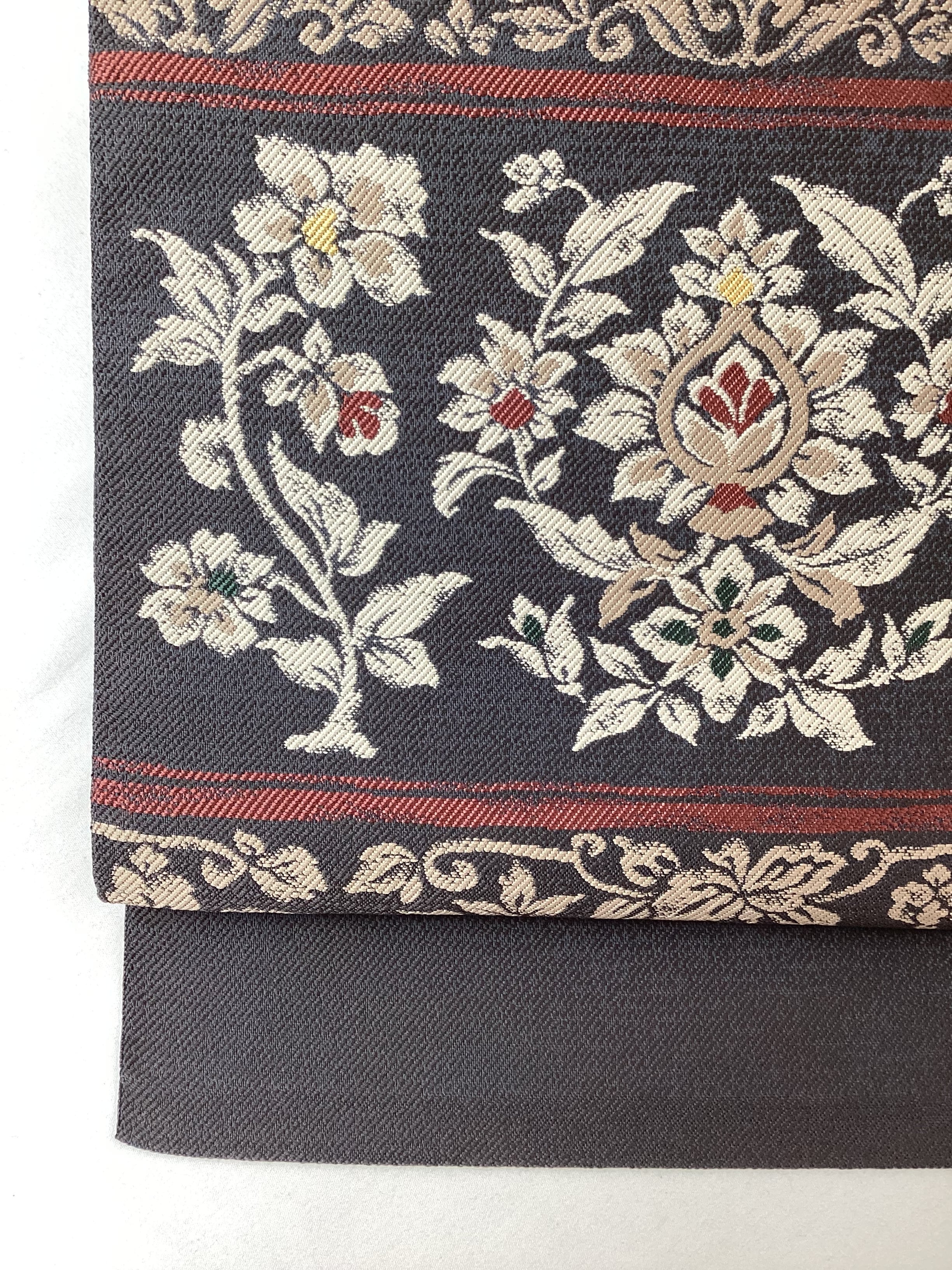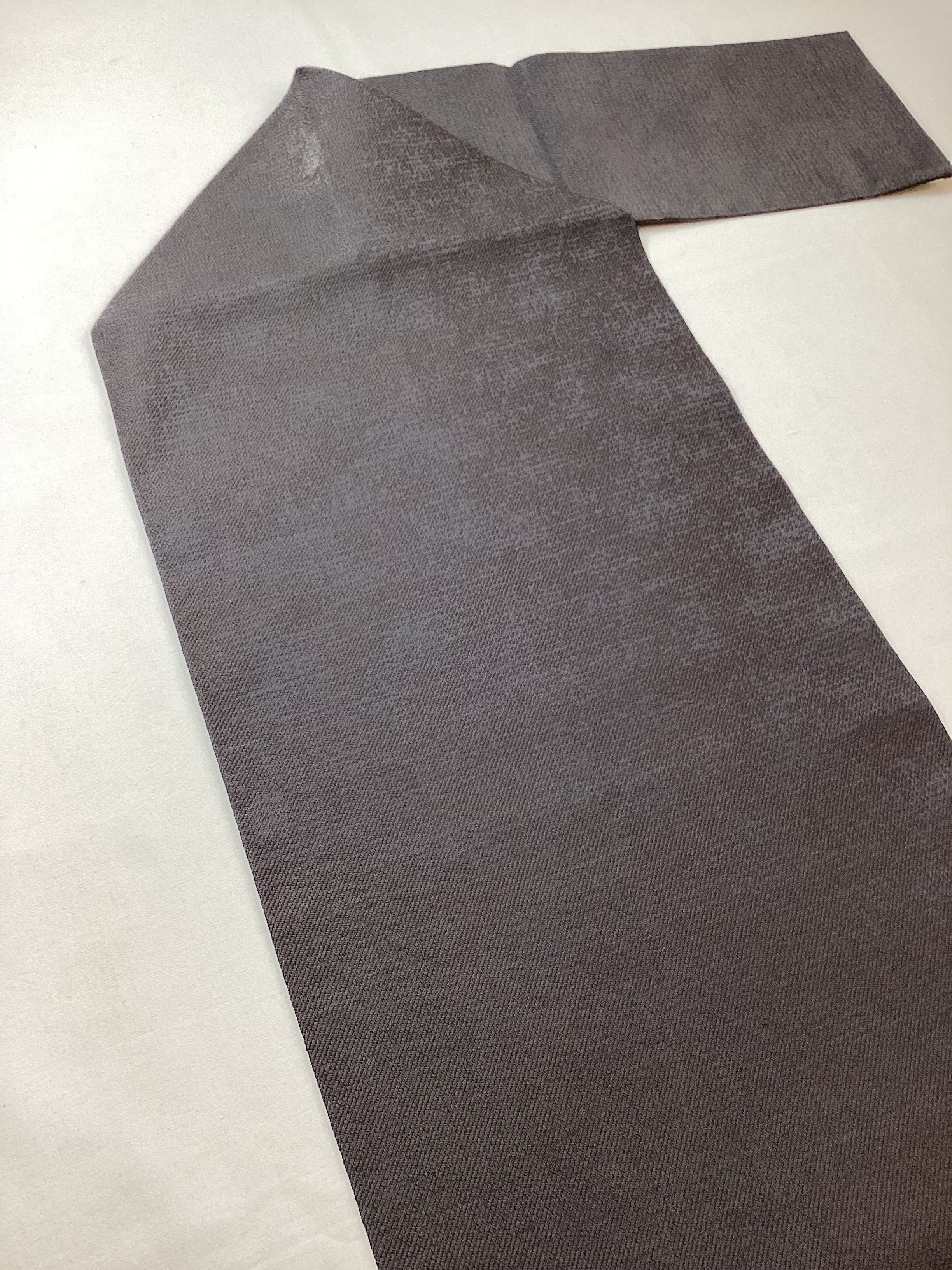 紫がかったココア色のふっくらとした織地に横段で唐花が織り込まれた八寸なごや帯です。軽やかで柔らかな八寸帯なので、着用の負担にならず気軽に結んでいただけます。華やかな柄付けなので、八寸帯ながらちょっとお洒落して品良くまとめたいお出掛けにもいかがでしょうか。