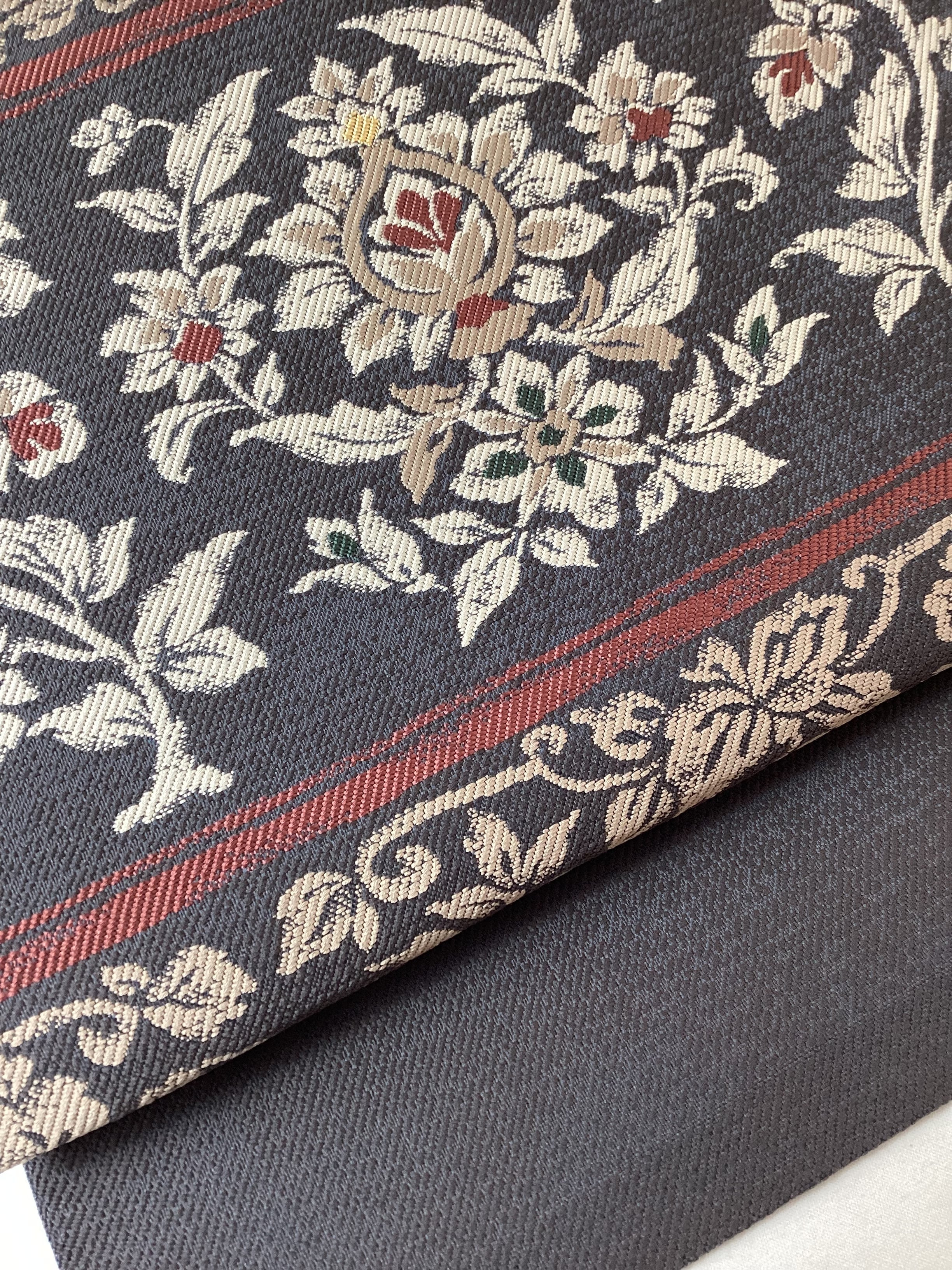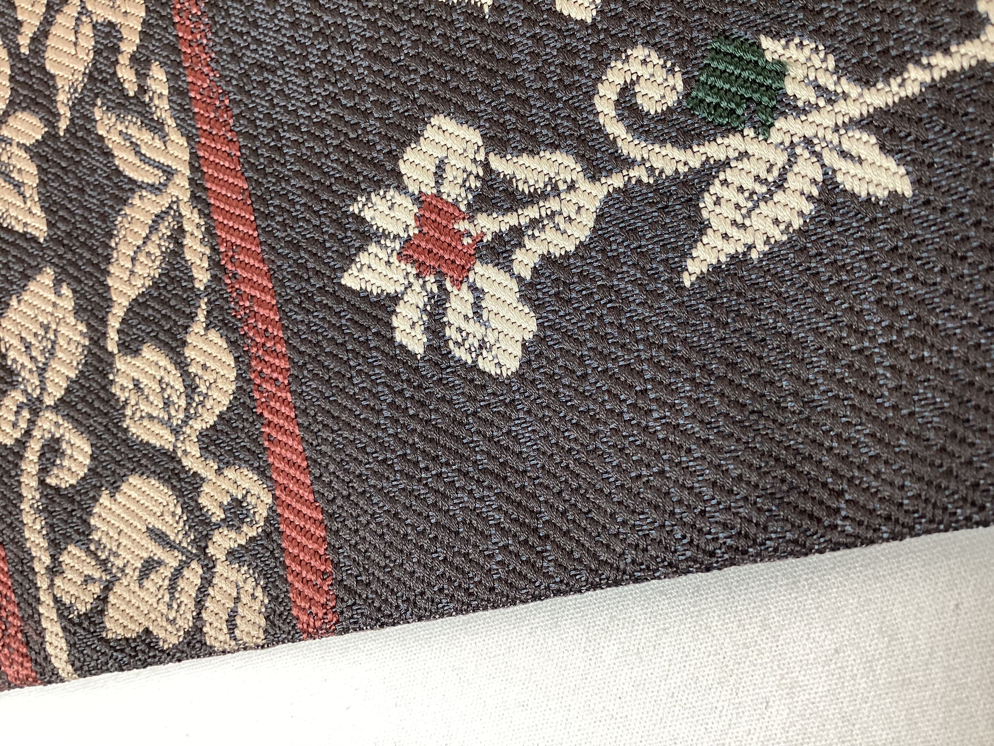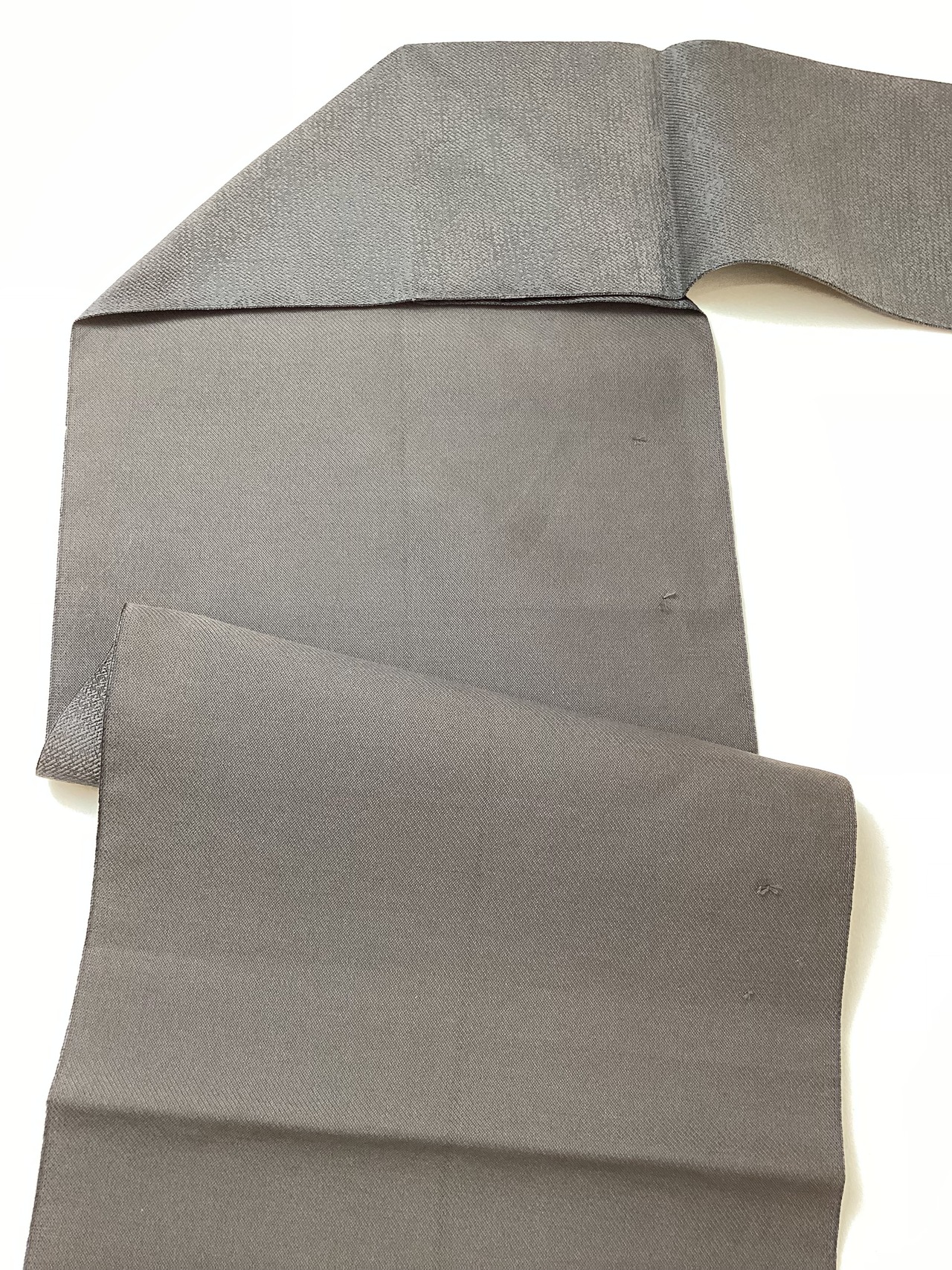 紫がかったココア色のふっくらとした織地に横段で唐花が織り込まれた八寸なごや帯です。軽やかで柔らかな八寸帯なので、着用の負担にならず気軽に結んでいただけます。華やかな柄付けなので、八寸帯ながらちょっとお洒落して品良くまとめたいお出掛けにもいかがでしょうか。