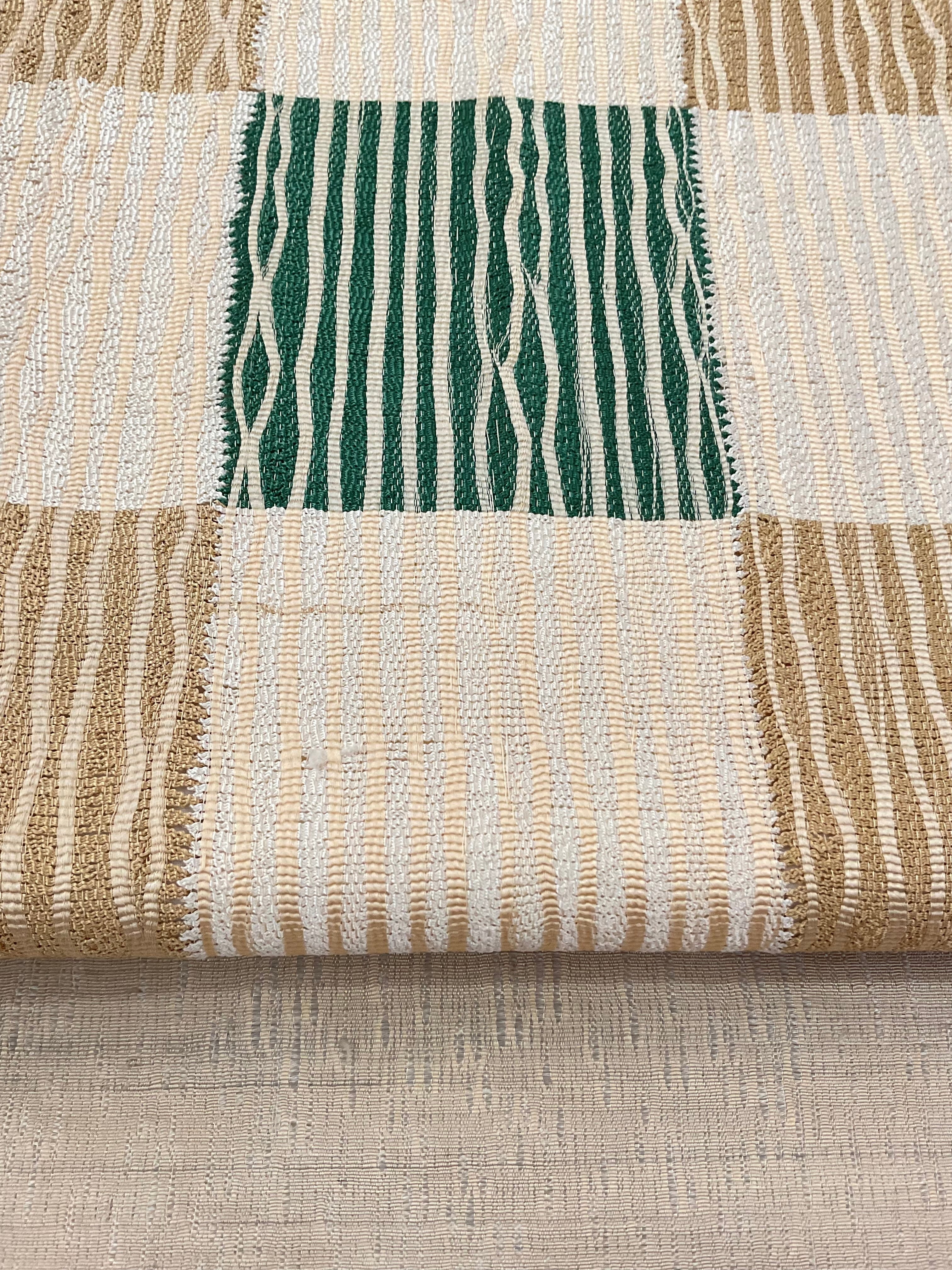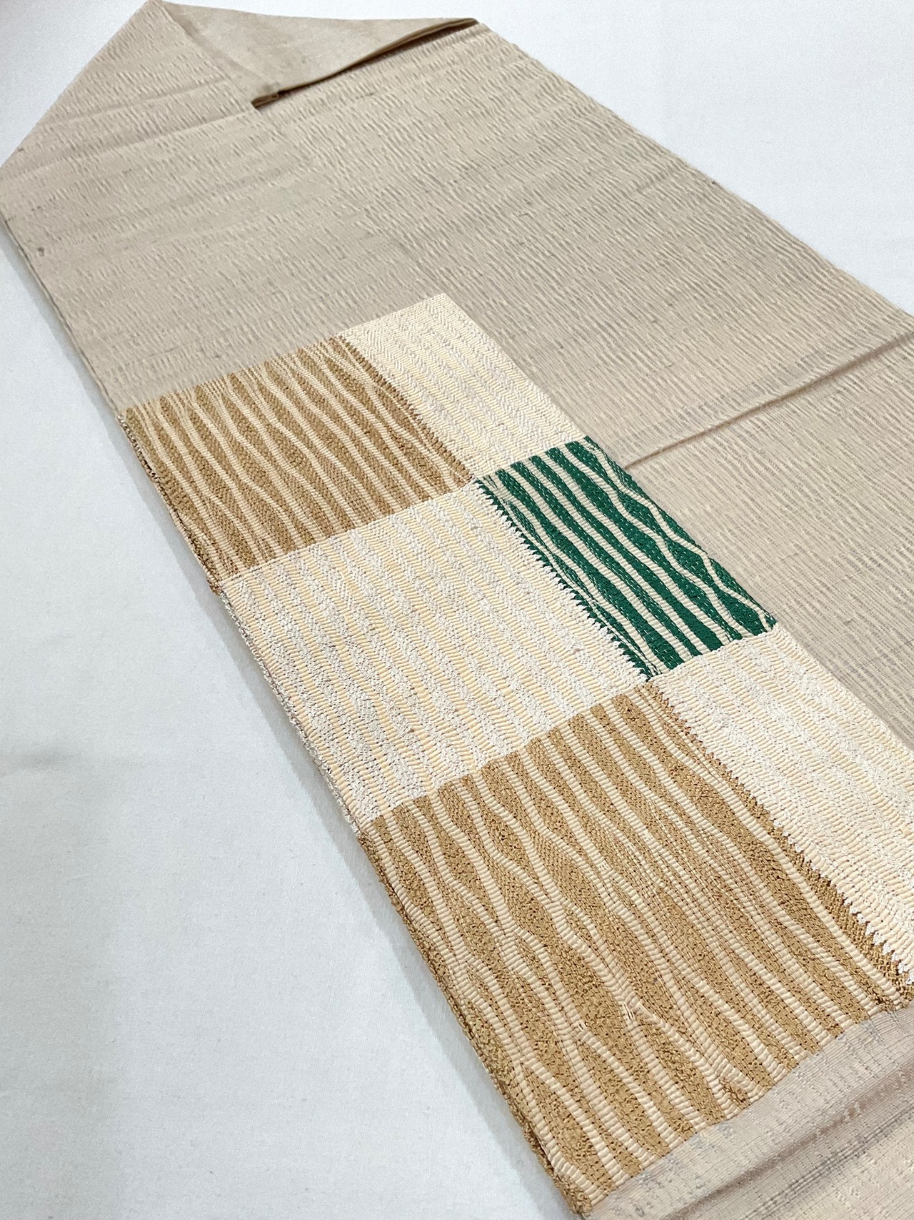 ベージュ地石畳文の九寸なごや帯、よろけた縦縞と、中に緑色のブロックが配されることで単調にならず遊び心さえ感じさせます。