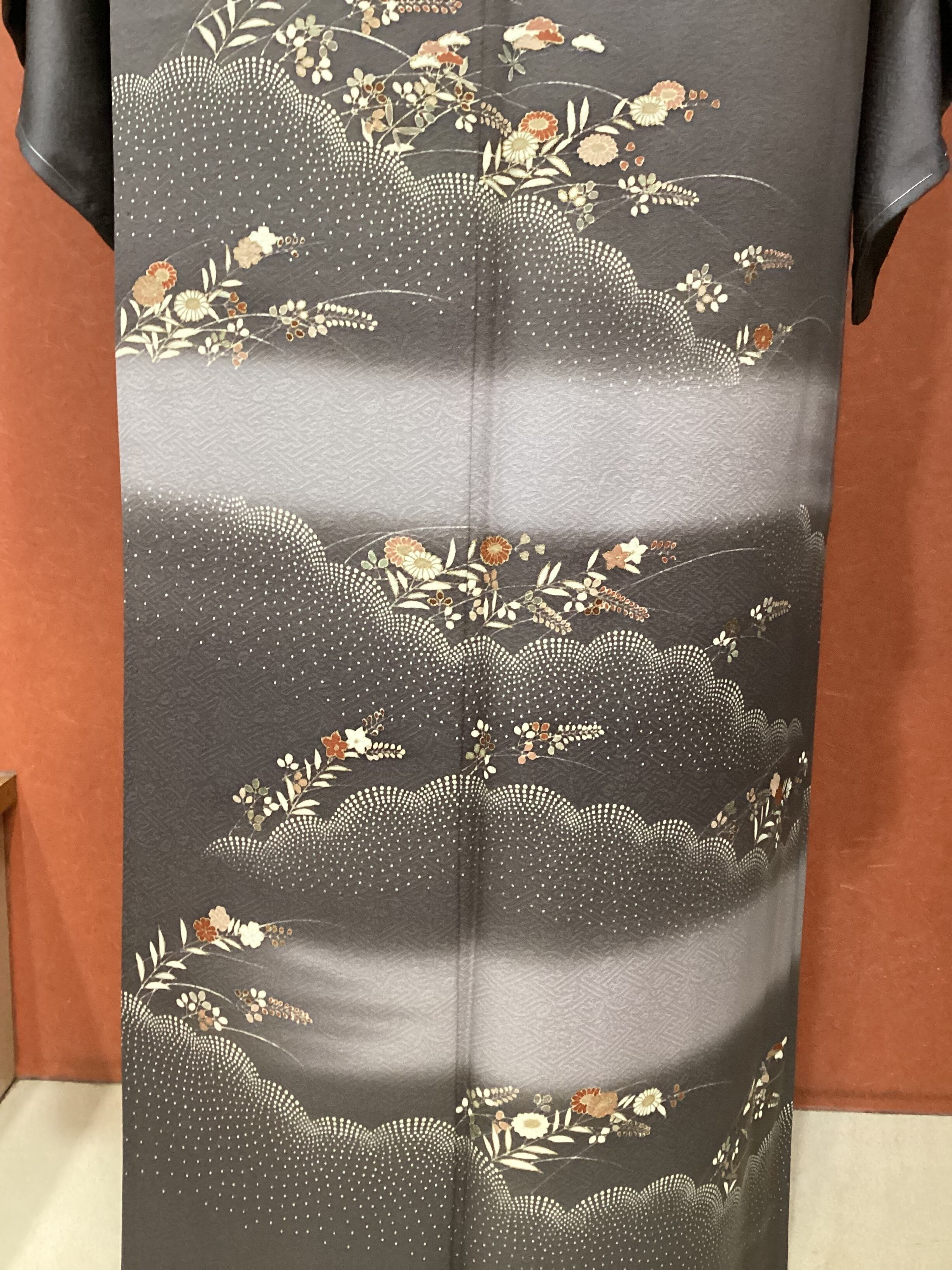 紫がかった灰色の落ち着いた色合いの上品な五つ紋付きの色留袖です。柔らかな地風で地紋には紗綾形の中に菊や蘭が配された細かい織がなされており、光の加減で陰影が生じて意匠を引き立てております。裾の絵羽は、霞や雲取りの合間から、菊や桔梗や萩といった秋草達が風にたなびくように描かれており、煌びやか過ぎない控えめなお柄となっております。秋のフォーマルなお席に単衣の色留袖はいかがでしょうか。