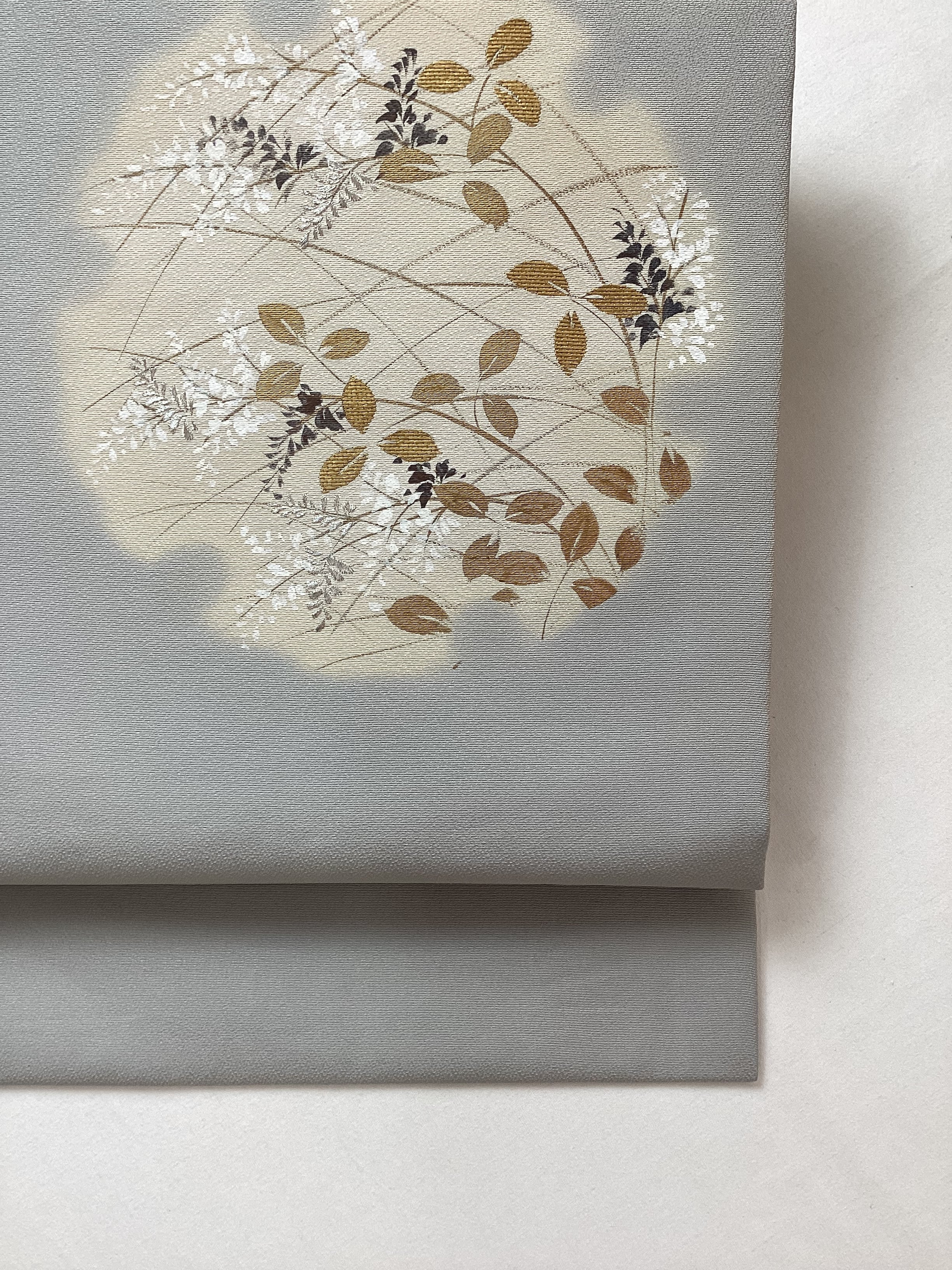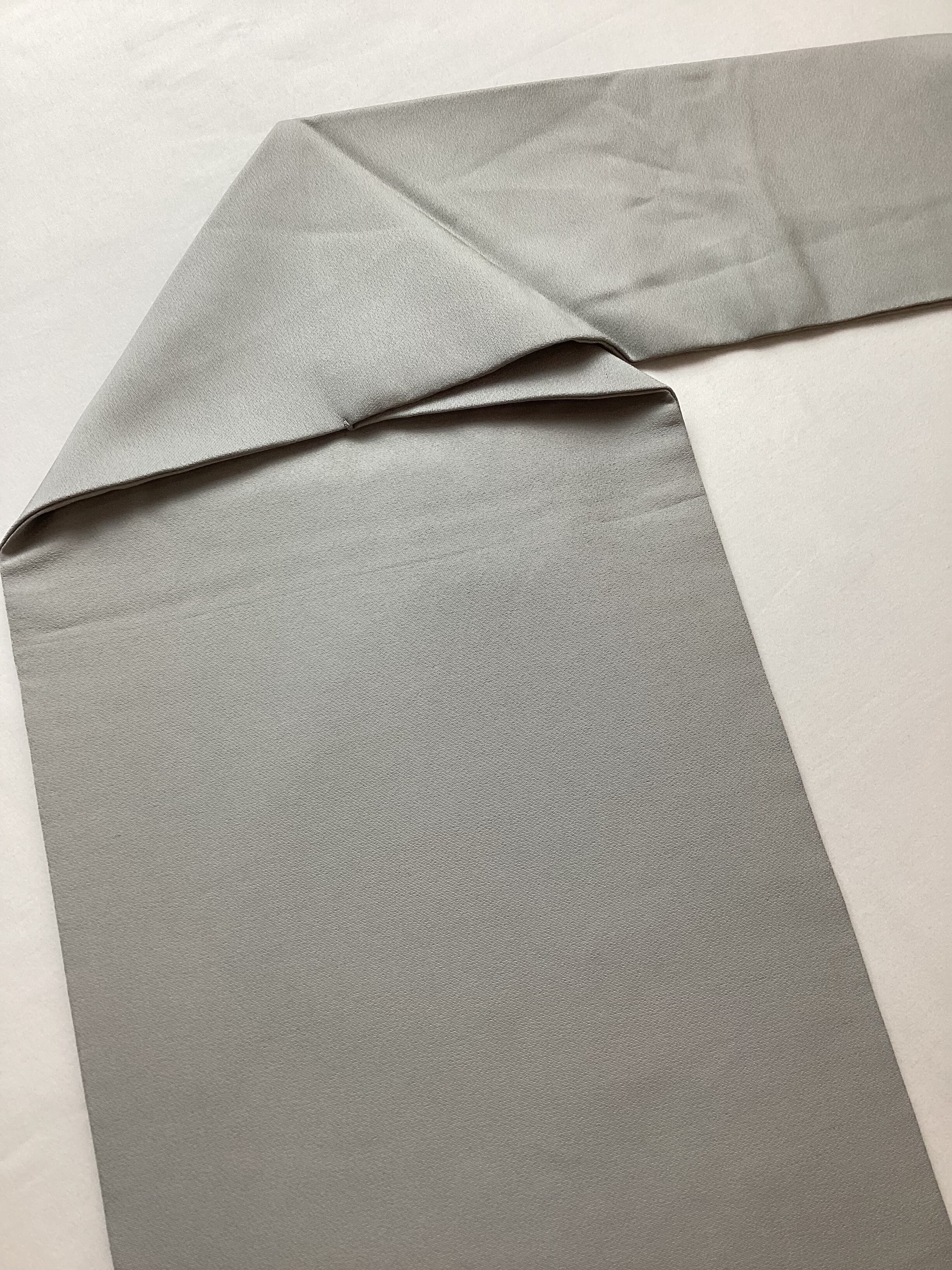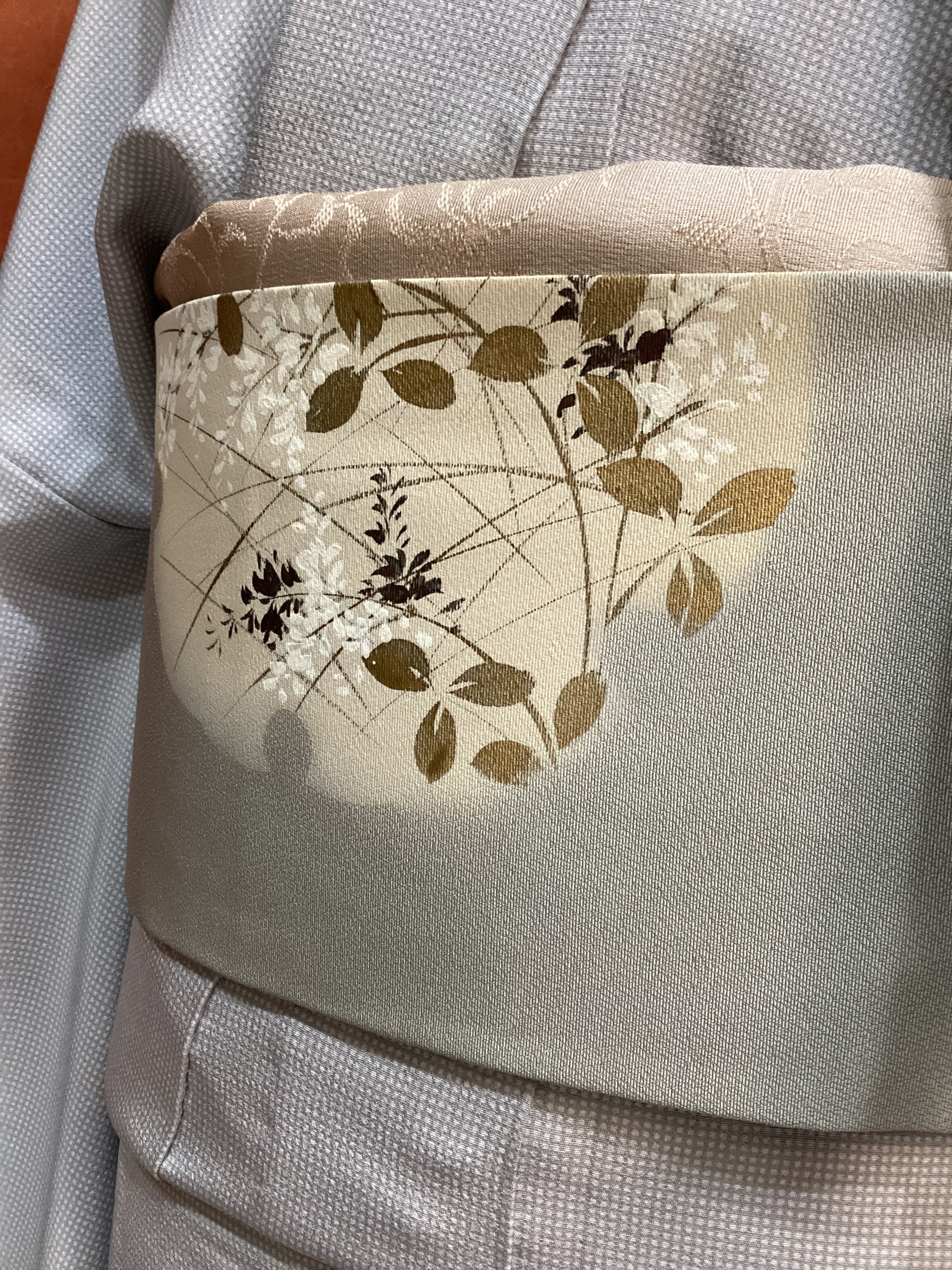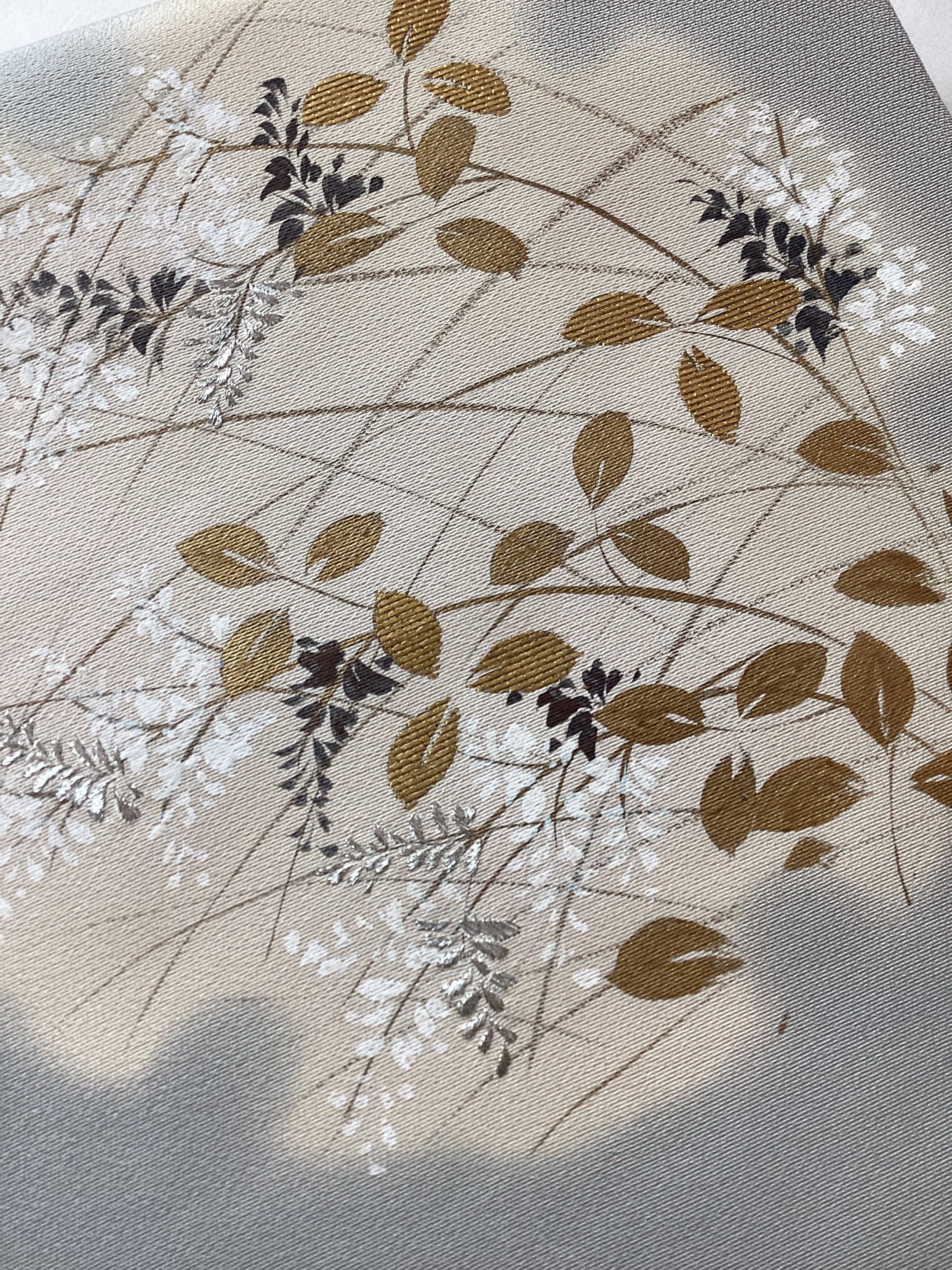 銀鼠色にオタイコや前柄部分にぼんやりと雪輪が浮かび上がり、その中に萩が描かれた季節感ある染め帯です。萩の葉を金で彩色したり、蕾を銀糸で刺繍したり、少し煌めきを持たせて上品な仕上がりとなっております。