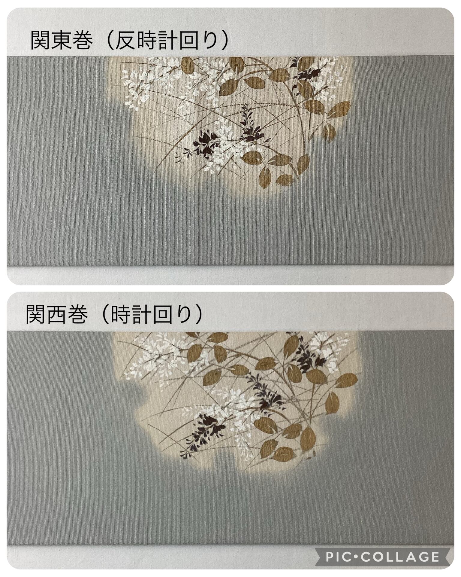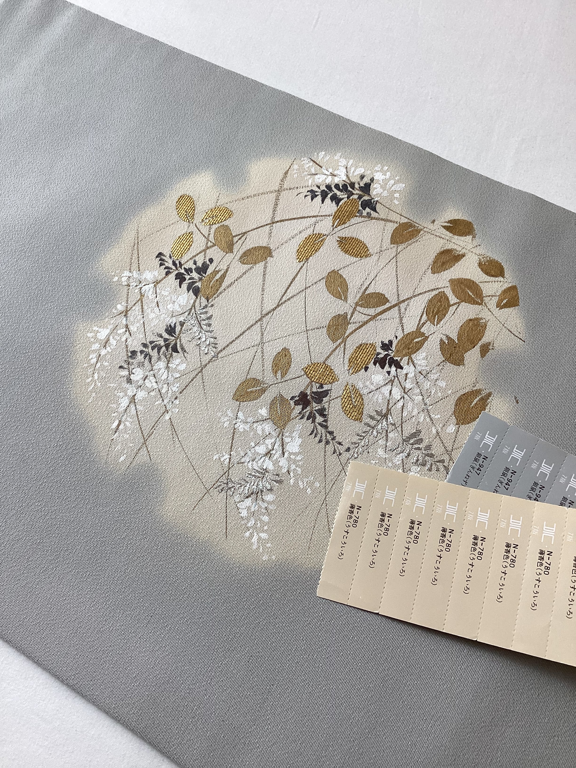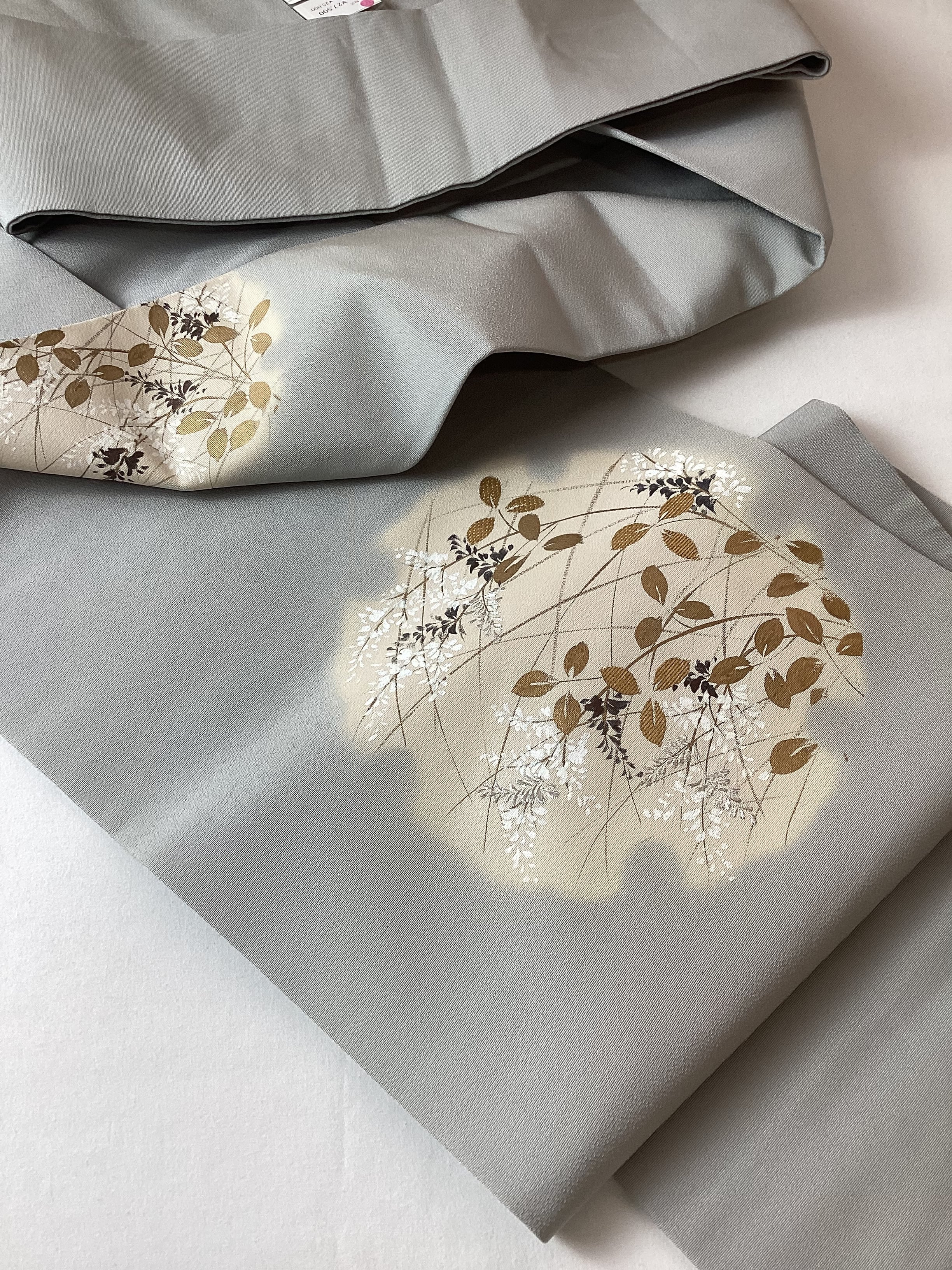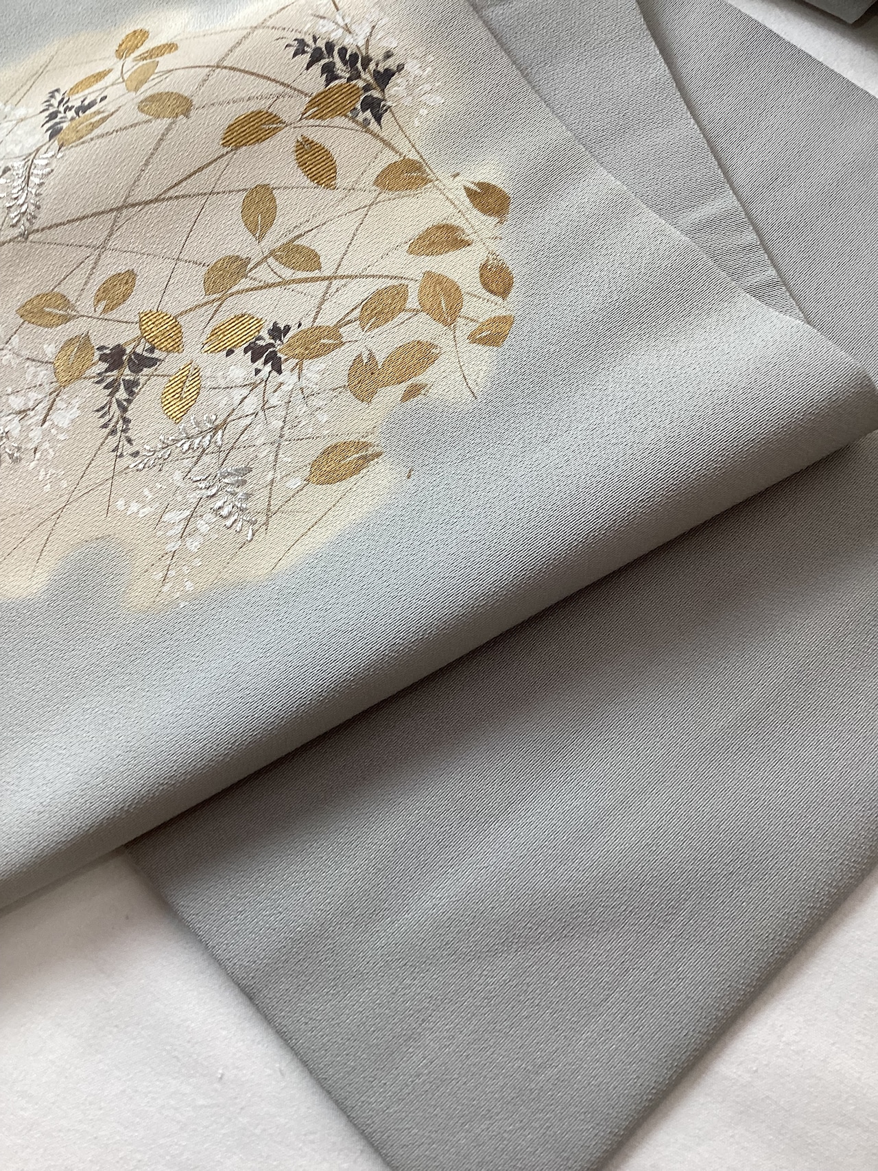 銀鼠色にオタイコや前柄部分にぼんやりと雪輪が浮かび上がり、その中に萩が描かれた季節感ある染め帯です。萩の葉を金で彩色したり、蕾を銀糸で刺繍したり、少し煌めきを持たせて上品な仕上がりとなっております。