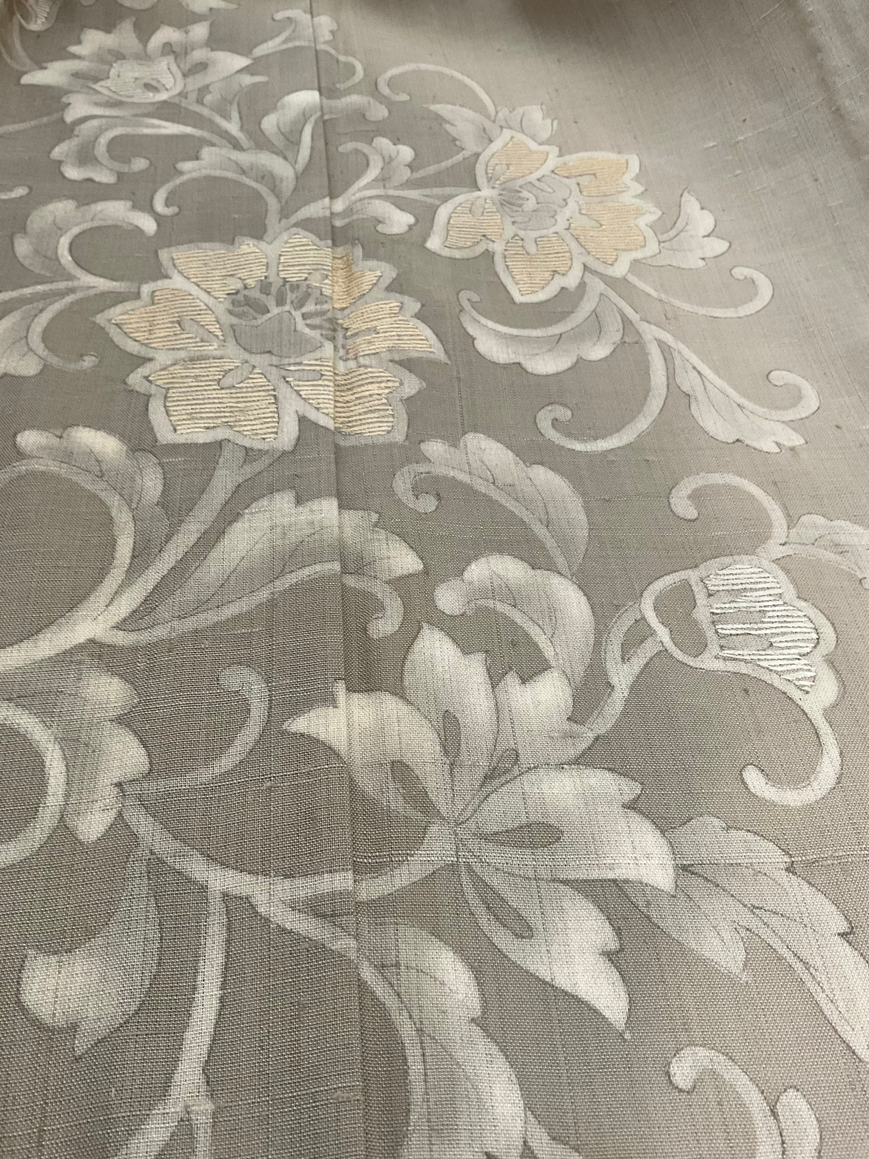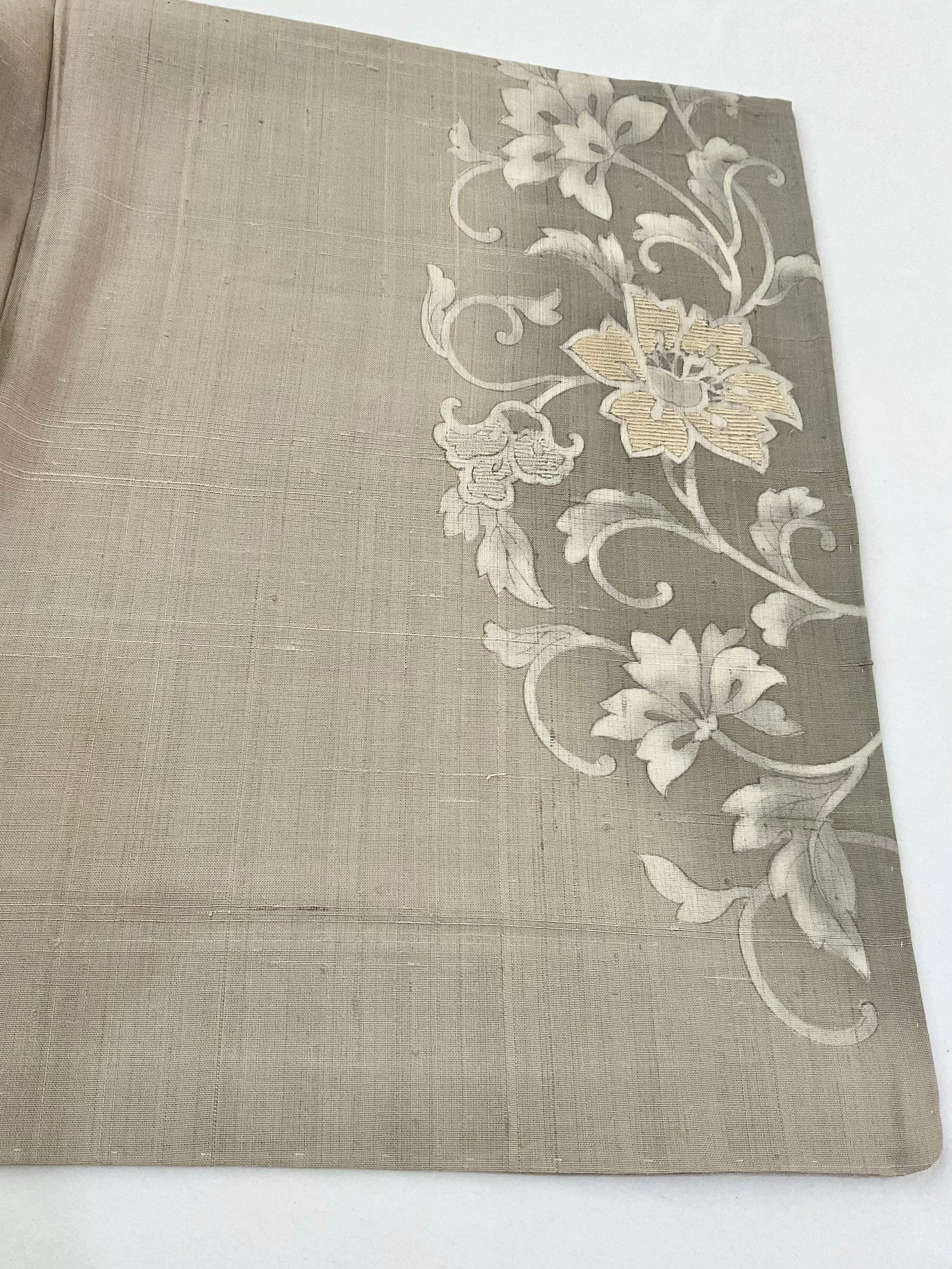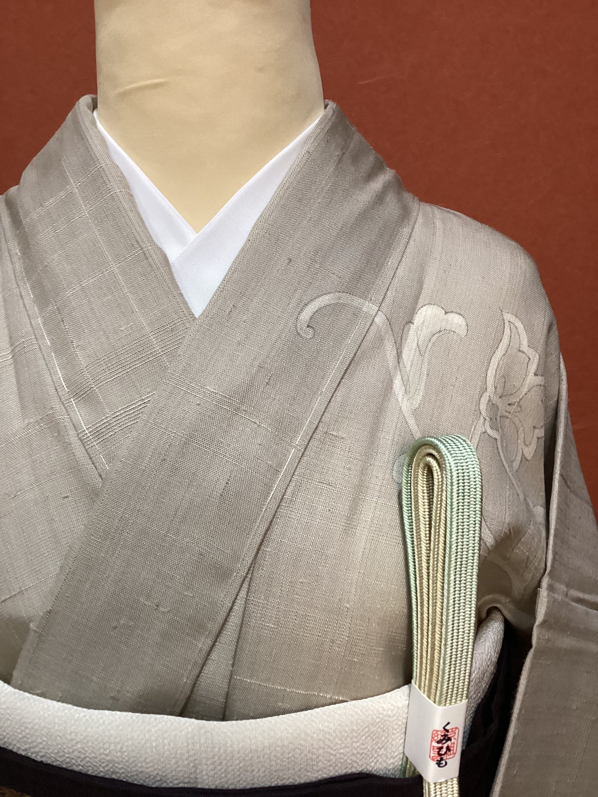シックなサンドカラーの紬地にオリエンタルな雰囲気の唐花文様が染められ、花びらにはマットな絹糸で一部刺繍が施されて落ち着いた華やかさもあります。まだ暑さを感じる時季に最適な単衣の大人の社交着として、おすすめの一枚です。