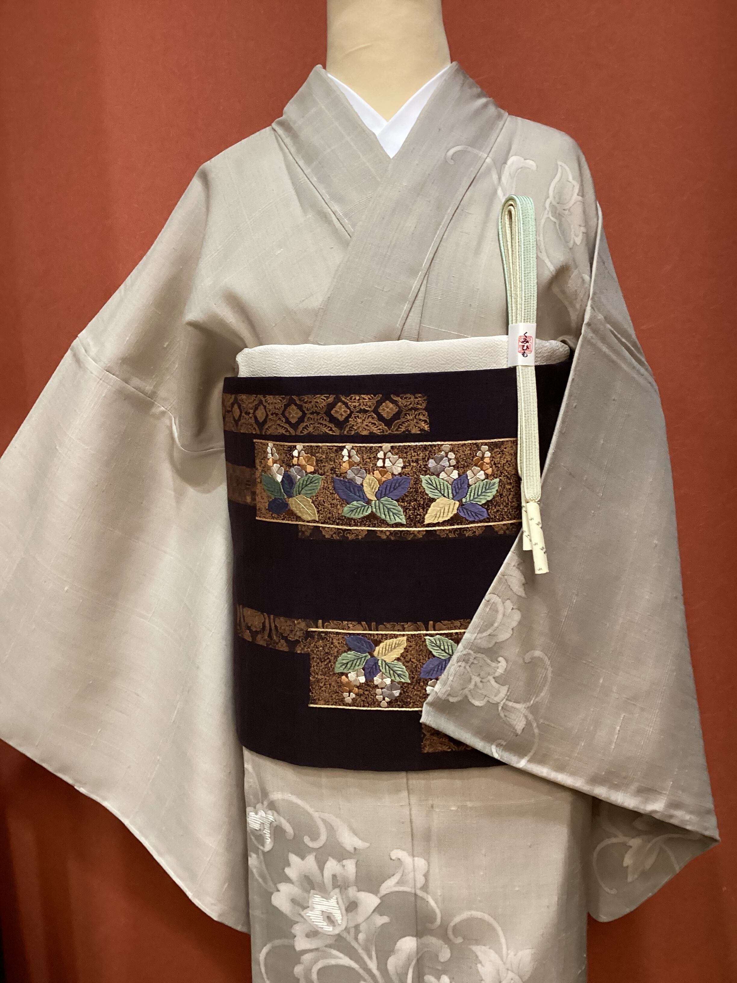 こっくりと深みのある、少し茶色味を感じる美しい紫色地の紬の洒落袋帯です。張りがあって柔らかな地風の紬地に燻したような金古美色で様々な細かい文様がテープ状に型で染められ、たたき染めされた上に桐の花が並んで丁寧にふっくらと刺繍されております。金駒刺繍のラインが施されたり、多種の技法が詰まった贅沢な帯です。オタイコに結ぶとタレの右下に一輪の桐の花が配されて、後ろ姿を素敵に演出してくれます。