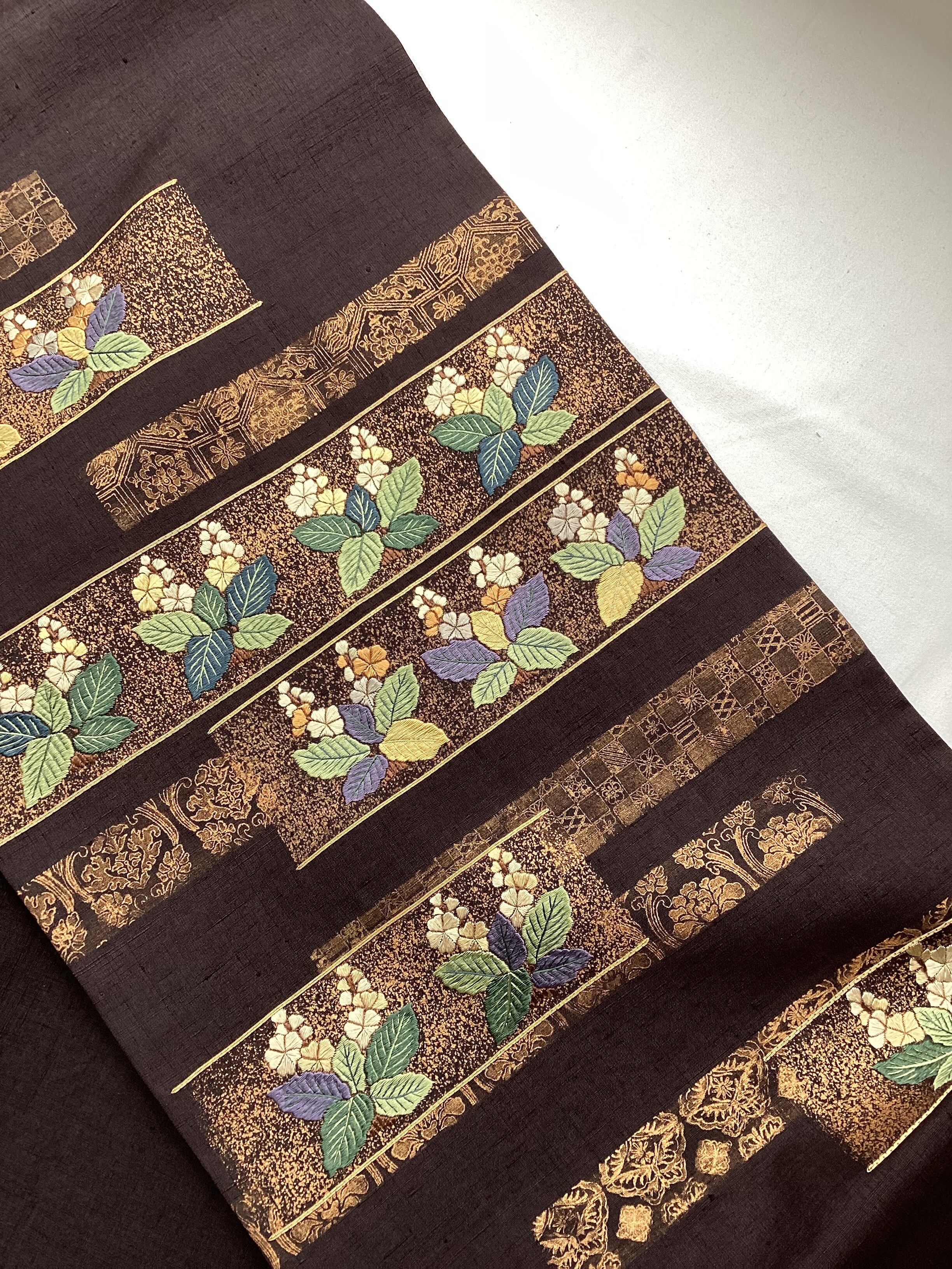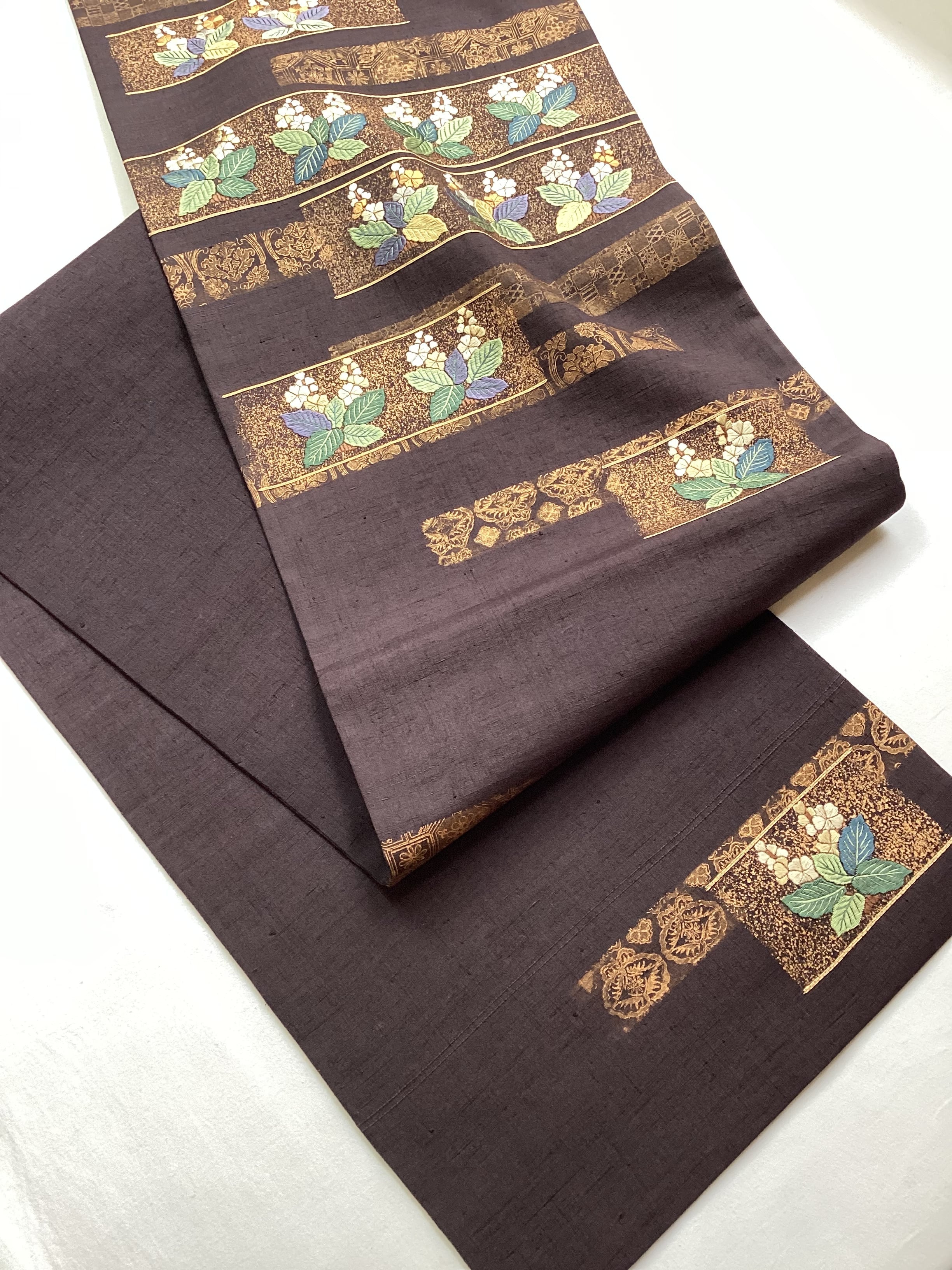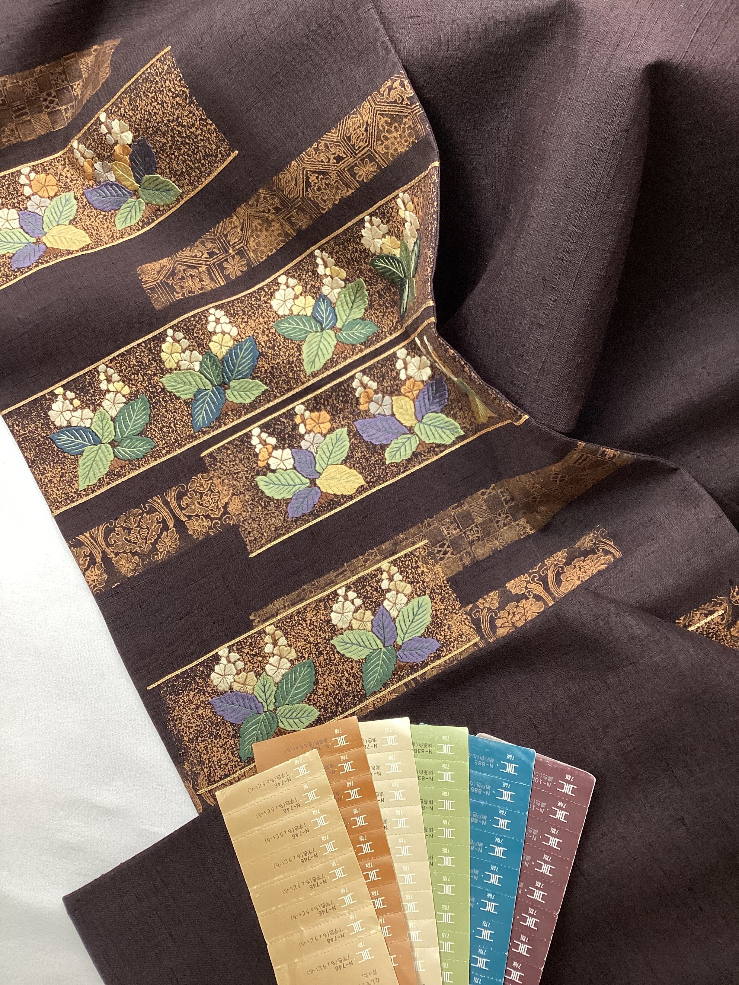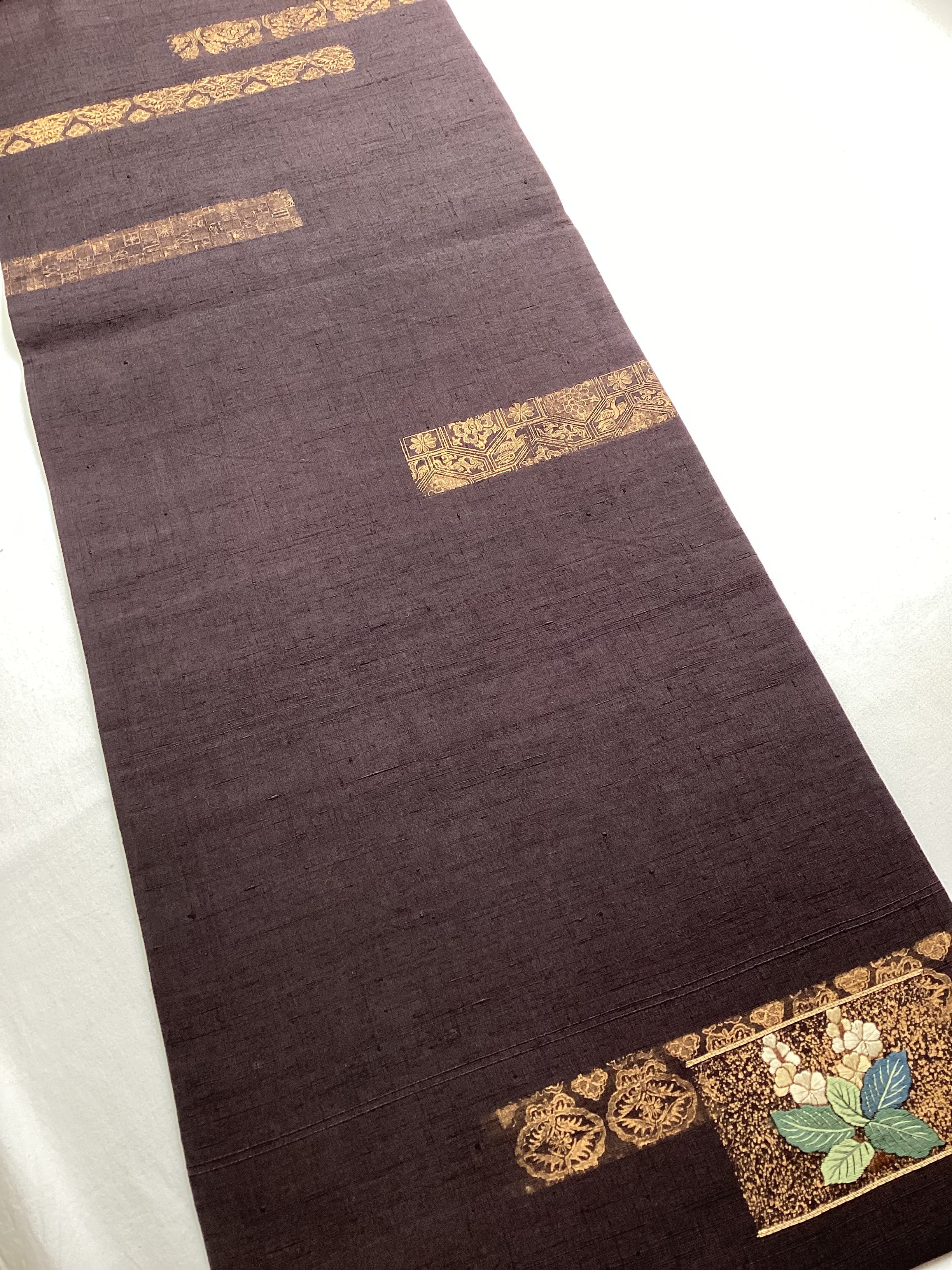 濃色地金彩桐花刺繍横段文紬袋帯 250906-2