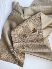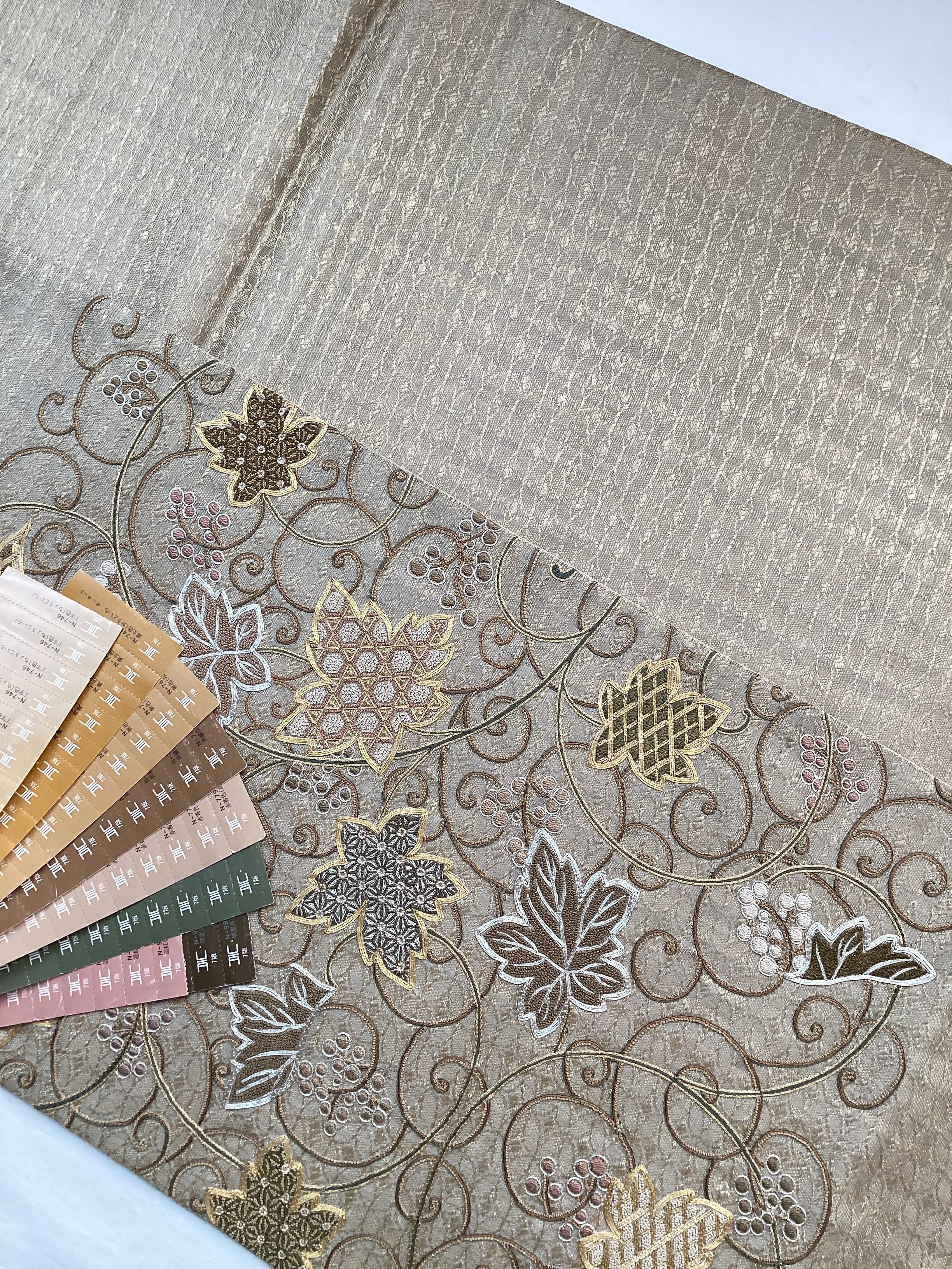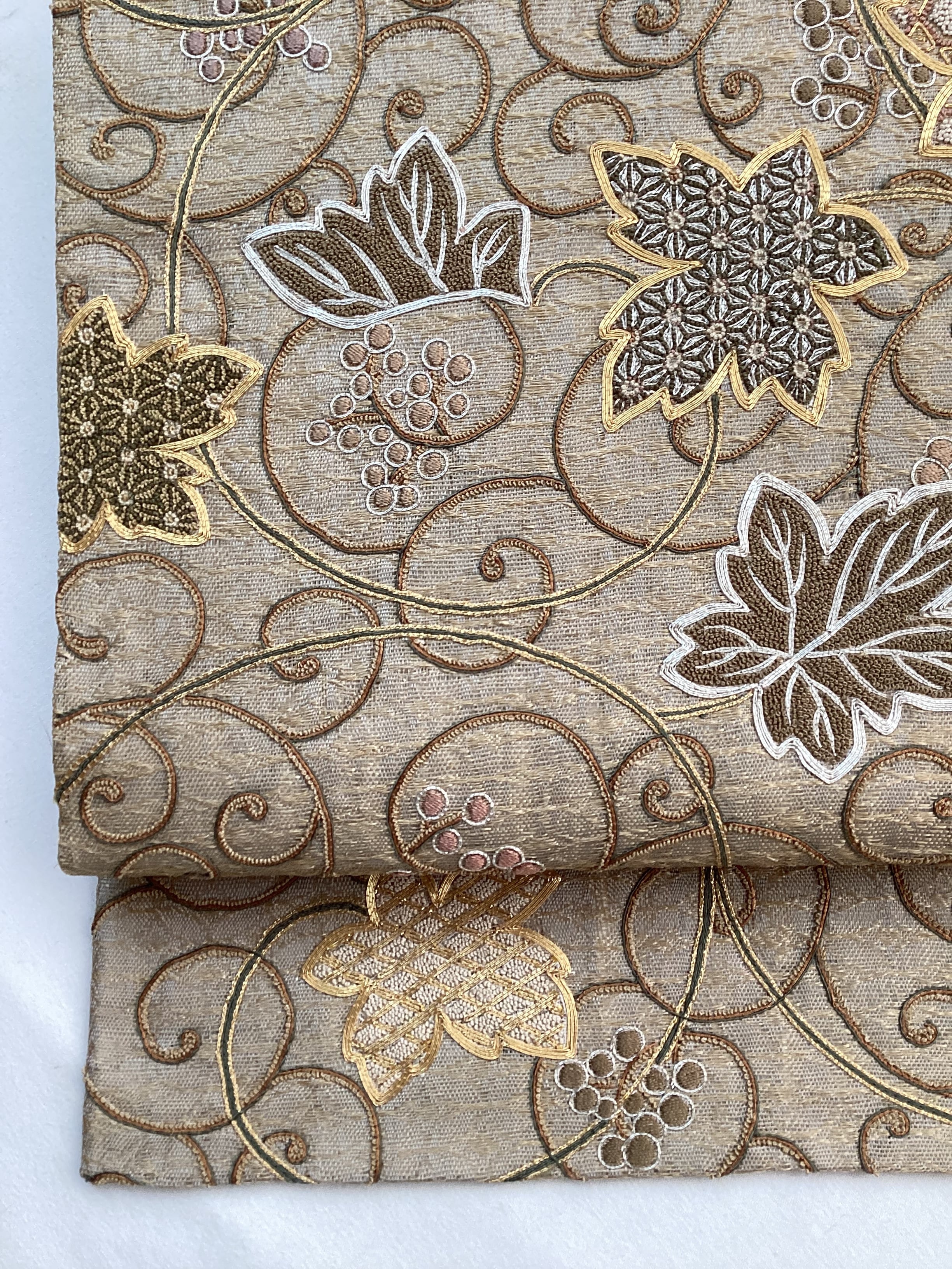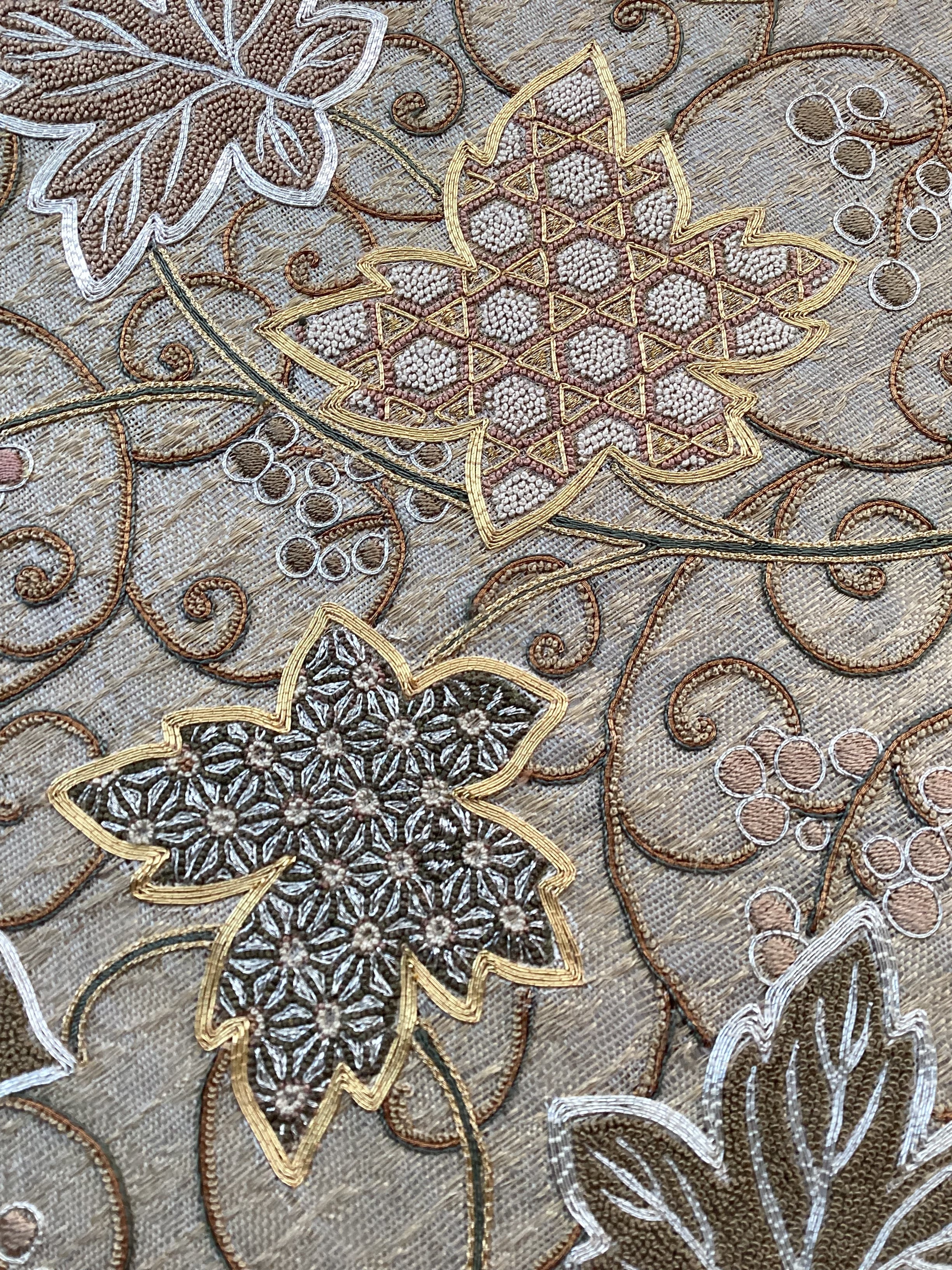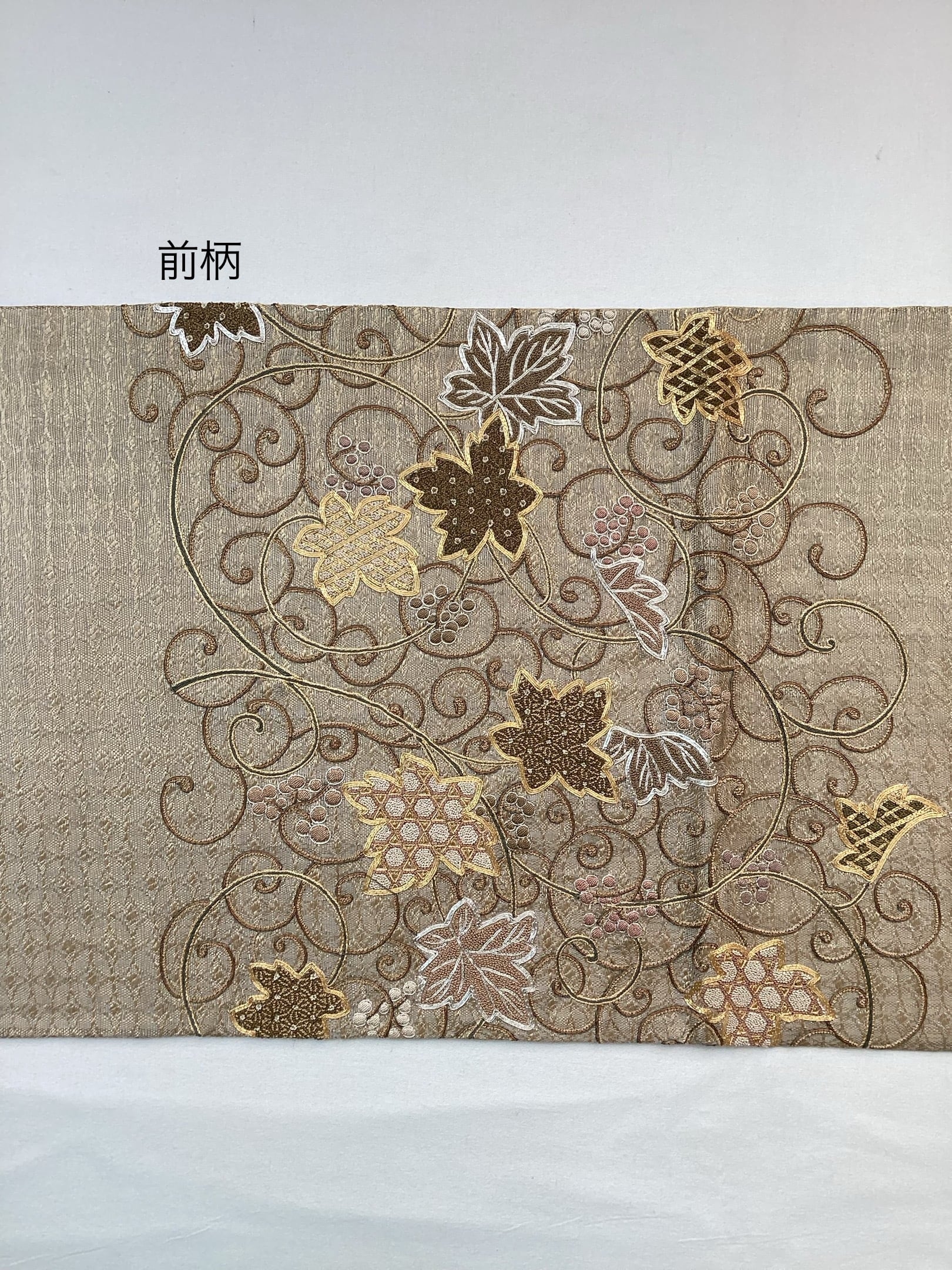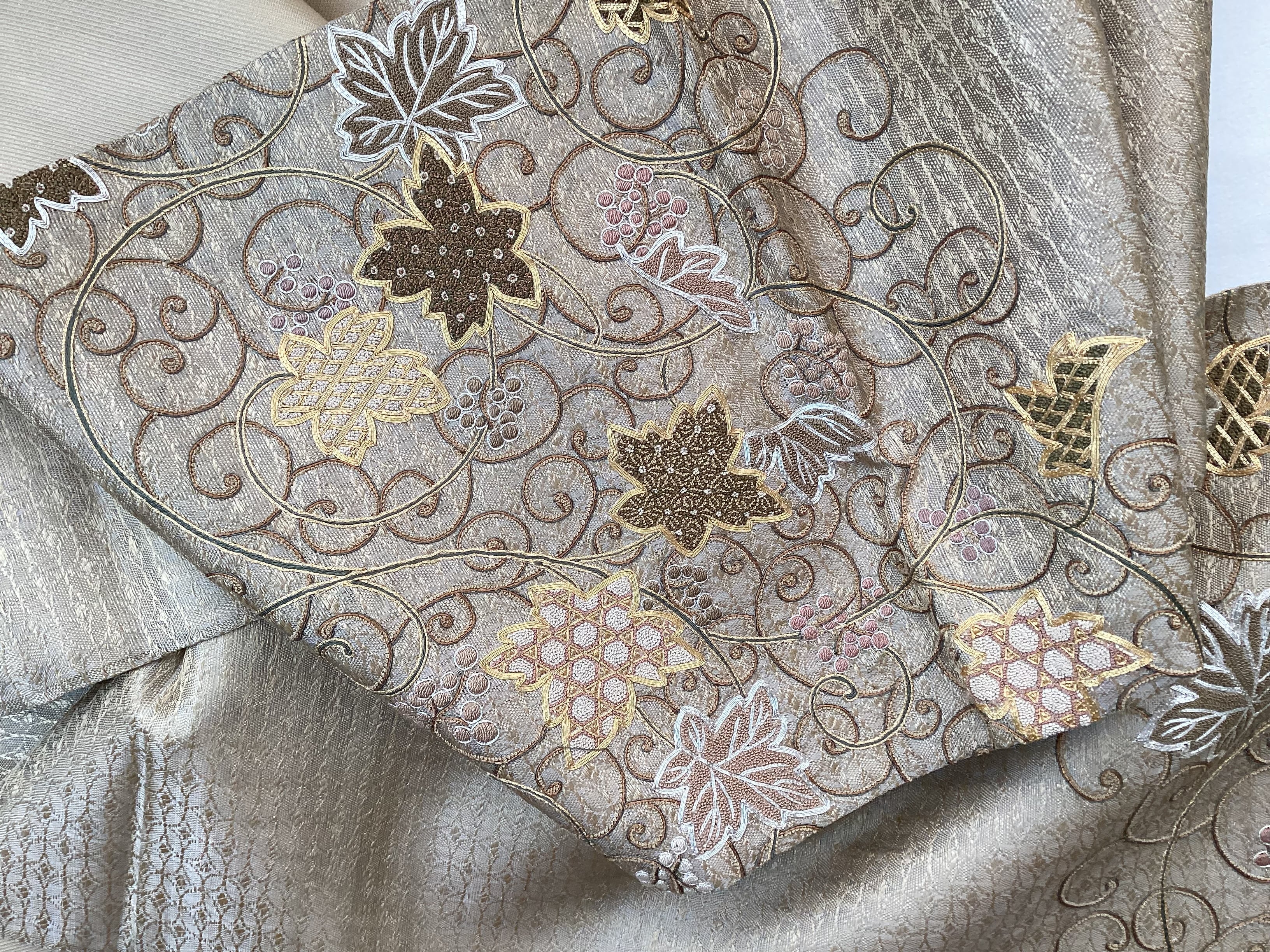 大変美しい袋帯のご紹介です。シャンパンベージュ色の艶やかな織り糸を用いて、七宝繋ぎ文様が透けるように織られたベース地の上に、葡萄唐草模様が伸びやかに相良刺繍や金駒刺繍などの技法で美しく刺繍されております。豪華さはありますが派手に成らず、色をワントーンに抑えて上品な華やかさのある袋帯です。生地一枚では透け感がございますが、帯に仕立て上がった全体の雰囲気には透け感が感じられず、季節の巾広く、単衣や袷にコーディネートしていただける便利なお品です。薄い帯芯入りで軽やかにお締めいただけます。パーティーやお食事会、観劇など、大人の社交の場にいかがでしょうか?