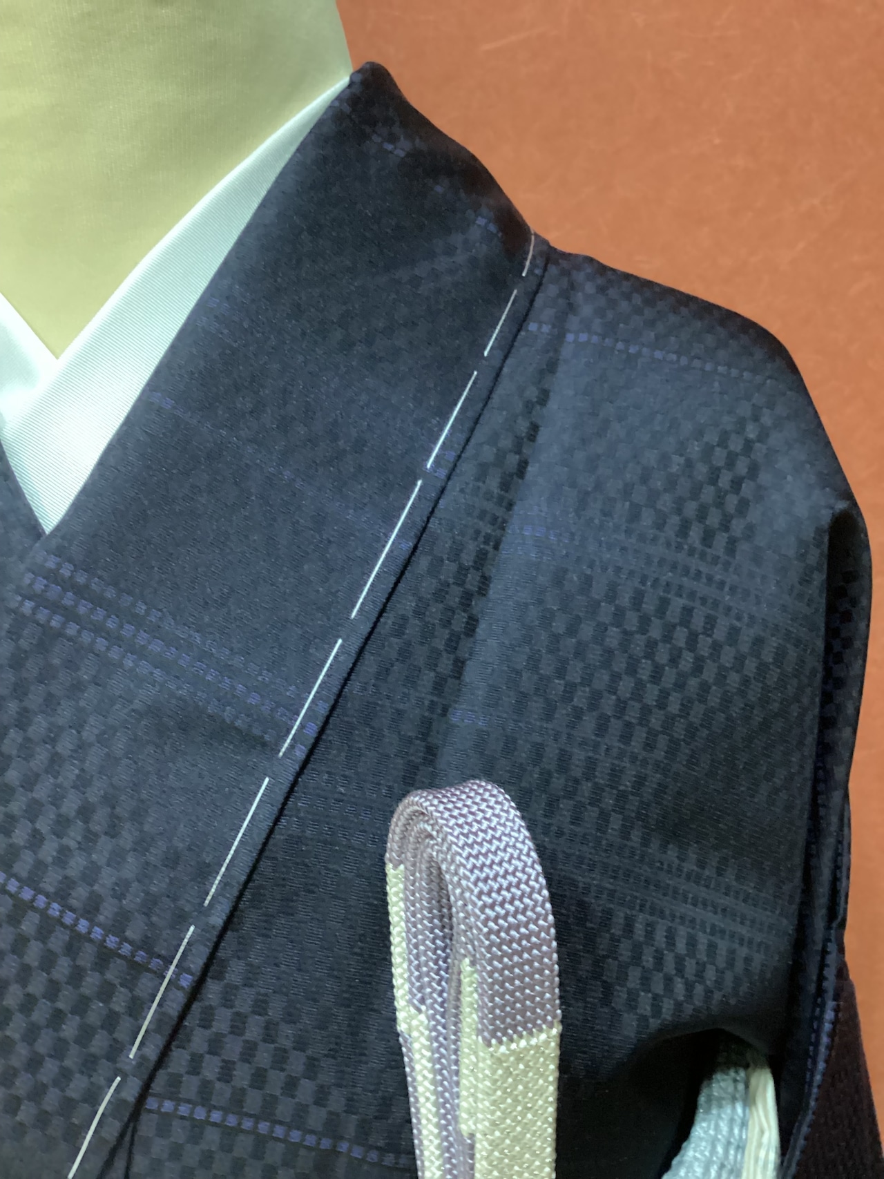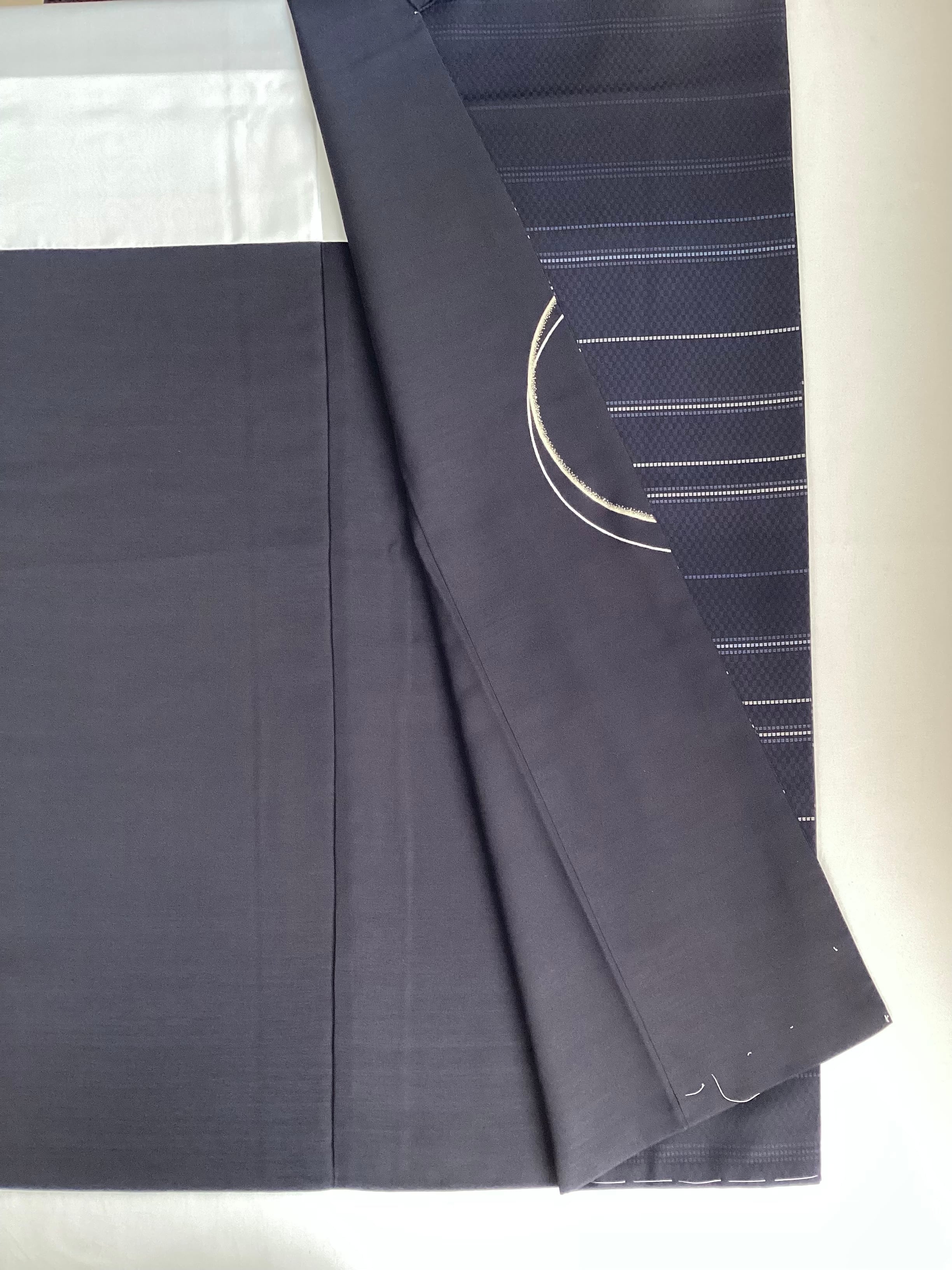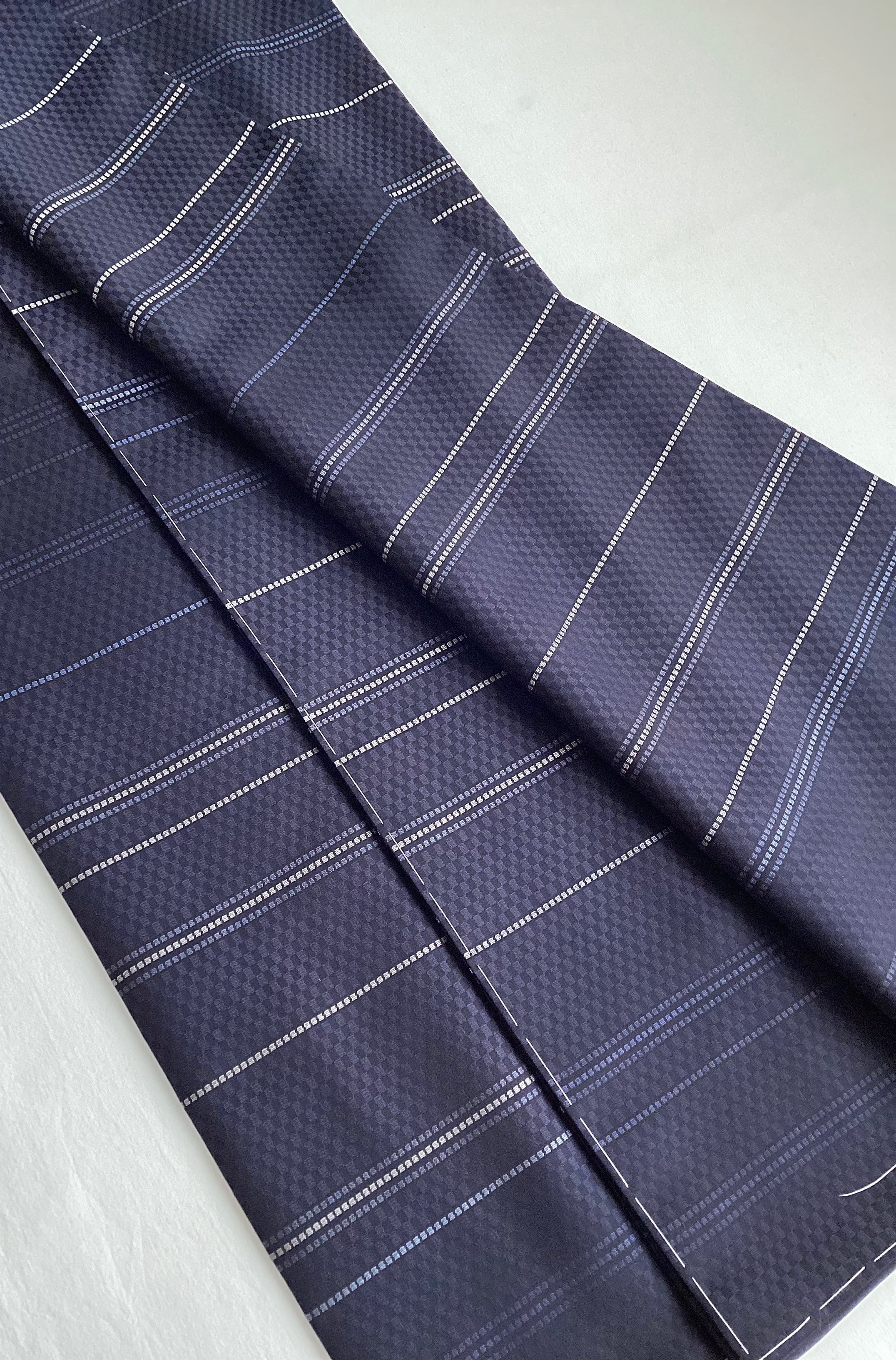 【胴抜き仕立て】紺色地市松地紋に横段文【秦流舎】お召し地附下(しつけ・証反端付き)250911-1