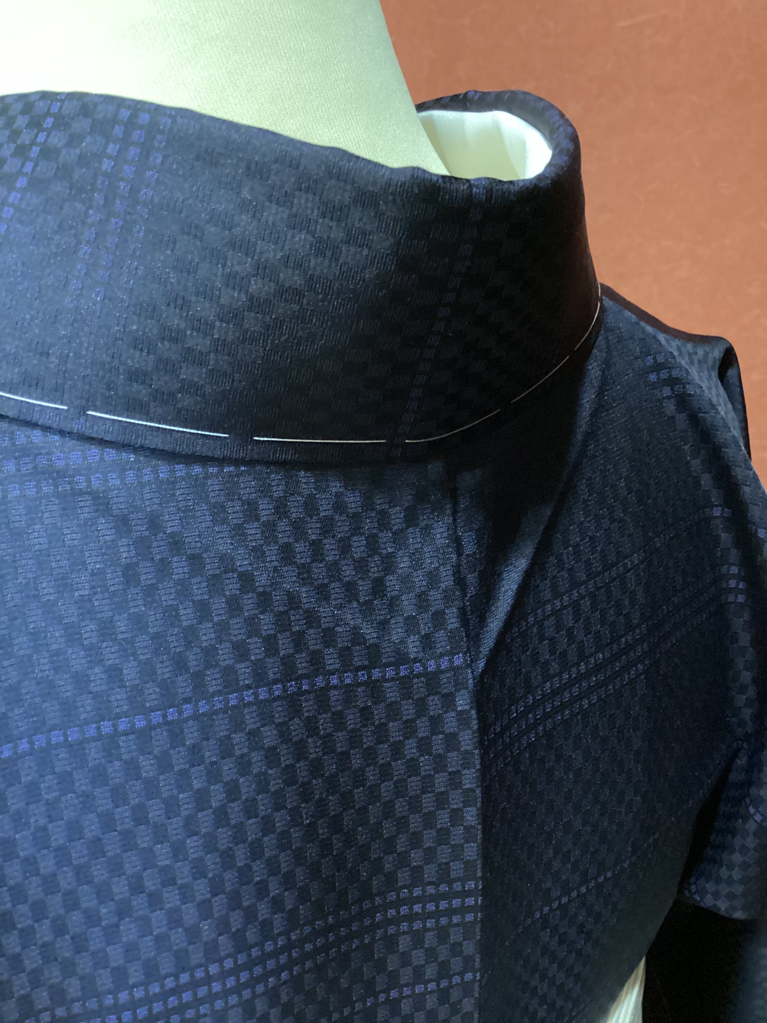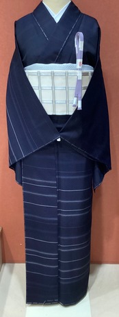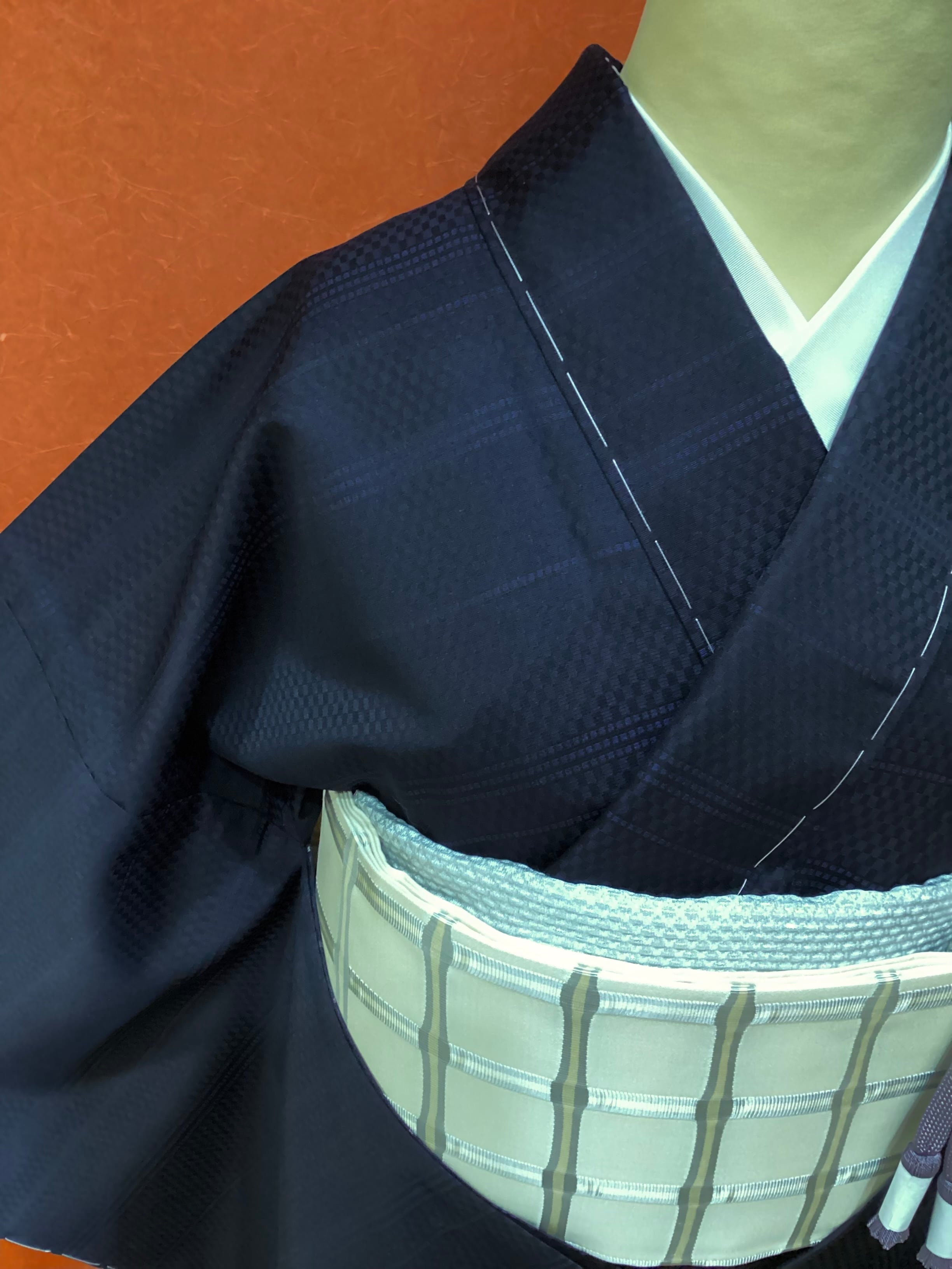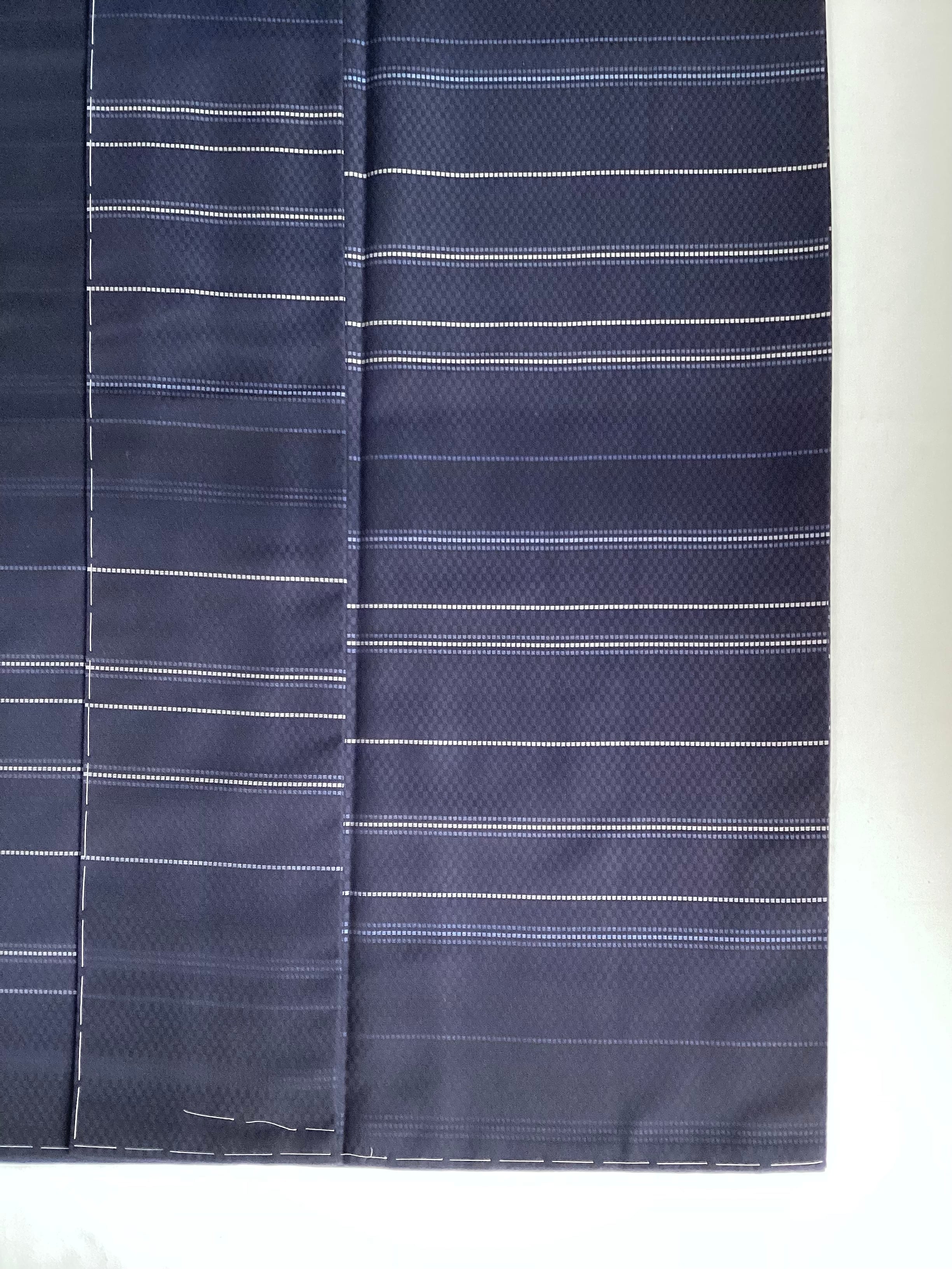 【胴抜き仕立て】紺色地市松地紋に横段文【秦流舎】お召し地附下(しつけ・証反端付き)250911-1
