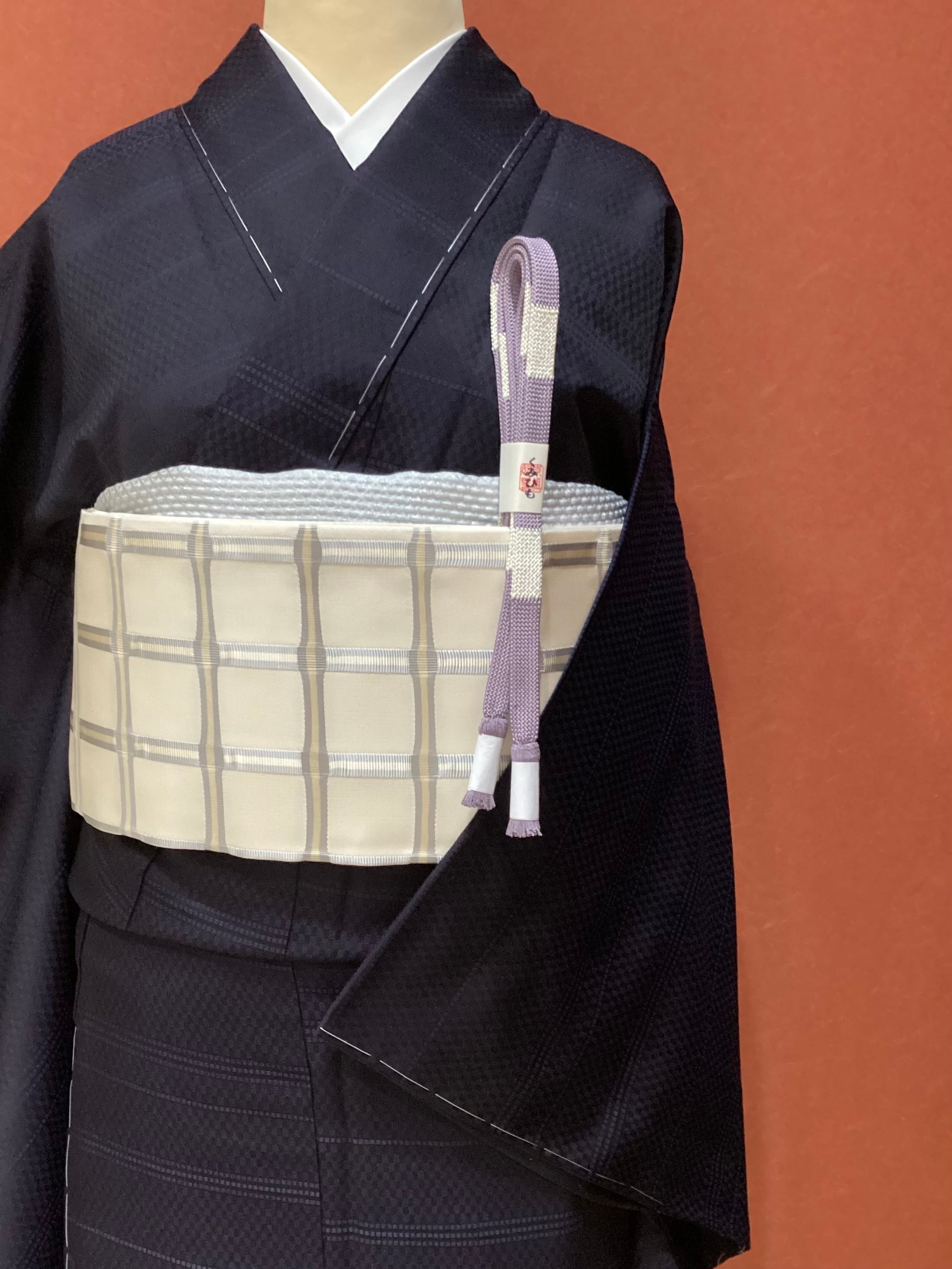 市松文様の地紋が織られた紺色地に裾や袖にシンプルな横段ラインの入ったお召し地の附下きものです。現代に馴染む文様と色合いで洗練された美を追求している西陣お召しの機元【秦流舎】のお品です。しなやかで張りのある上質な織地はまるで上等なスーツのようです。八掛にまで柄を付けた洒落味のある逸品です。胴裏の無い胴抜き仕立てで仕立てられており、季節の変わり目や、暑さが苦手な方に適しております。暑さが長引きそうなこれからの秋冬に役立つお品です。身巾がゆったりございますので、お探しの方はいかがでしょうか。