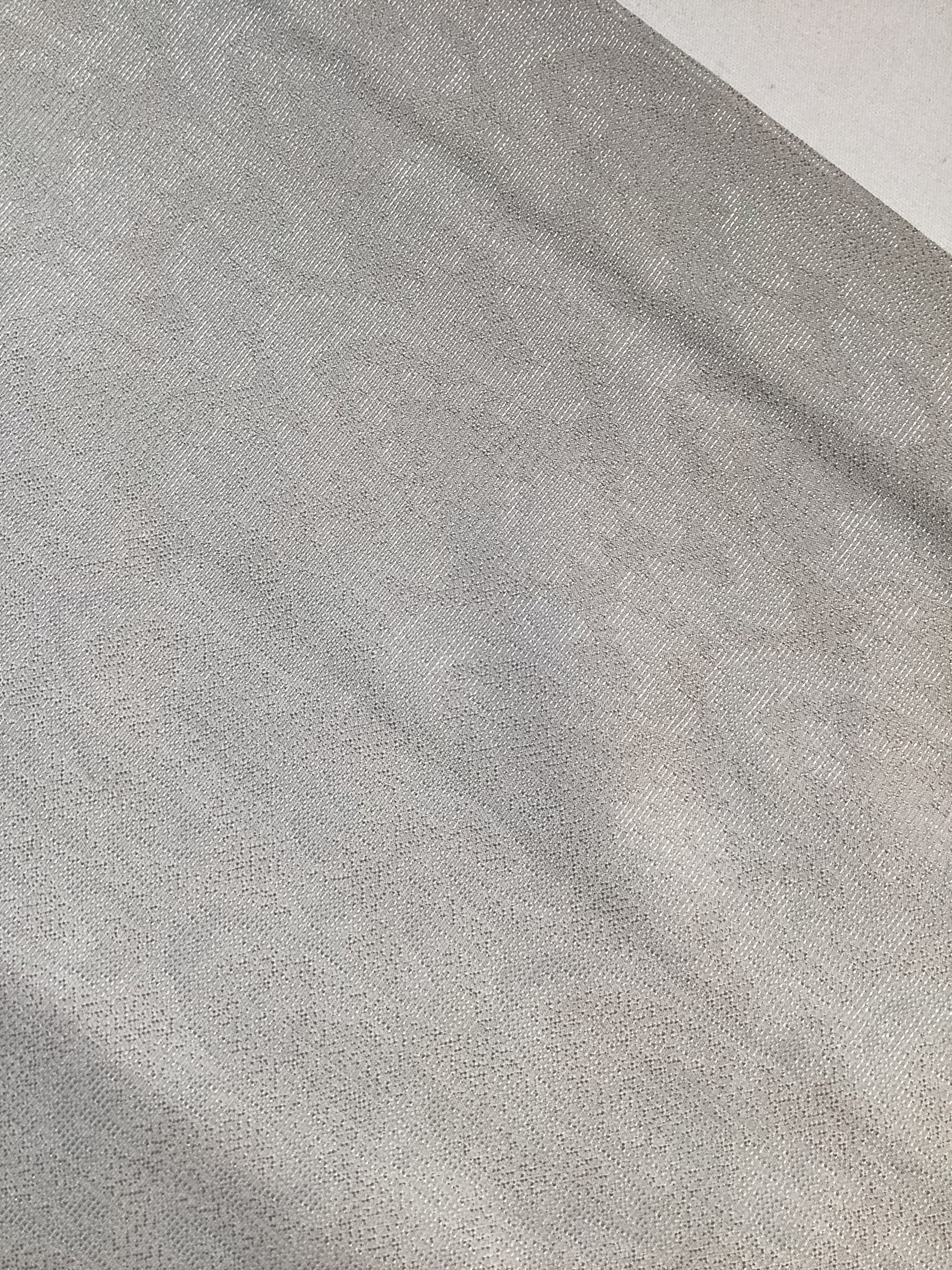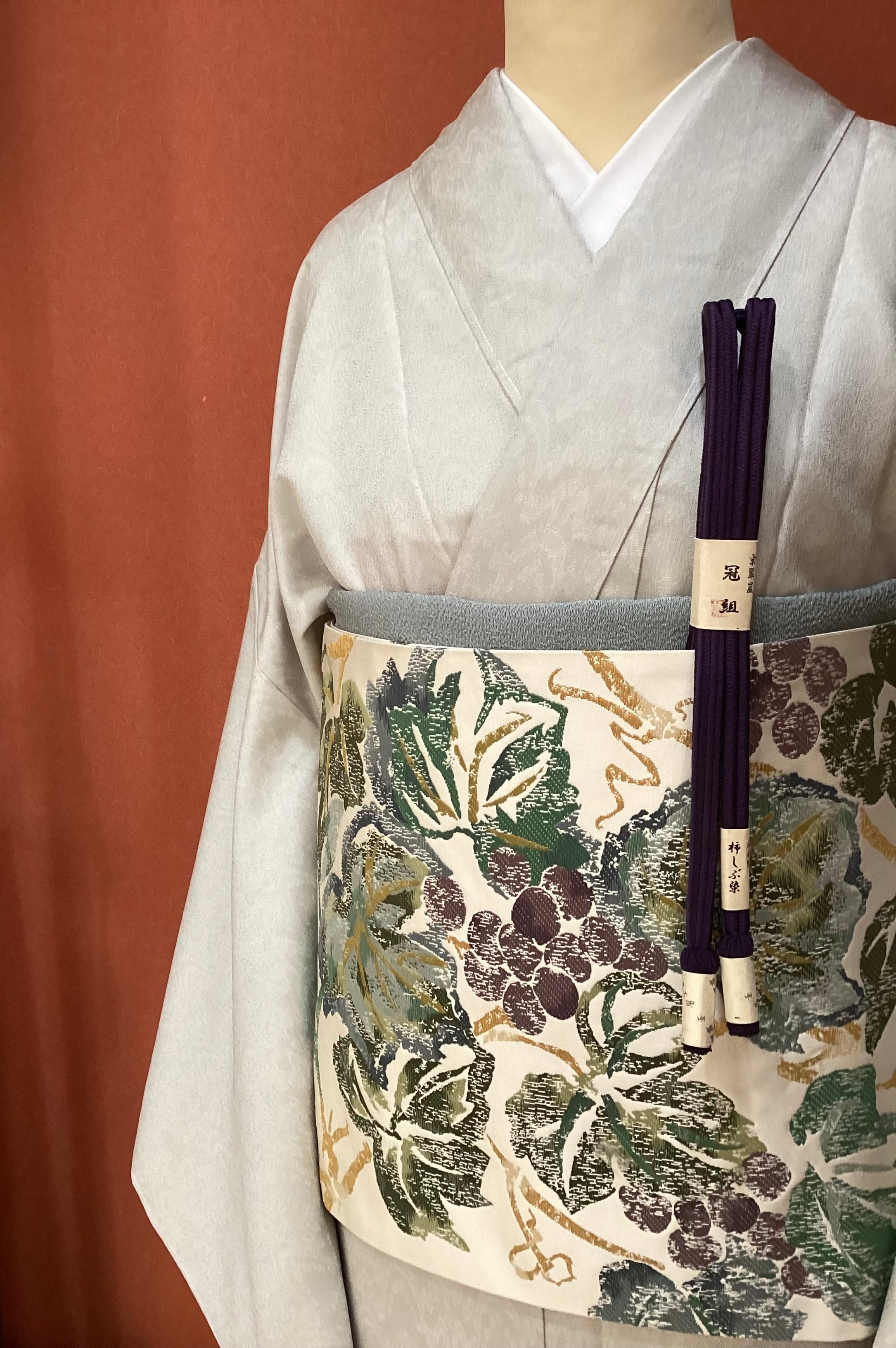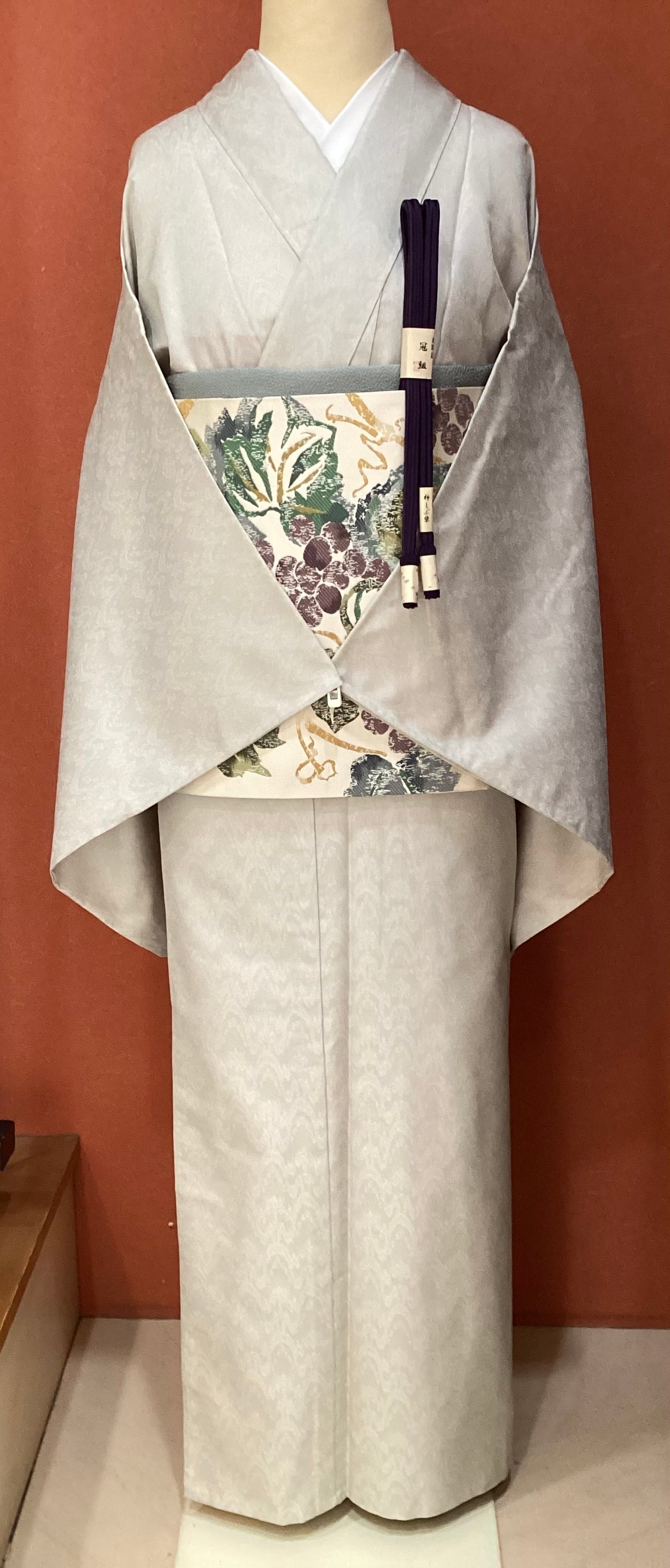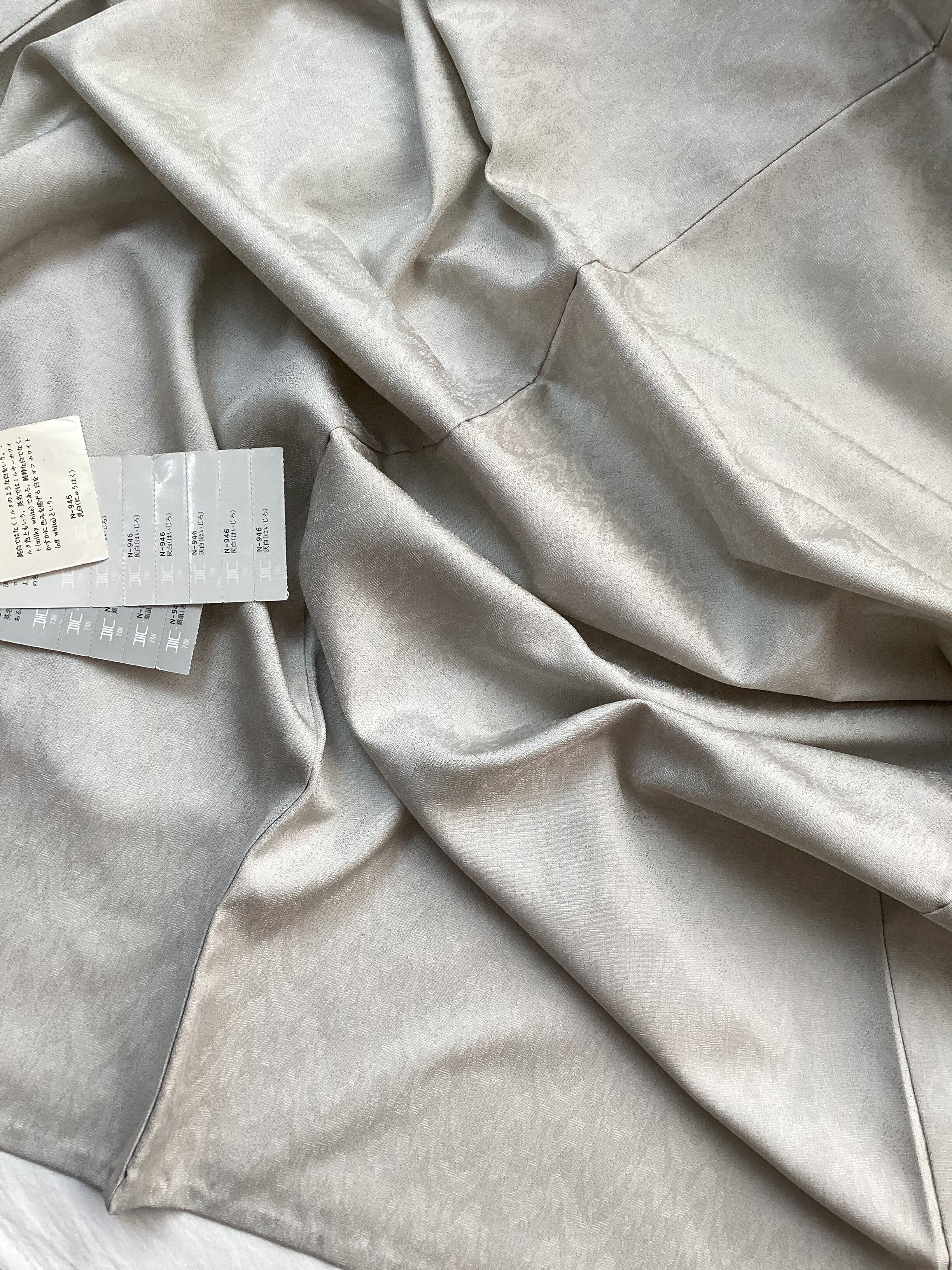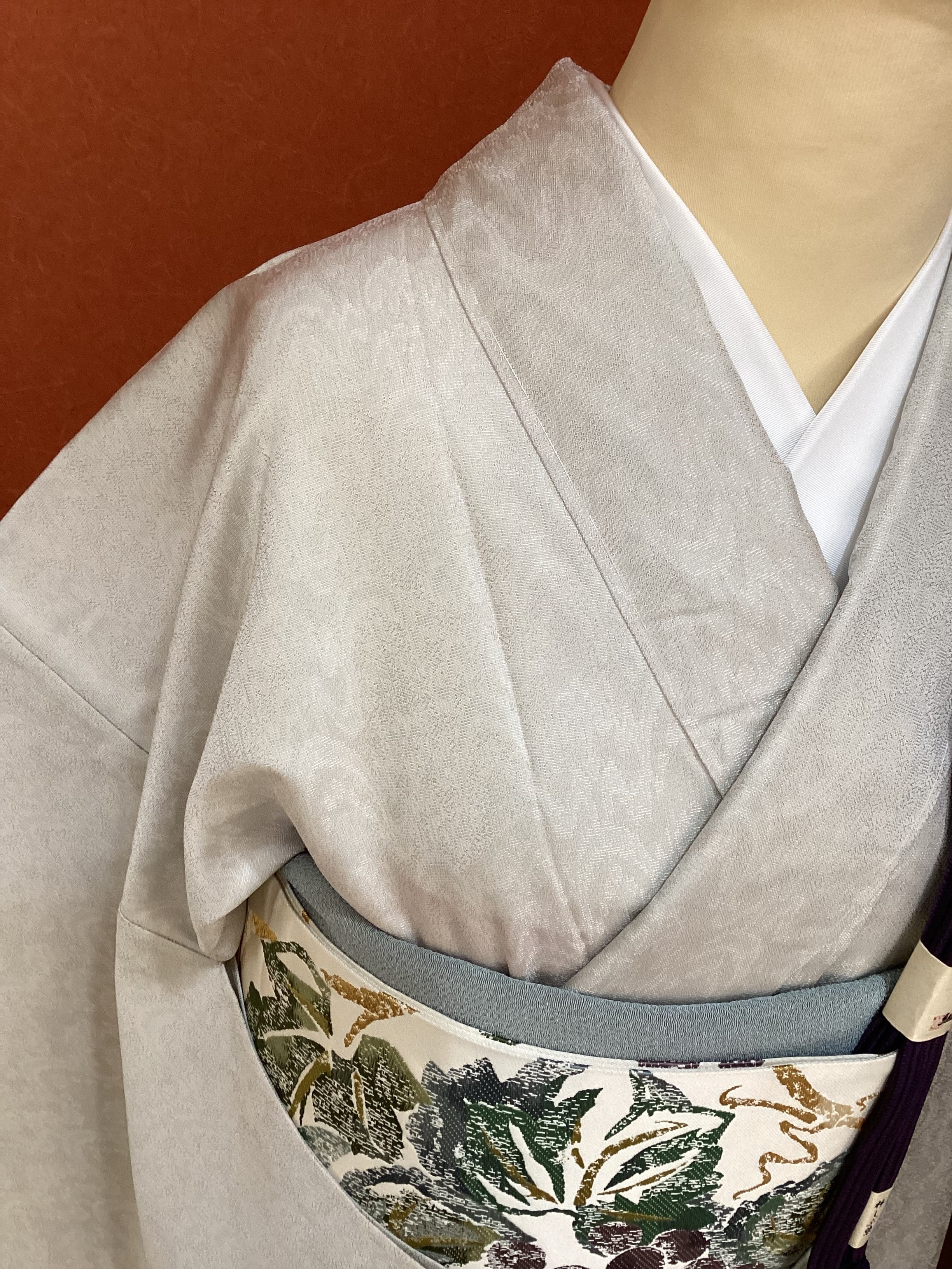 白に近いグレーのお召し地の単衣きものです。お召し特有のしっかりとした張りのある厚手の地風で、太子間道の地紋が織り込まれております。生地が動くと文様が浮かび上がり、光沢や艶が感じられます。遠目には無地に見えてシンプルなおきものなので、帯合わせ次第でカジュアルからセミフォーマルまで幅広く、年齢を問わずにお召しになっていただけます。身丈と身巾が十分にございますので、大きめのサイズをお探しの方はいかがでしょうか?