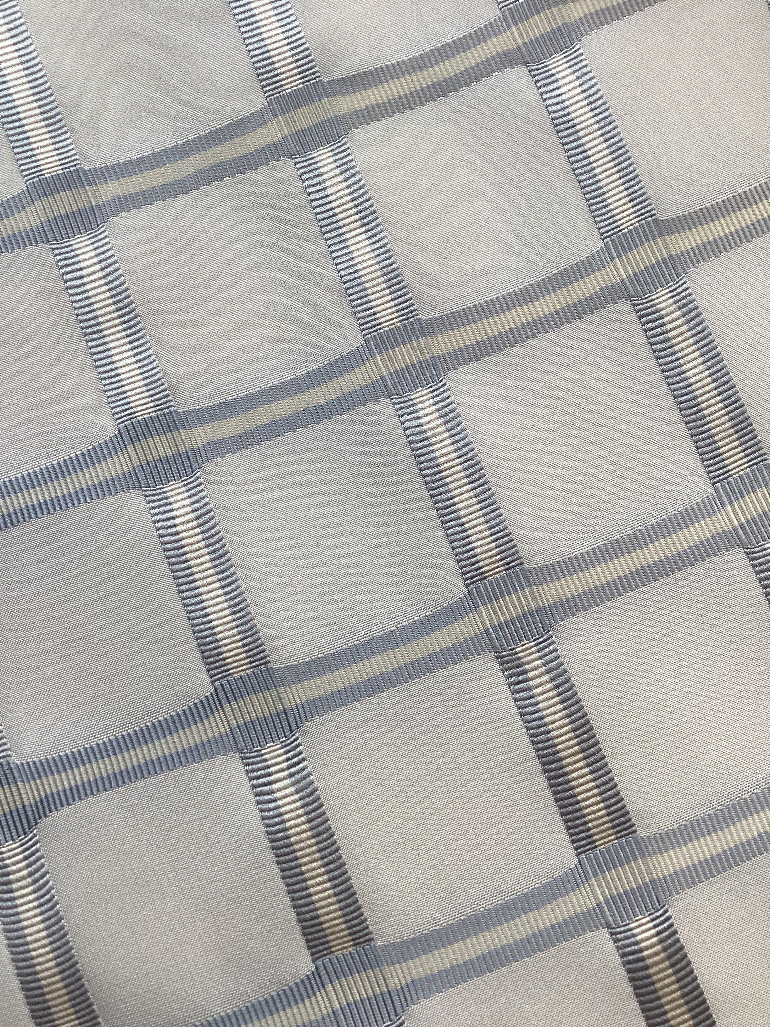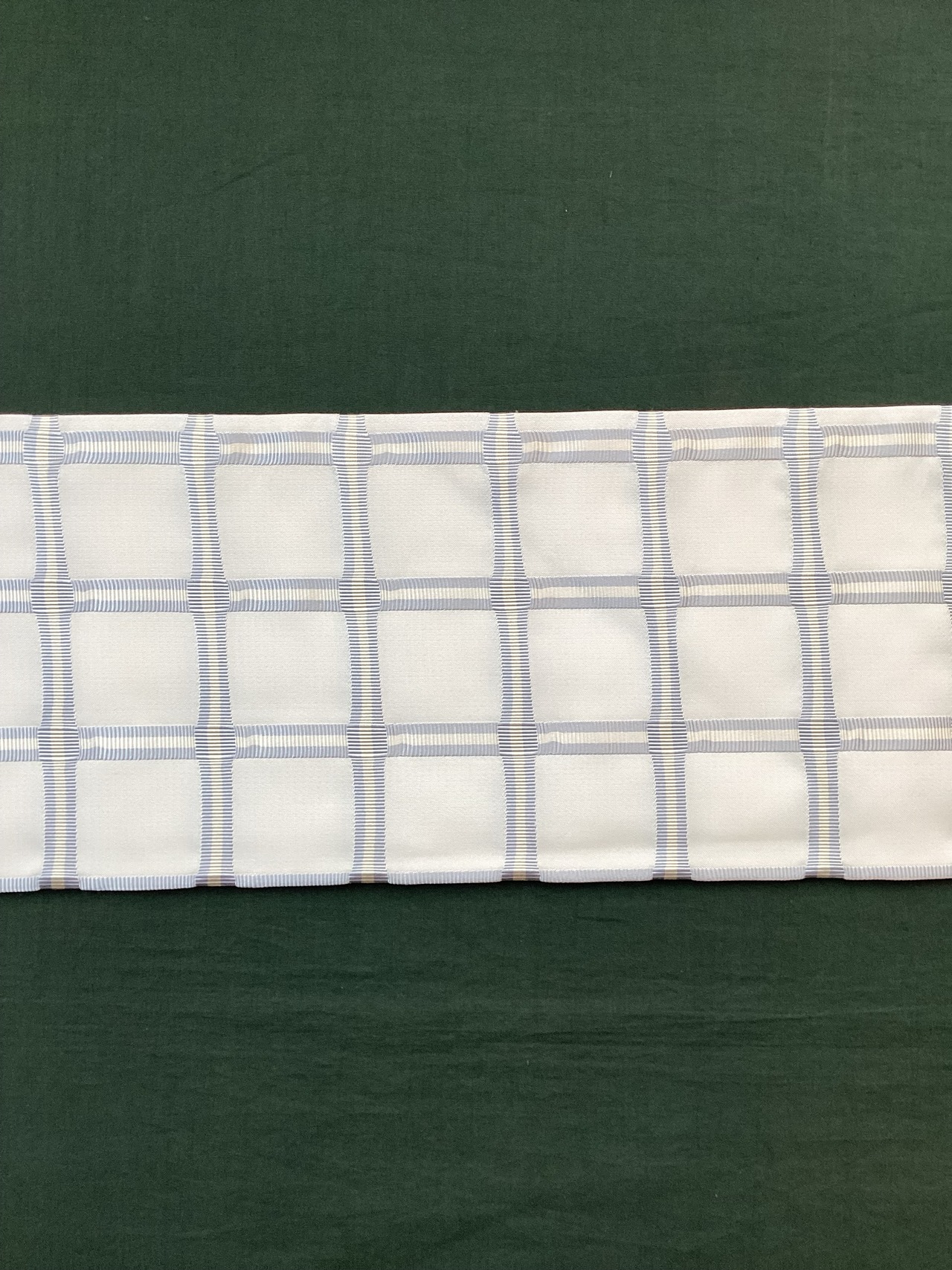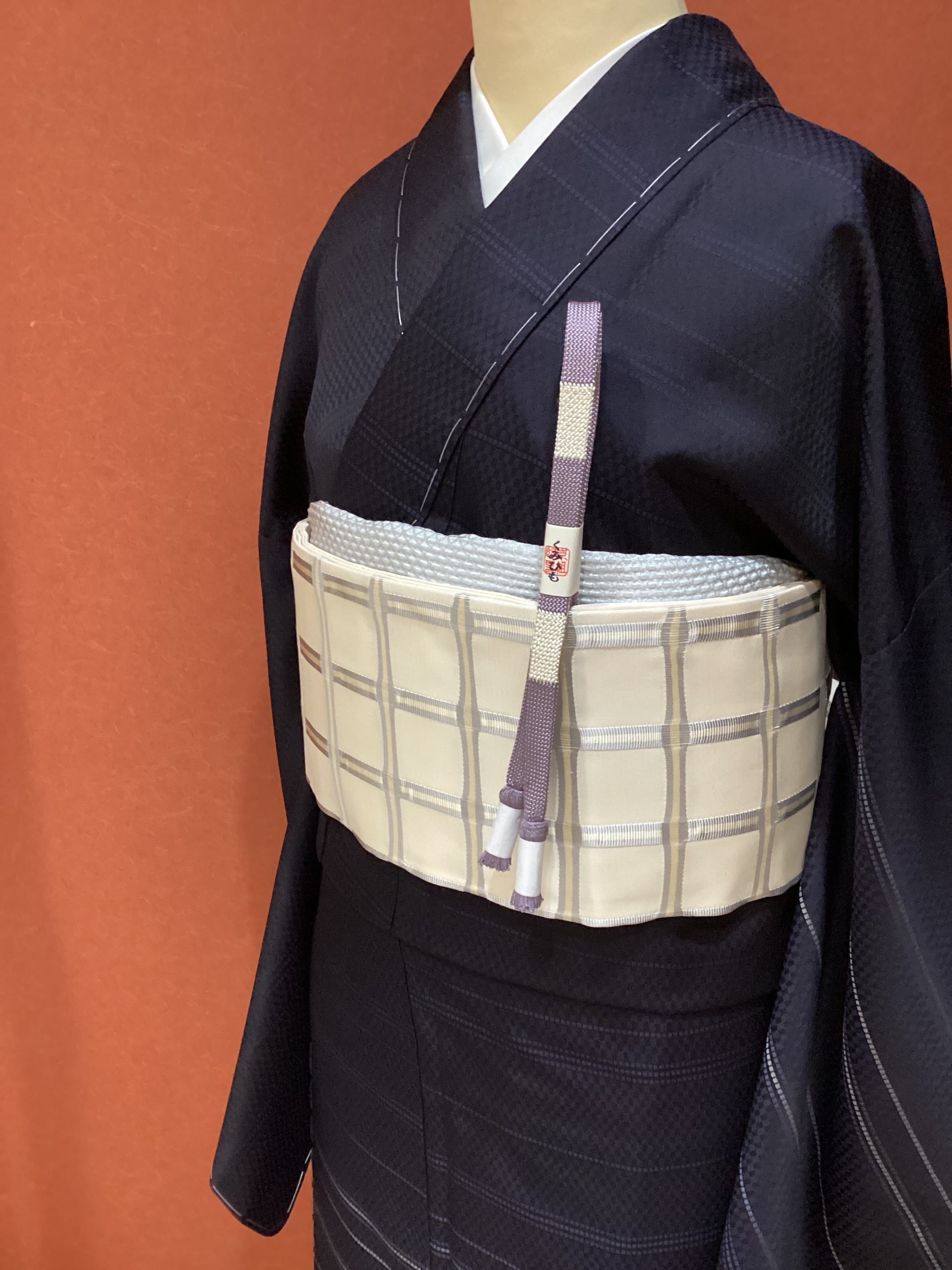 艶のあるしなやかで滑らかな乳白色の織地に銀鼠色とクリーム色の浮き織りで格子や間道文様が織り込まれております。絹糸の持つ光沢感が美しい織地で上品さがございます。白地で爽やかに、お柄の立ったおきものにもコーディネートしやすい九寸帯です。