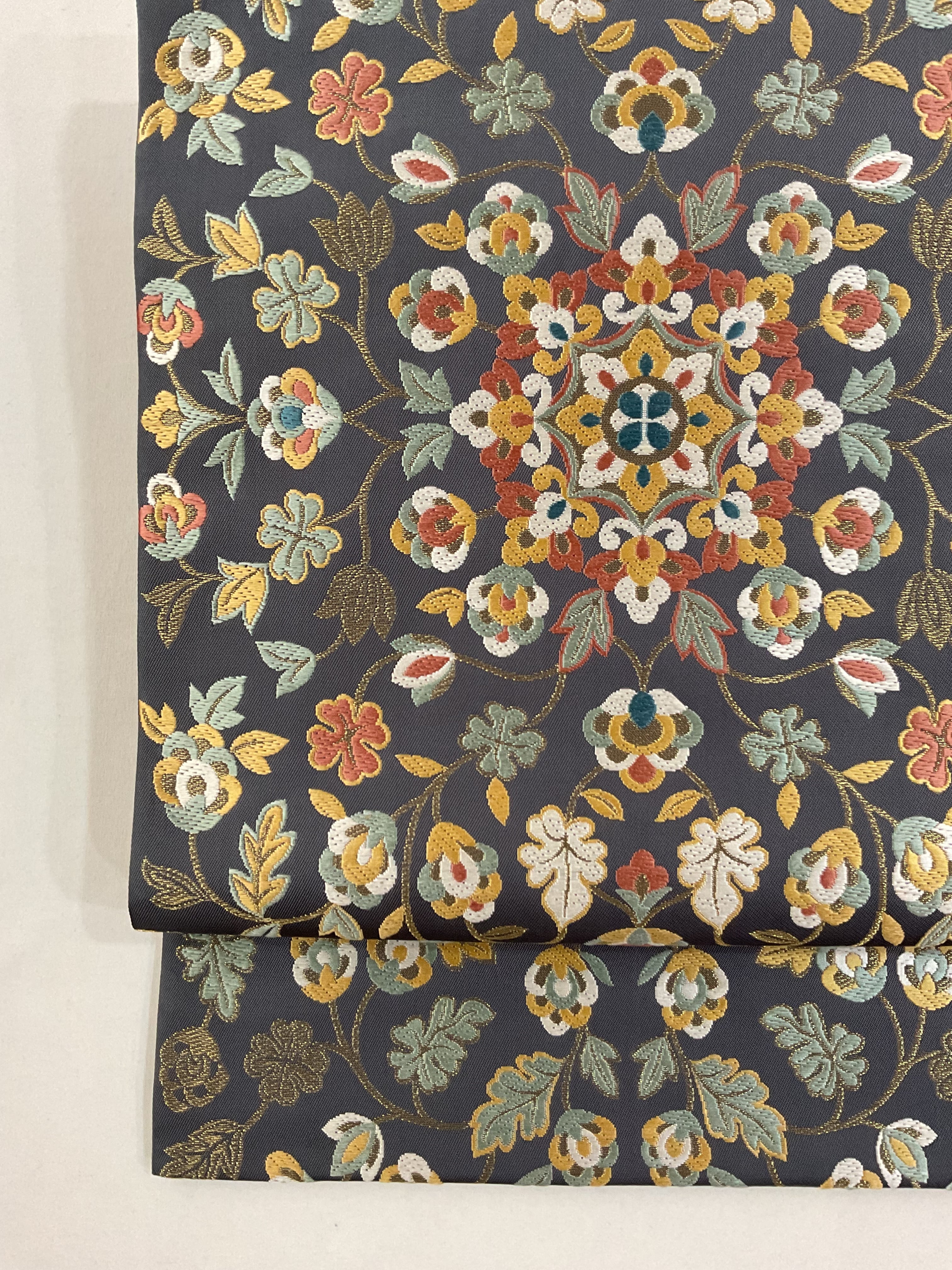 鈍い藍鼠地、少し青みを感じるグレー地に装飾的な唐花文様がオリエンタルな雰囲気の【川島織物】本袋帯です。確かな品質と締め心地の良さでも定評のある川島織物製の本袋帯、美しい着姿が叶う人気のお品です。現代的な装いに寄り添うモダンな雰囲気のフォーマル帯としていかがでしょうか。