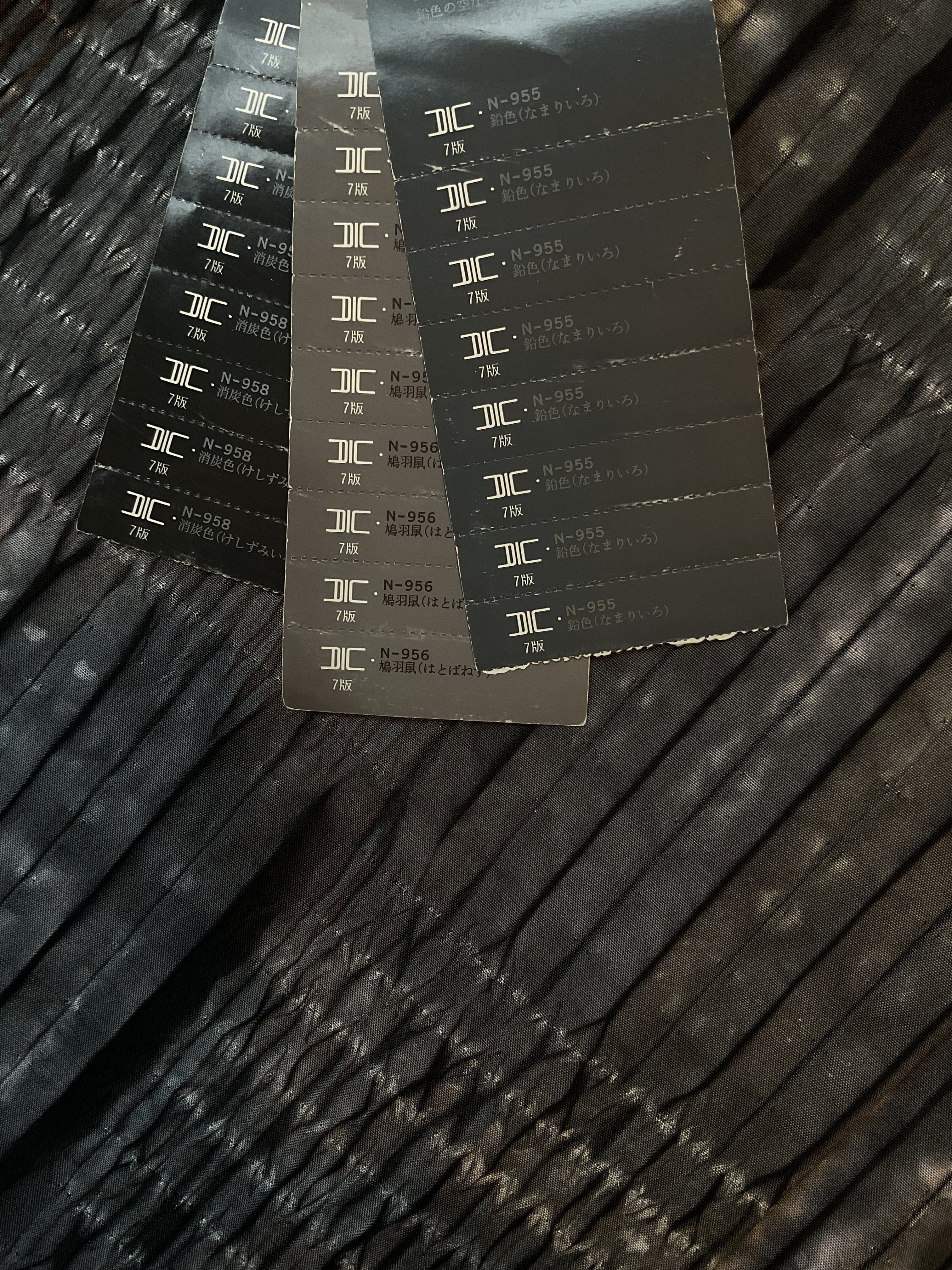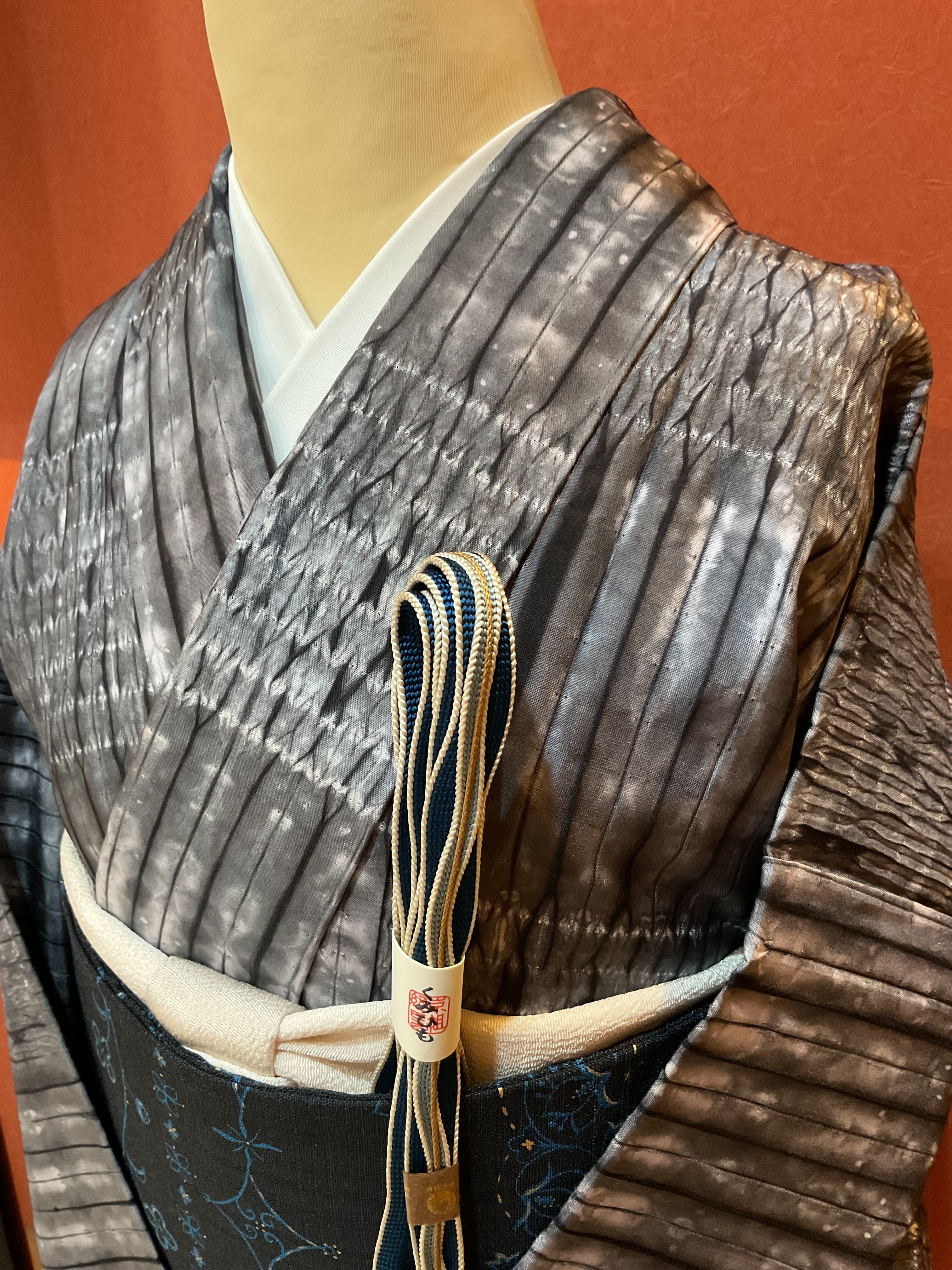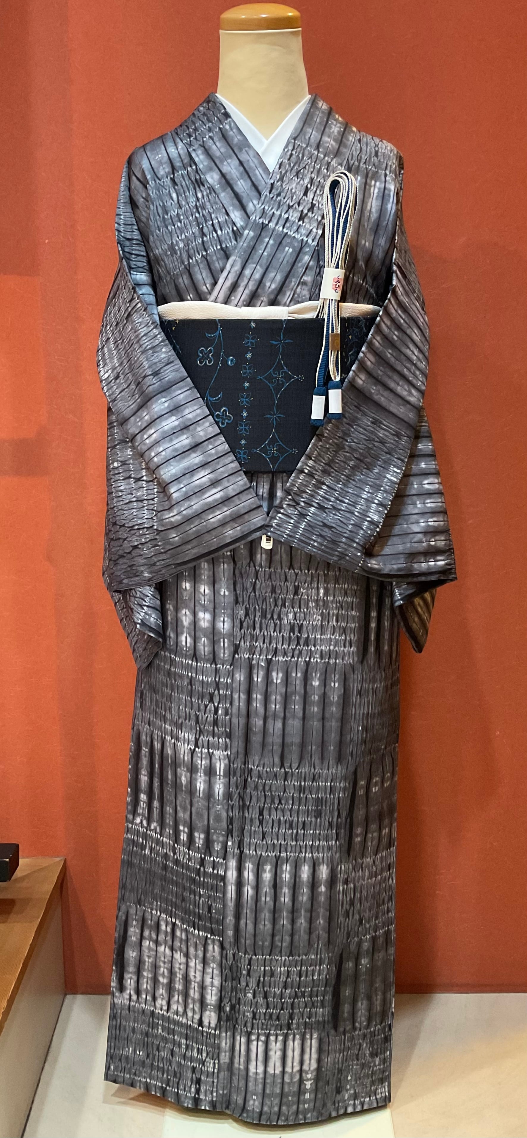 サラリと薄手の紬地に消炭色で市松状に絞りがされた単衣きものです。反端に【滝くずし】とあるように深山の大瀑布が幾条にも崩れ落ちて、たそがれの夕日が幻想的に映える様からイメージされた絞り柄です。手絞りによる高度な技が詰まった紬きもの、今秋の装いに取り入れてシックな装いをお楽しみください。