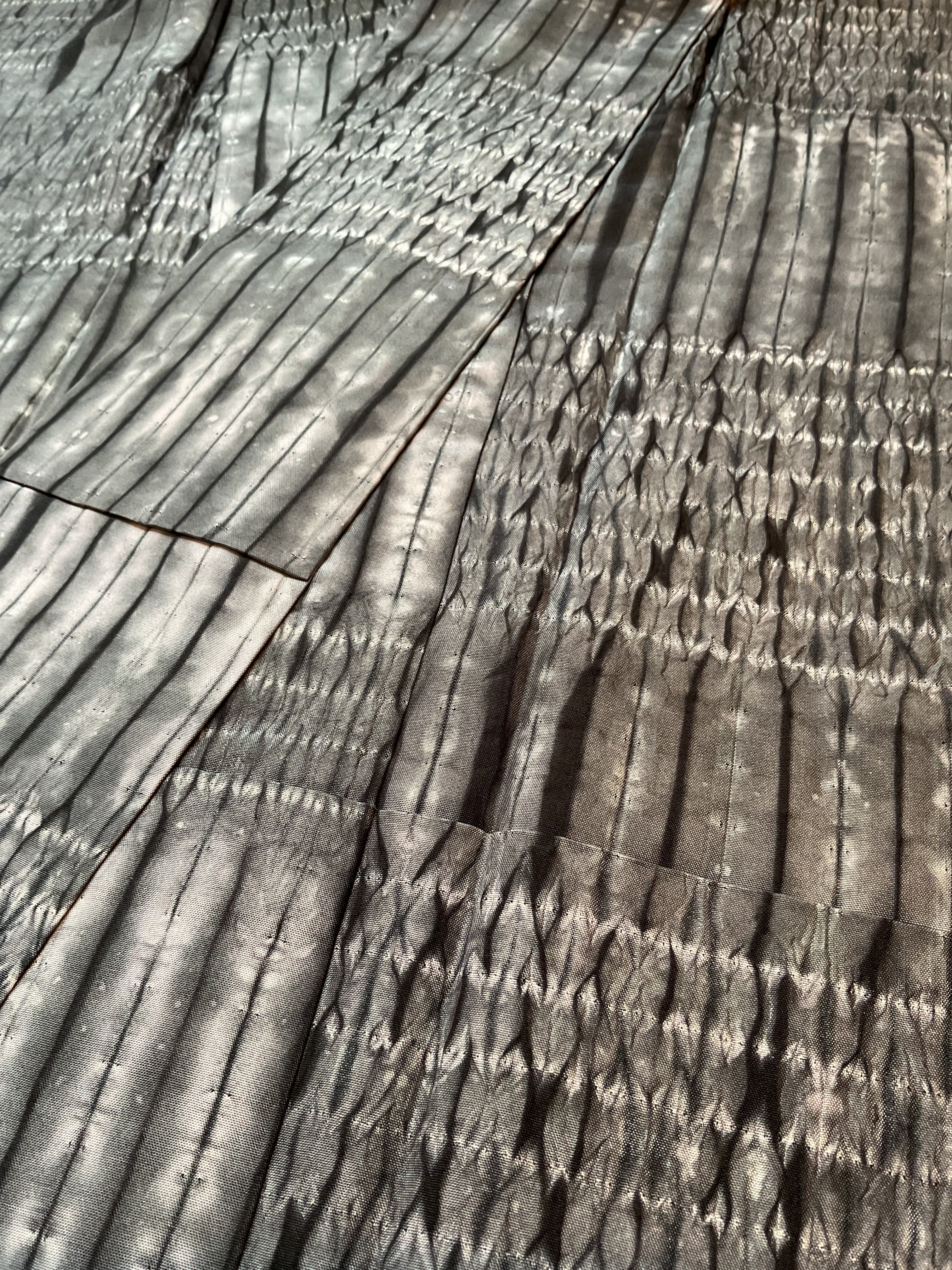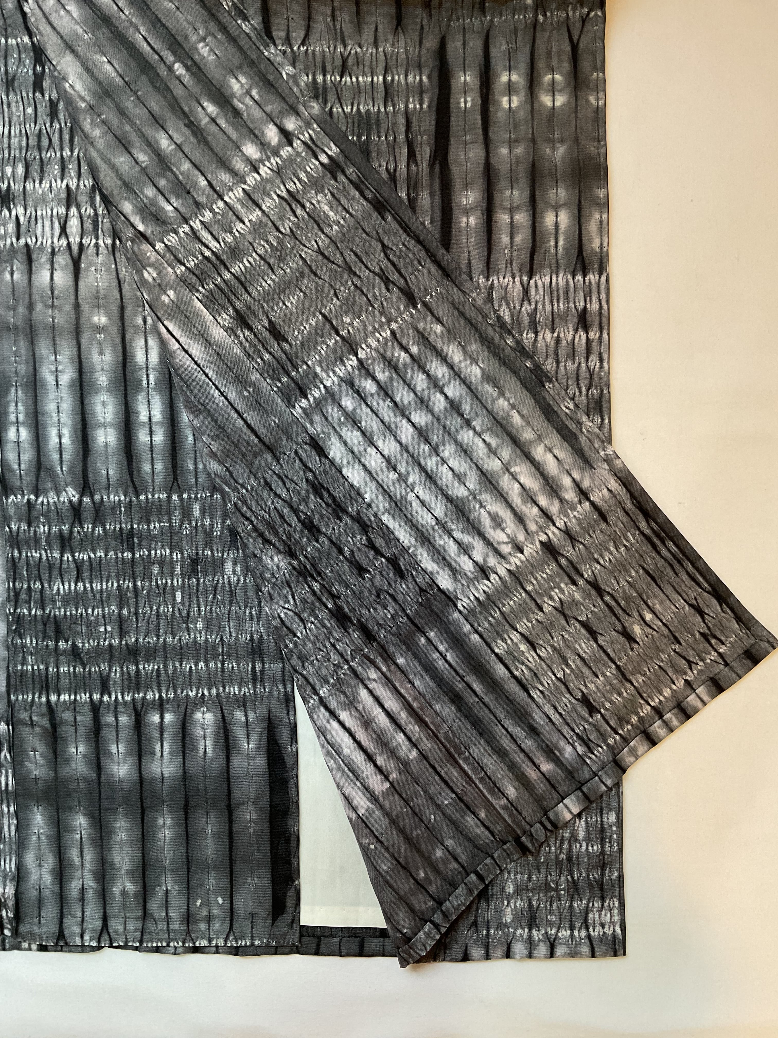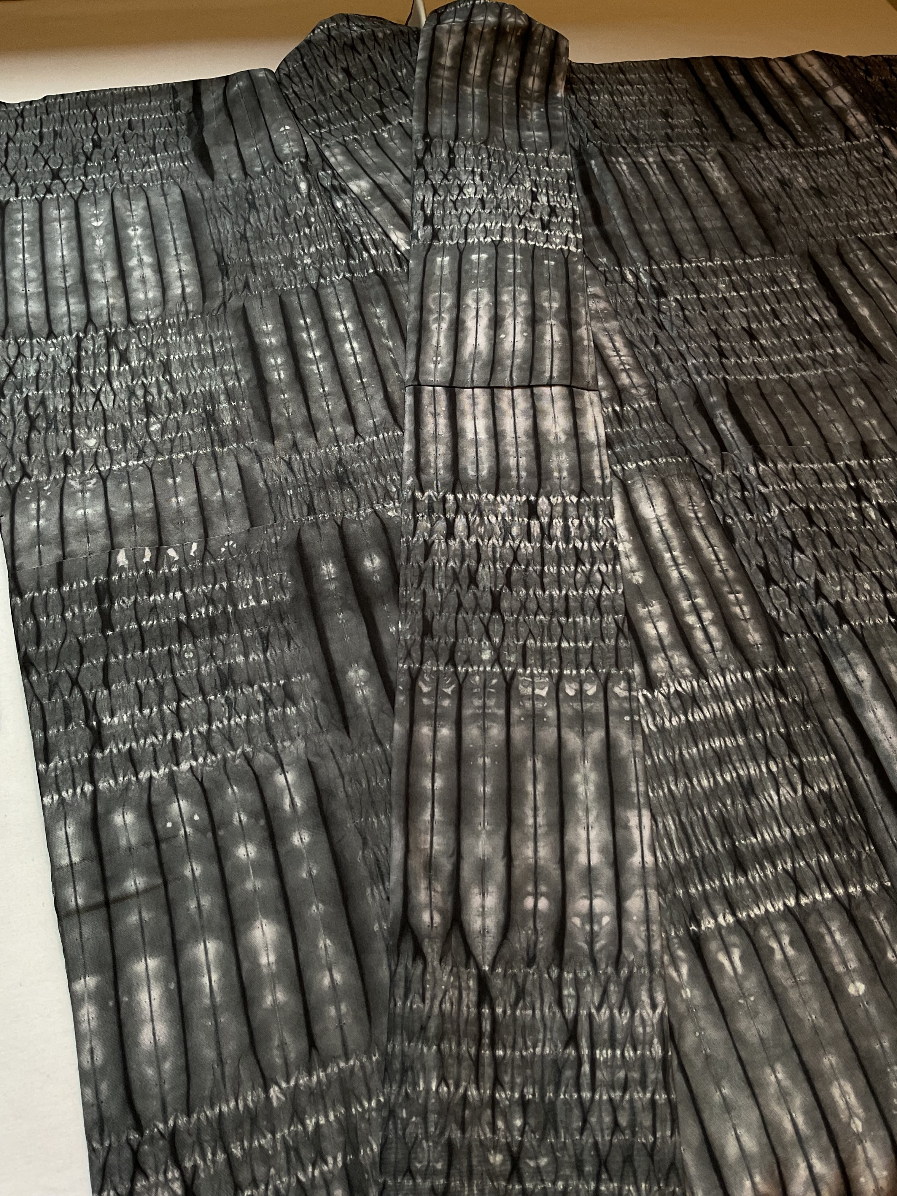 【単衣】白×消炭色【滝くずし】絞り紬(反端付き) 250914-1