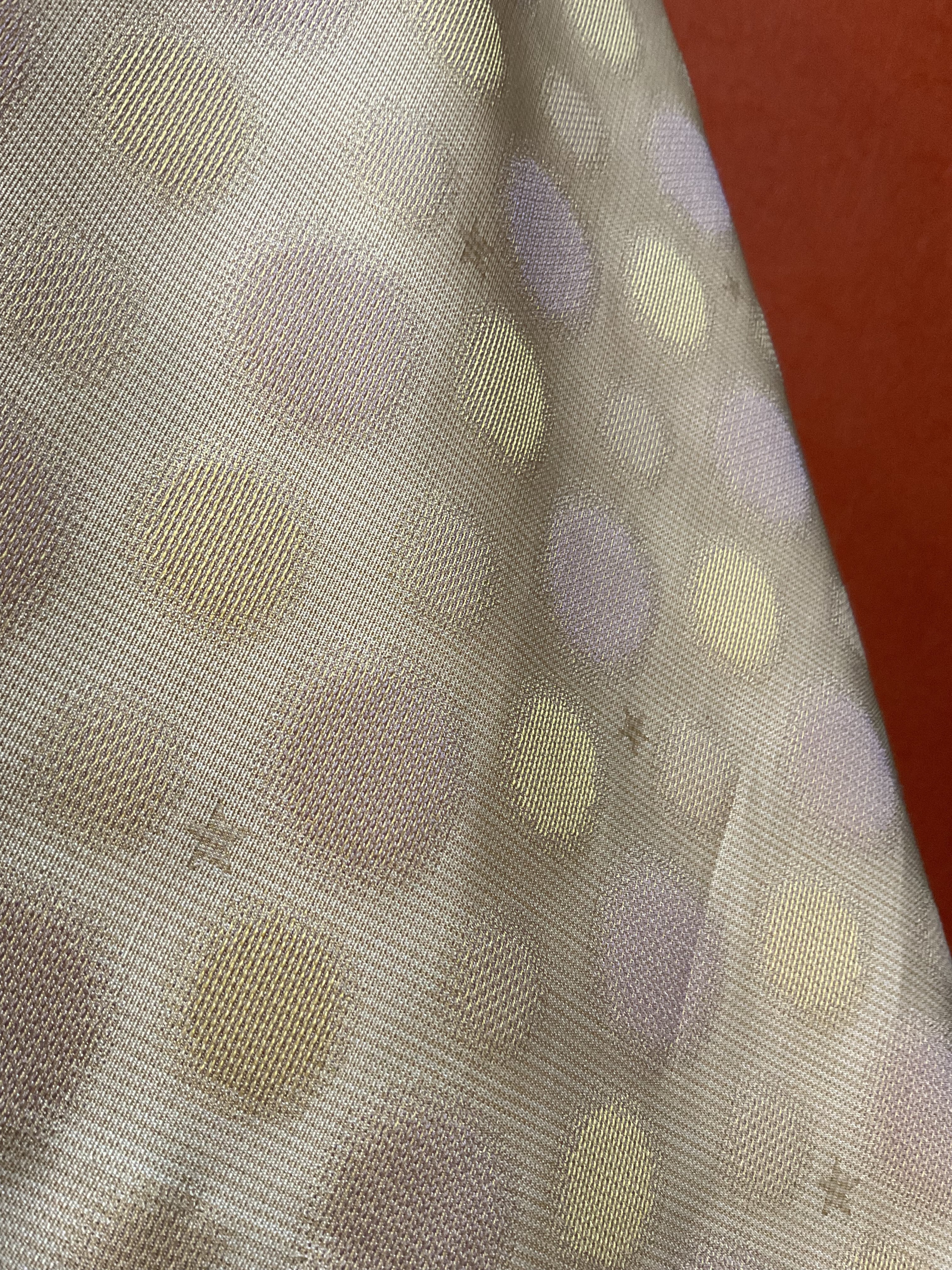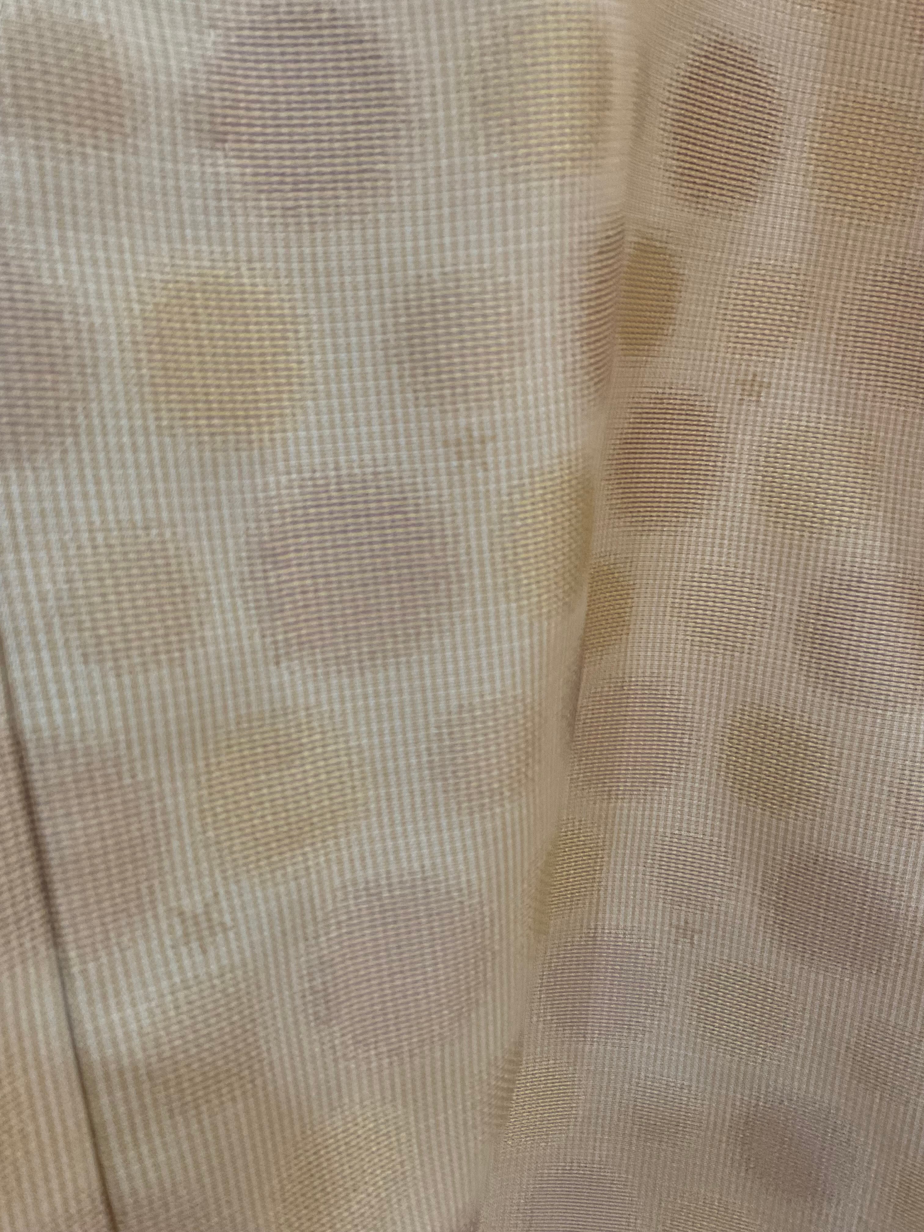 優しいベージュ地の細かな縦縞に小さな星と大小の水玉文様が浮かぶ大変洒落たお柄です。