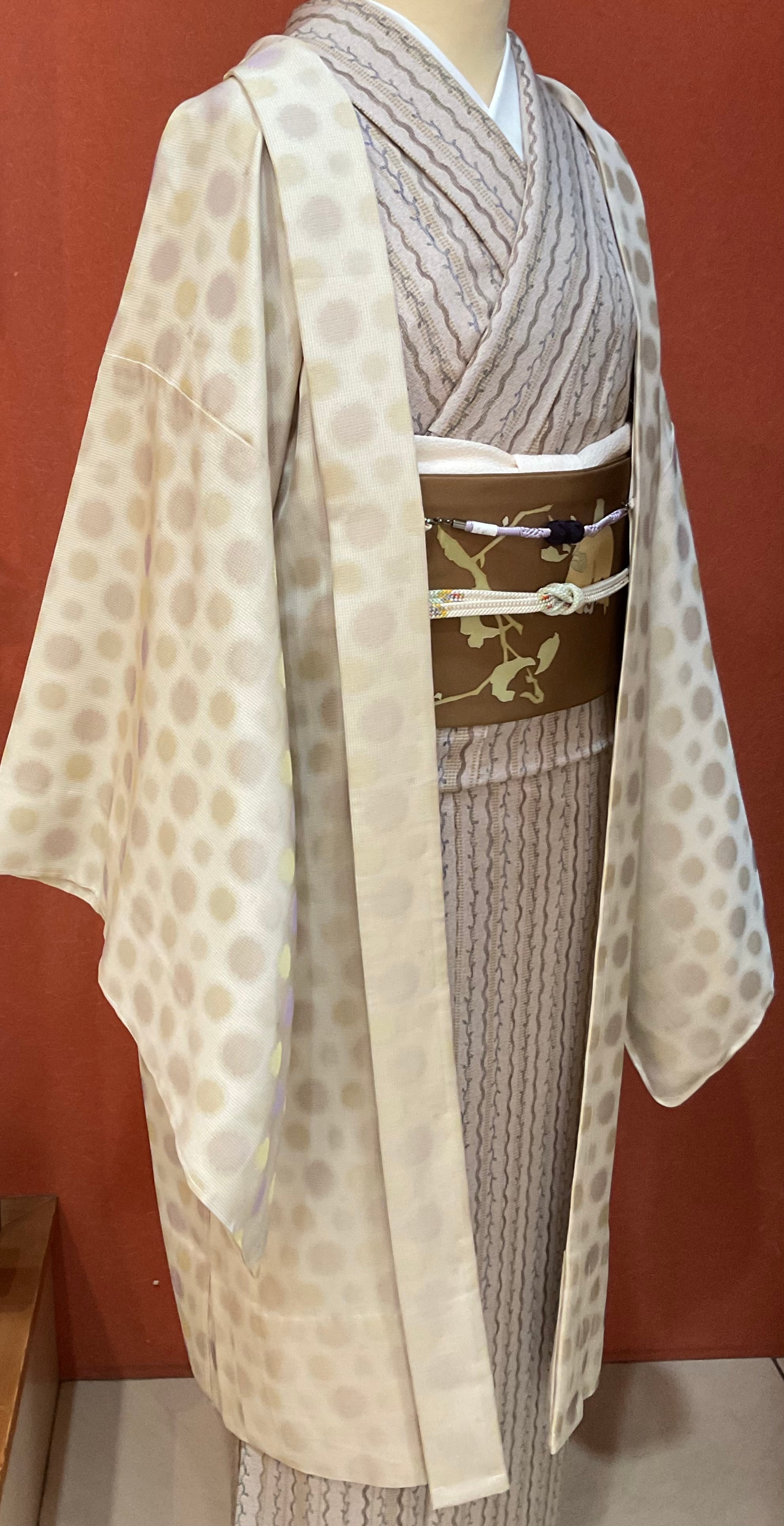 ベージュ地水玉に星文様【源一坊】単衣羽織(しつけ・反端付き) 250914-4
