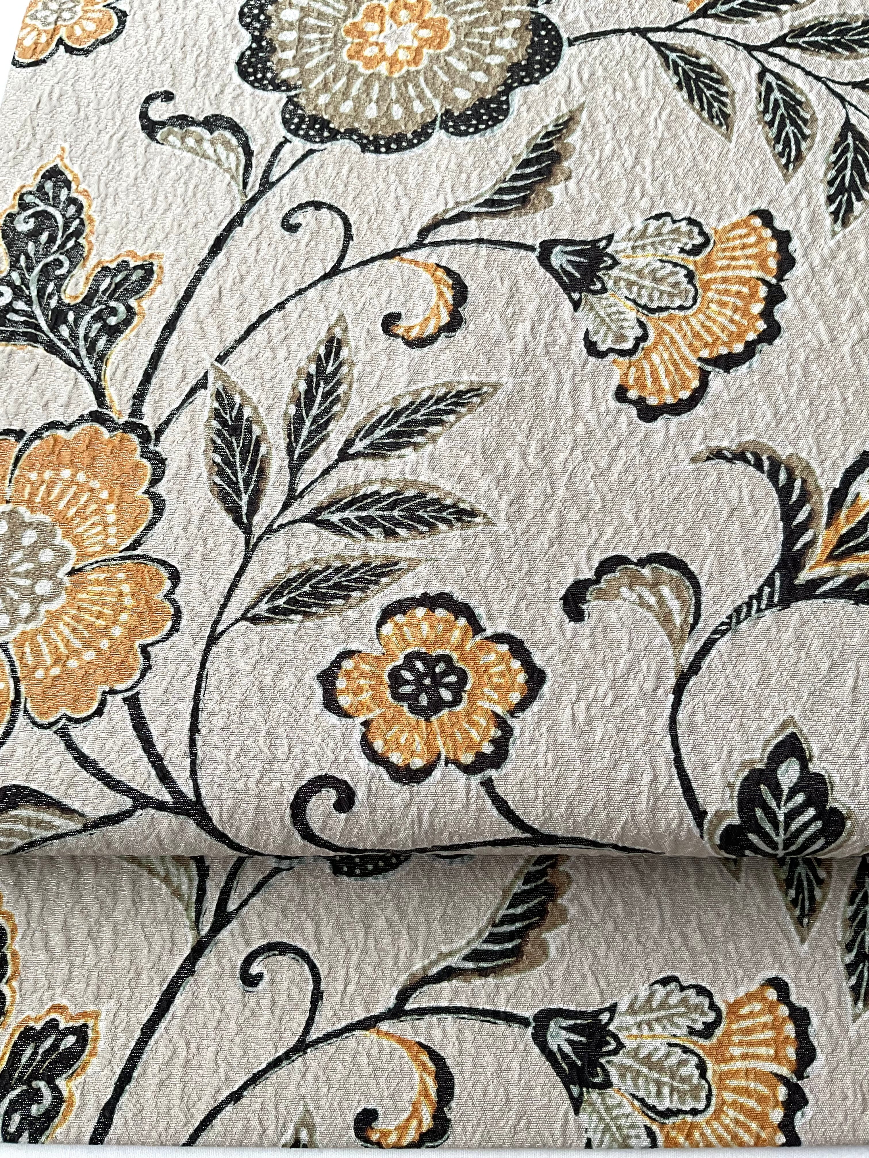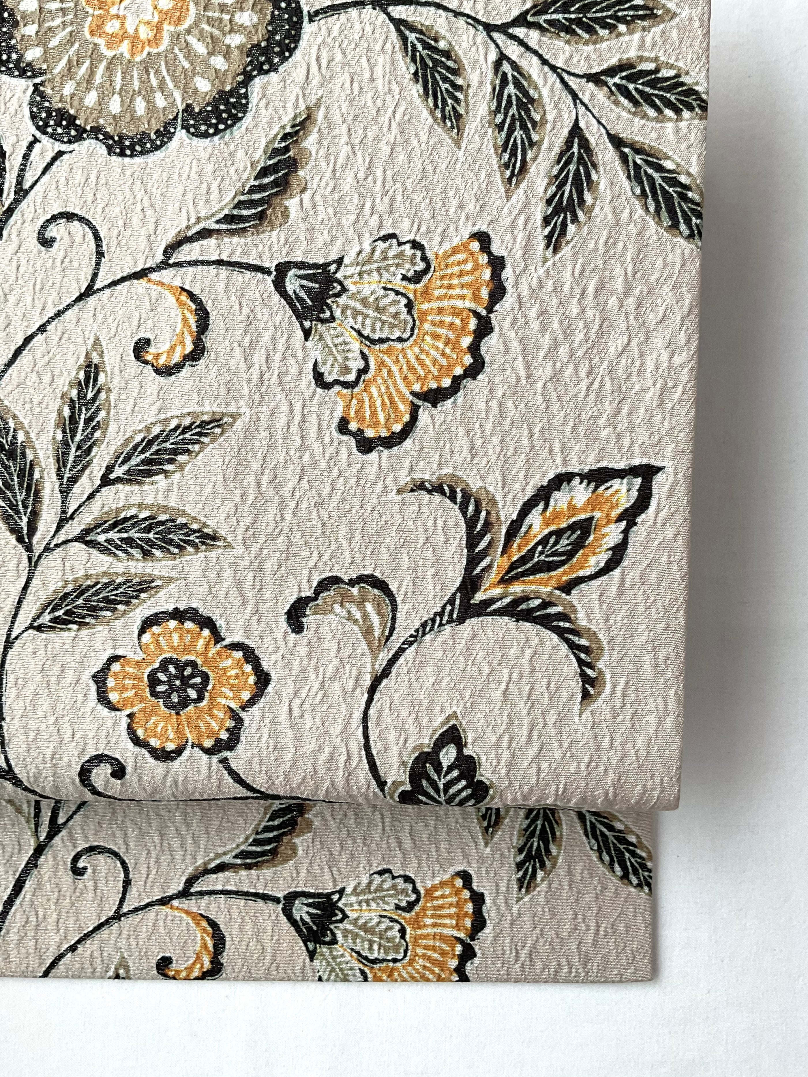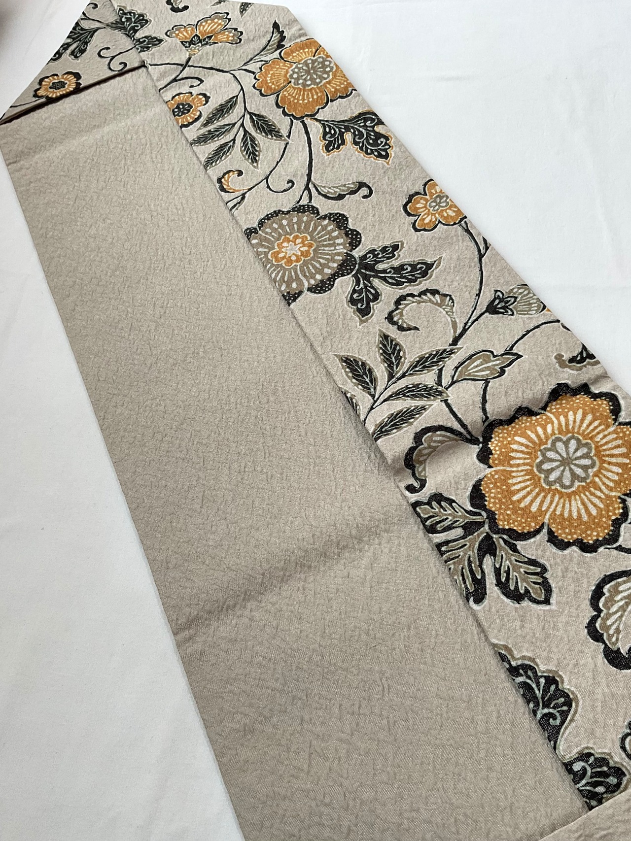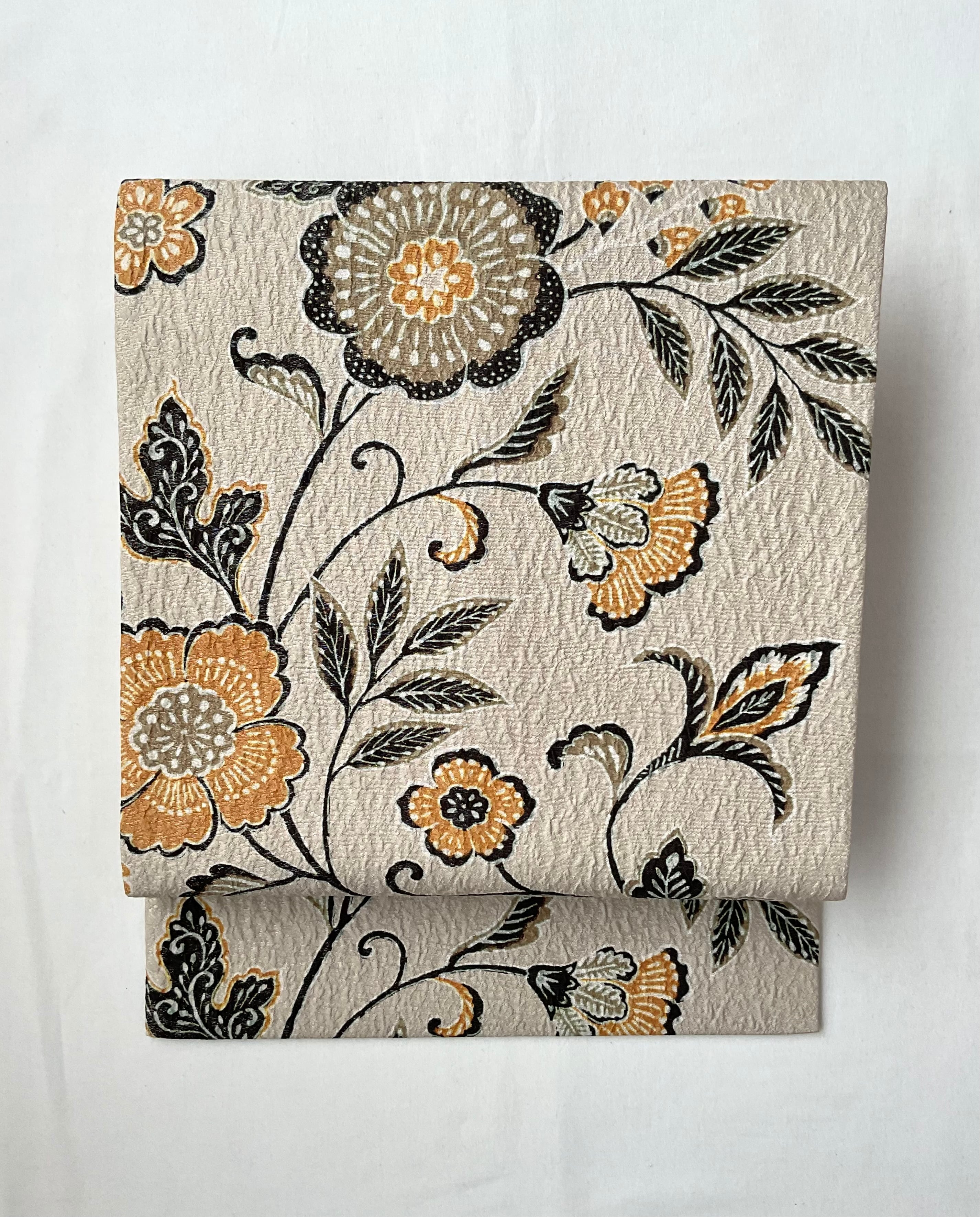 灰みがかったサンドベージュ色、ふくれ織地にエキゾチックな唐花文様が染められた九寸なごや帯です。凹凸ある銀通し地に色味を抑えた唐花文が地味過ぎず、大人の洒落味ある着姿をかなえます。