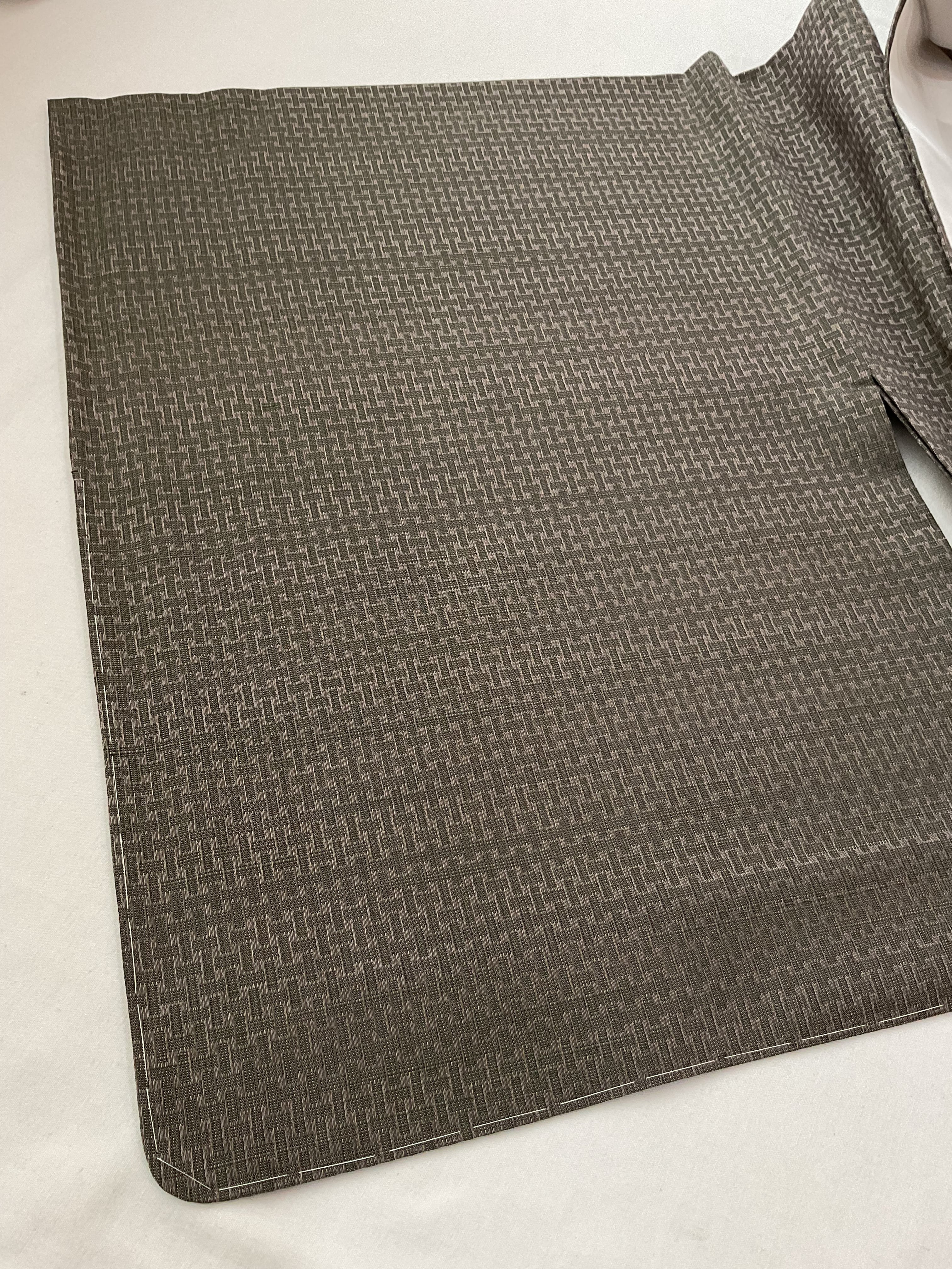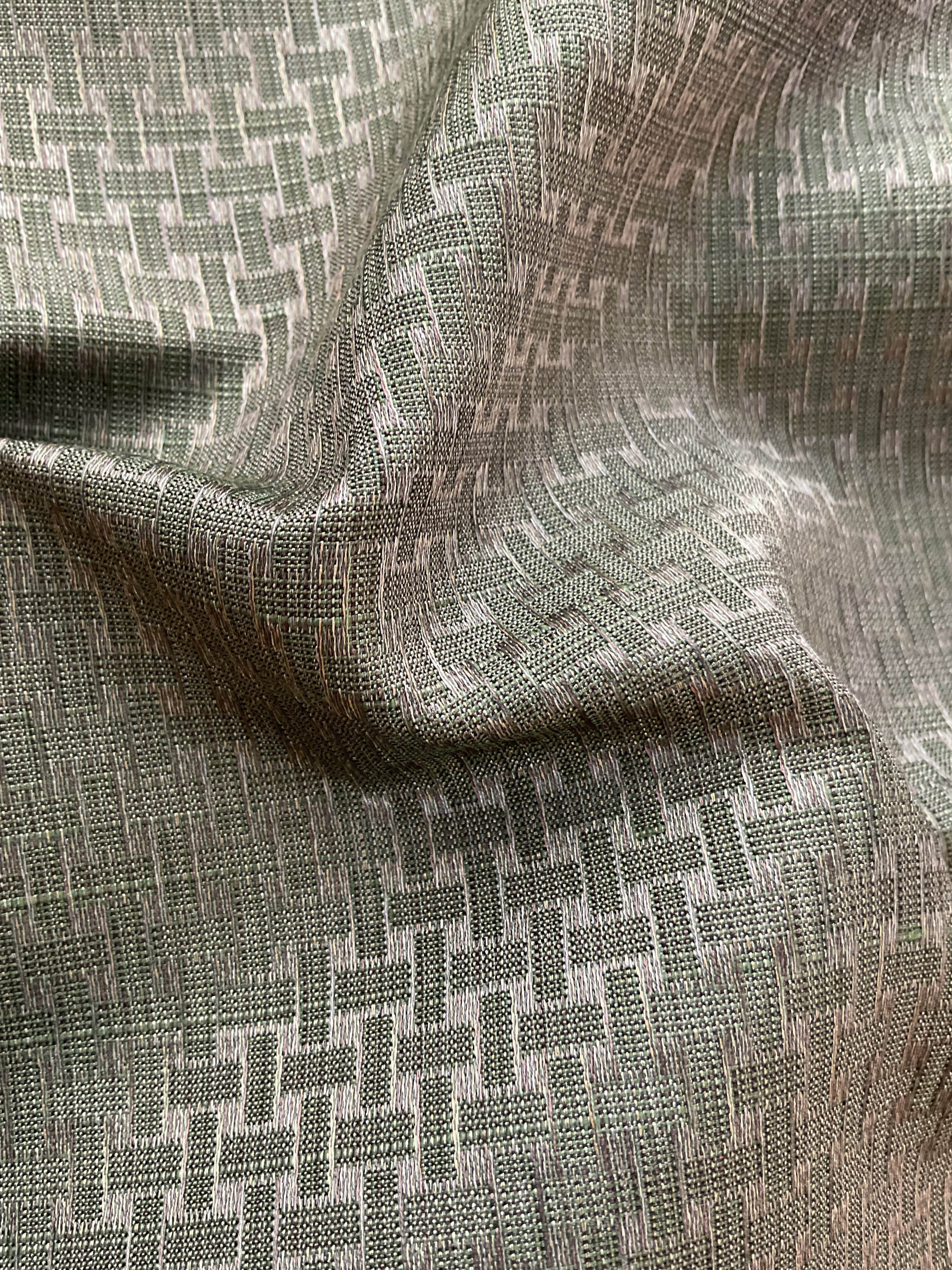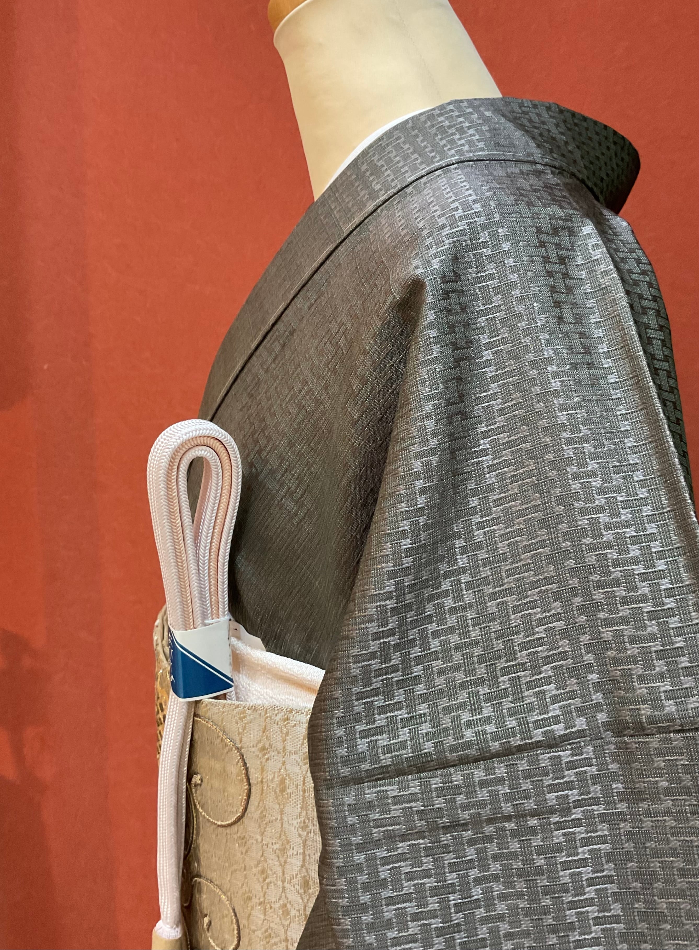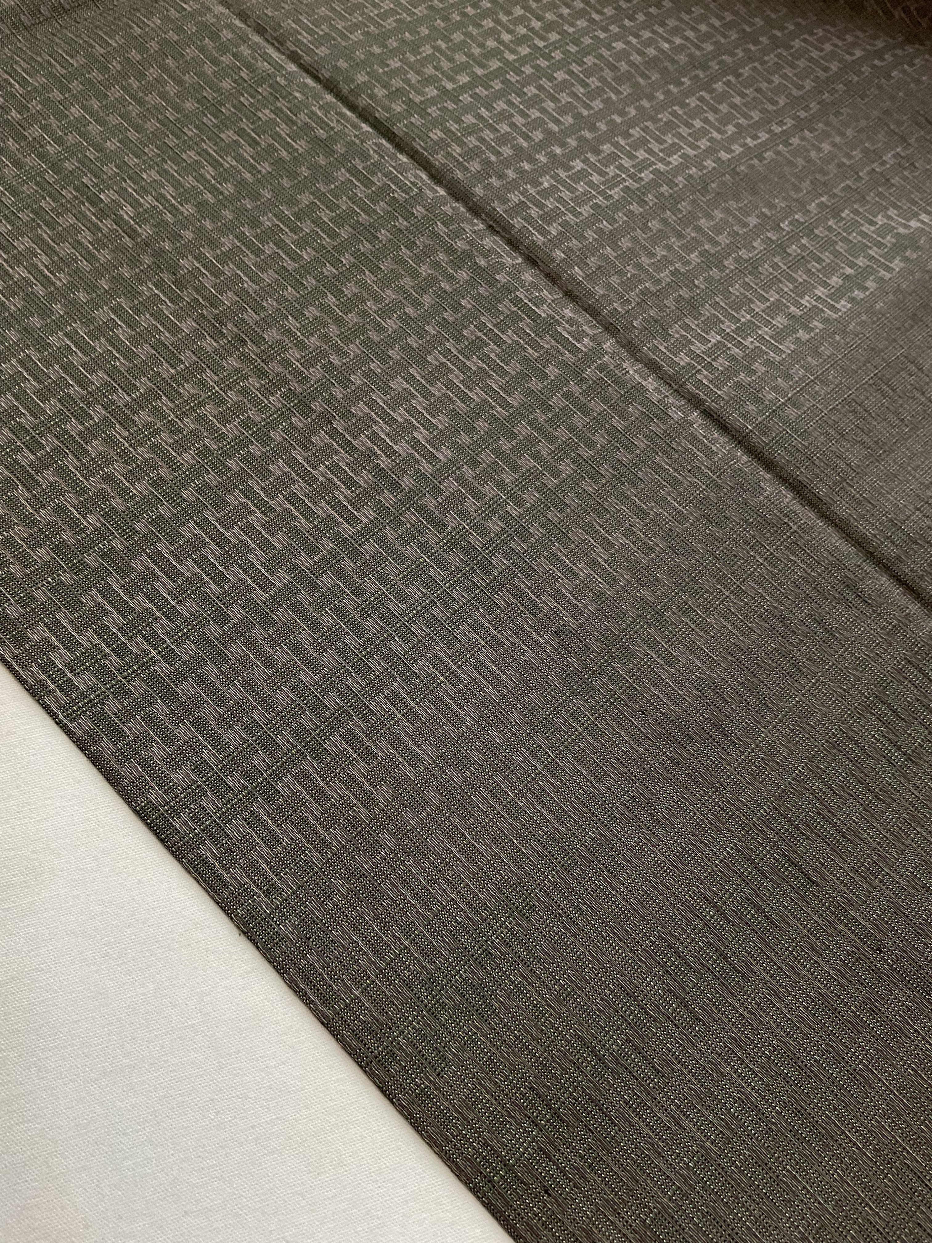 少しオリーブ色がかった鈍色、メタリックのような鈍い光沢のあるシックな色味です。光が当たる角度によって網代文様が浮かび上がるように見えやや張りのある織地は上質なメンズスーツを思わせます。キリリとしたコーディネートをお楽しみください。