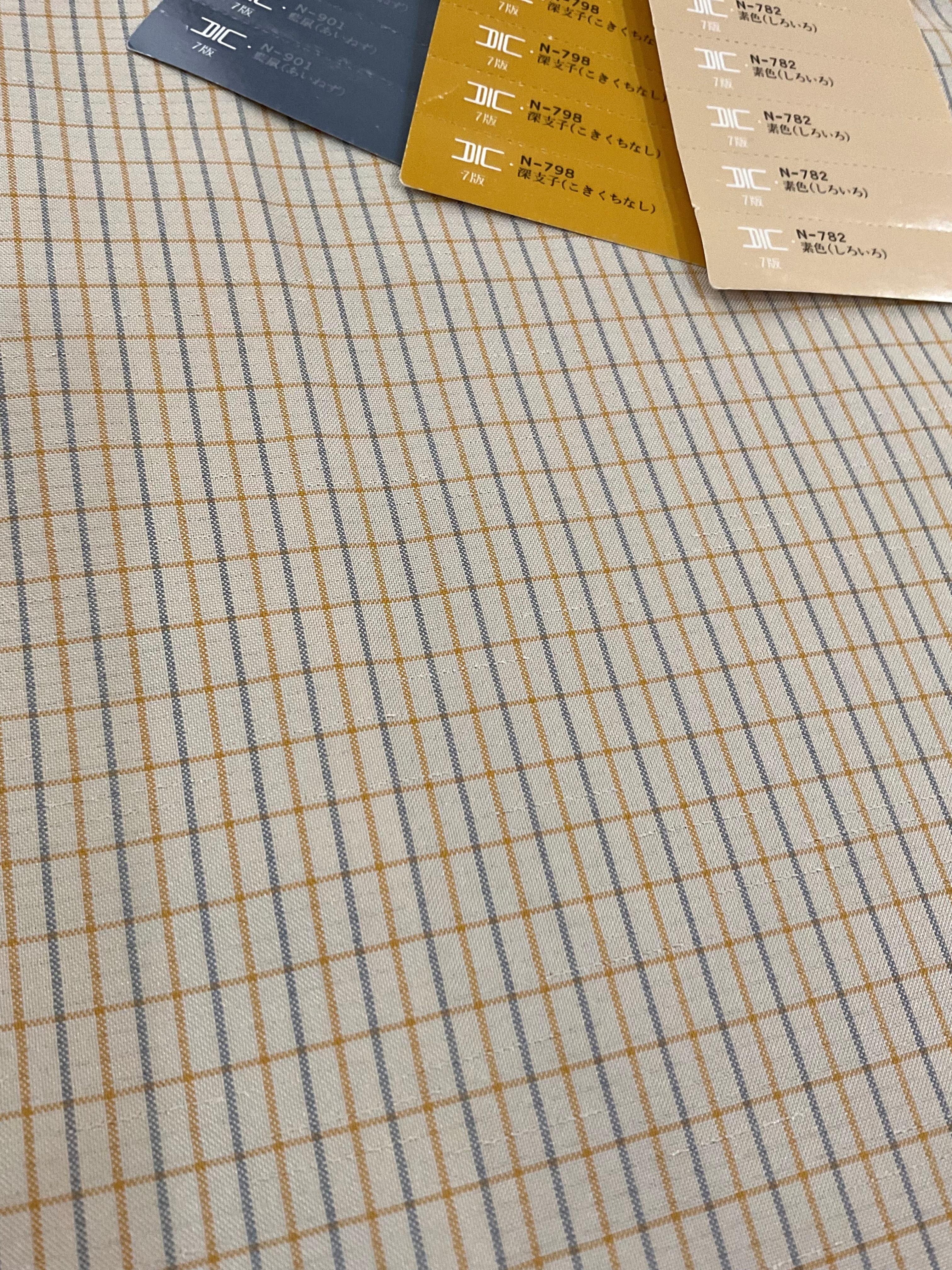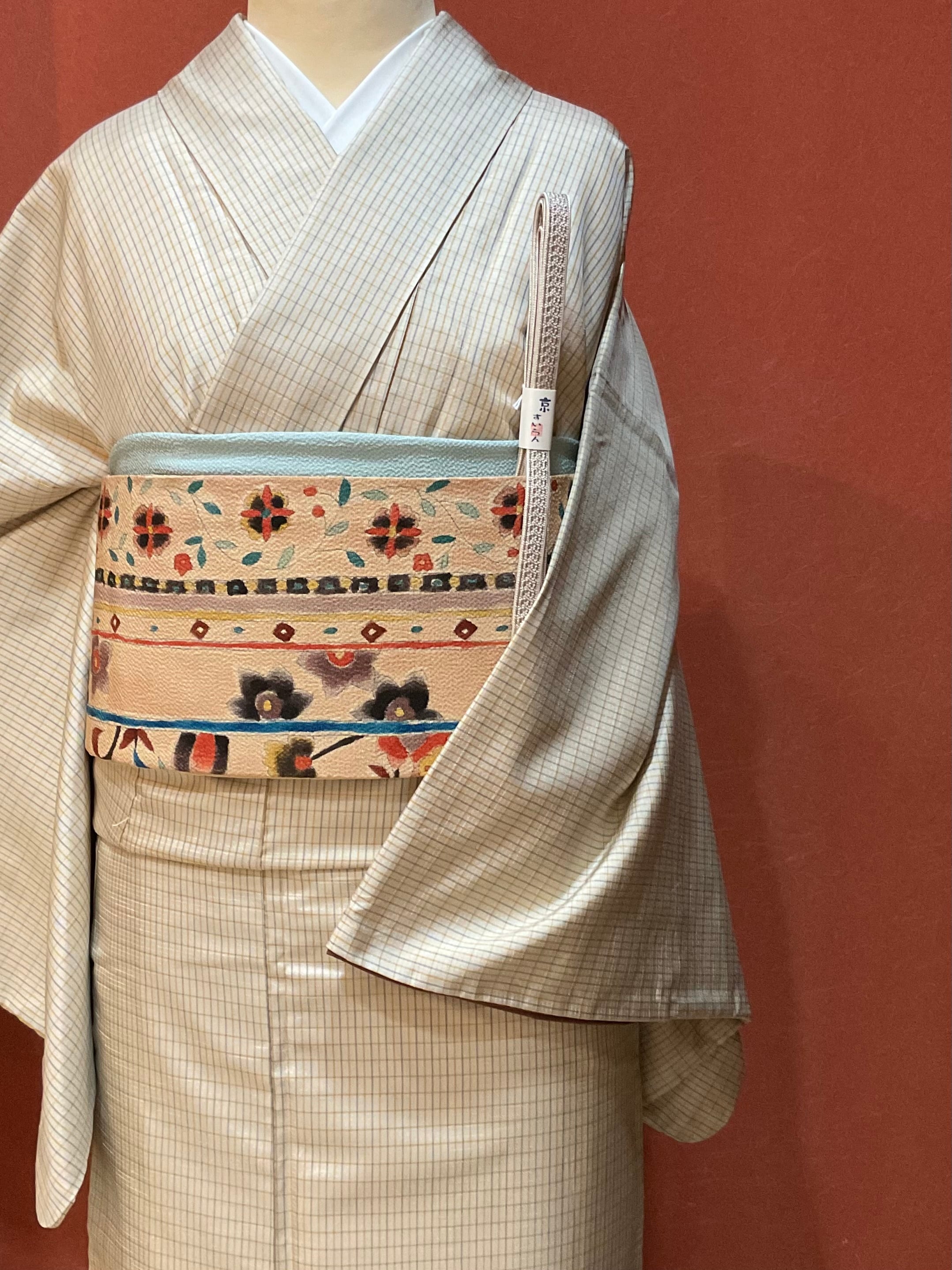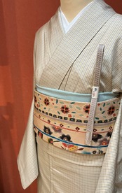 薄手の軽い風合いの紬きものです。クリーム色がかった素色地にグレーとマスタード色の細かな格子柄が軽快な印象です。淡いトーンの小格子文様で帯や小物合わせがしやすく、バリエーションある着こなしが楽しめます。まだ暑さの残る秋の初めの普段のお出掛け用におすすめです。
