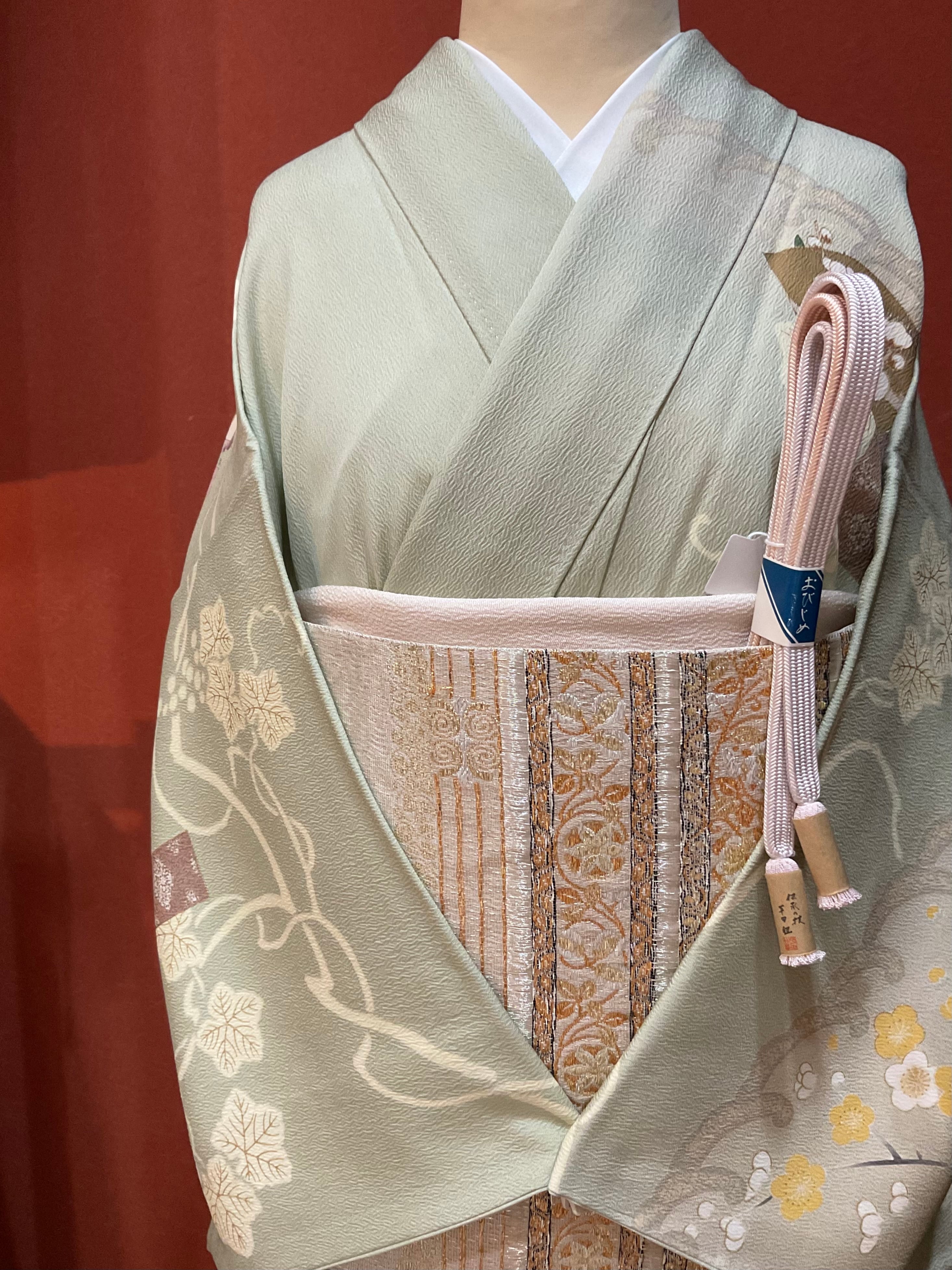白みがかった淡い黄緑色に染められた丹後縮緬地のベースの上に、たっぷりと日本の季節の花々が柄付けされた美しい訪問着です。扇や短冊が配置され、松竹梅や藤や菊、そして葡萄の蔓の曲線が重なるように贅沢に染められております。裾の柄、そして背中から肩、袖への柄付けもたっぷりとされております。吉祥文様が格調高く、豪華な柄付けが華やかですが、お色目の優しさと柔らかさが調和しており派手にならず、はんなりとした上品な訪問着でございます。