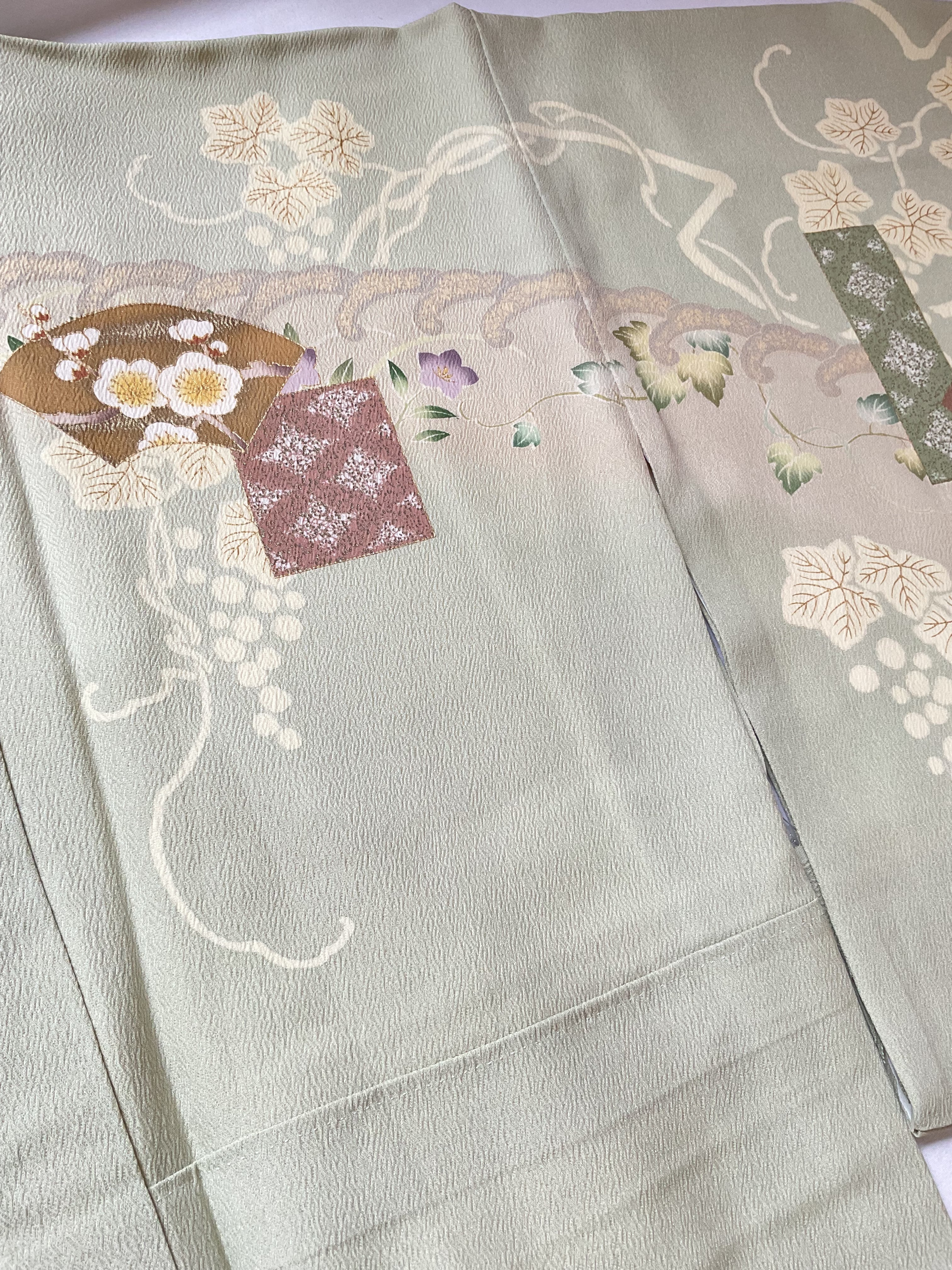 白緑色地葡萄唐草四季花文訪問着(一部しつけ付き・反端付き) 250929-1