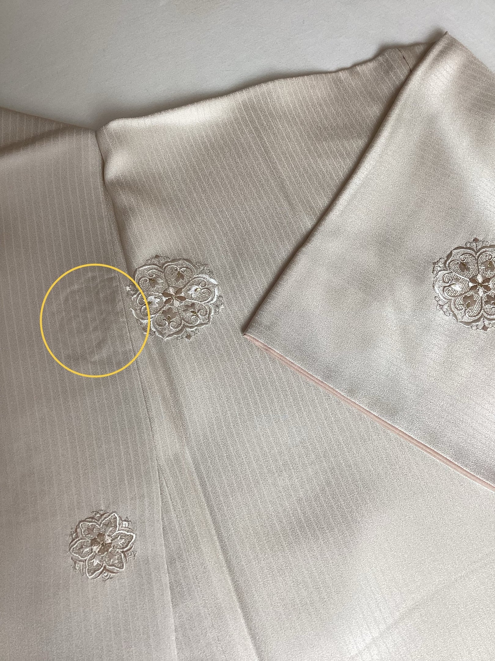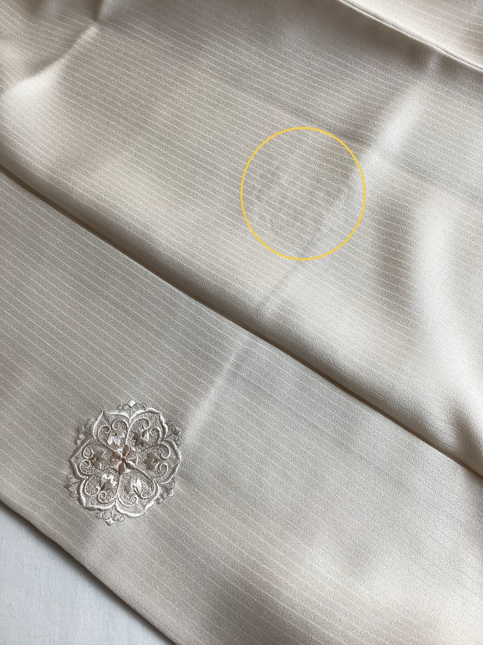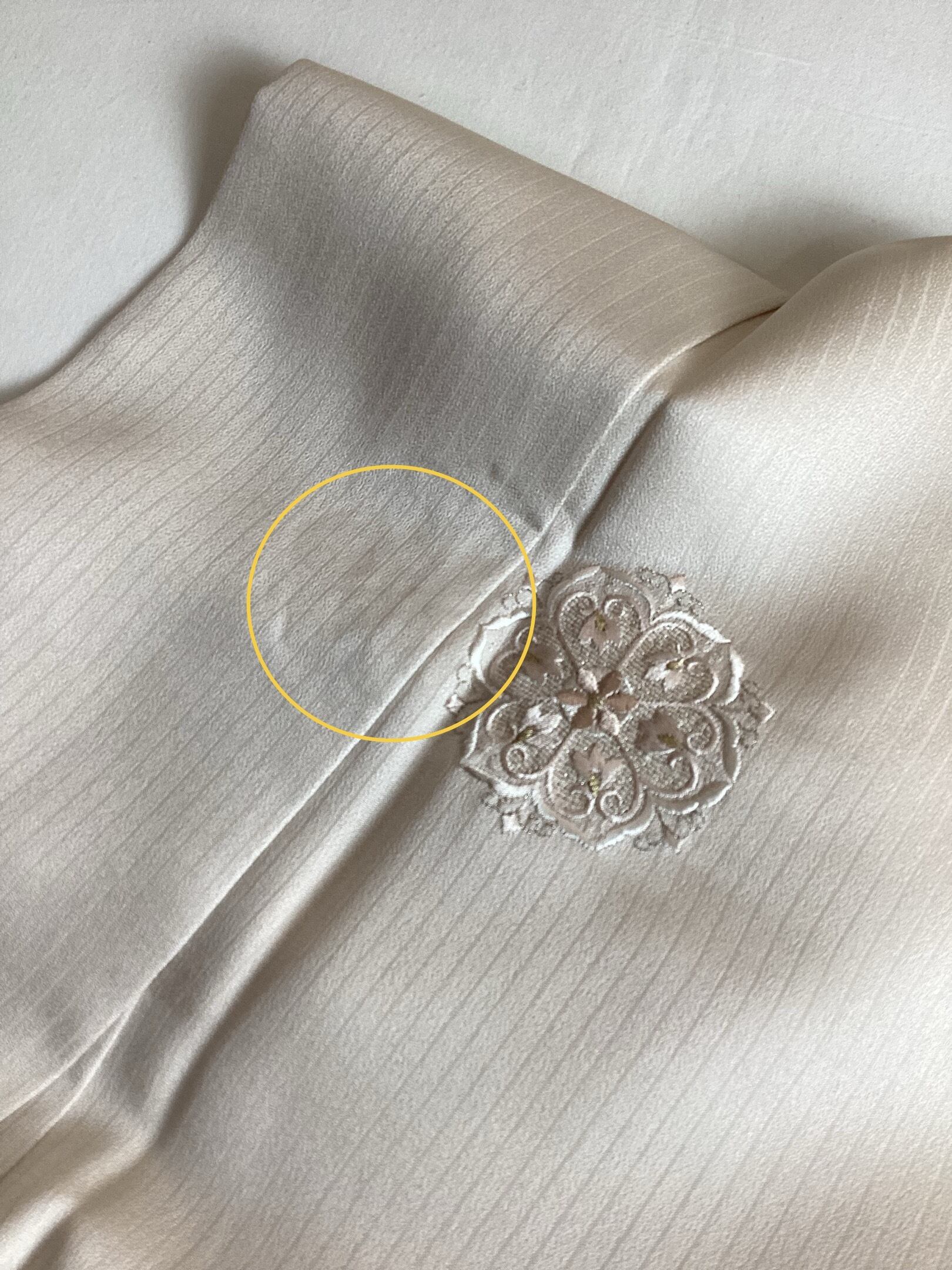 大変状態の良い美品ですが、膨れ上がった刺繍の部分が畳んだ保管により対面の生地に凹みが移っています(画像16.17.18)。気にされる方はご購入をお控え下さい。