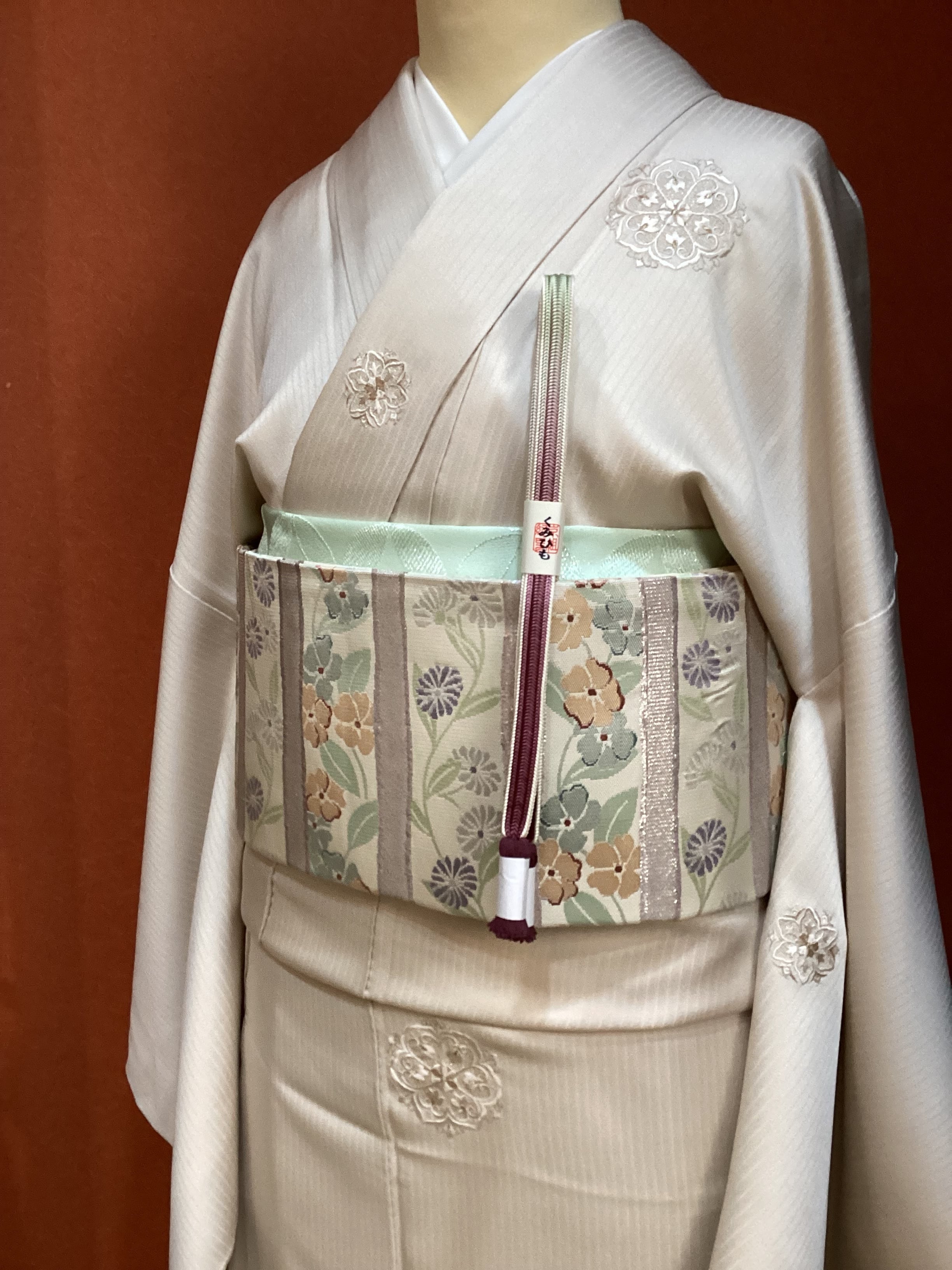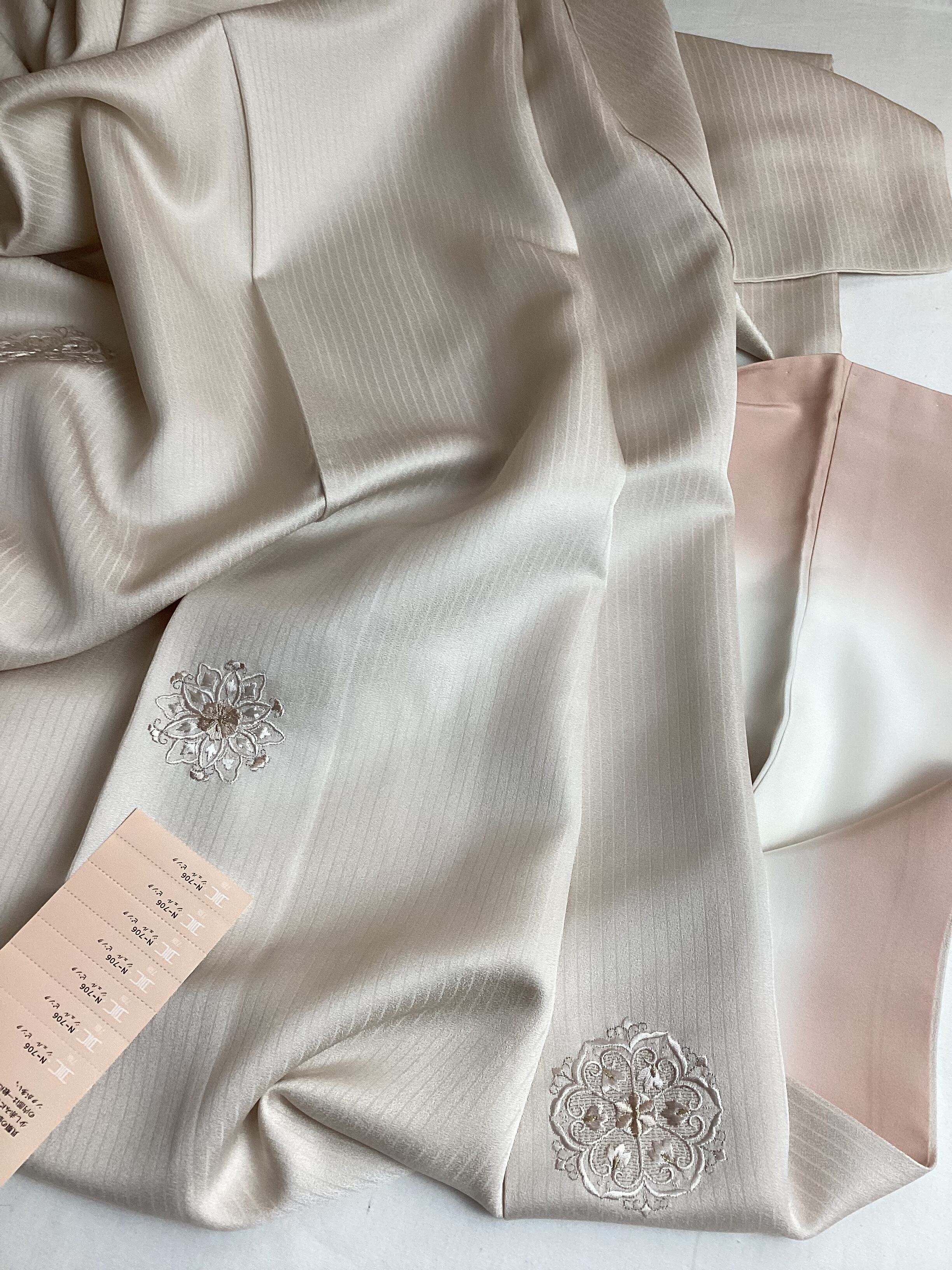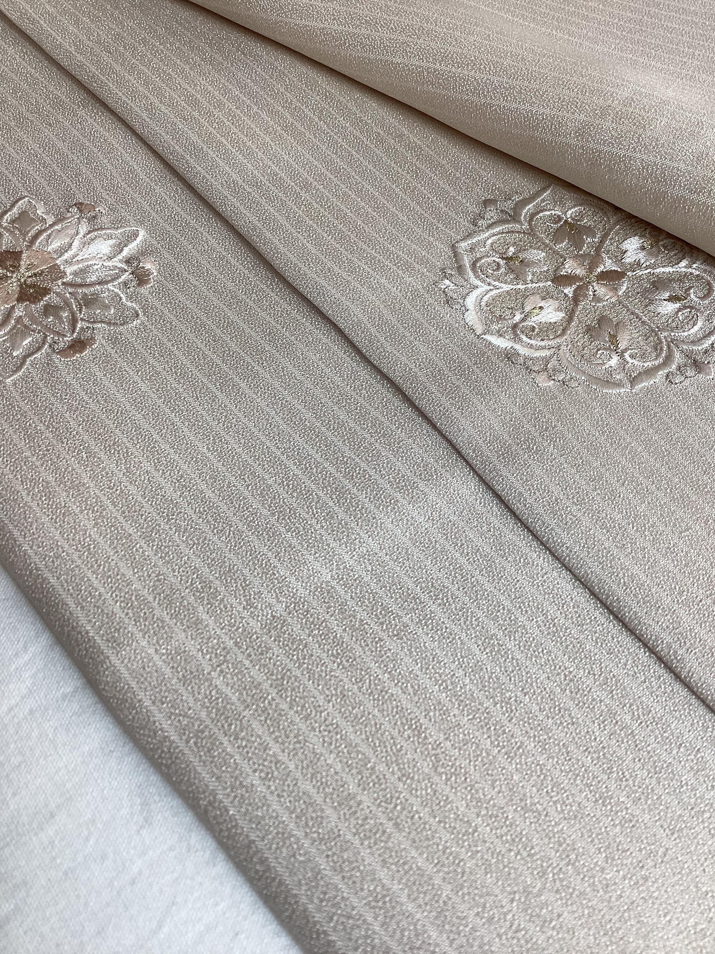 淡く薄いピンク色の縦縞ライン地に、ふっくらとした華文様が刺繍された飛び柄小紋です。上質でしなやかで艶やかな生地に同系色の糸使いで縫い込まれた華の刺繍がキラキラと美しく舞っています。薄ピンクのお色目は少しくすみカラーの入った甘く成り過ぎない色合いです。華やかさが有り、飛び柄の控え目さもございます。現代的な雰囲気を持ち、洋装の方の中にいても馴染みやすいおしゃれ着です。パーティやご友人の結婚式参列、お子様の七五三のお付き添いなどにいかがでしょうか。