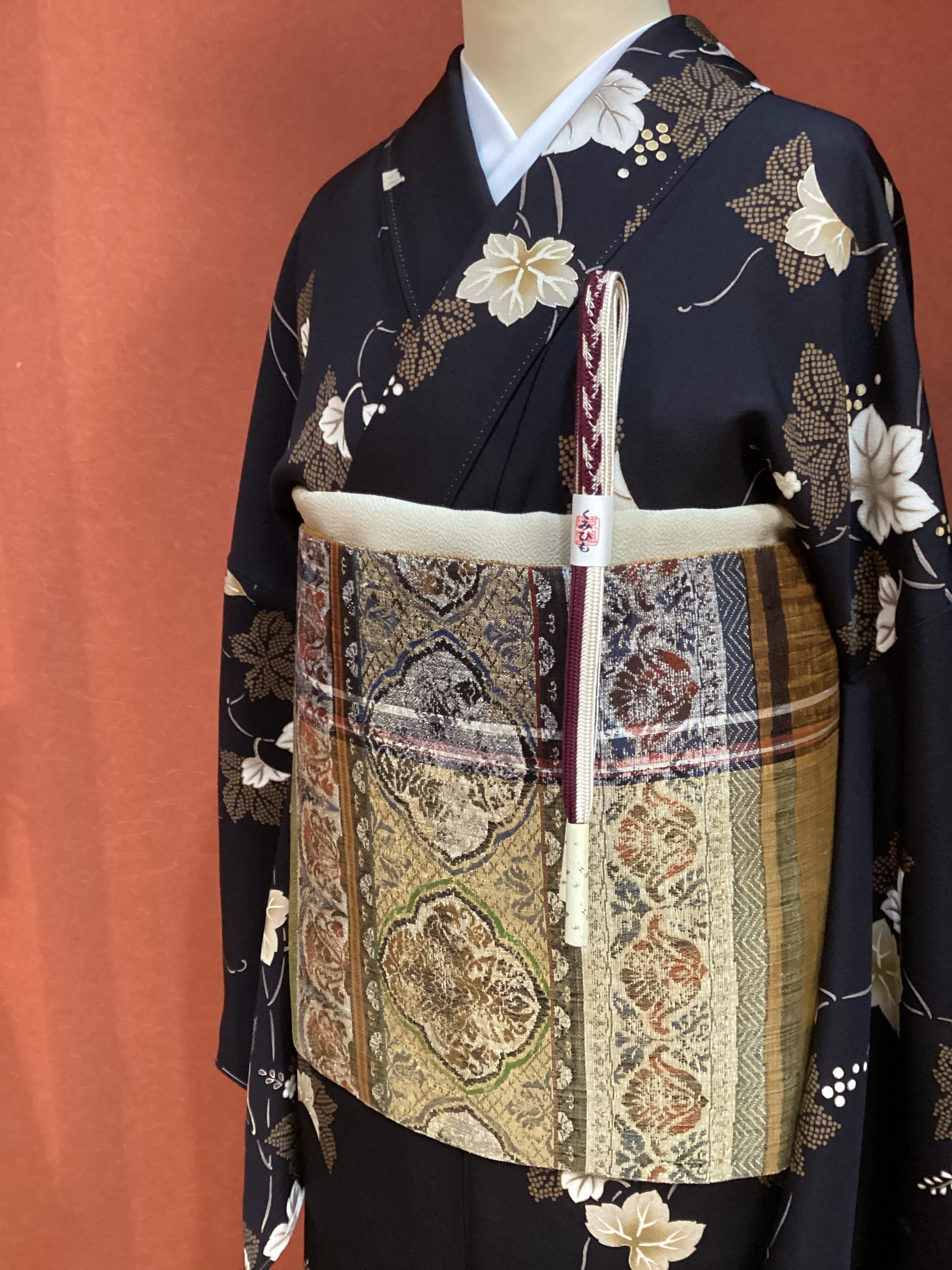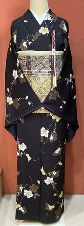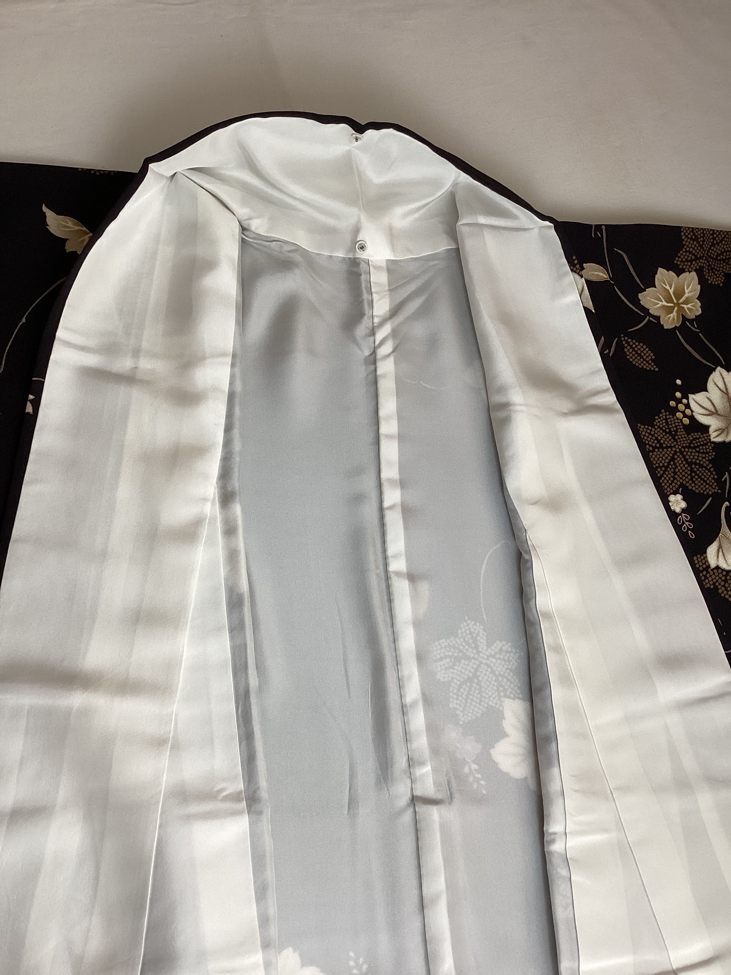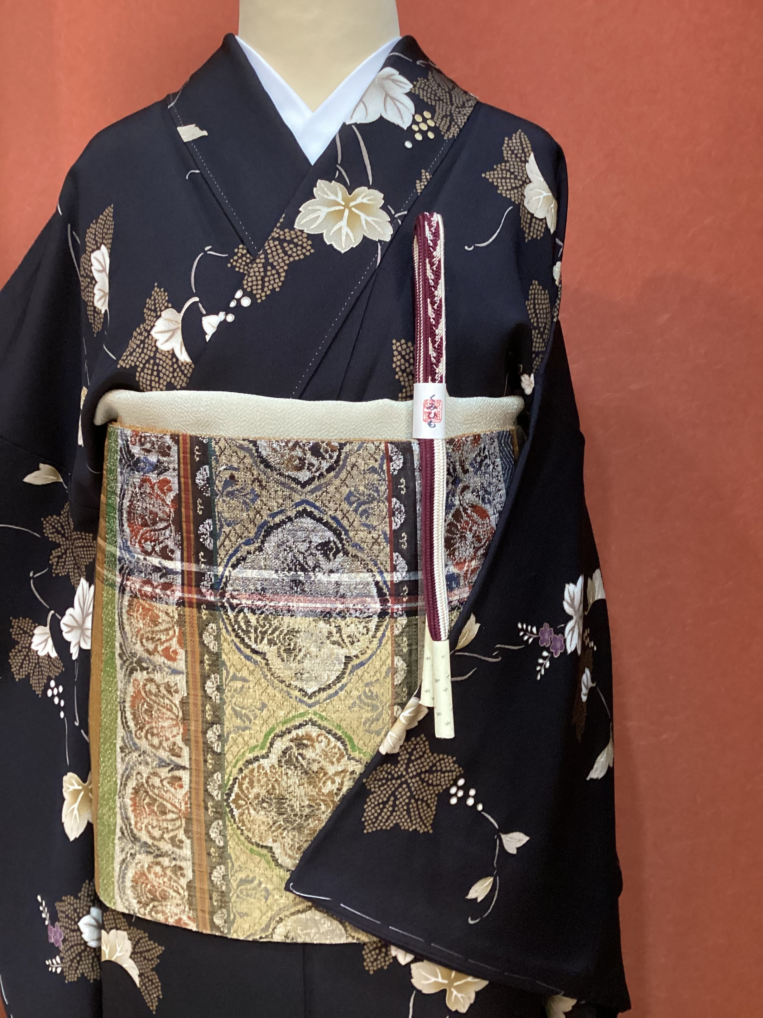 滑らかな黒地の生地の上に葡萄の葉や流れるような蔓の曲線が描かれた小紋きものです。葡萄の可愛らしい花や、実の成る文様は、豊穣を願う吉祥文様として年中お召しいただけますが、特にこれからの実り豊かな秋の季節に纏ってお出掛けいただきたいおきものです。葡萄を連想させるこっくりと濃い紫の八掛も効いております。