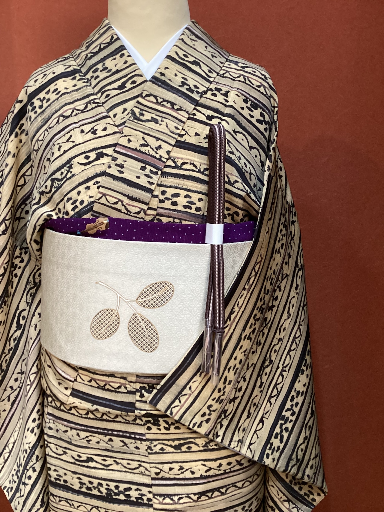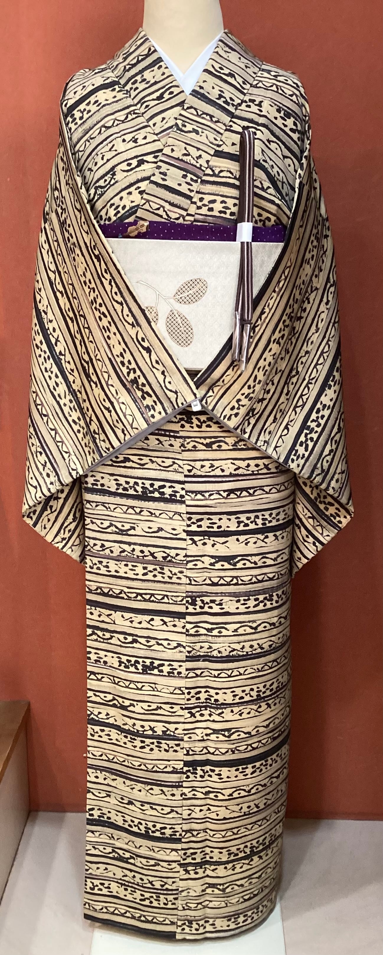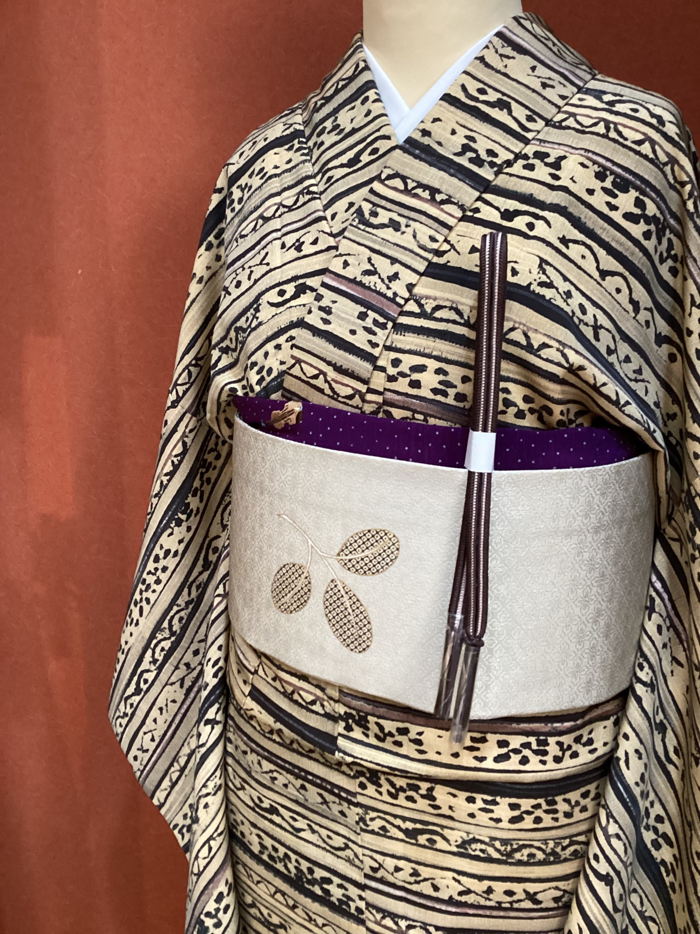 丁子色(黄みがかったベージュ)のベース地に刷毛で引いたような横段とその隙間を埋めるように様々な抽象文様が染められたお洒落小紋きものです。秋冬にかけて活躍しそうなこっくりとしたお色目です。今回は秋口コーディネートとして、軽やかな白っぽい帯を合わせてみましたが、寒い季節に濃いお色目の帯を合わせても素敵に決まりそうです。ちょっと個性と味わいのあるお洒落小紋をお出掛けのワードローブに加えてみませんか?