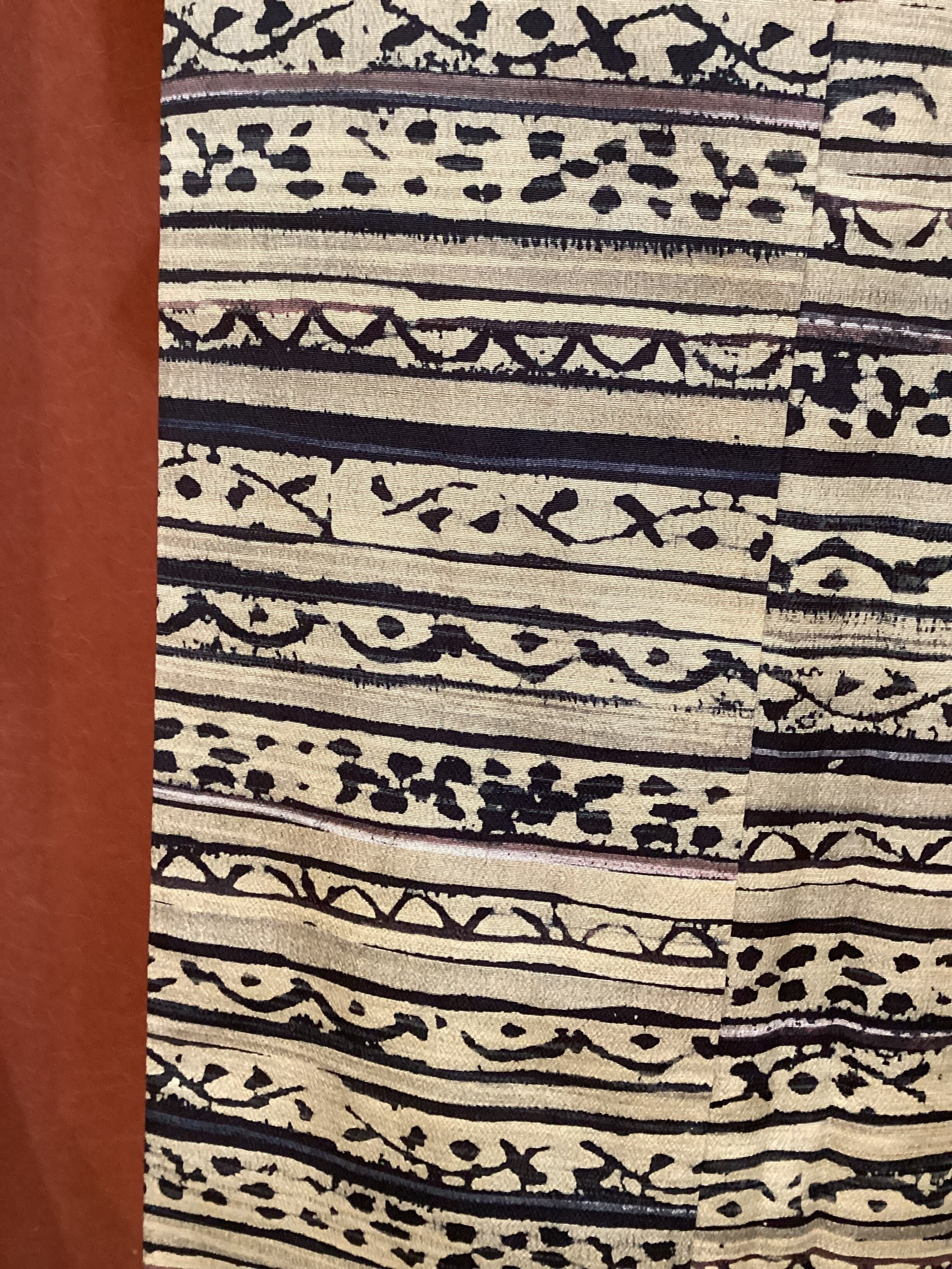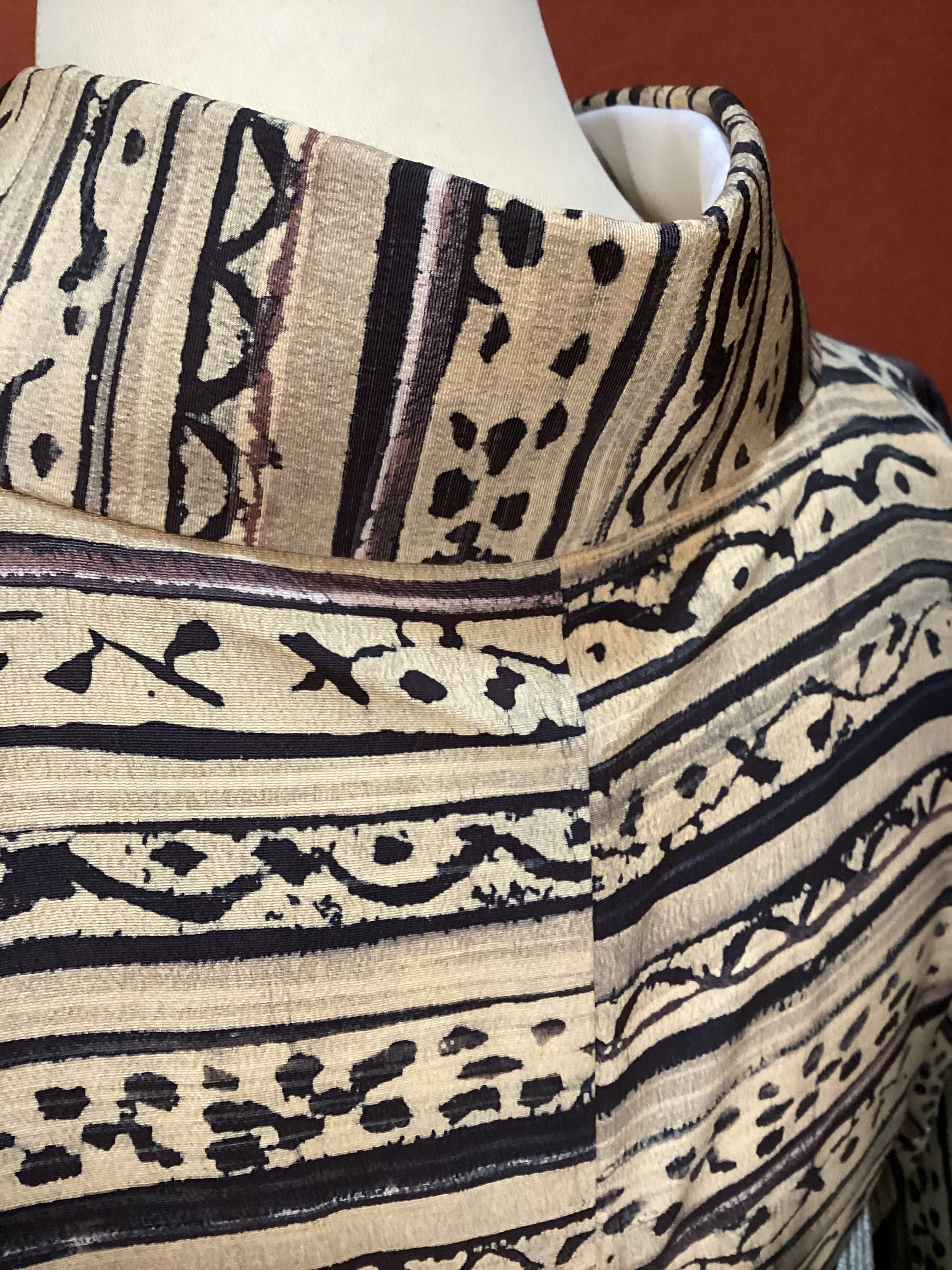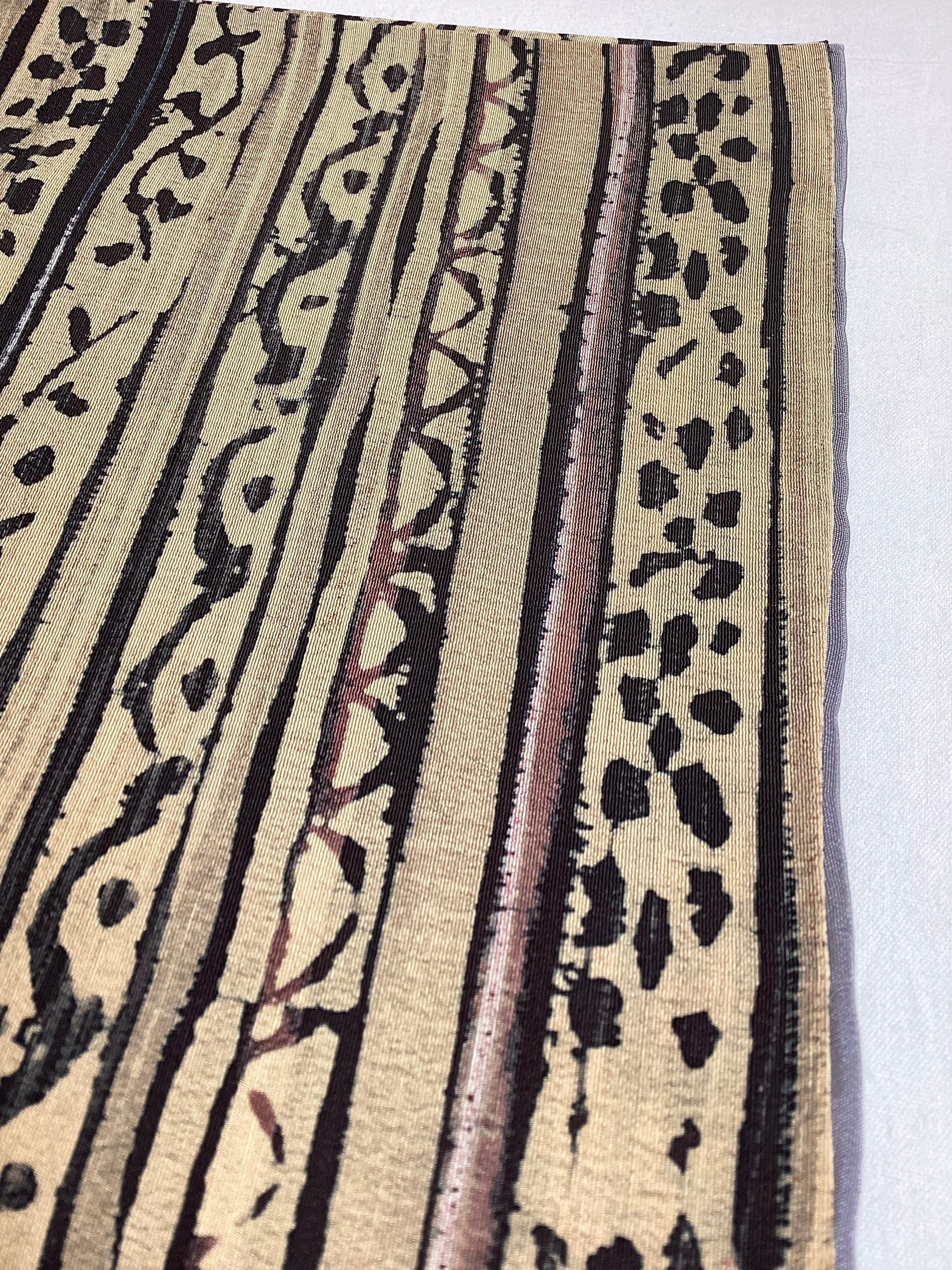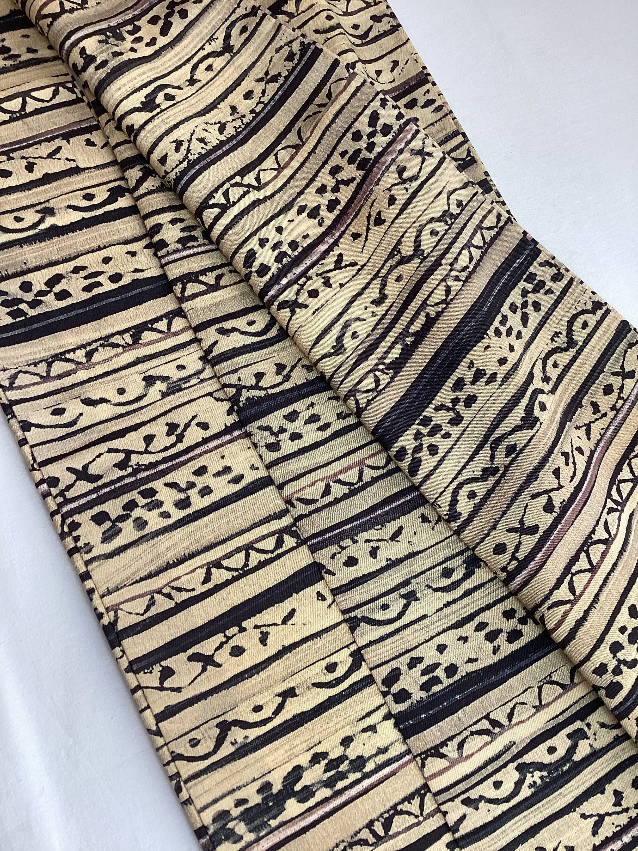 丁子色(黄みがかったベージュ)のベース地に刷毛で引いたような横段とその隙間を埋めるように様々な抽象文様が染められたお洒落小紋きものです。秋冬にかけて活躍しそうなこっくりとしたお色目です。今回は秋口コーディネートとして、軽やかな白っぽい帯を合わせてみましたが、寒い季節に濃いお色目の帯を合わせても素敵に決まりそうです。ちょっと個性と味わいのあるお洒落小紋をお出掛けのワードローブに加えてみませんか?