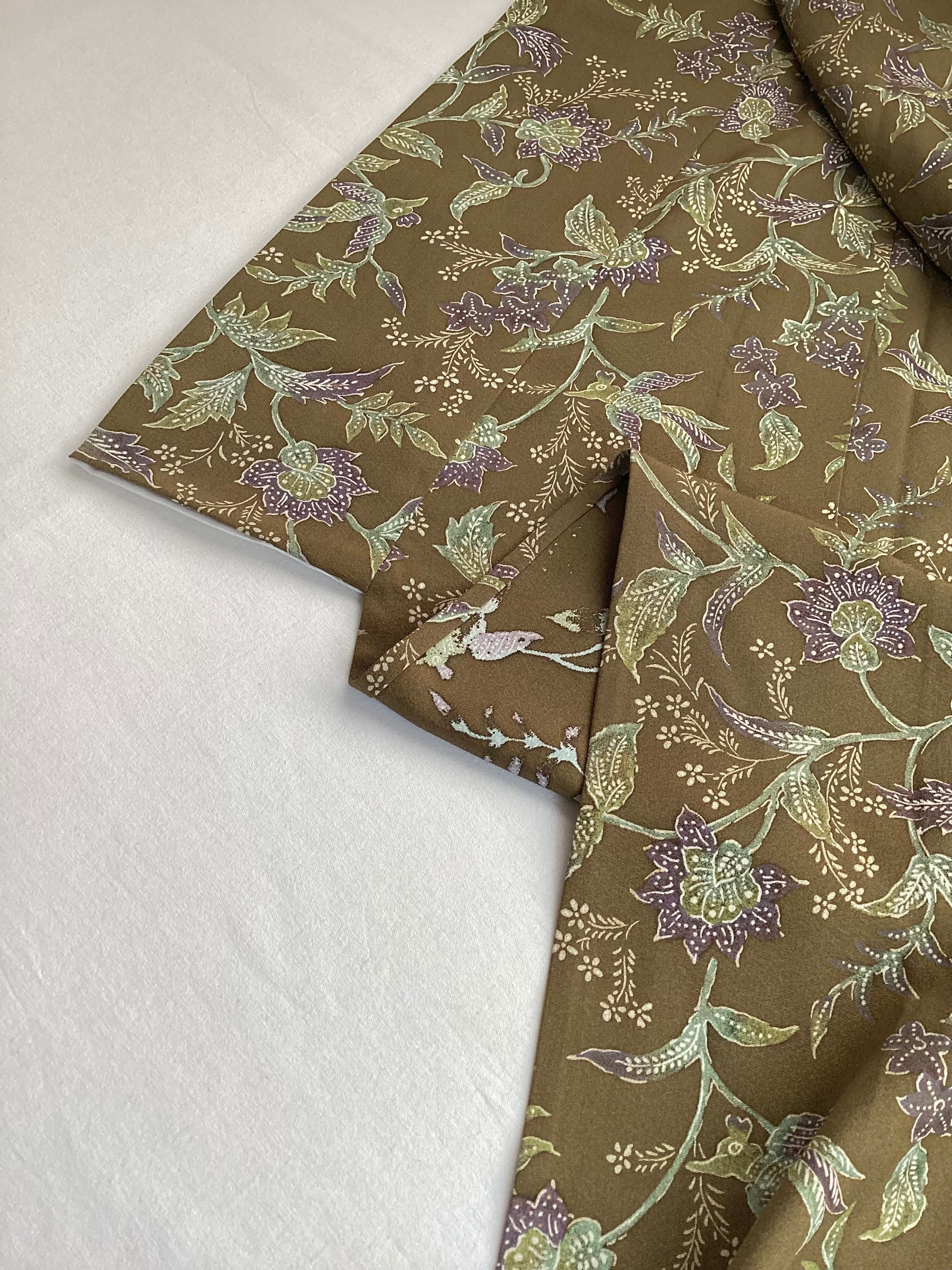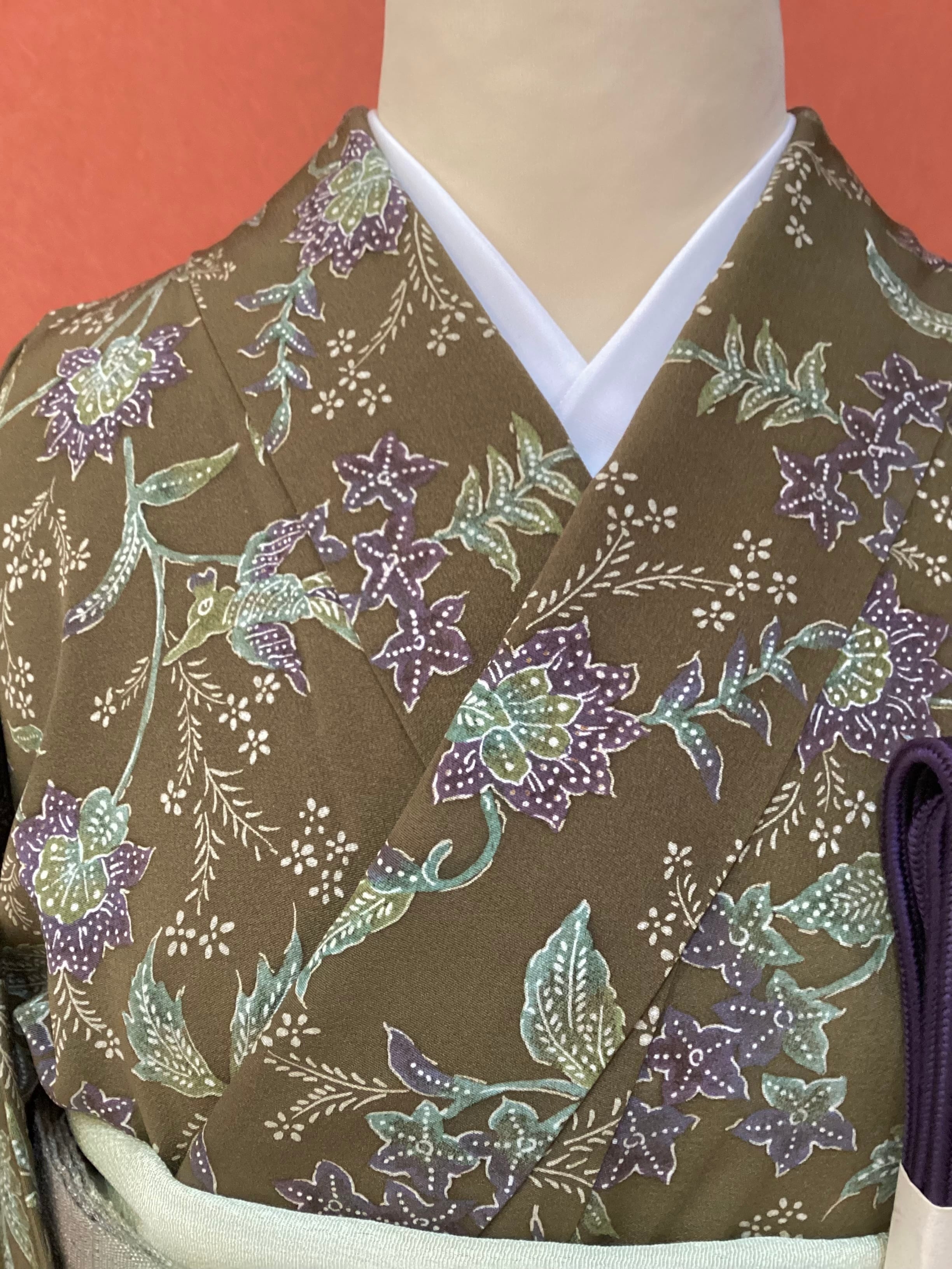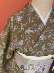 落ち感の良い柔らかな緑がかった茶色地に、唐花や、よく見ると花喰い鳥のように花枝をくわえた鳥の文様が染められた小紋きものです。着物の暦では袷の季節に入りましたが、まだまだ暑い日のお出掛けに茶色の落ち着いた色合いの単衣小紋はいかがでしょうか。
