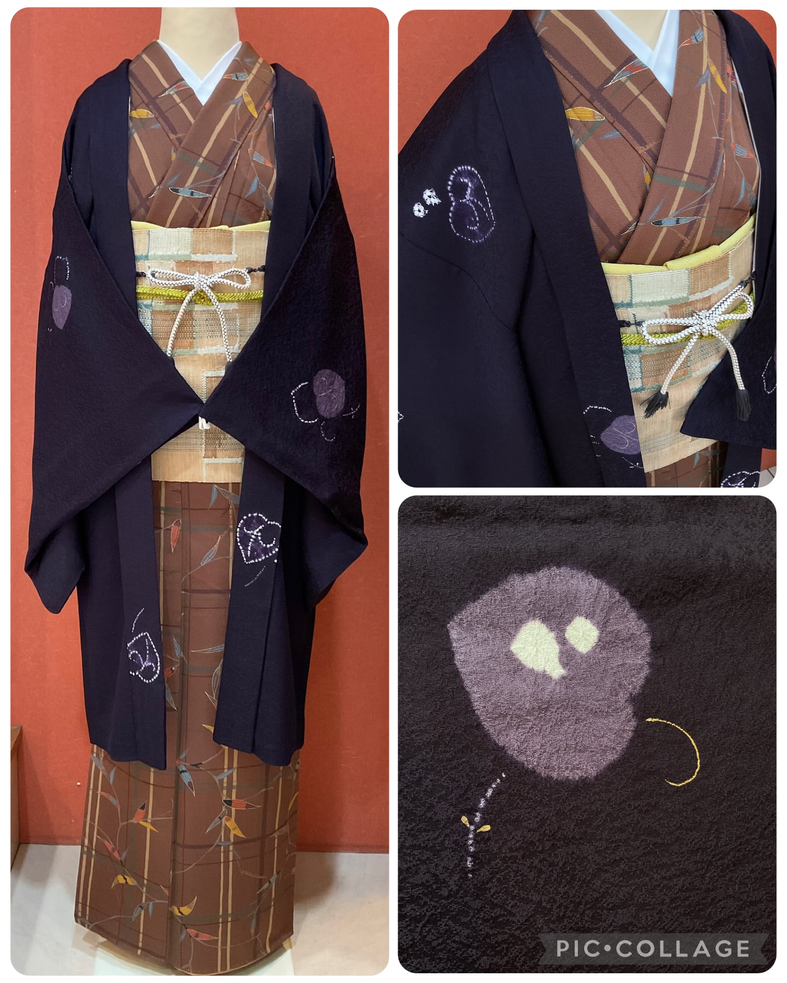 茄子紺地絞りリーフ文羽織(羽織紐付き) 251011-2