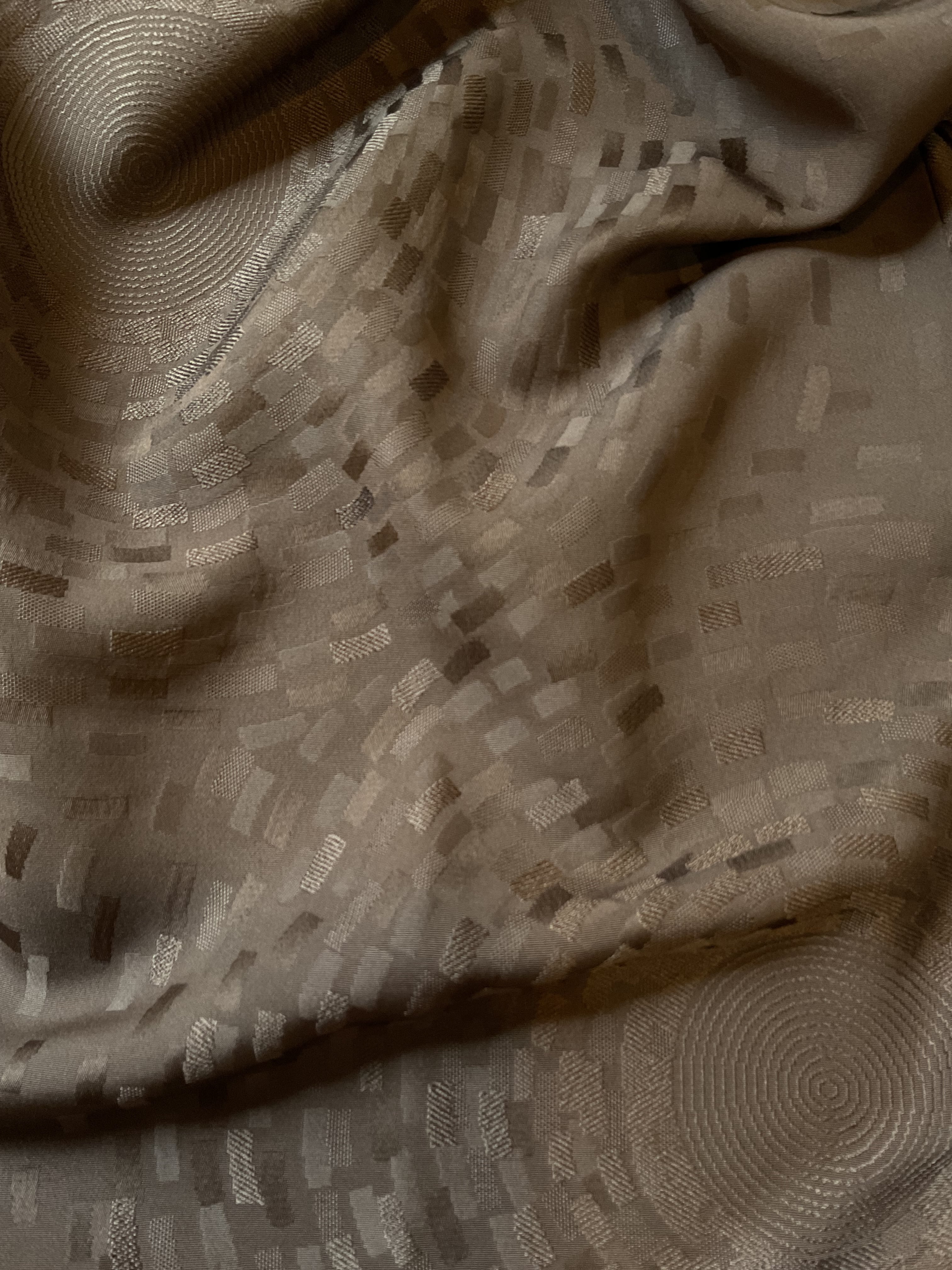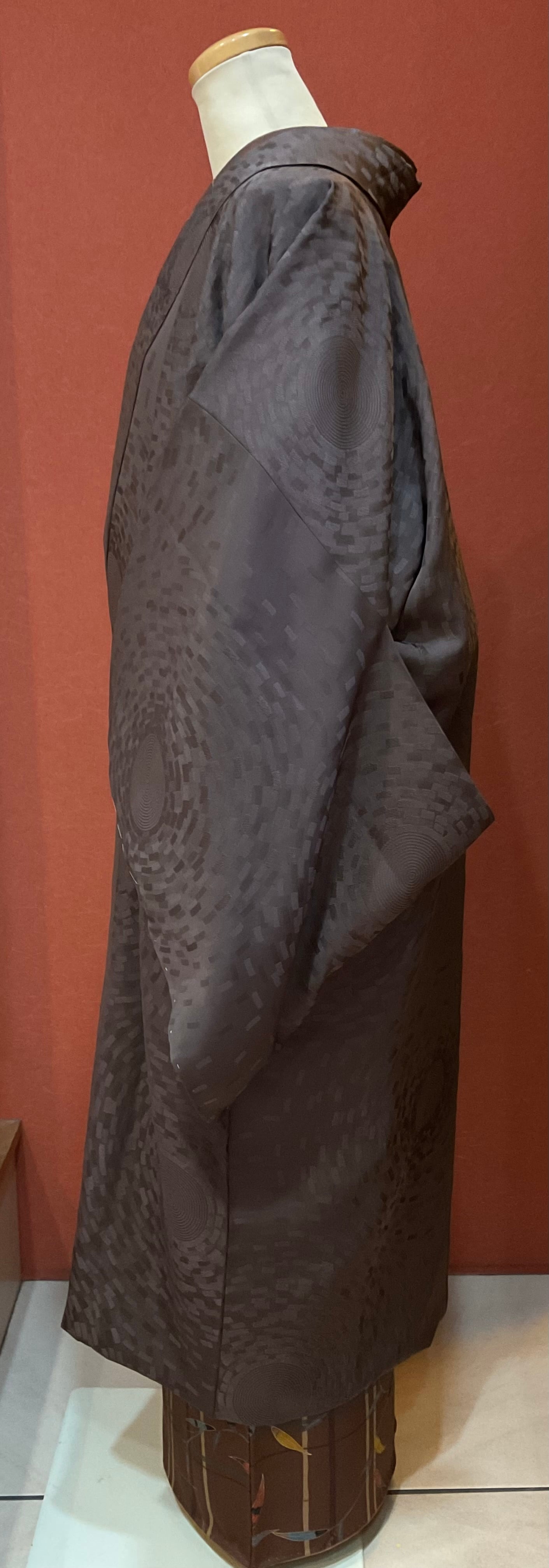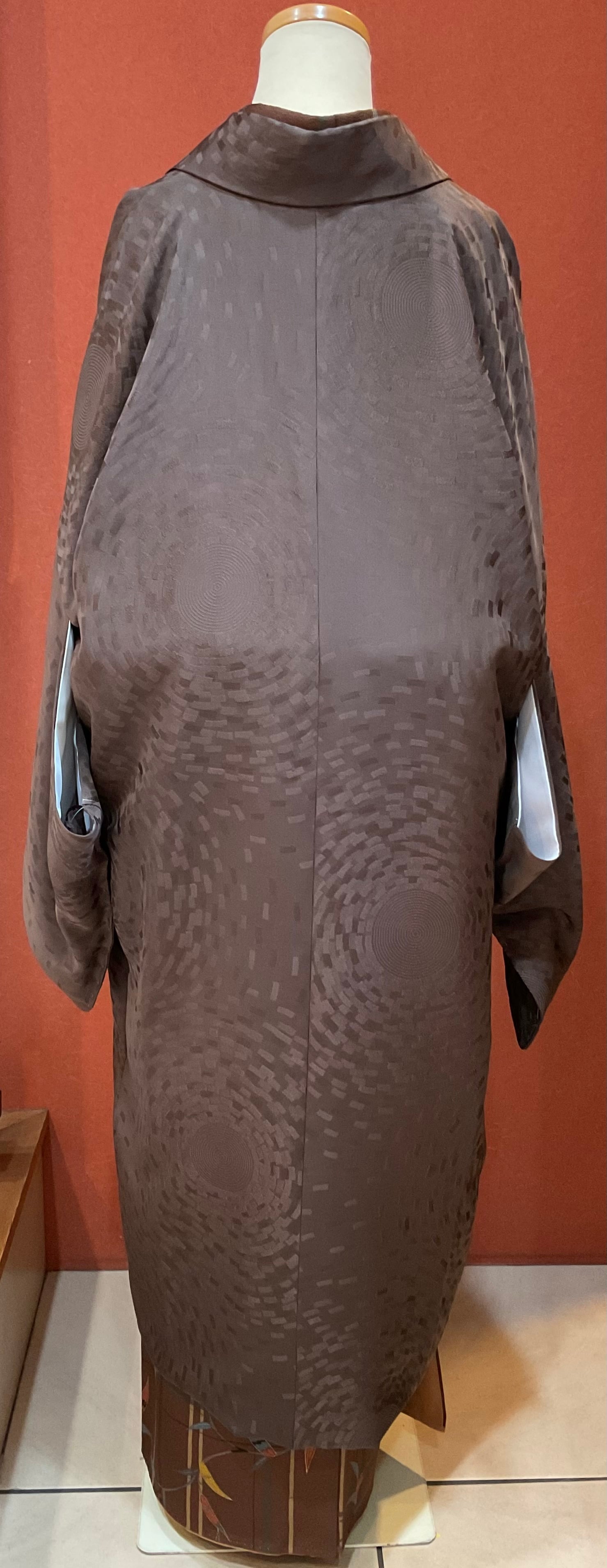 深みのあるココアブラウン地に、キラキラと波打つ波紋を思わせる大ぶりな地紋の入った、袷仕立ての道中着です。