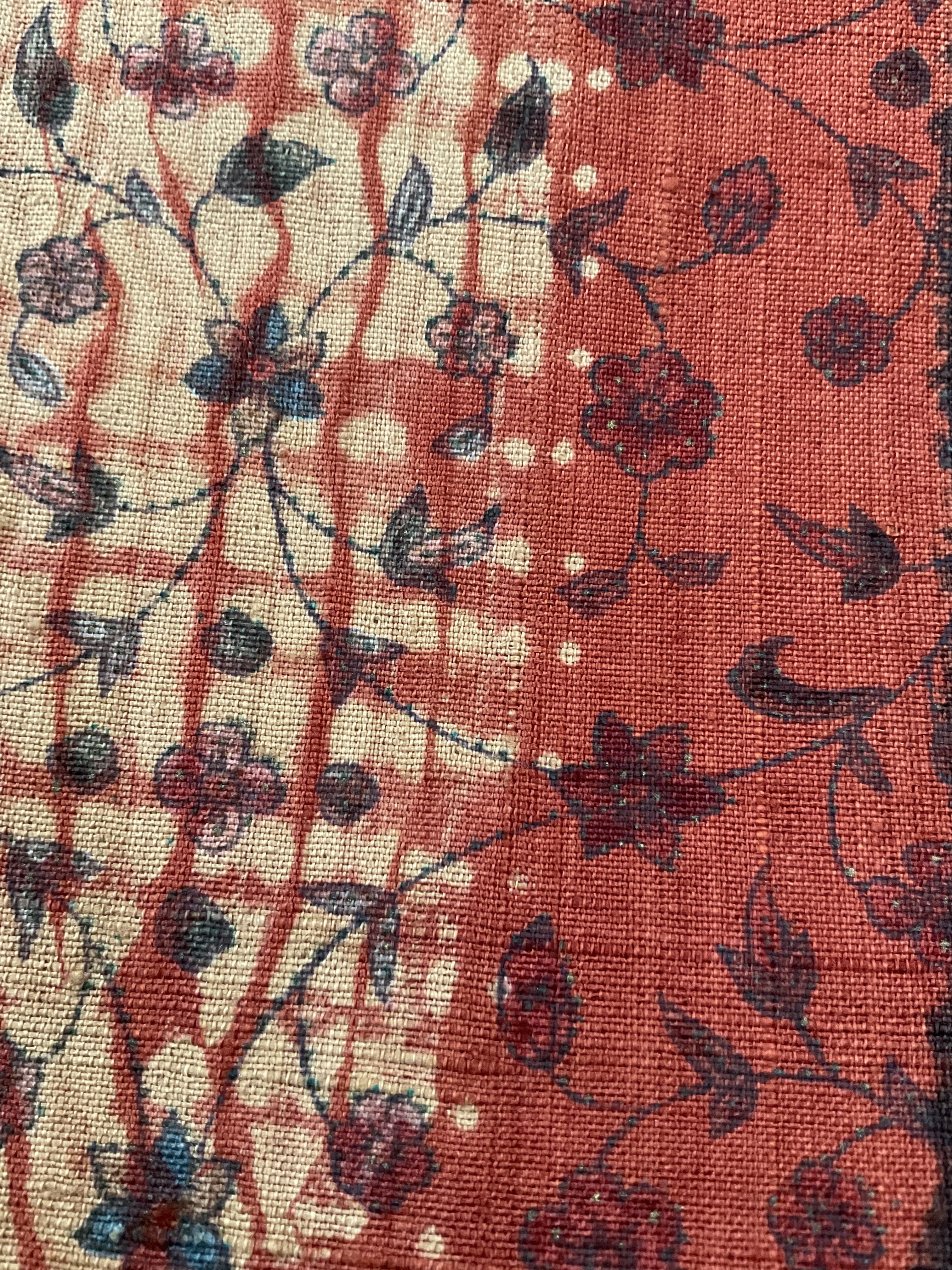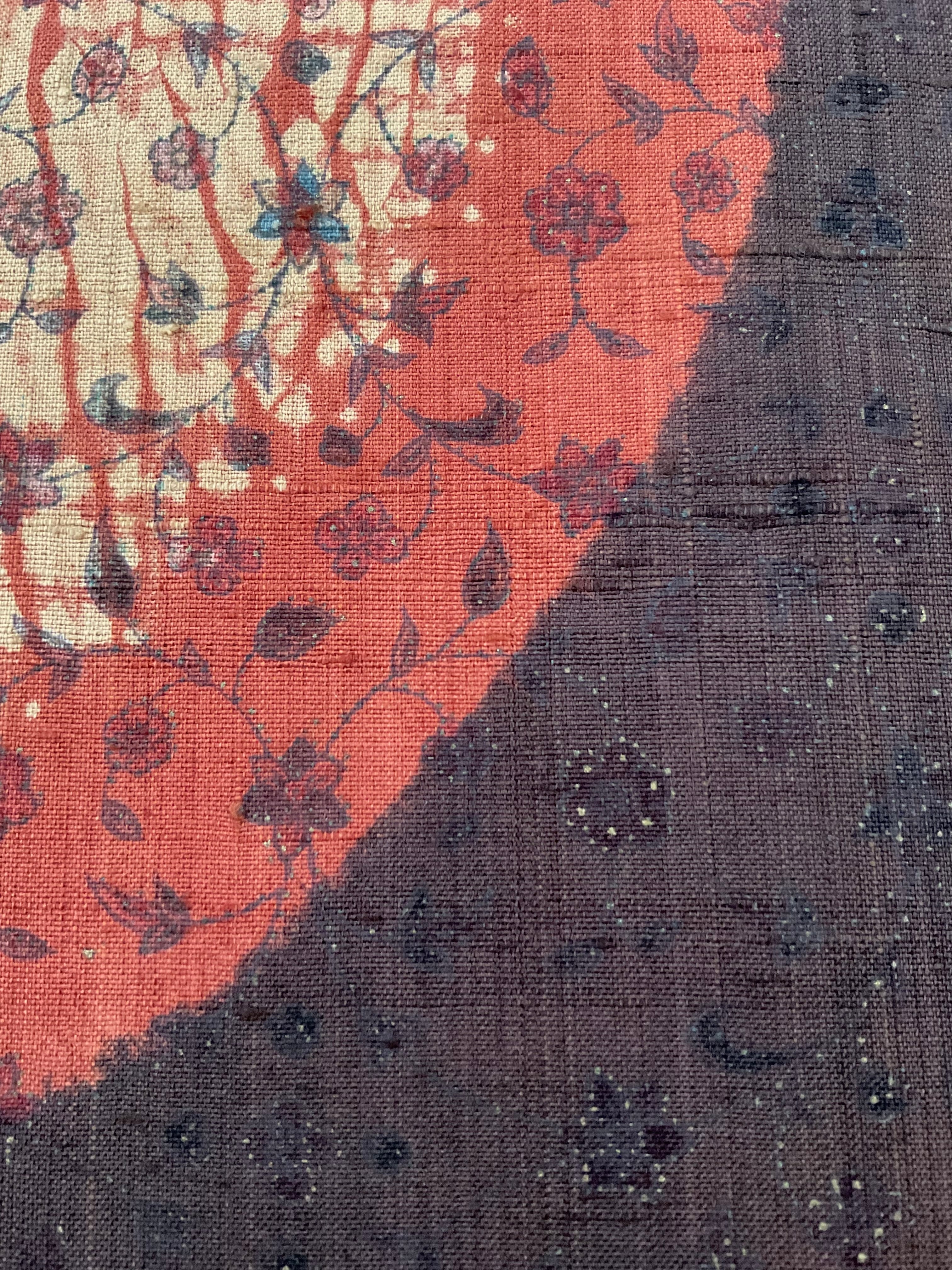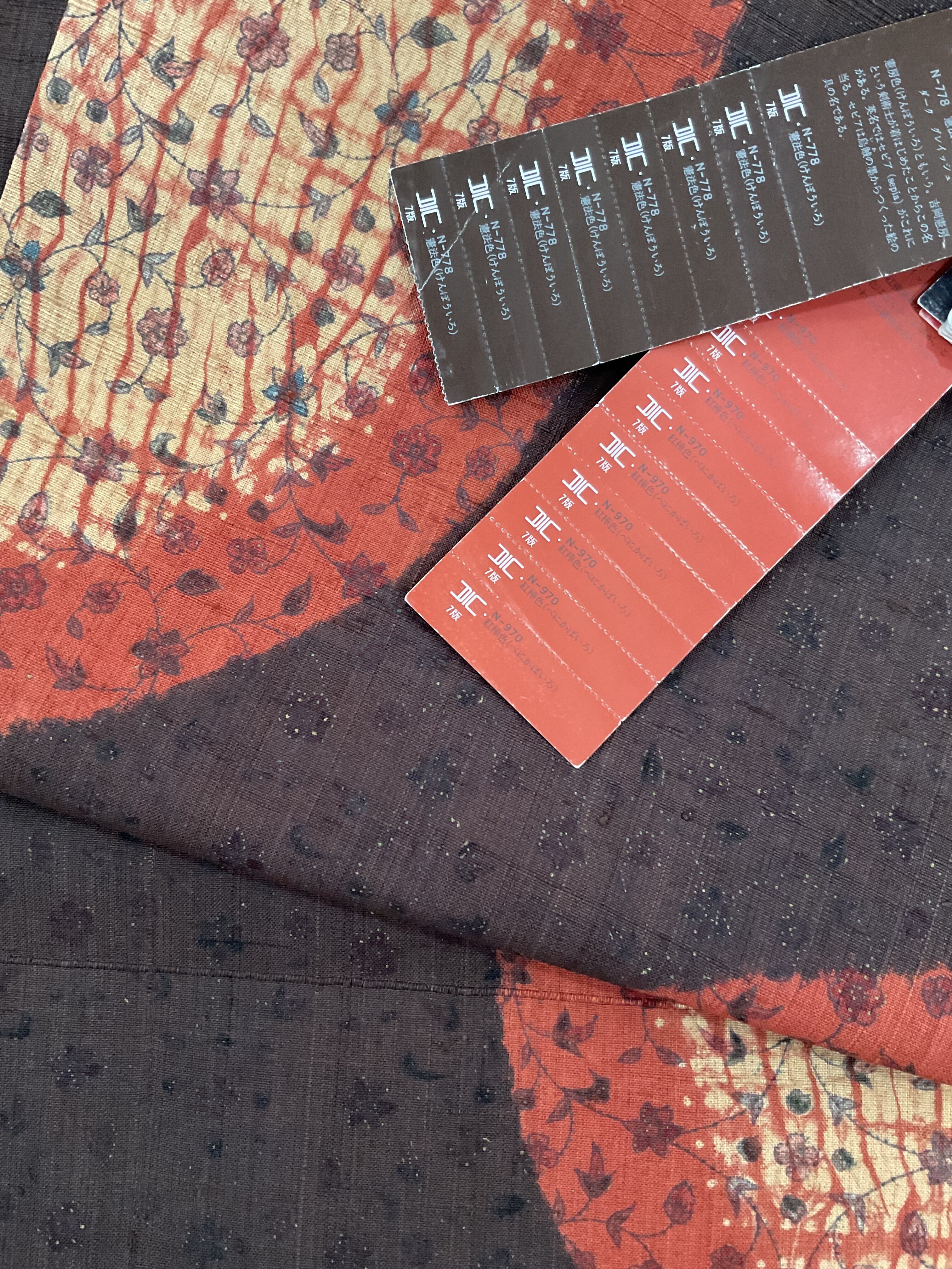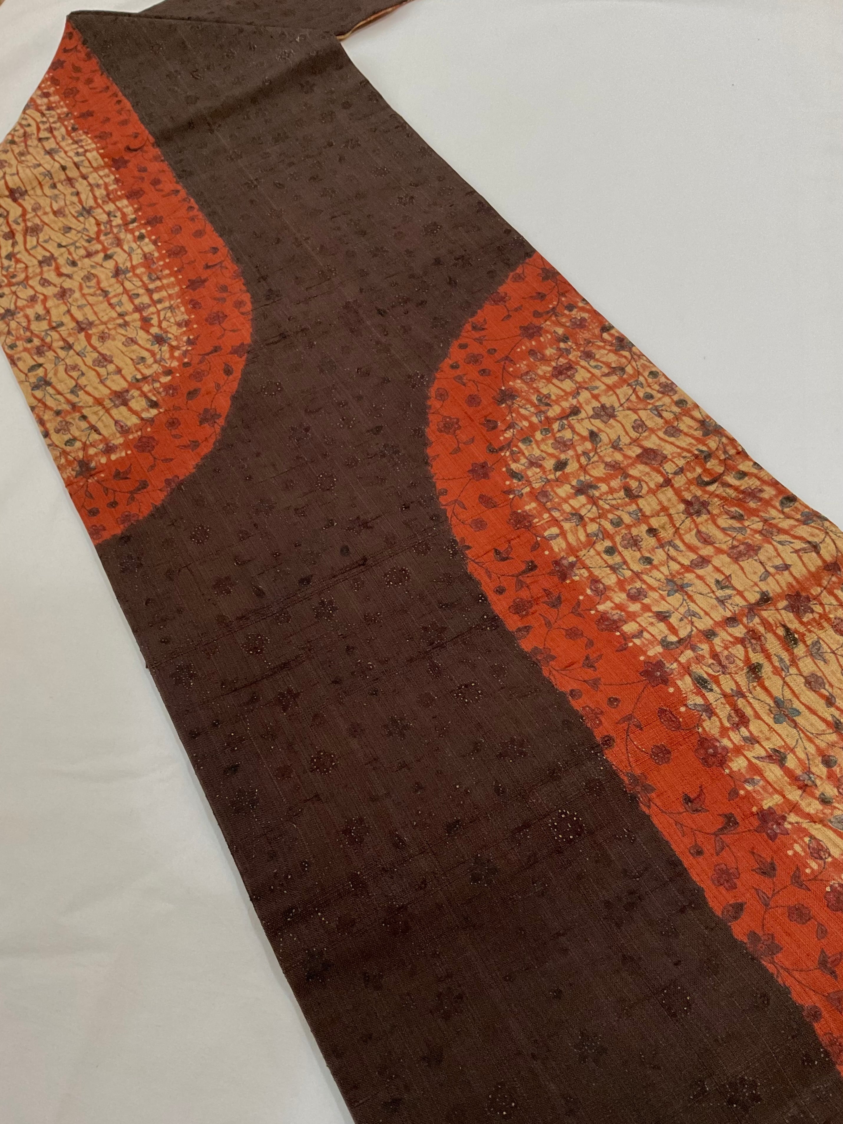 小さな唐花文様が描かれた生紬地をベンガラ色(暗い赤みを帯びた茶色)と憲法色(黒みがかった渋い茶)で染め分けて杢目絞りを配した九寸なごや帯です。モダンな配色と絞りの技が効いた洒落味ある帯となっています。