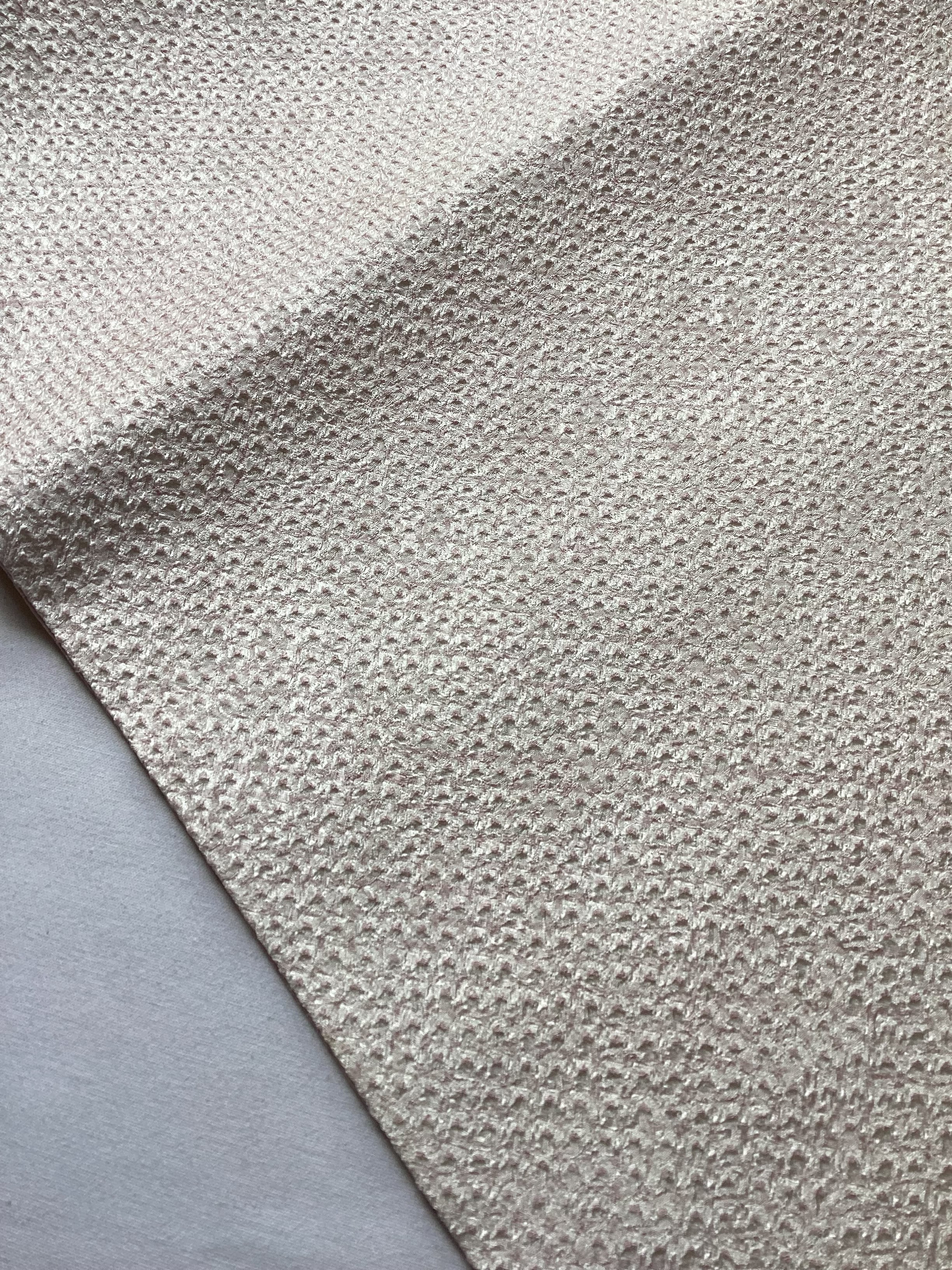薄ピンクに細かく匹田文様に絞られた白場がほわんほわんとして、ふっくらとした立体感のある可愛いらしい九寸なごや帯です。お柄は菊でしょうか?流水のブルーもアクセントで上品な絞りのオタイコ柄となっております。証はございませんが【きぬたや】のお品と思われます。絞りの名門の技の詰まった逸品はいかがでしょうか。