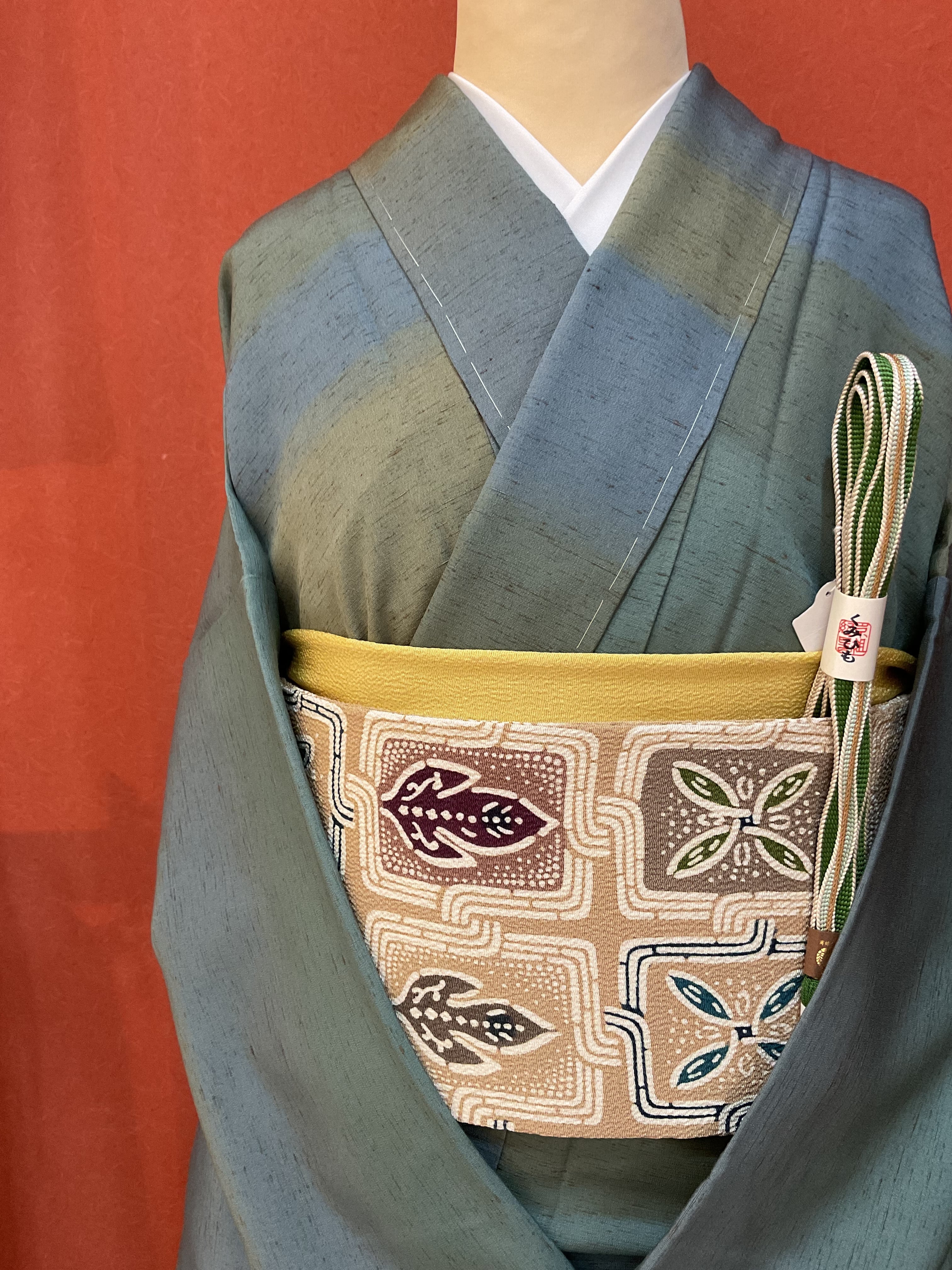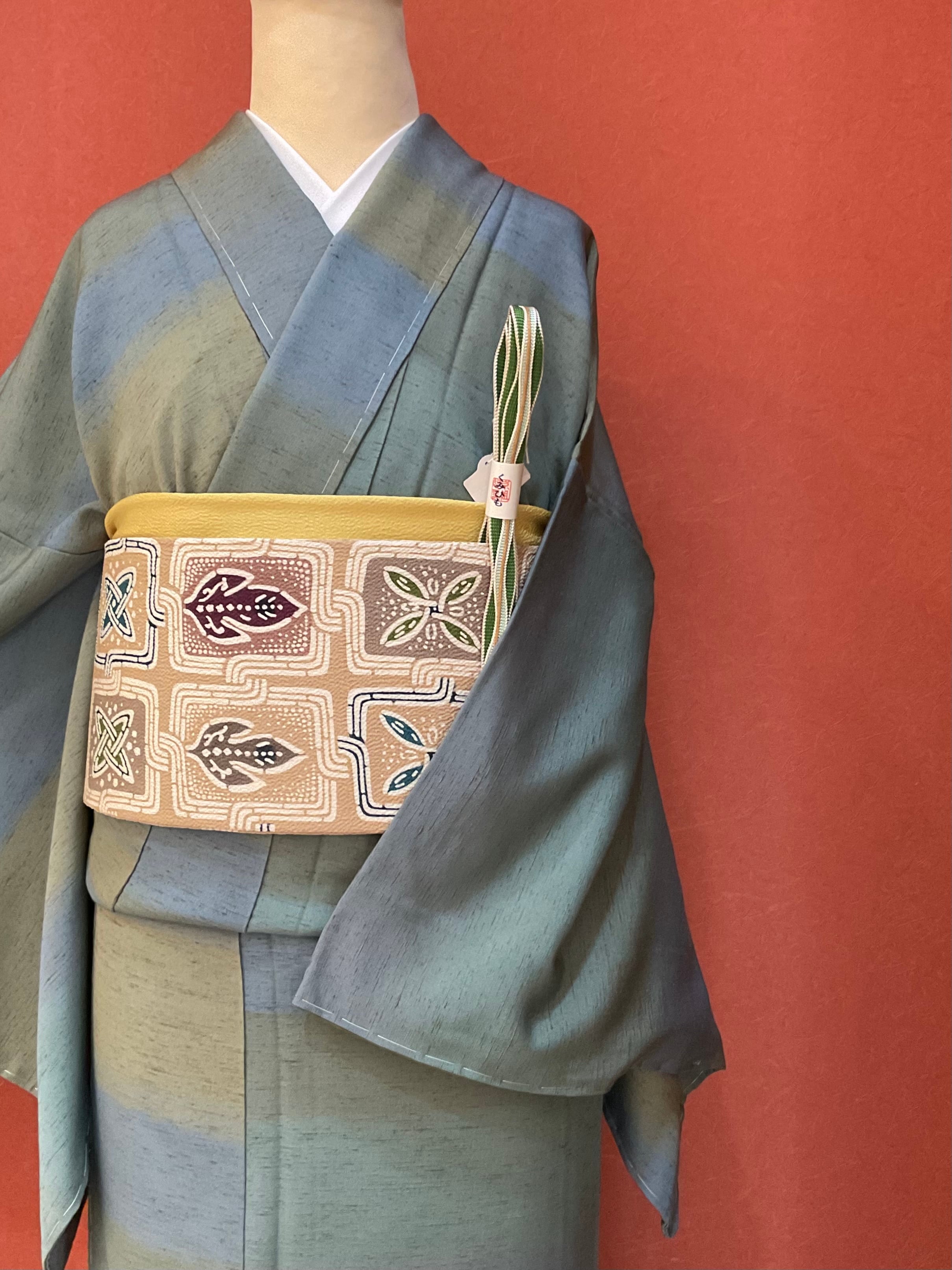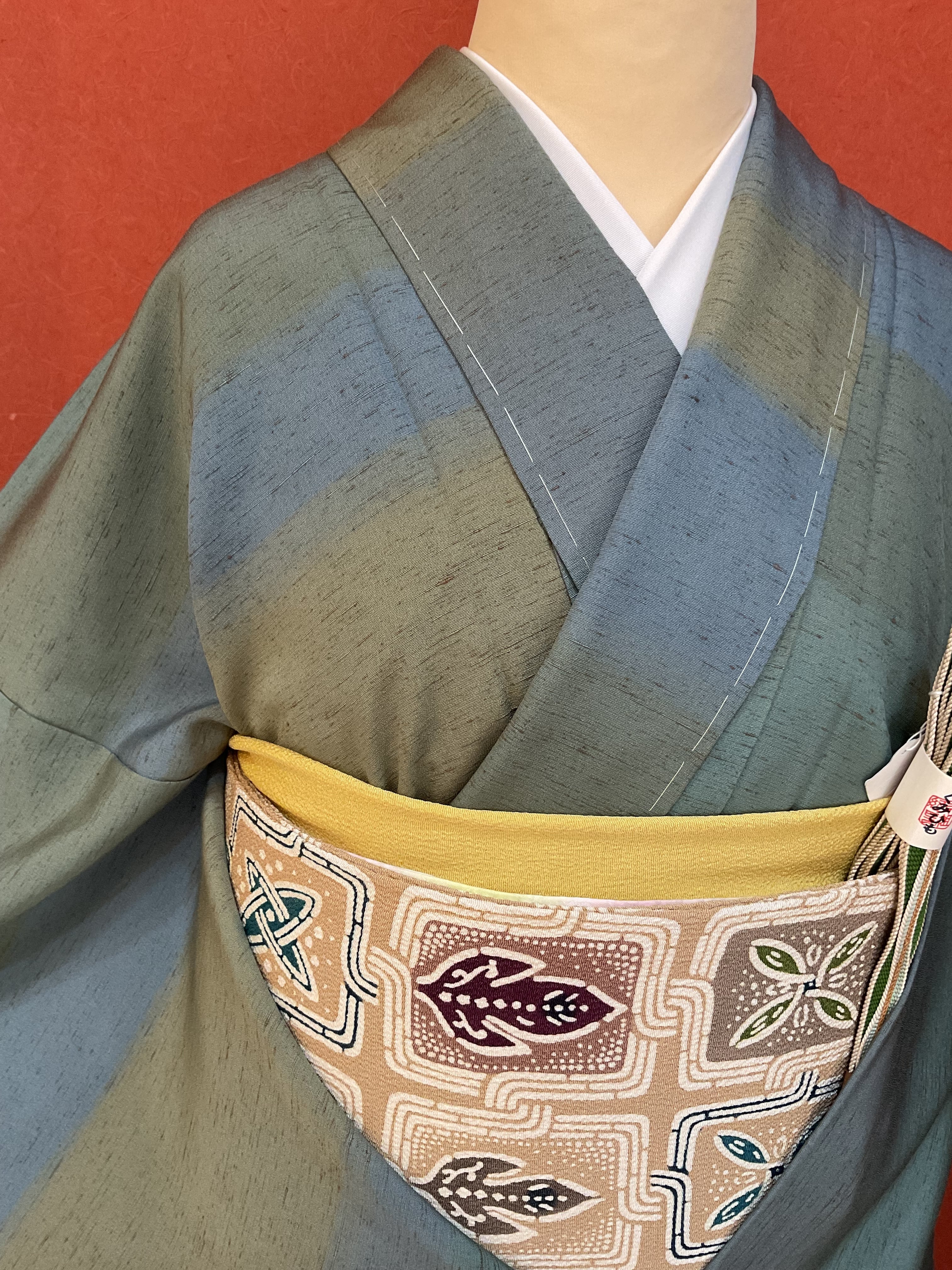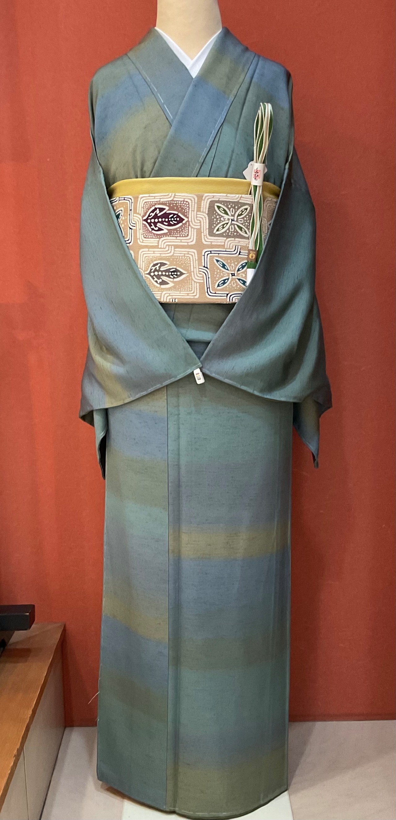 柔らかく薄手のしなやかな紬きものです。灰青から緑の美しいグラデーションにぜんまい糸の節がアクセントになり程よい大人カジュアルな紬着物となっています。秋のお出掛け着としていかがでしょうか。