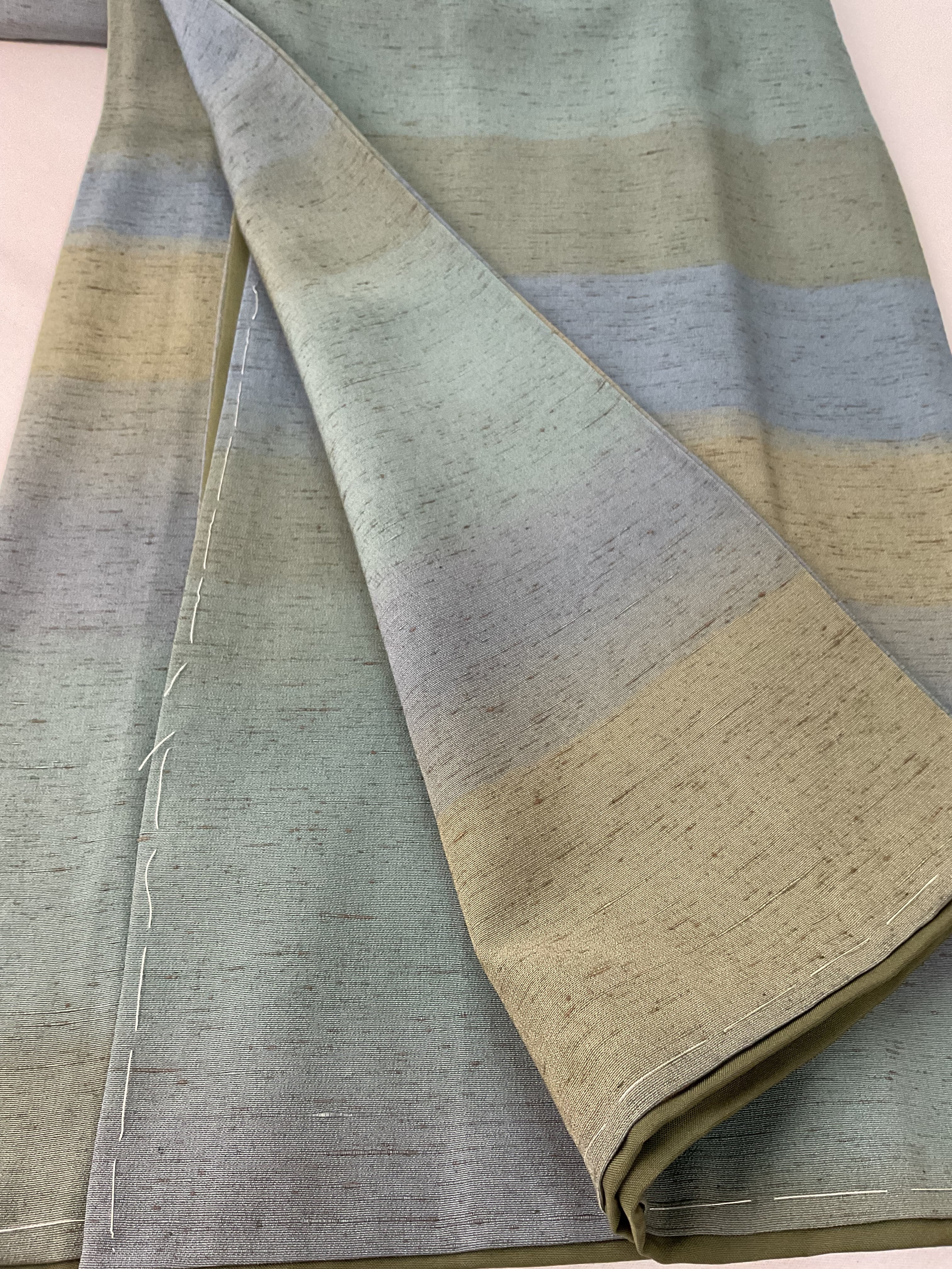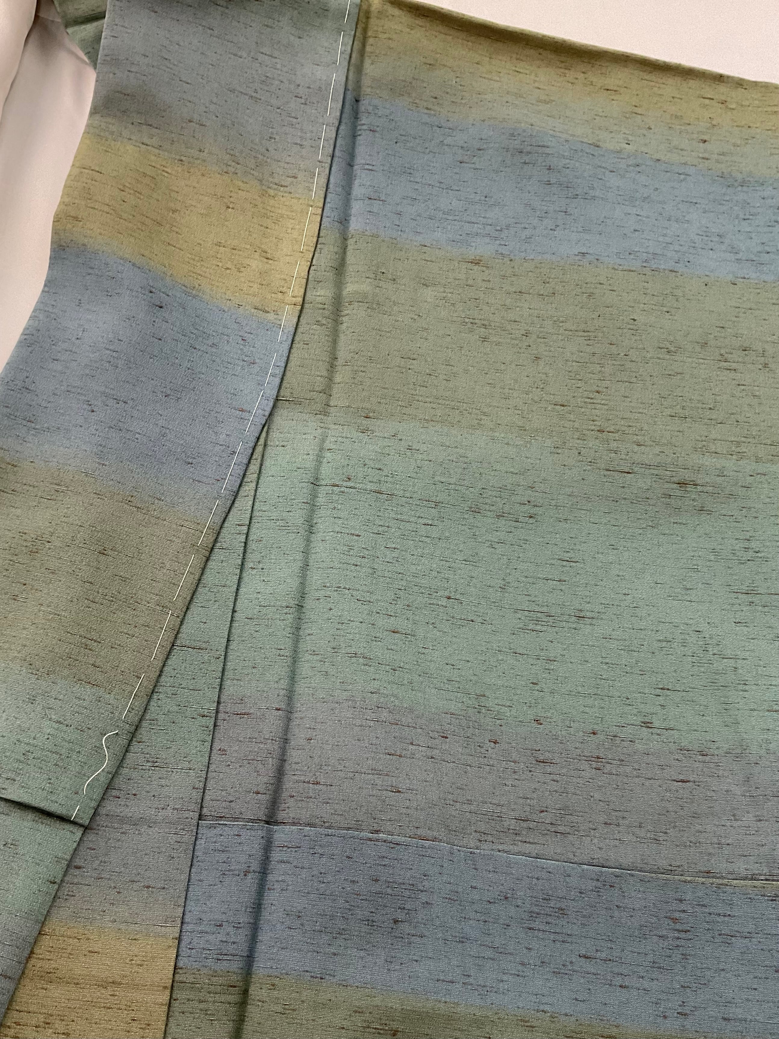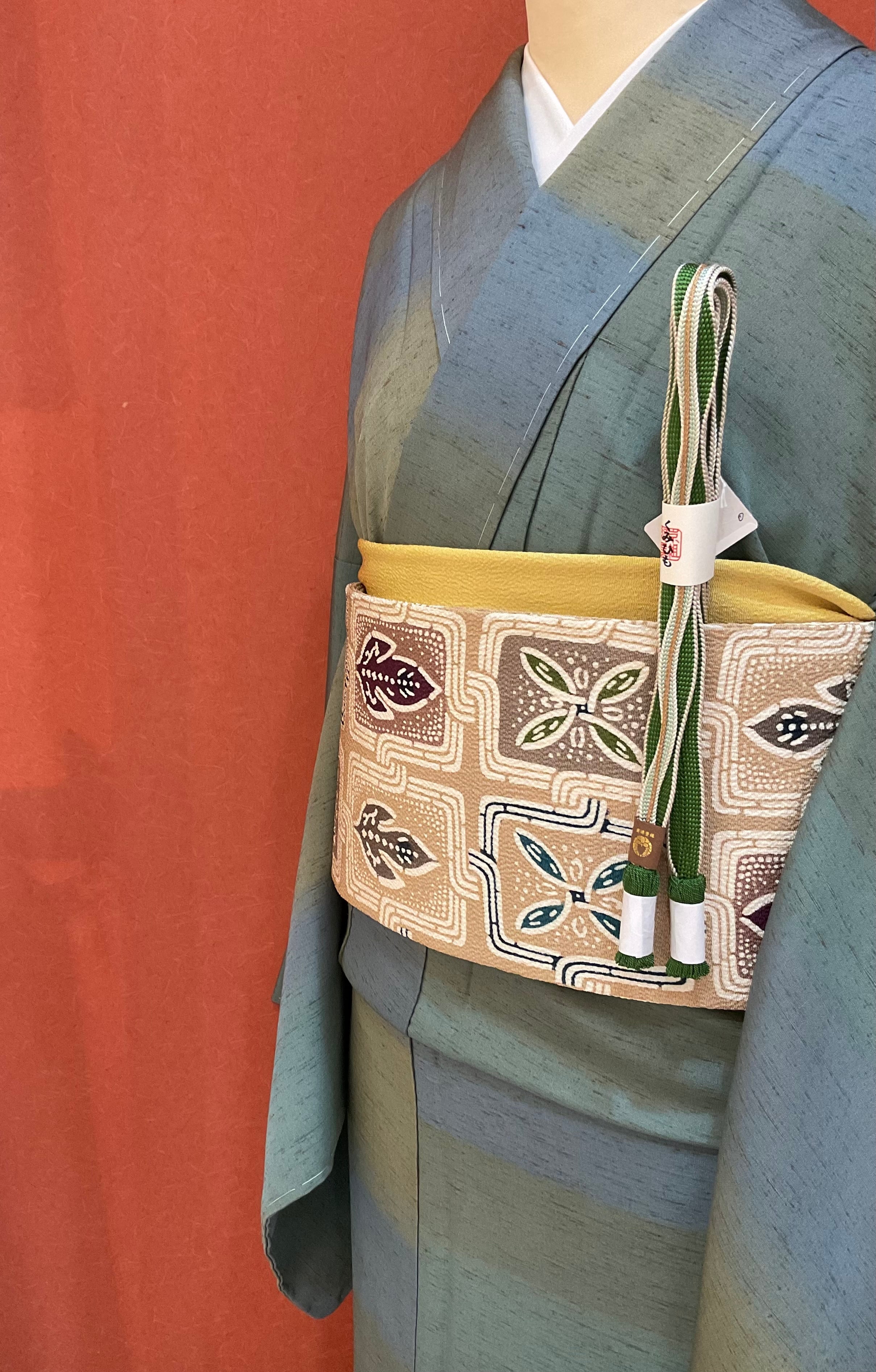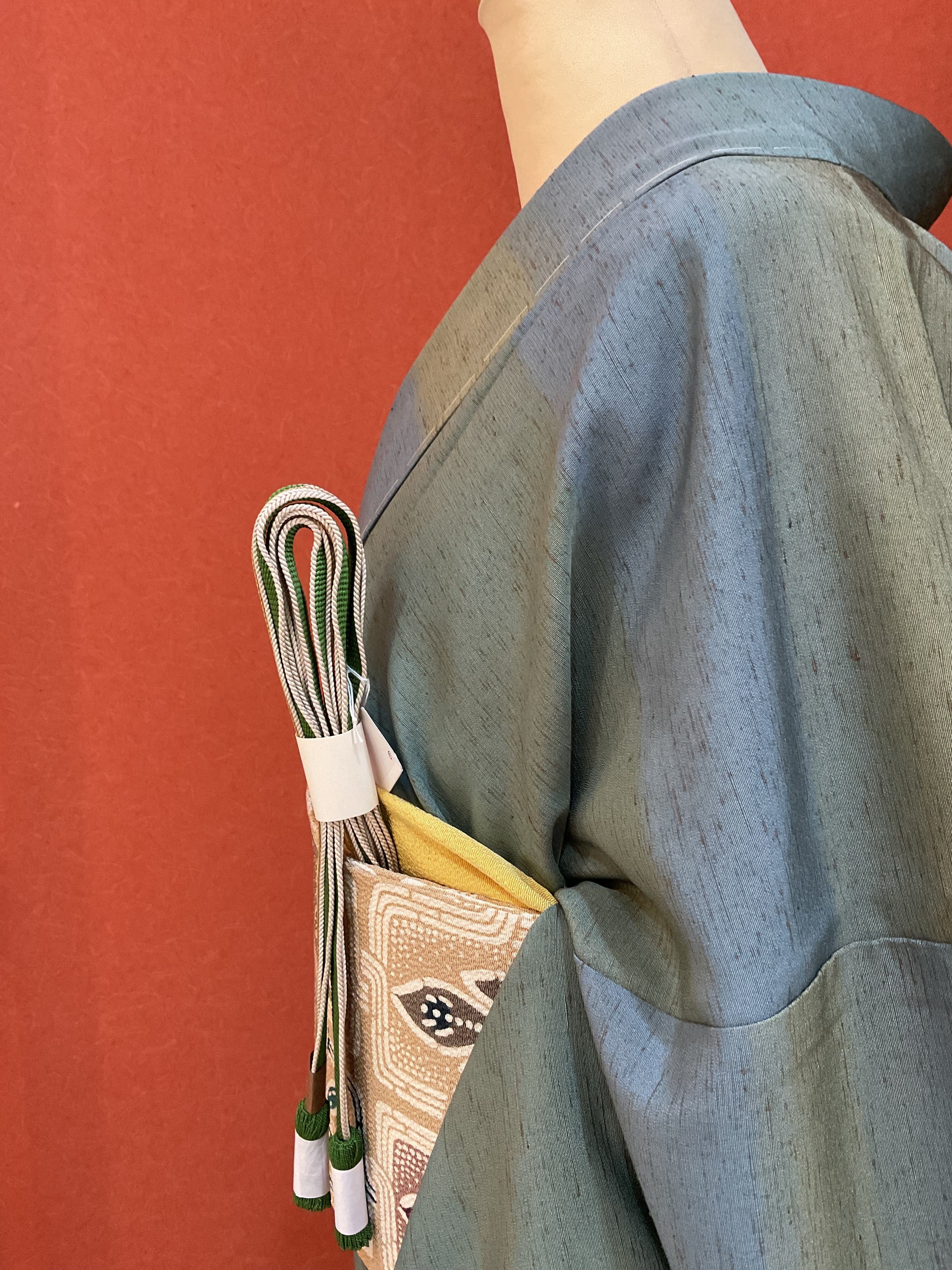 柔らかく薄手のしなやかな紬きものです。灰青から緑の美しいグラデーションにぜんまい糸の節がアクセントになり程よい大人カジュアルな紬着物となっています。秋のお出掛け着としていかがでしょうか。