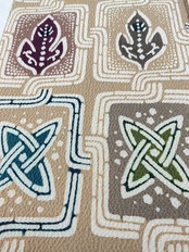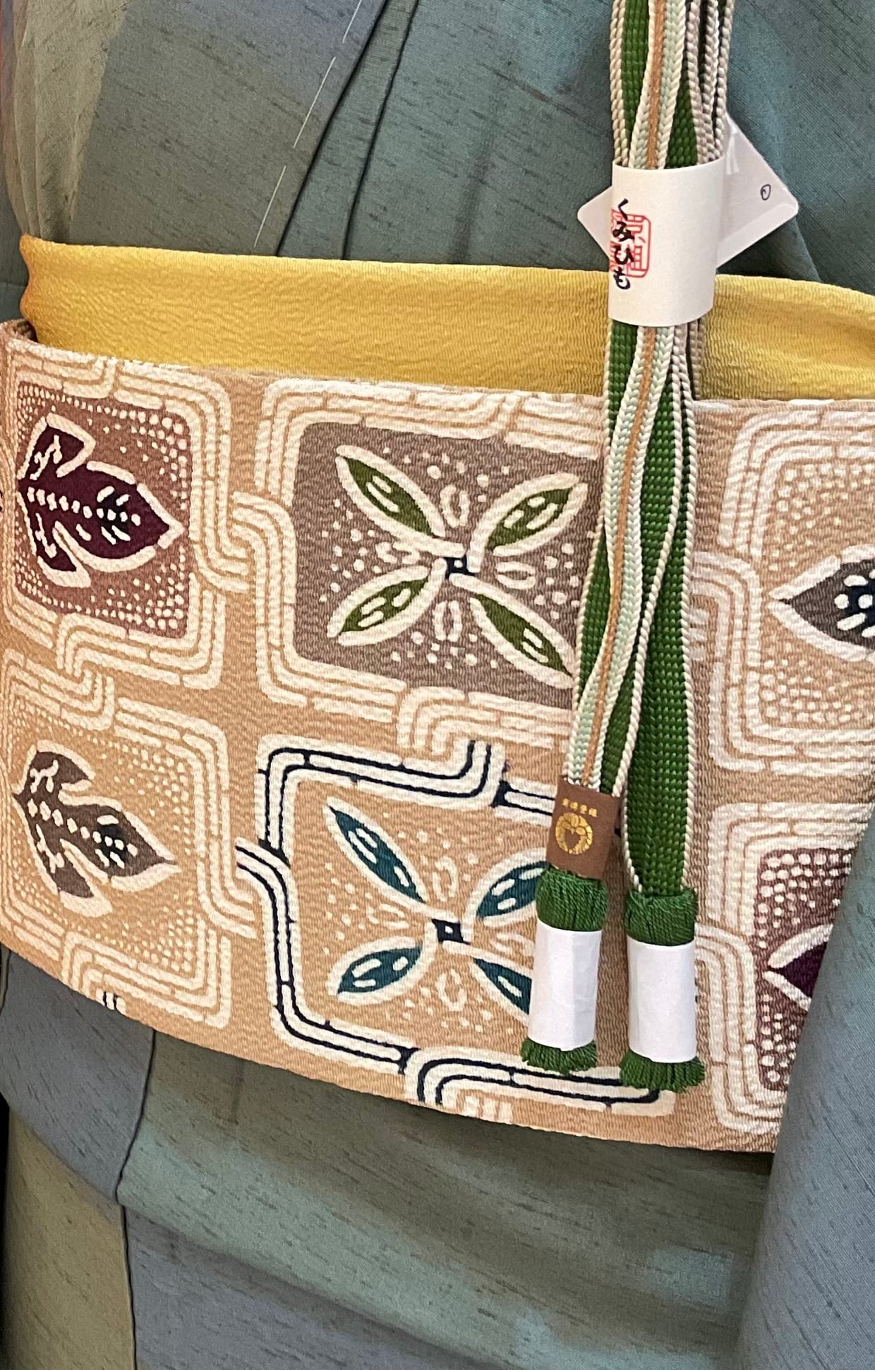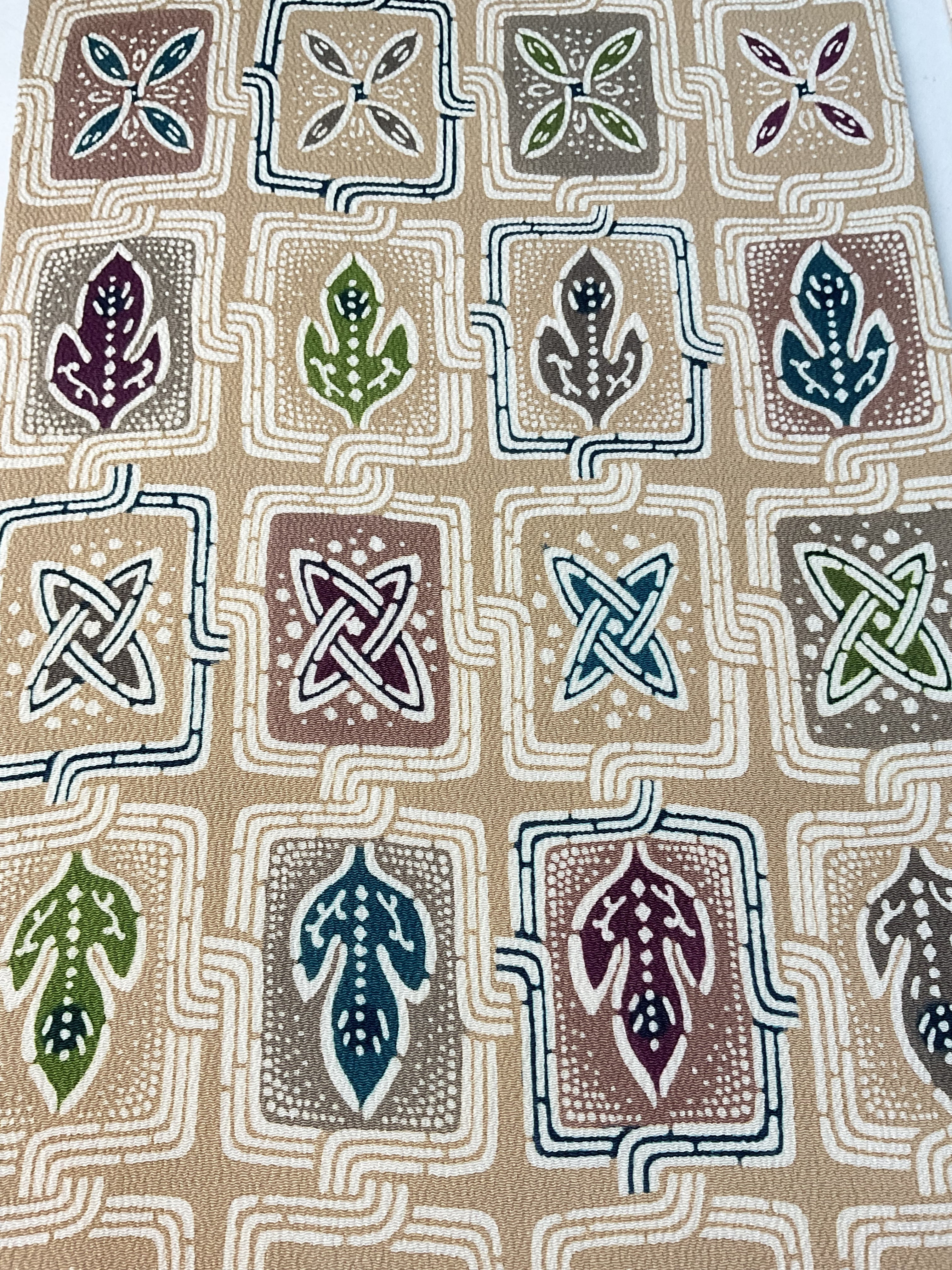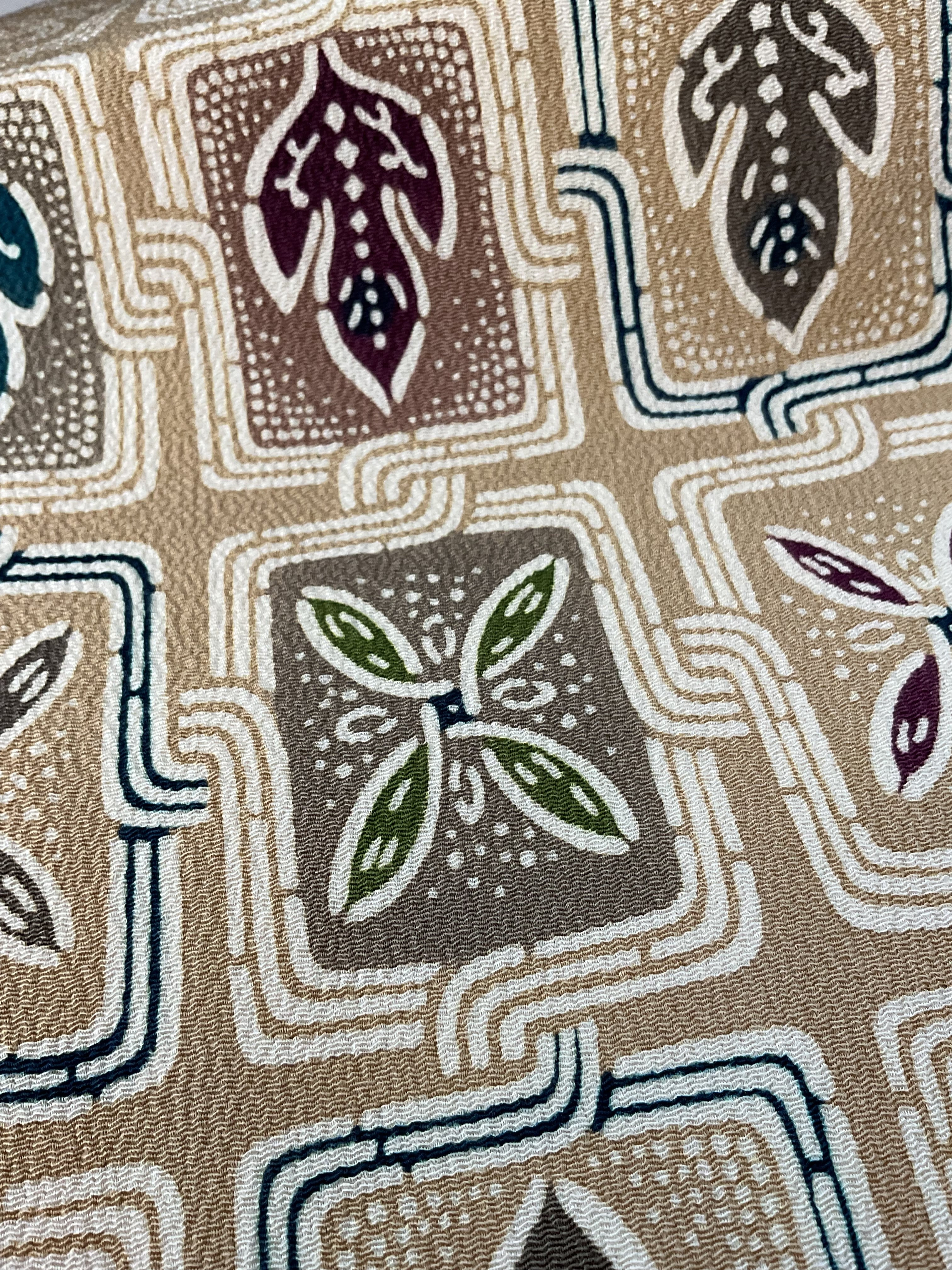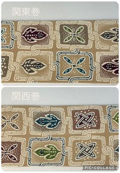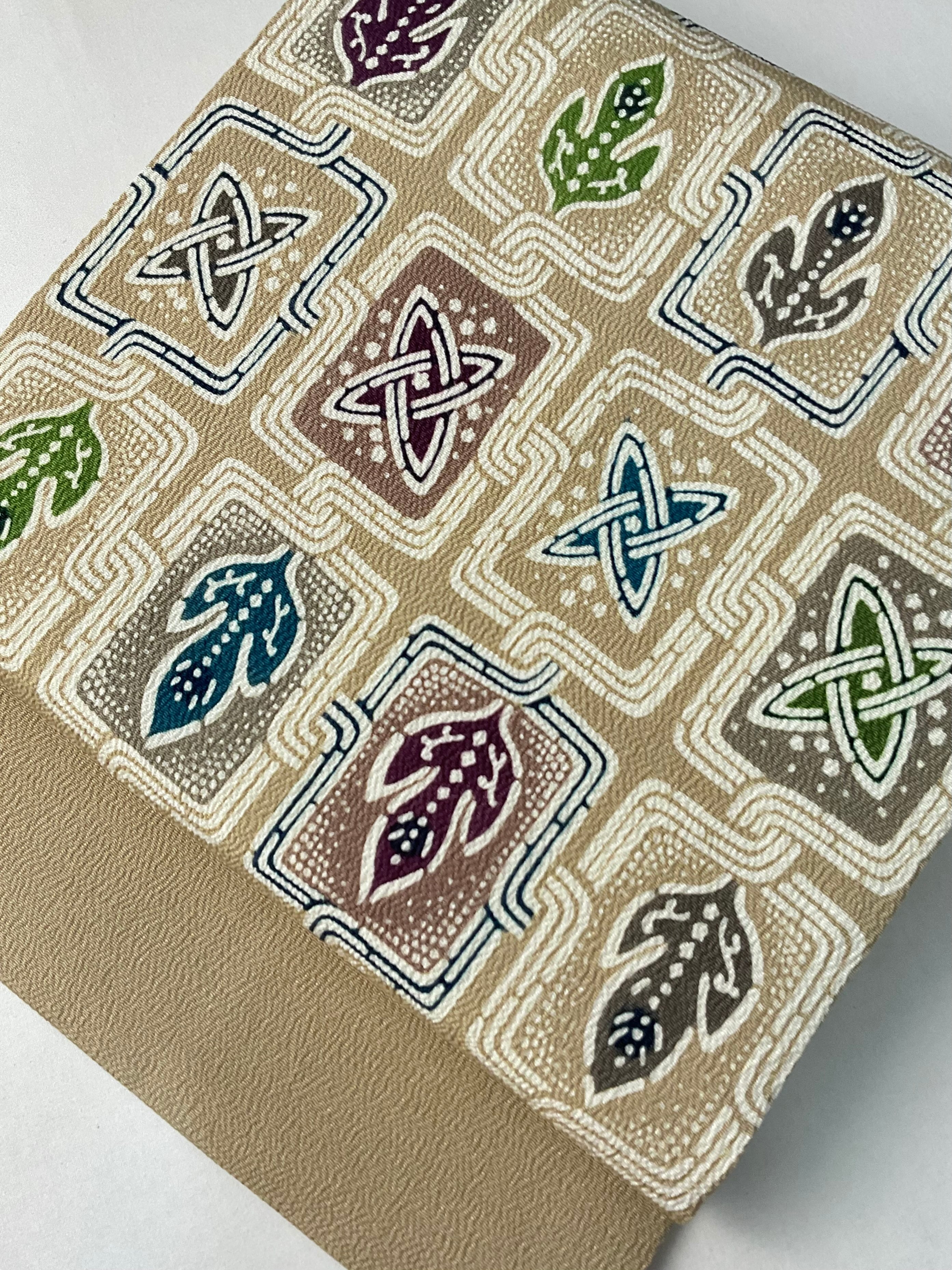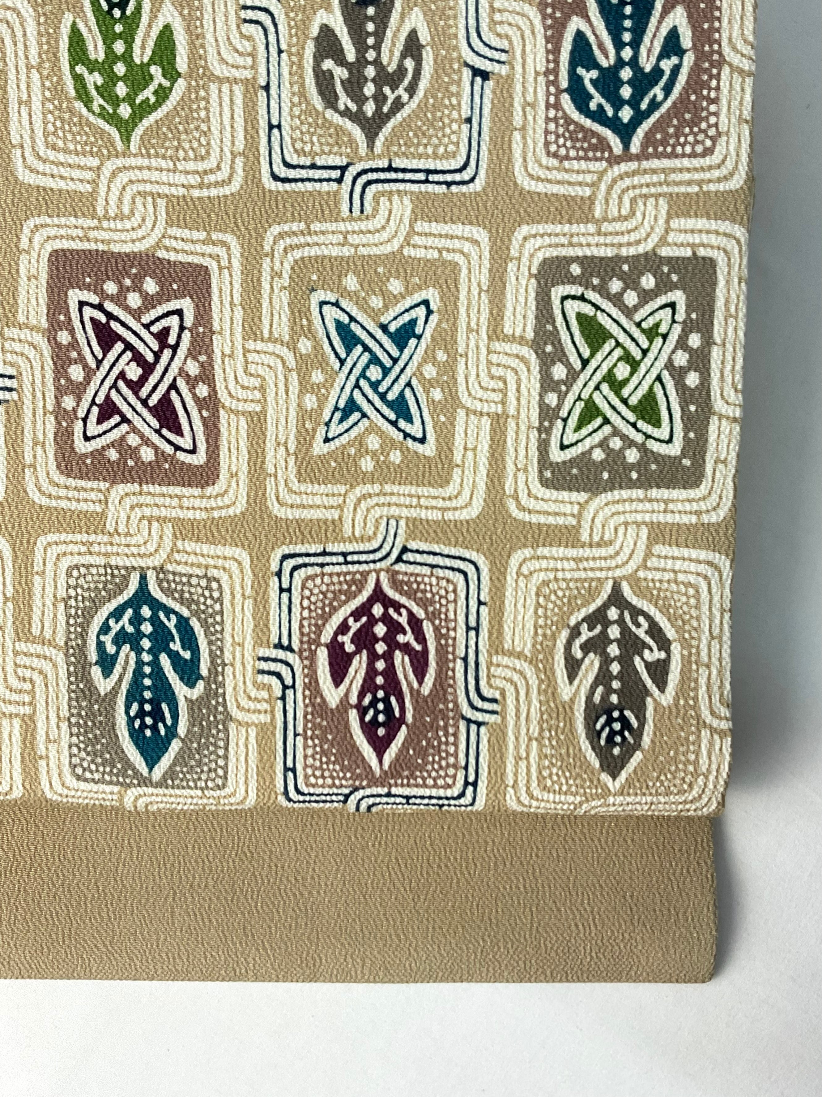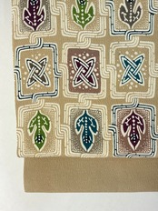優しいミルクティー色の縮緬地に植物柄、葉っぱのような文様が繋がった楽しいデザインの【栗山吉三郎】九寸なごや帯です。一貫して手作業にこだわる京都の和染紅型工房【栗山工房】のお品は、きものファンなら一つはアイテムに加えてみたいお品です。