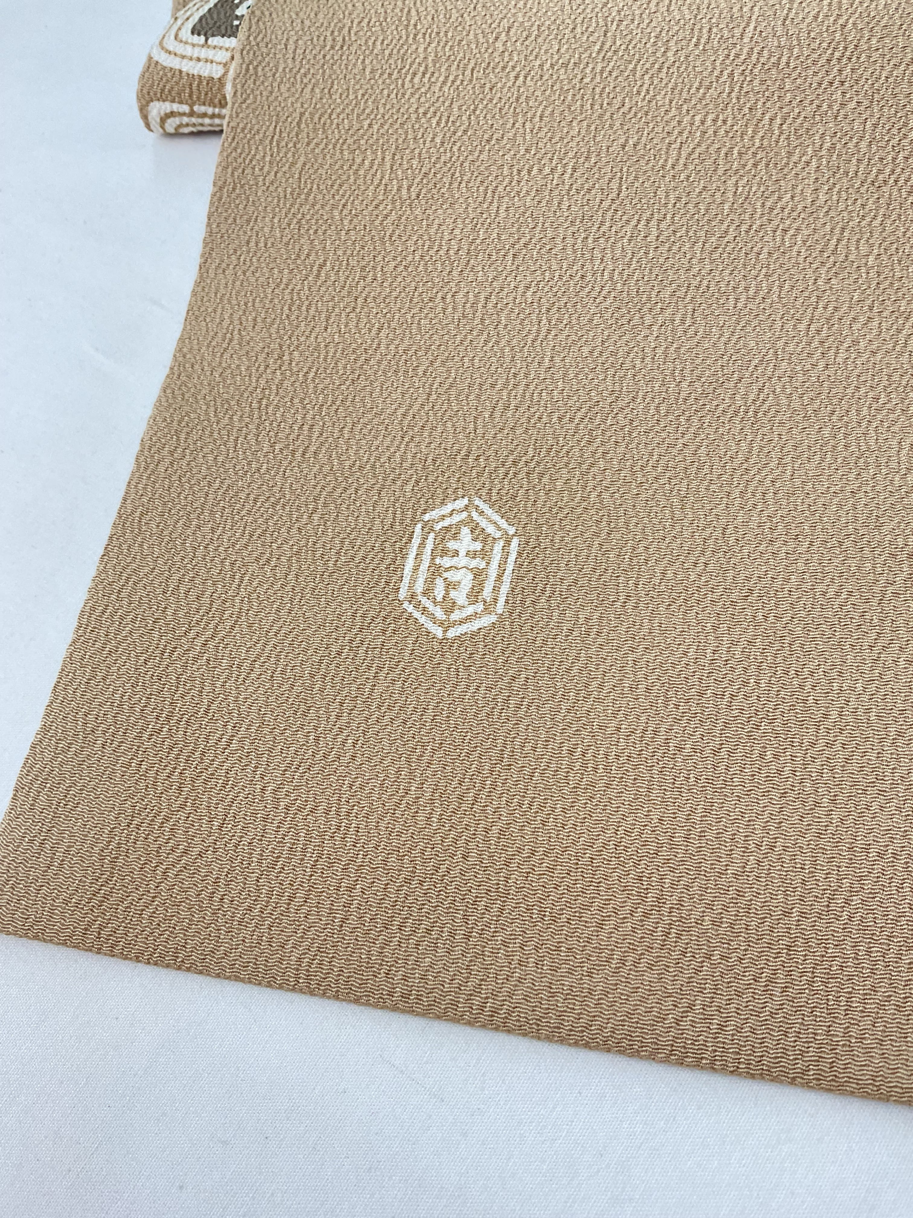 白茶色地リーフ文【栗山吉三郎】縮緬なごや帯(未使用) 251018-2