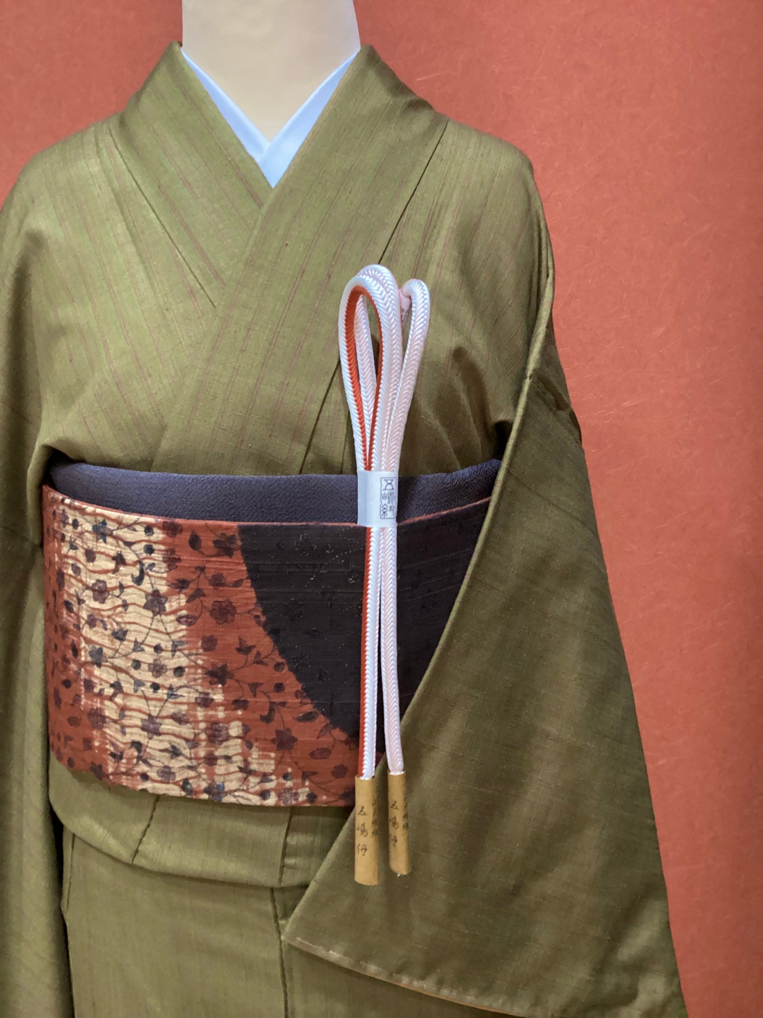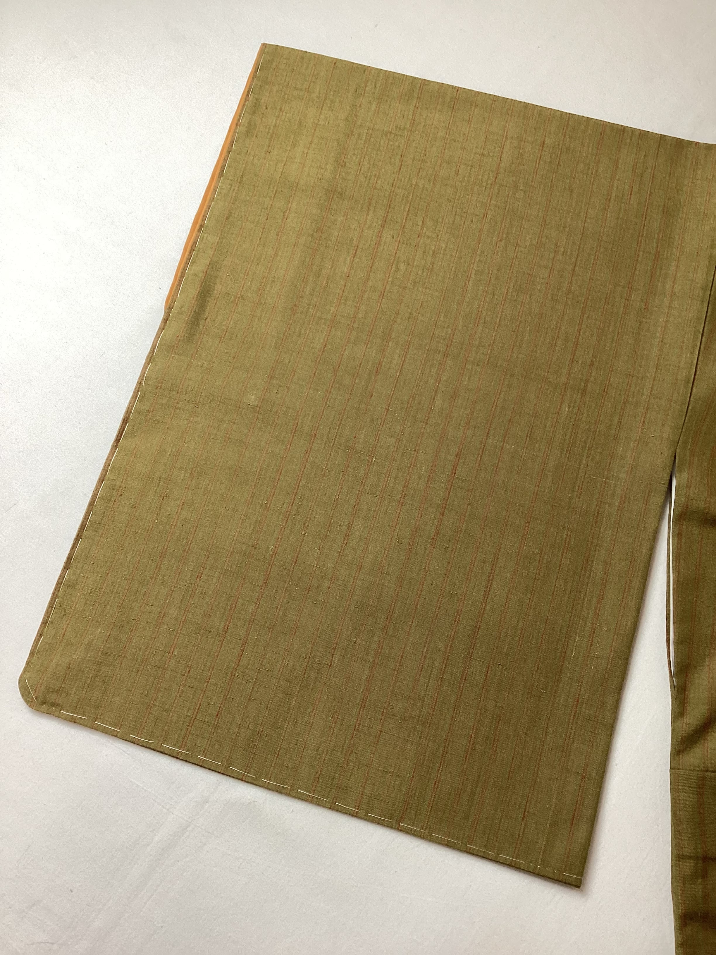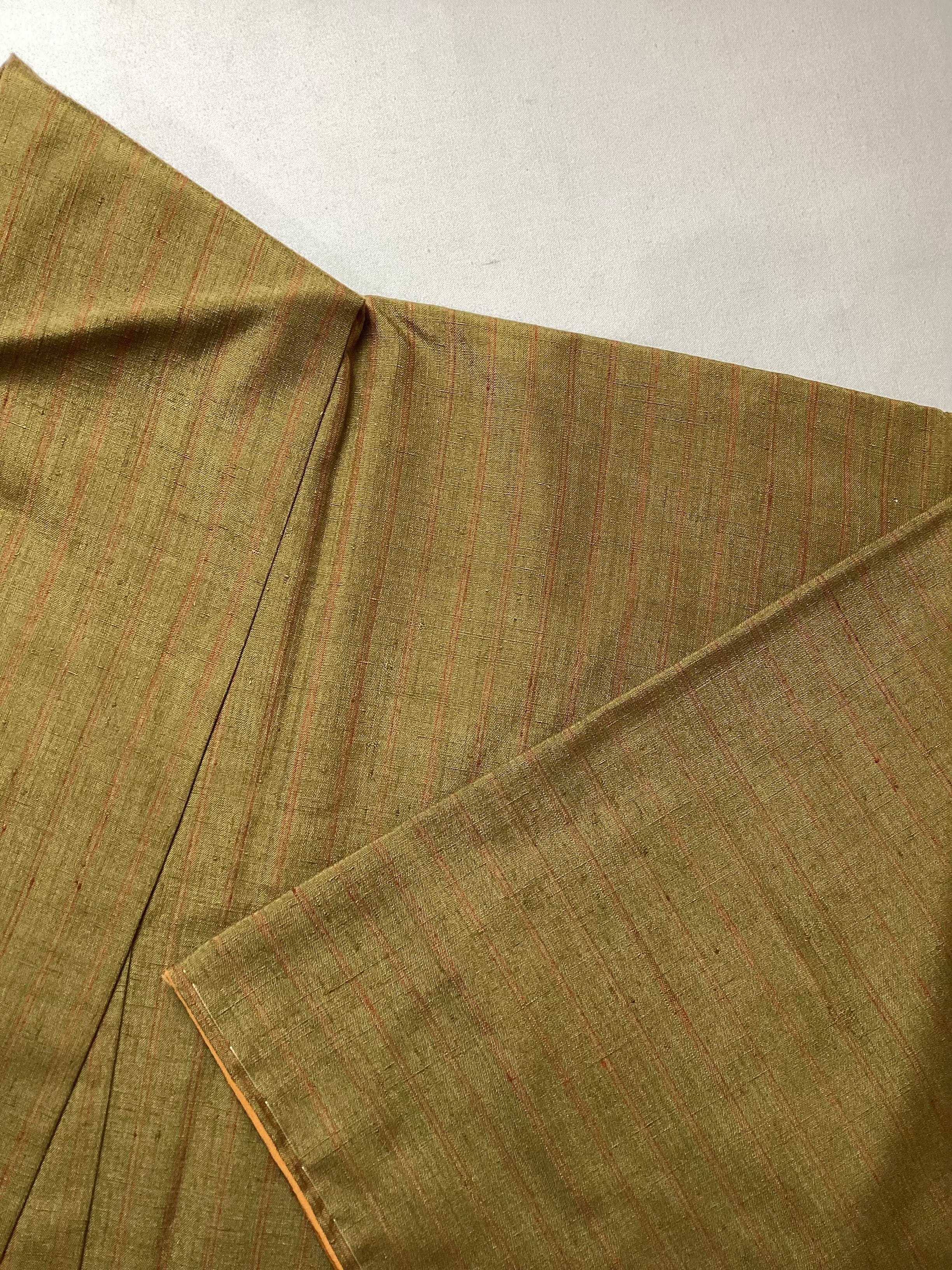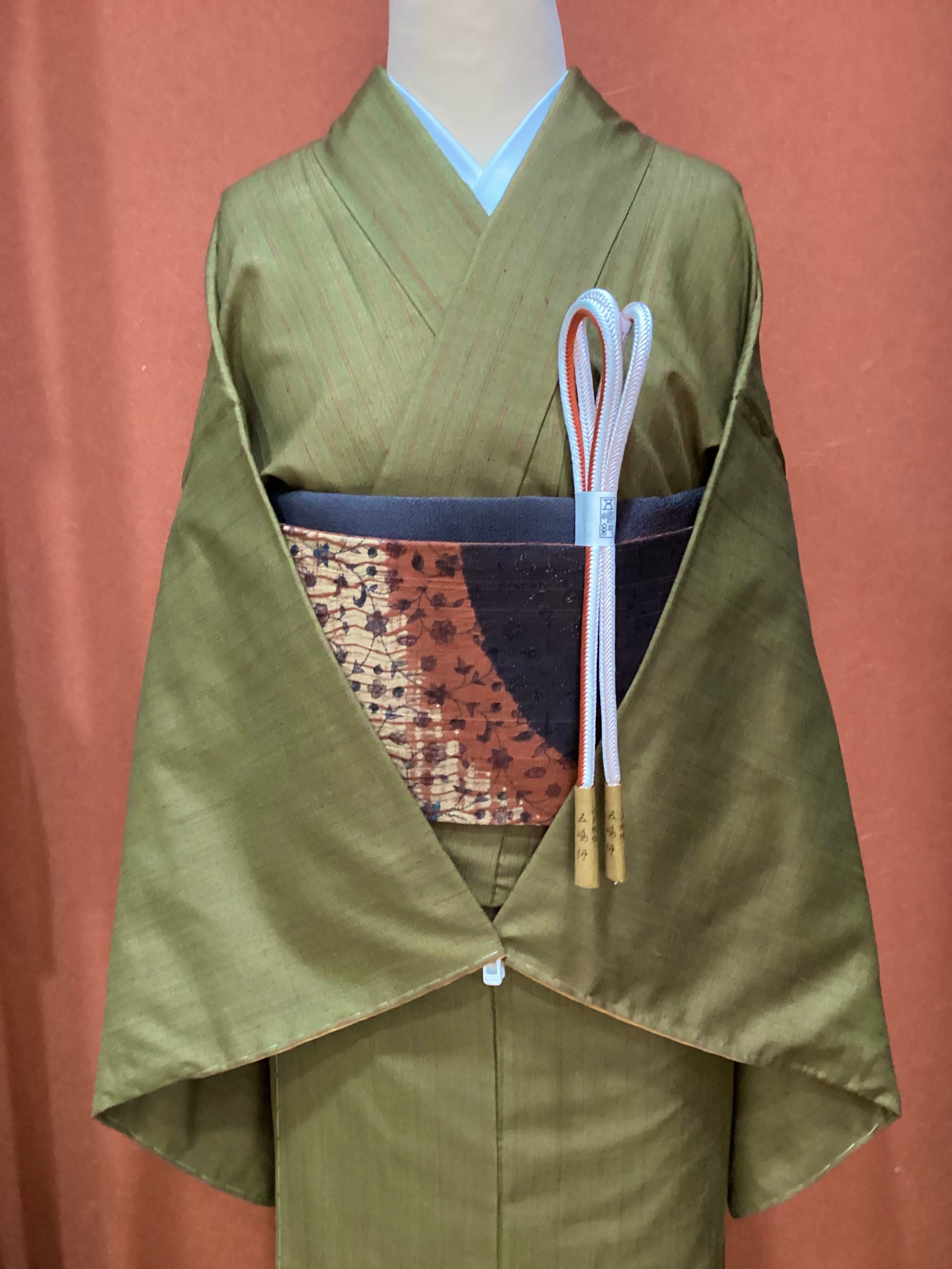 糸節のあるほっこりとした生地感の鶯茶色の紬地に赤茶のダブルストライプ文様の紬きものです。重くなく、軽やかな紬地で、絹の艶もあり、スッキリとした赤茶の縦ラインと金茶の八掛がほどよいアクセントになったカジュアル着物です。秋冬のお出掛けにいかがでしょうか。