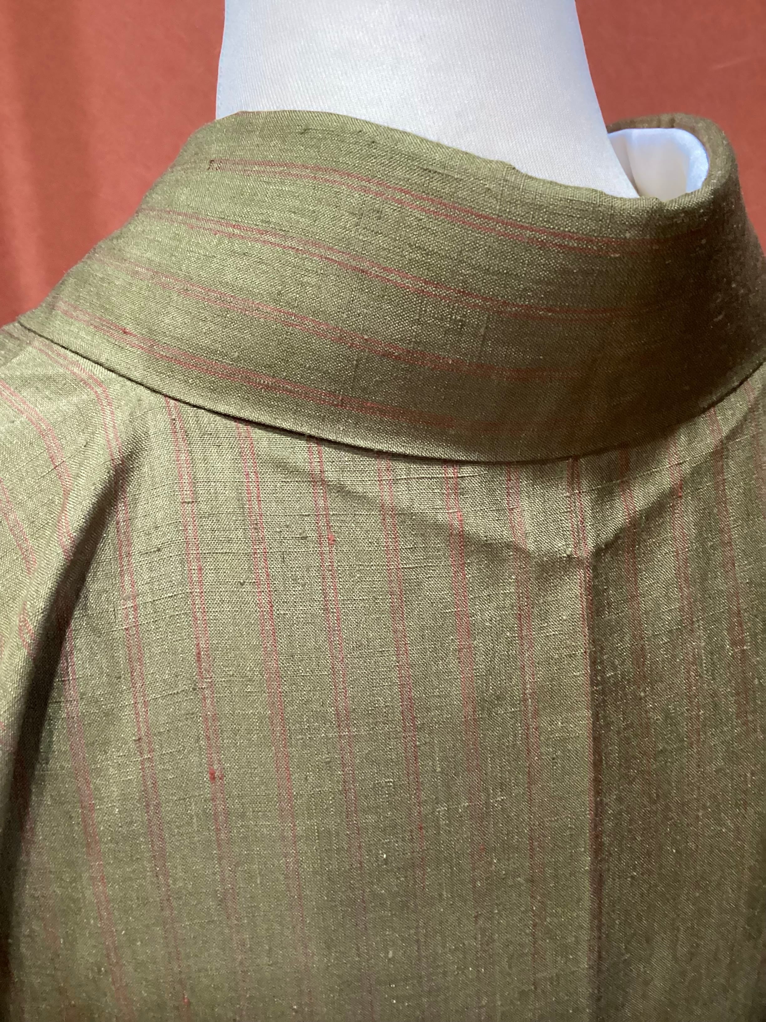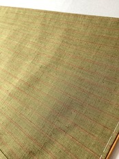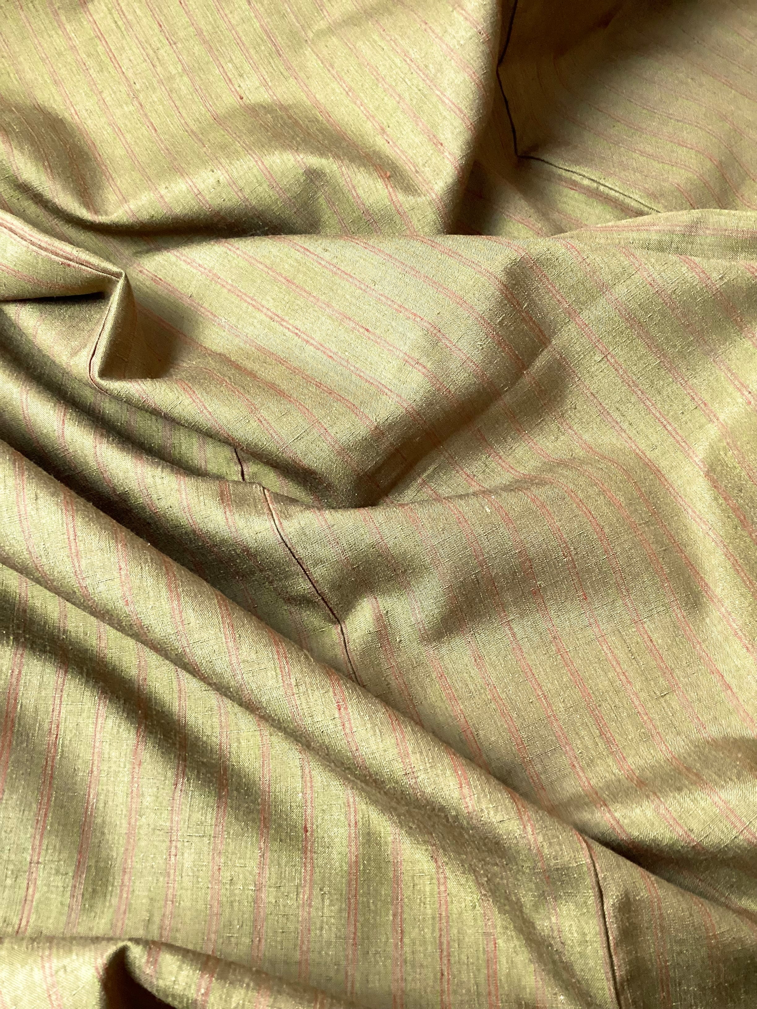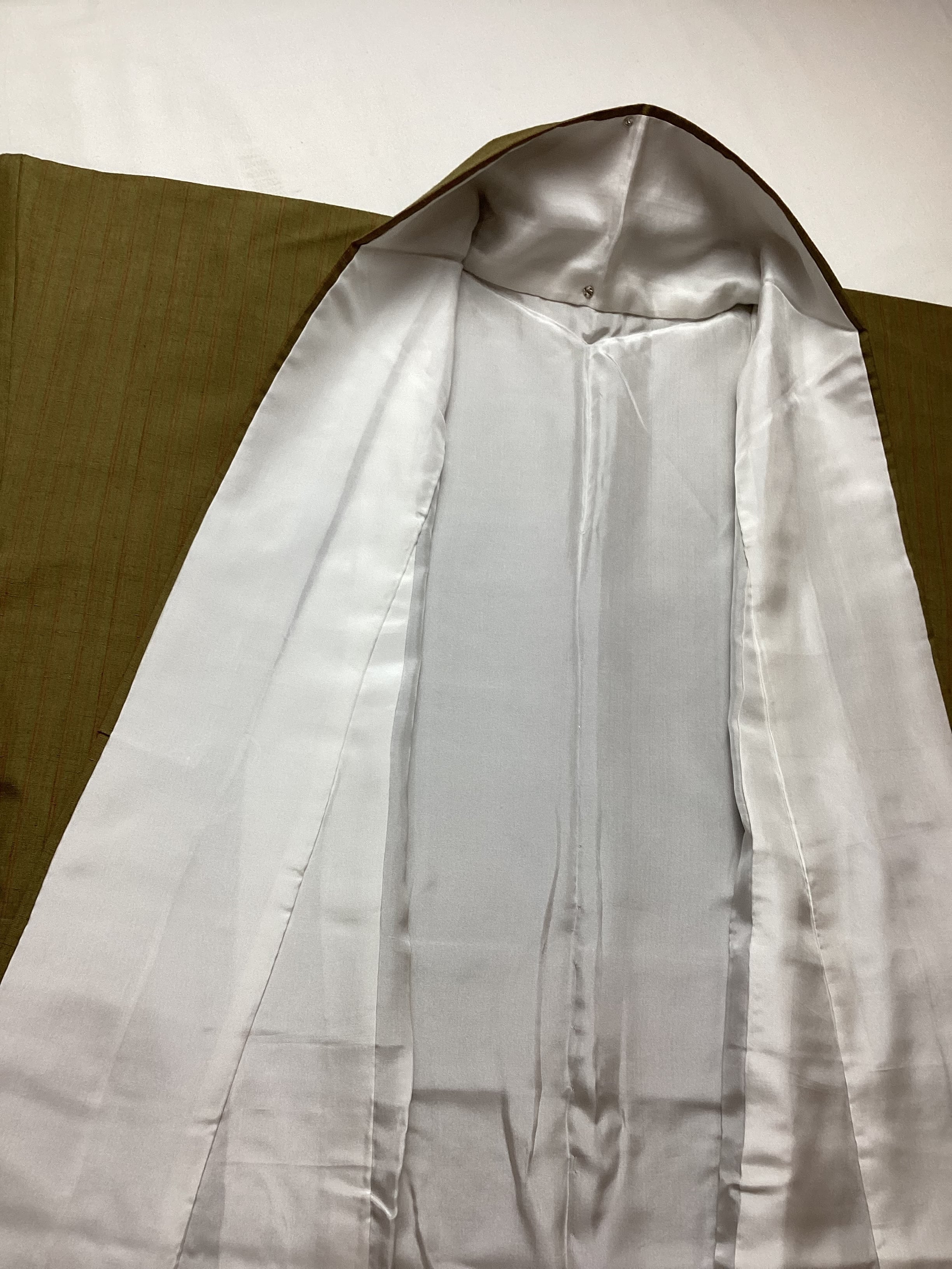 糸節のあるほっこりとした生地感の鶯茶色の紬地に赤茶のダブルストライプ文様の紬きものです。重くなく、軽やかな紬地で、絹の艶もあり、スッキリとした赤茶の縦ラインと金茶の八掛がほどよいアクセントになったカジュアル着物です。秋冬のお出掛けにいかがでしょうか。