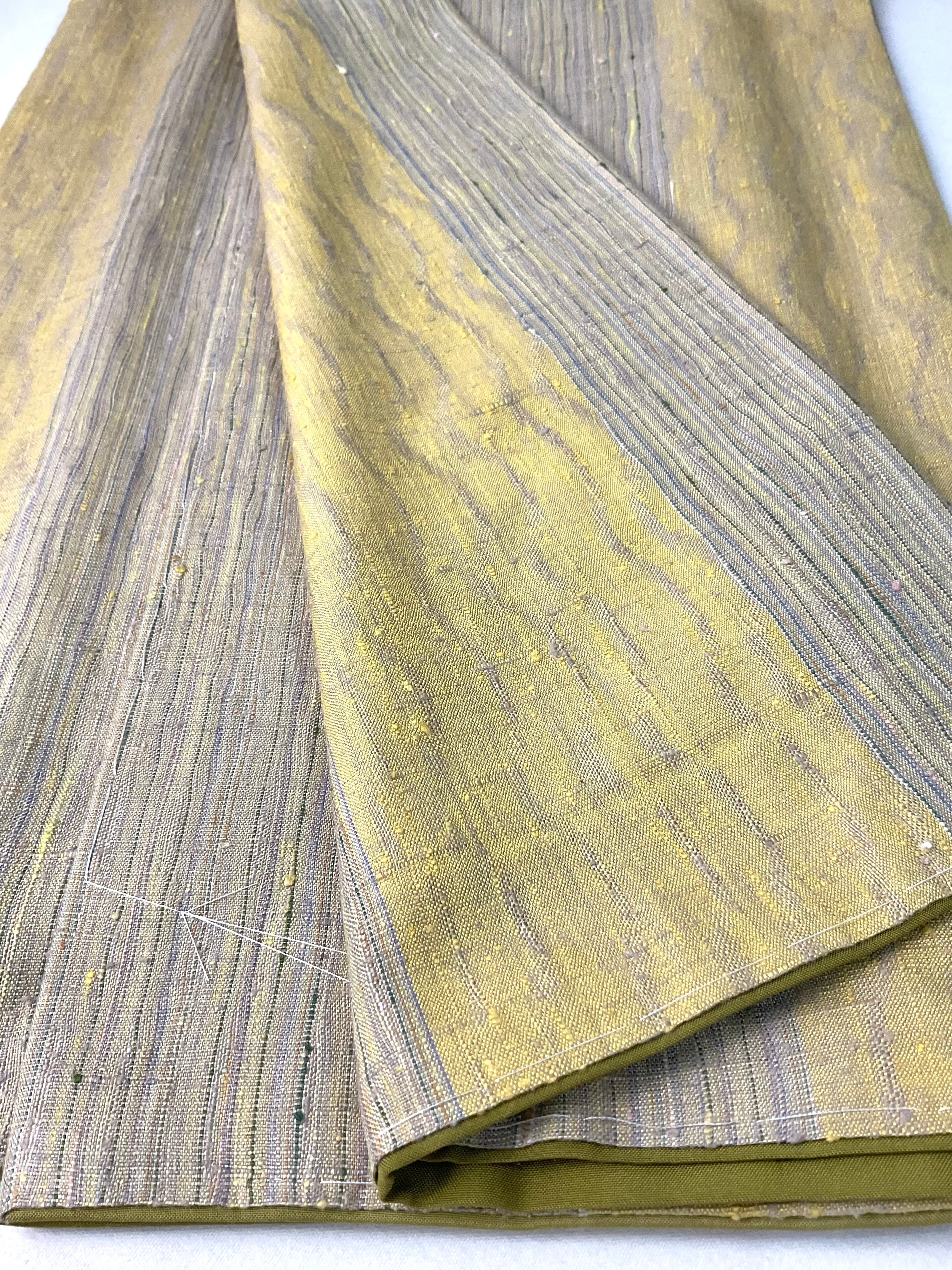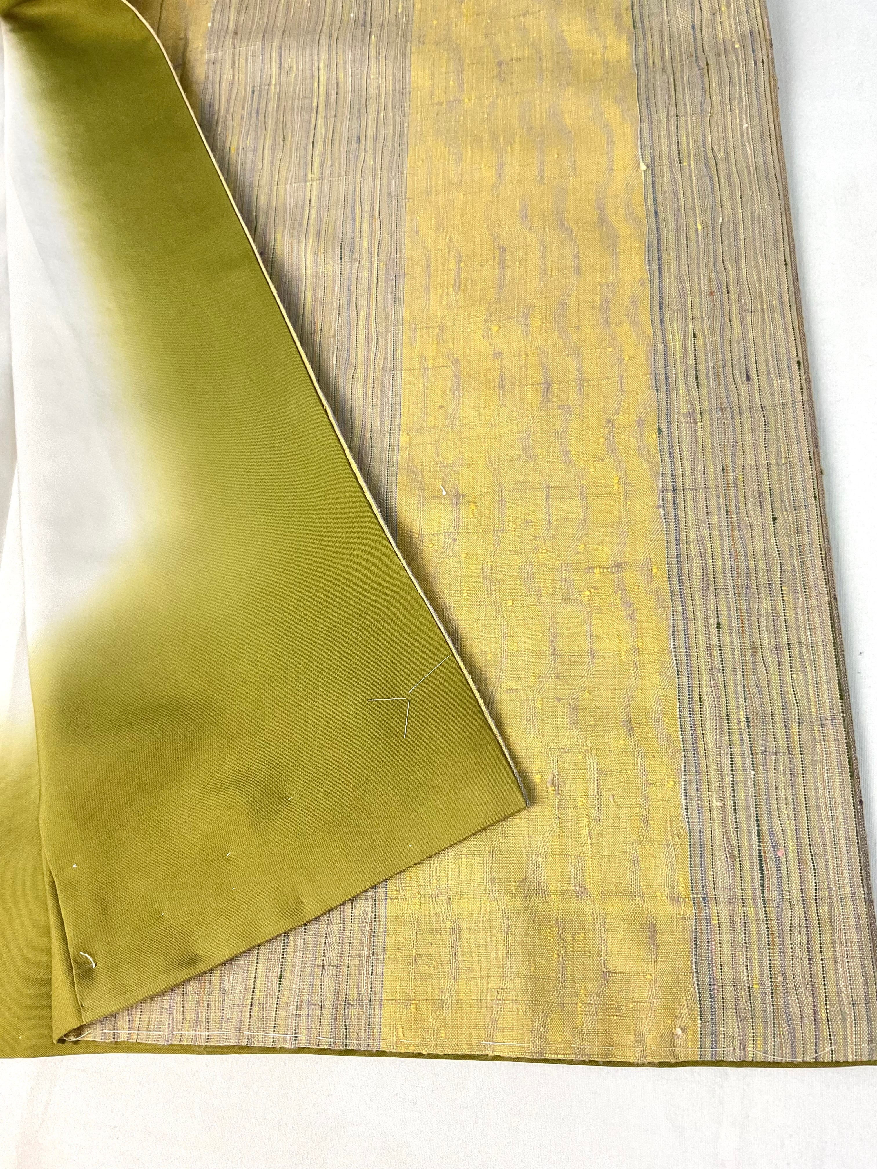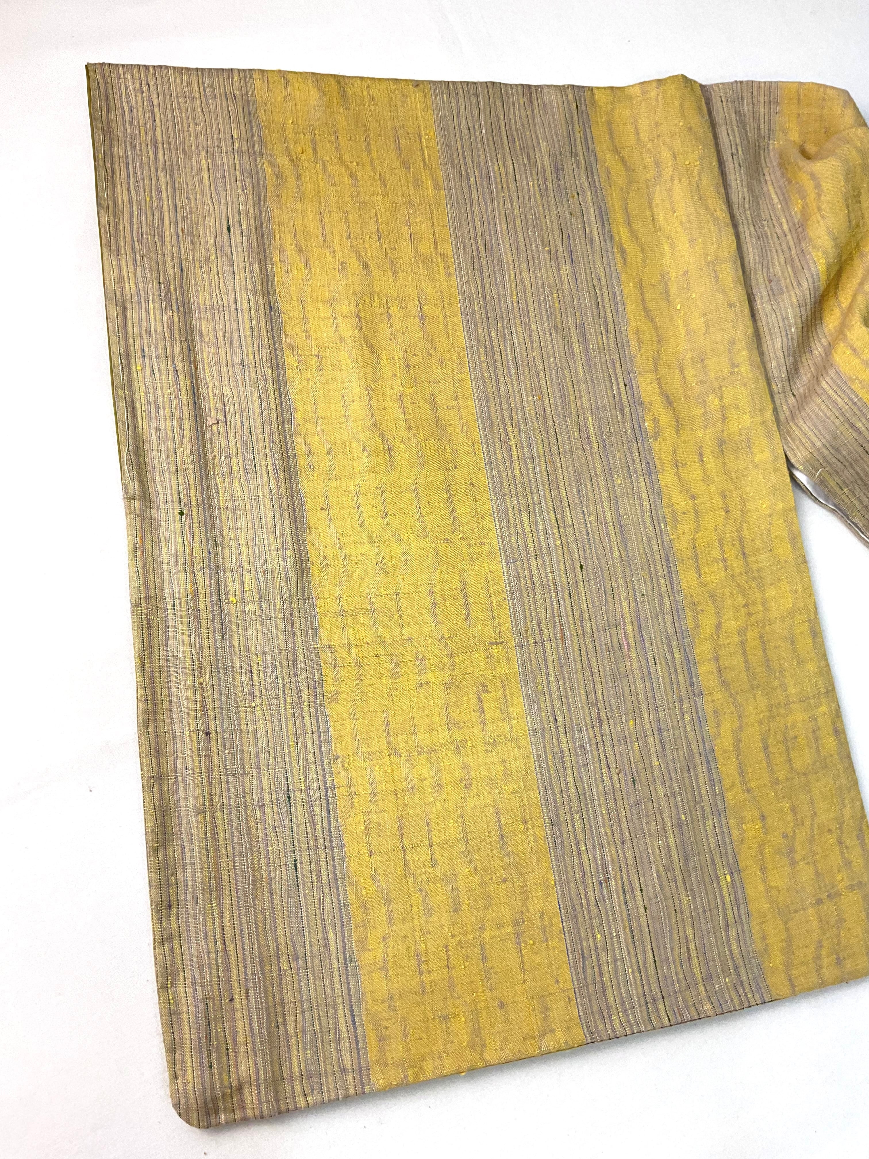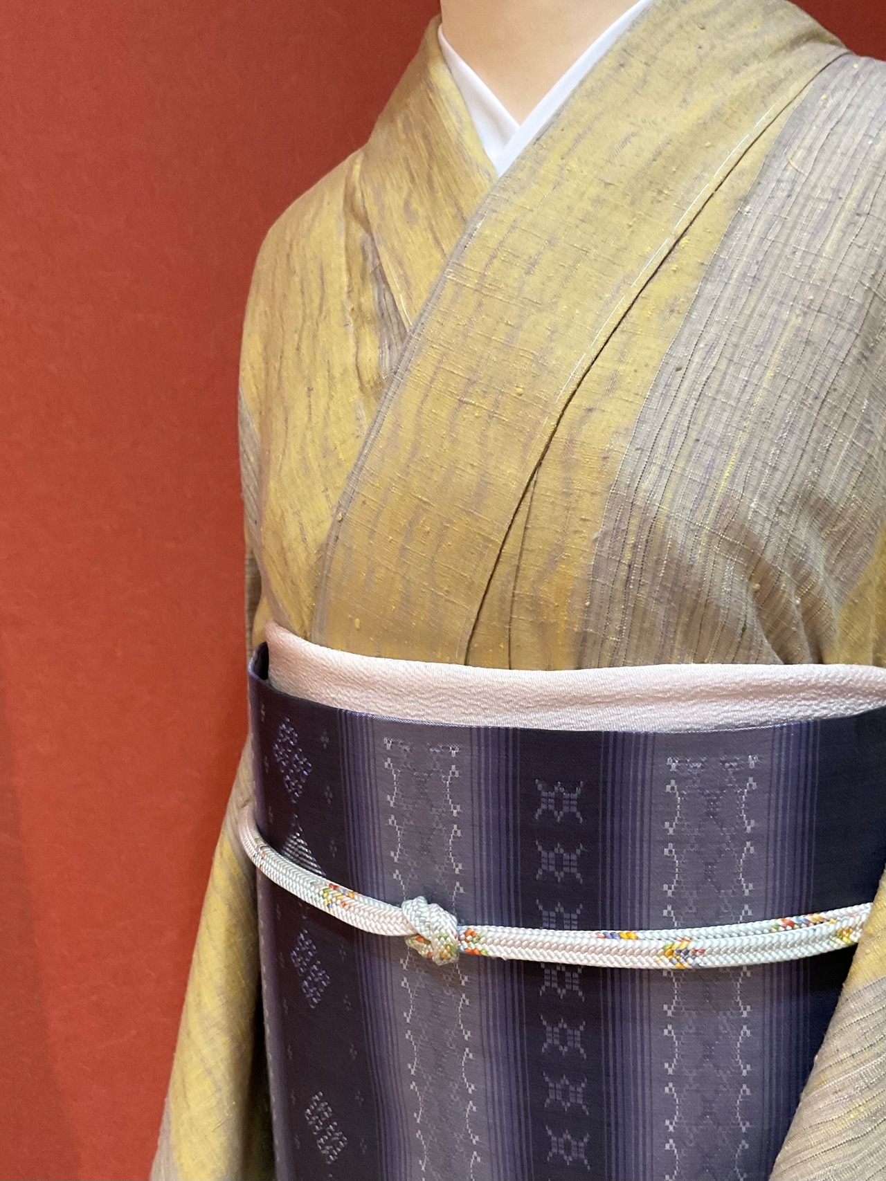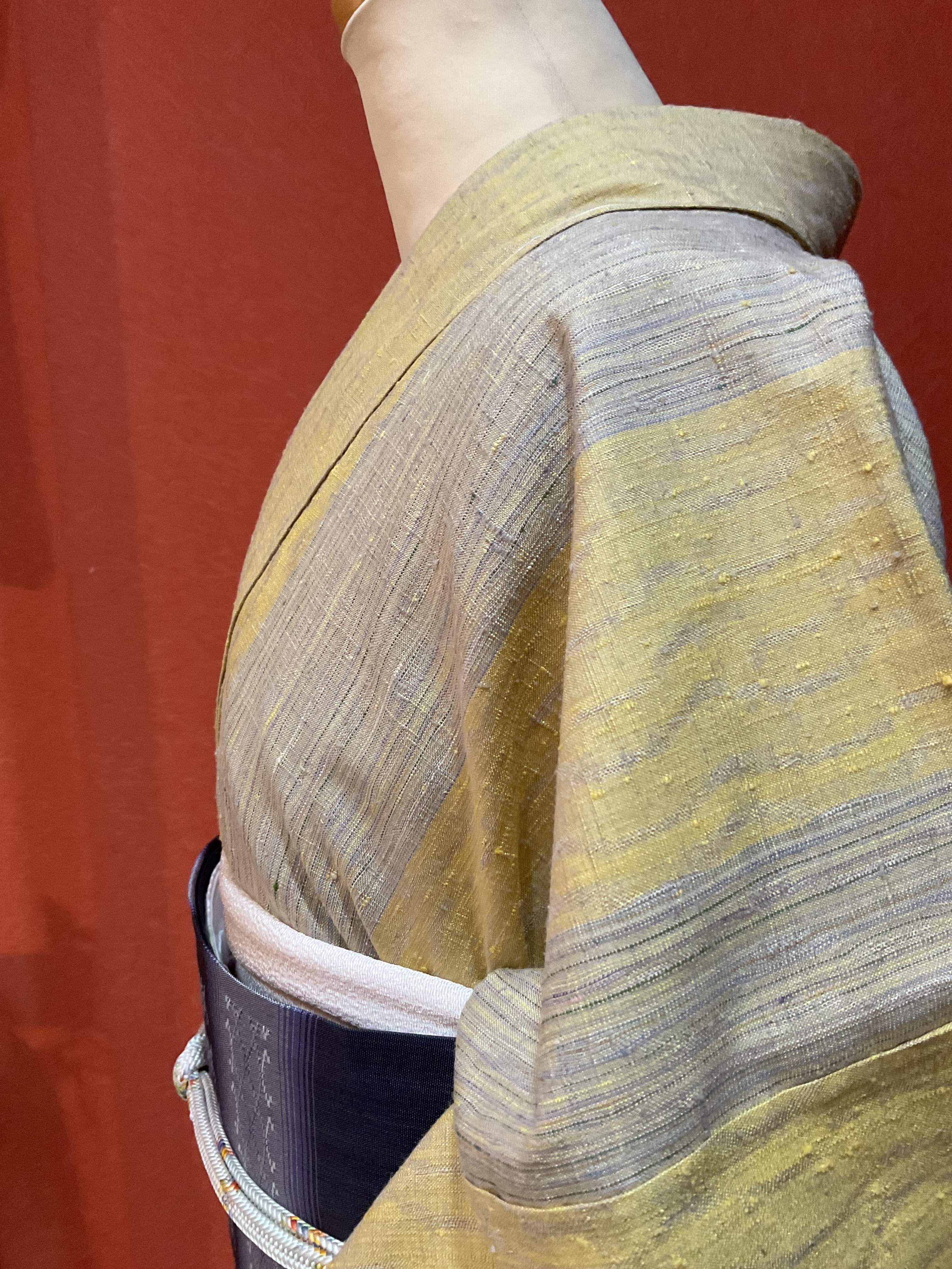 黄色をベースに多色縞とよろけたような縞文を組み合わせ織り込んだ紬きものです。温かみを感じる紡ぎ糸の風合い、空気を含んだような柔らかでふっくらとした手触りが心地良くこれからの季節に活躍するきものです。