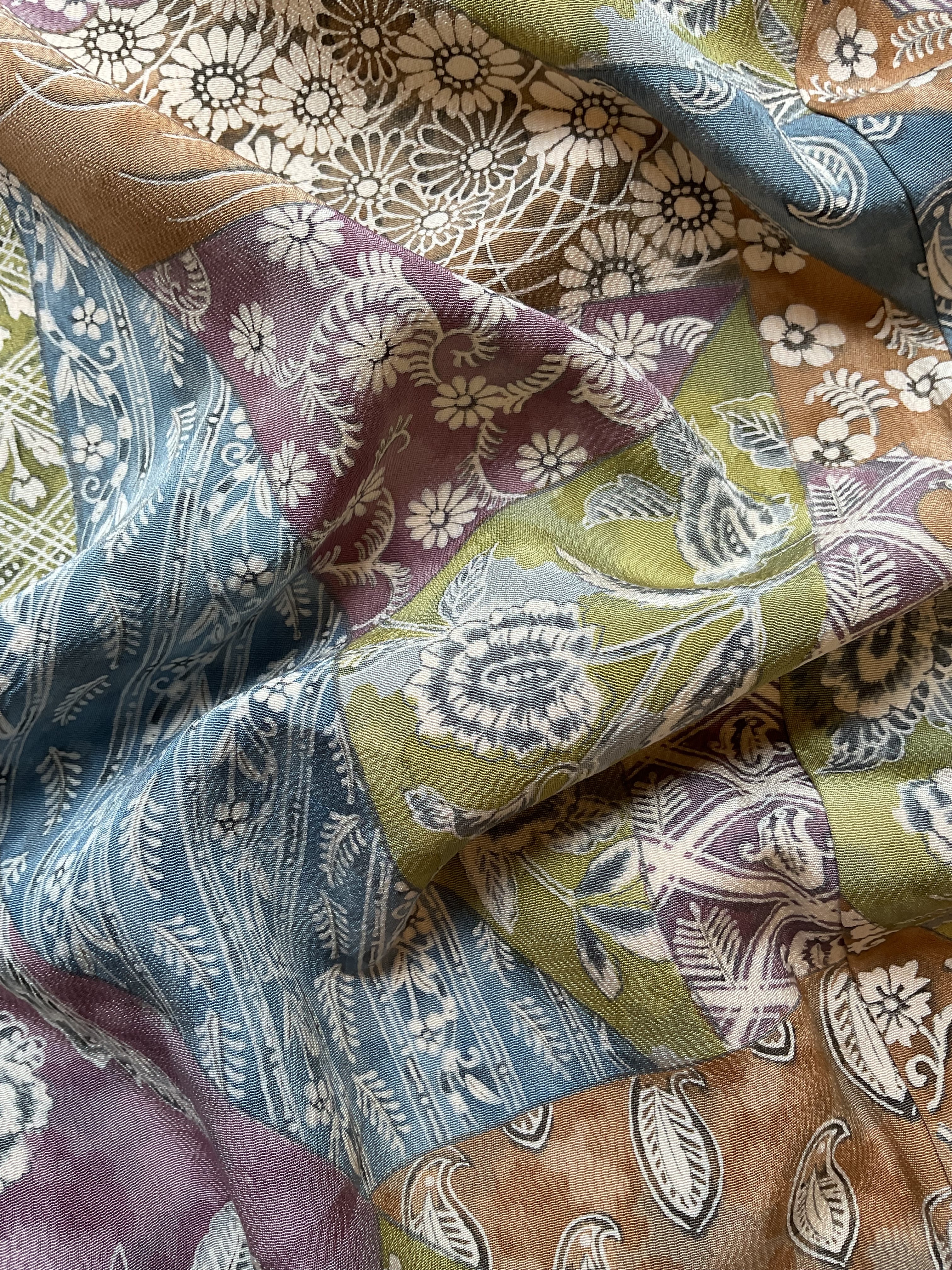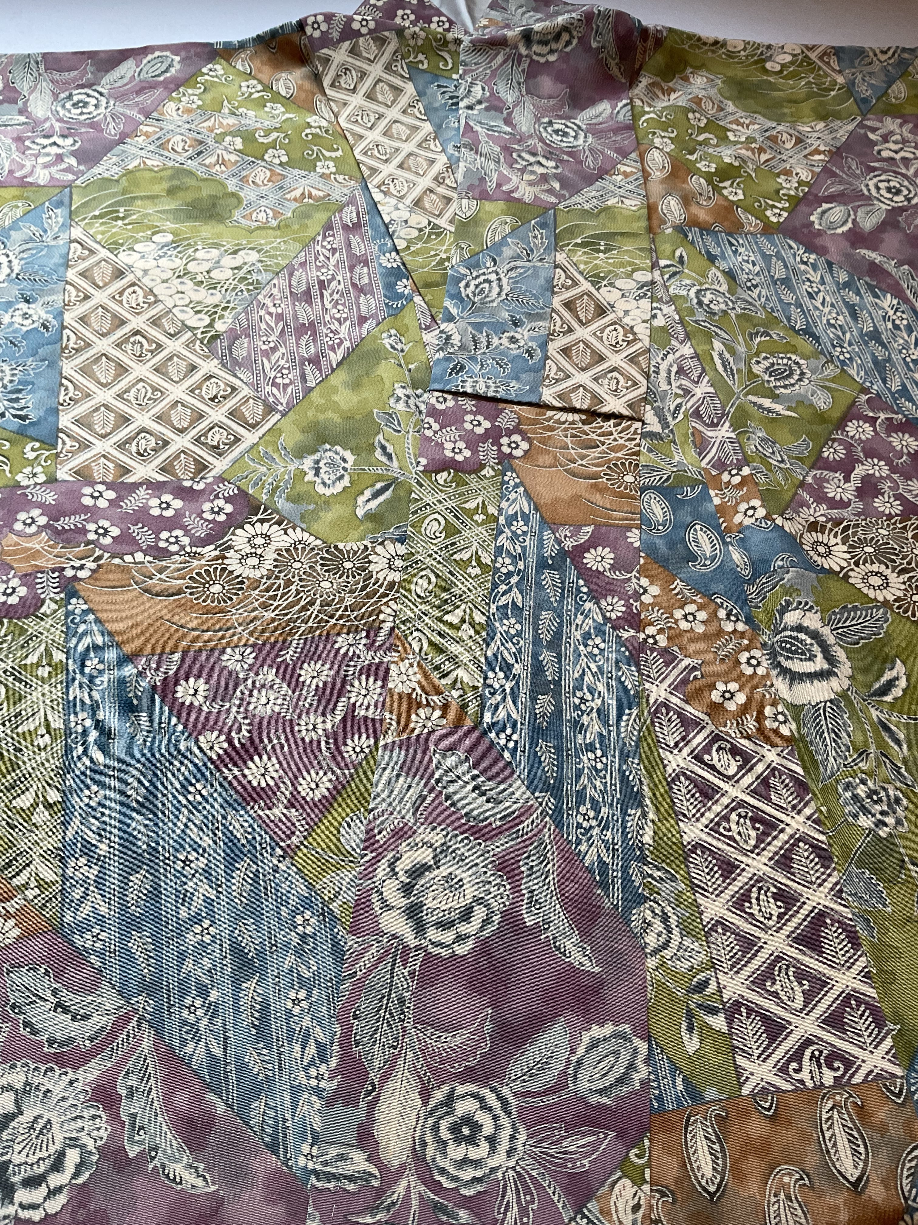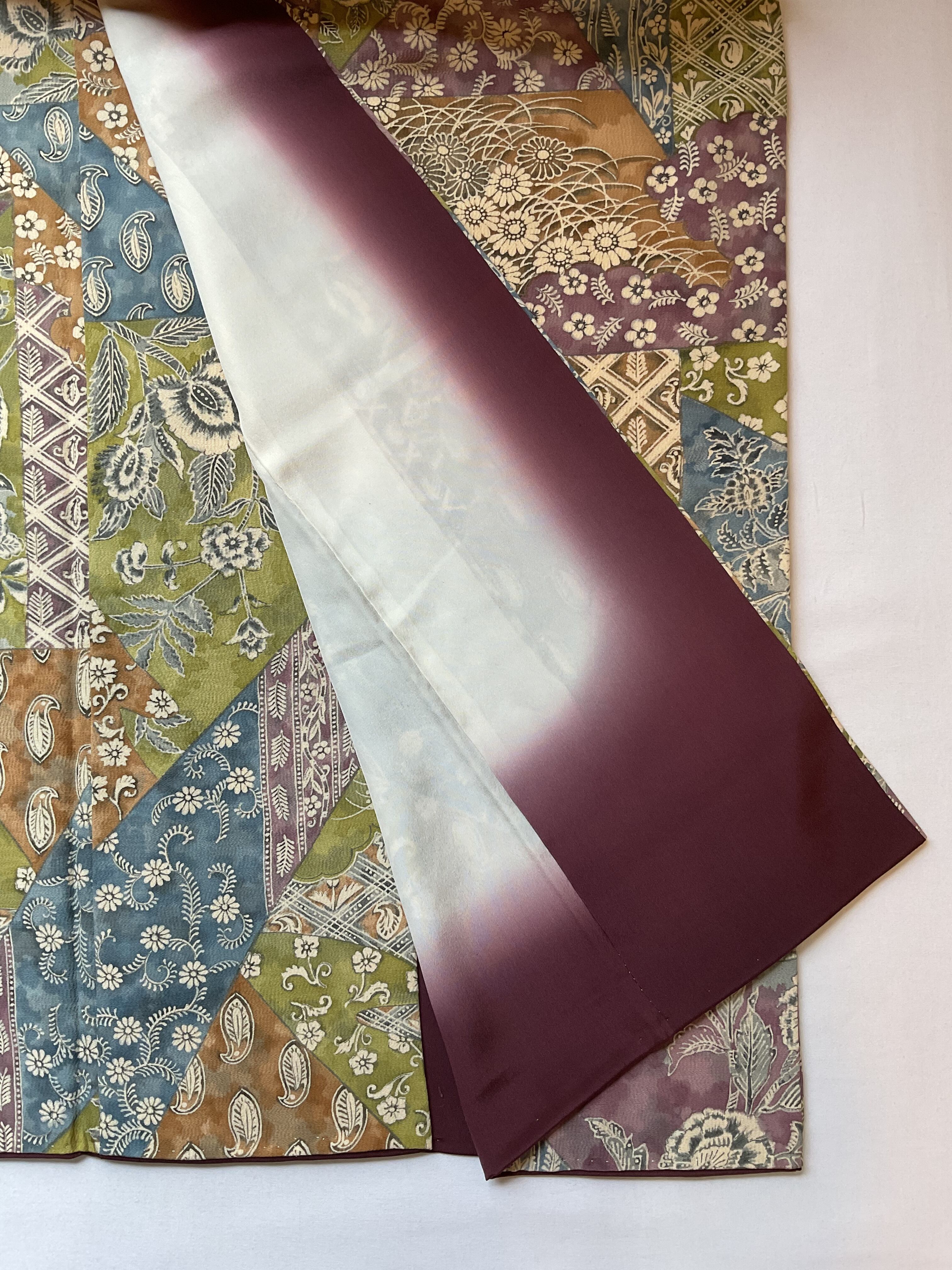 色調としては抑えめではありますが、緑と紫がパッと目に飛び込んできて、渋みのあるブルーが効いており、心躍るオトナの小紋です。